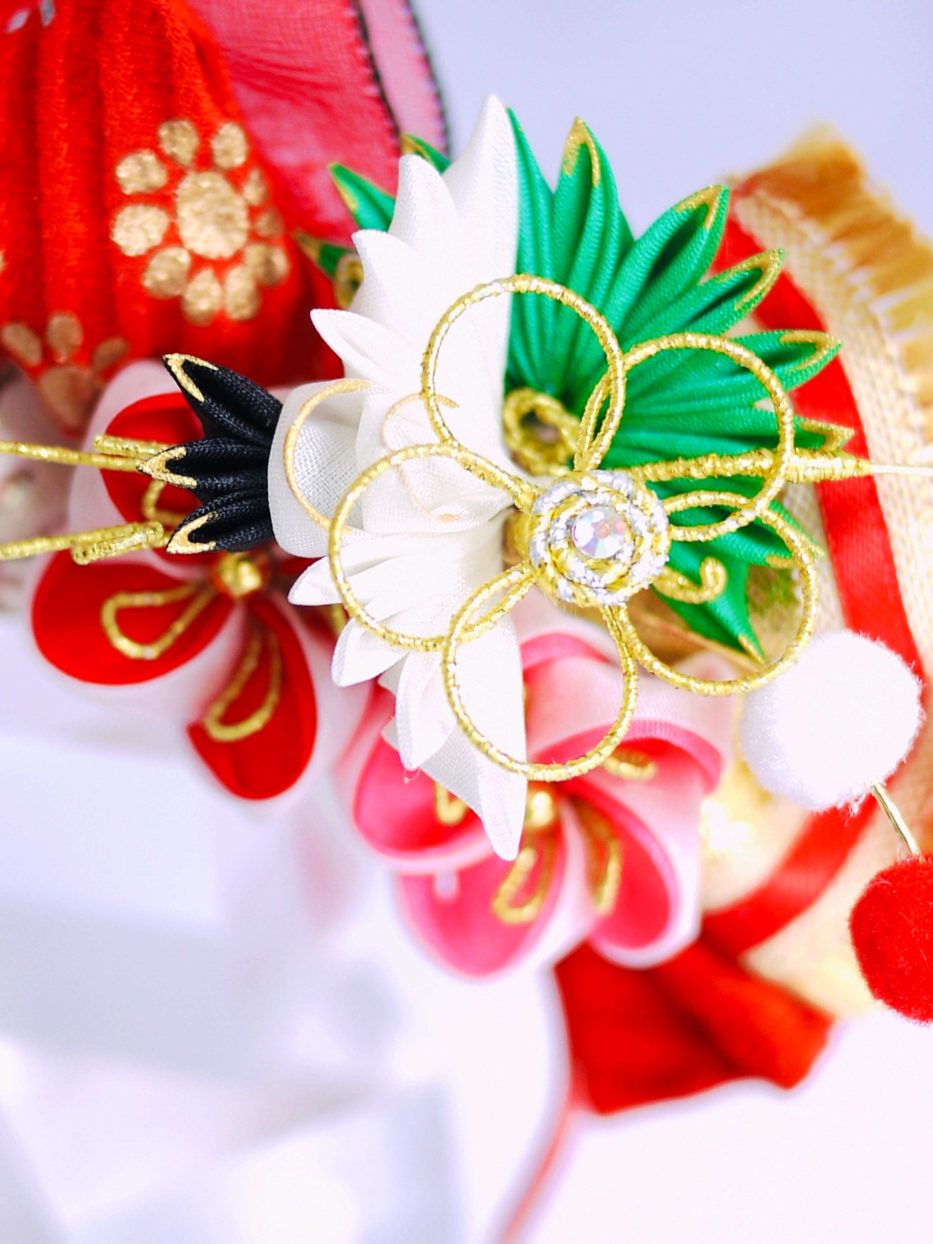 端午の節句のお飾りはこんな配色のイメージなんですよね(個人的に)おリボンはオーガンジー・金襴・着物正絹生地の3種を重ねて正統派祝飾りの雰囲気