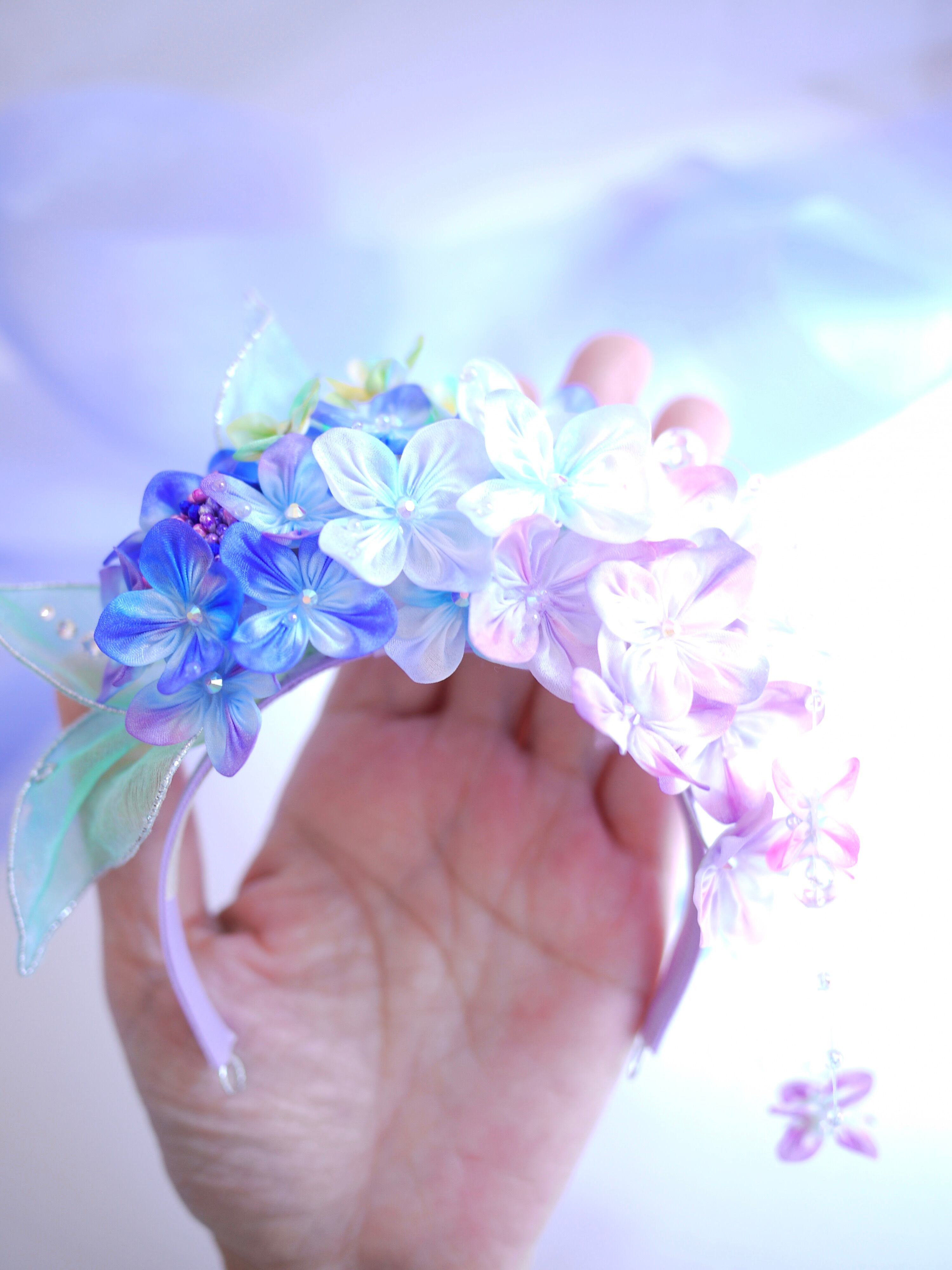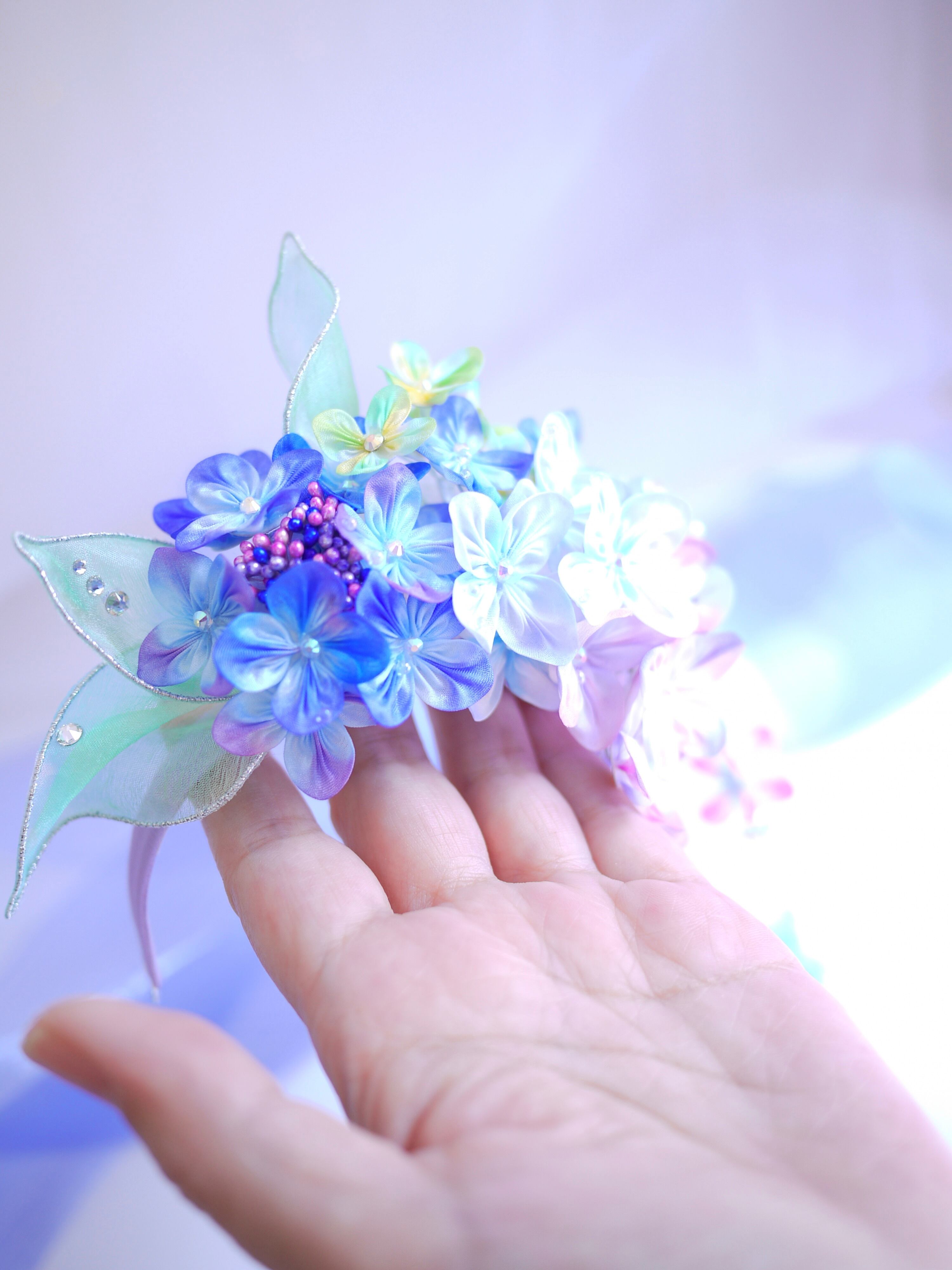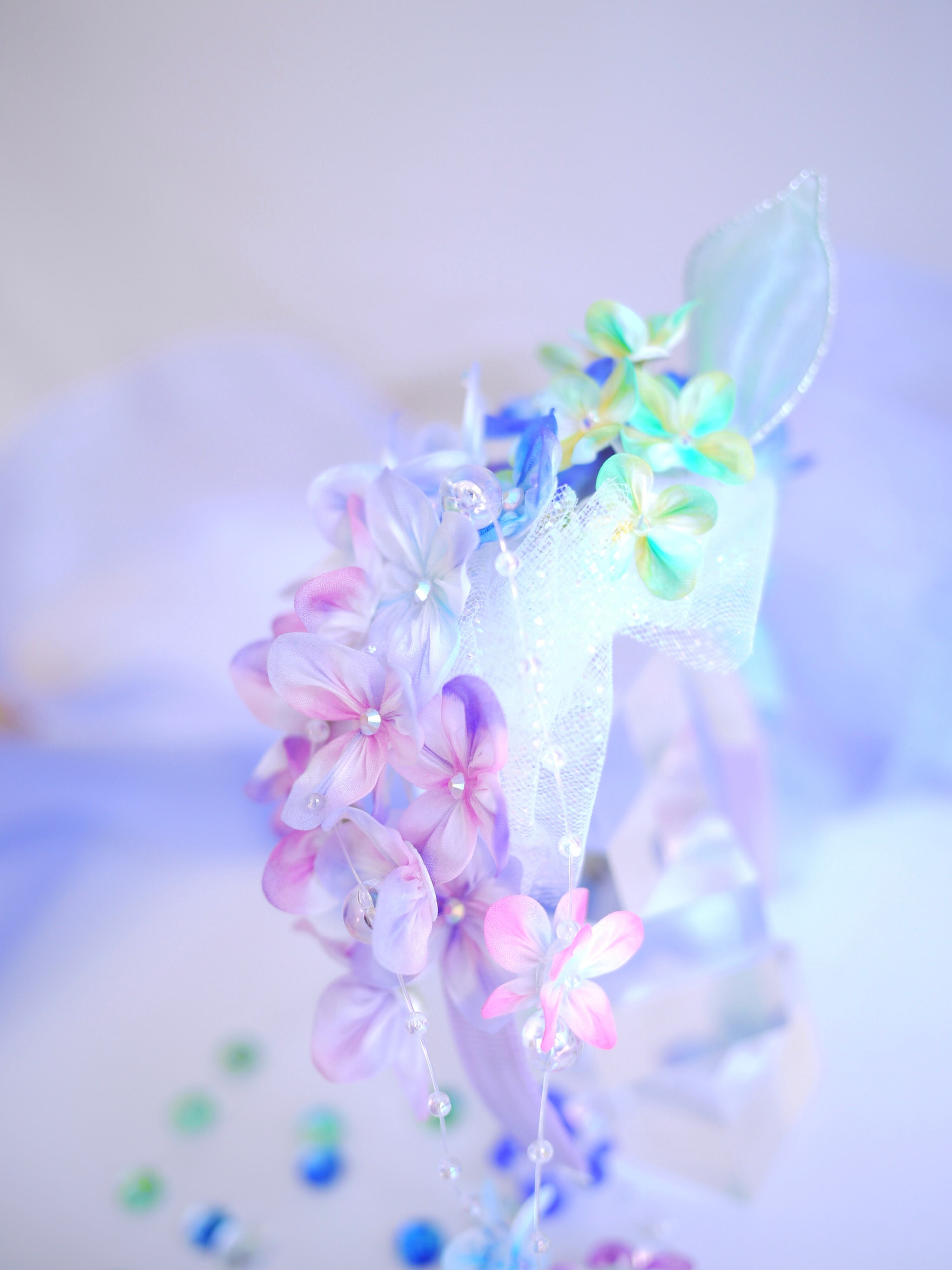 下がりのような小花付きクリアビーズワイヤーは撮影用に別に作ったもので、実は紫陽花のお花にひっかけて絡ませてるだけなのです。