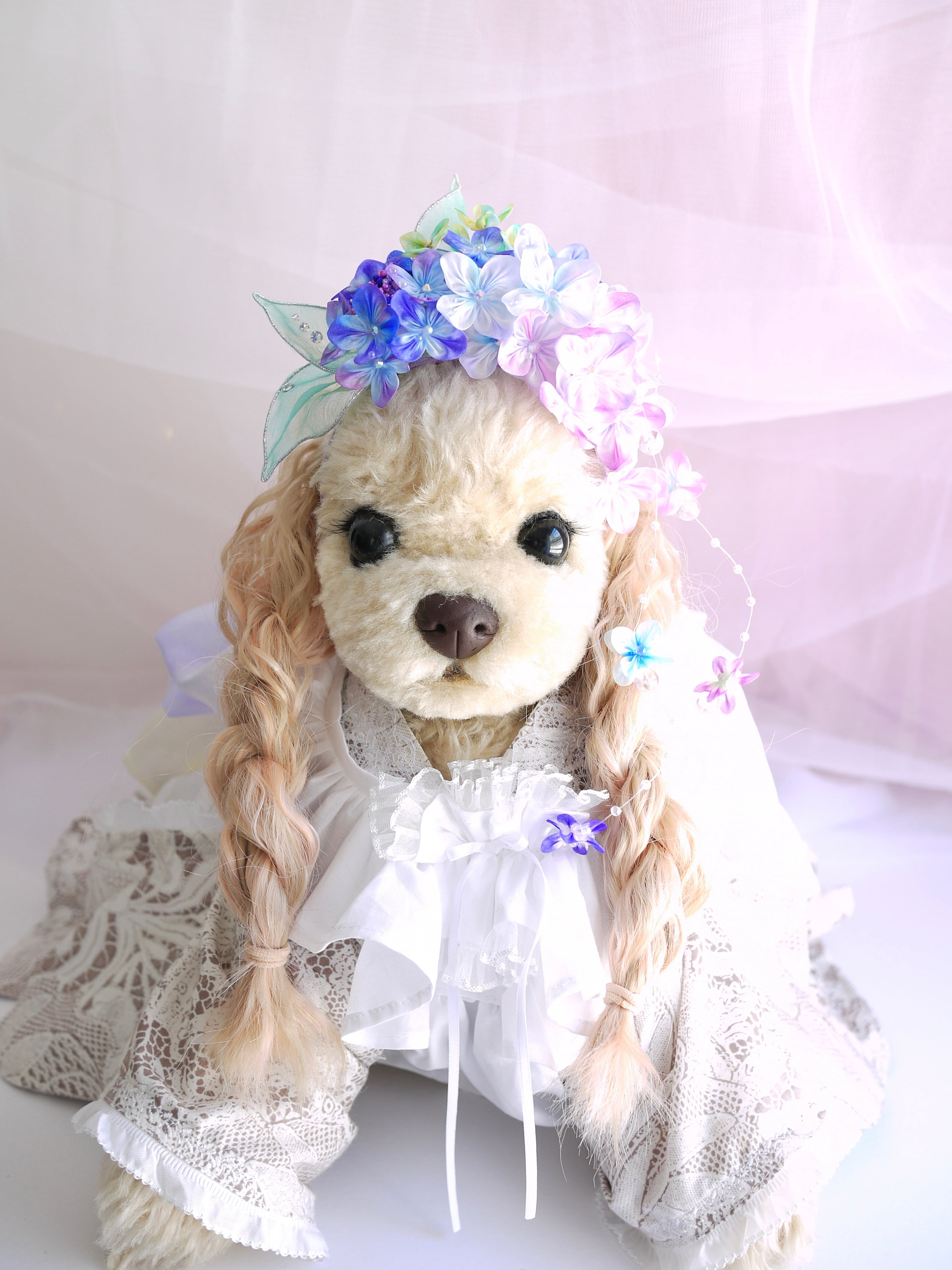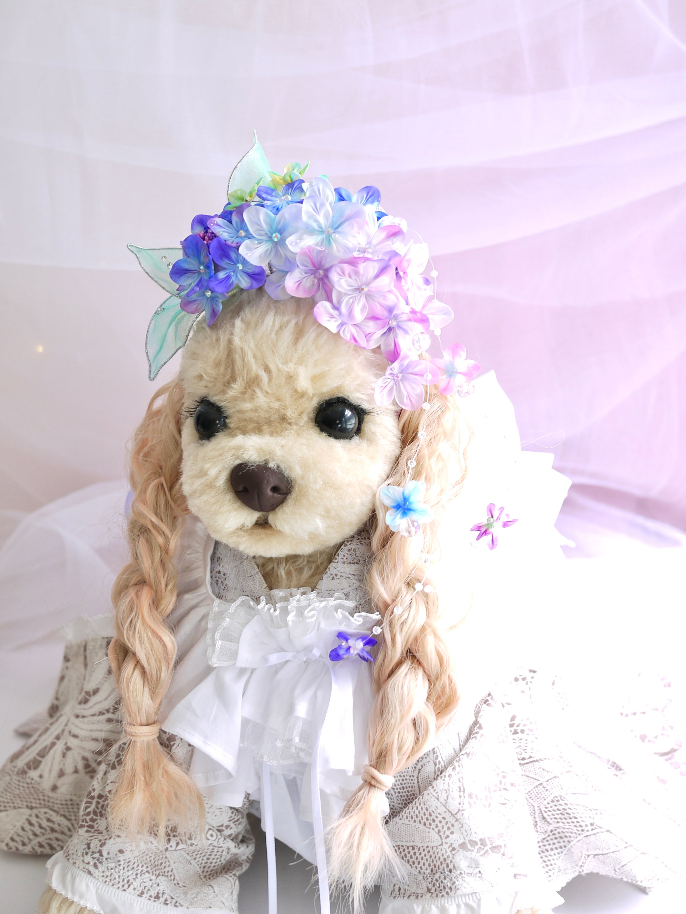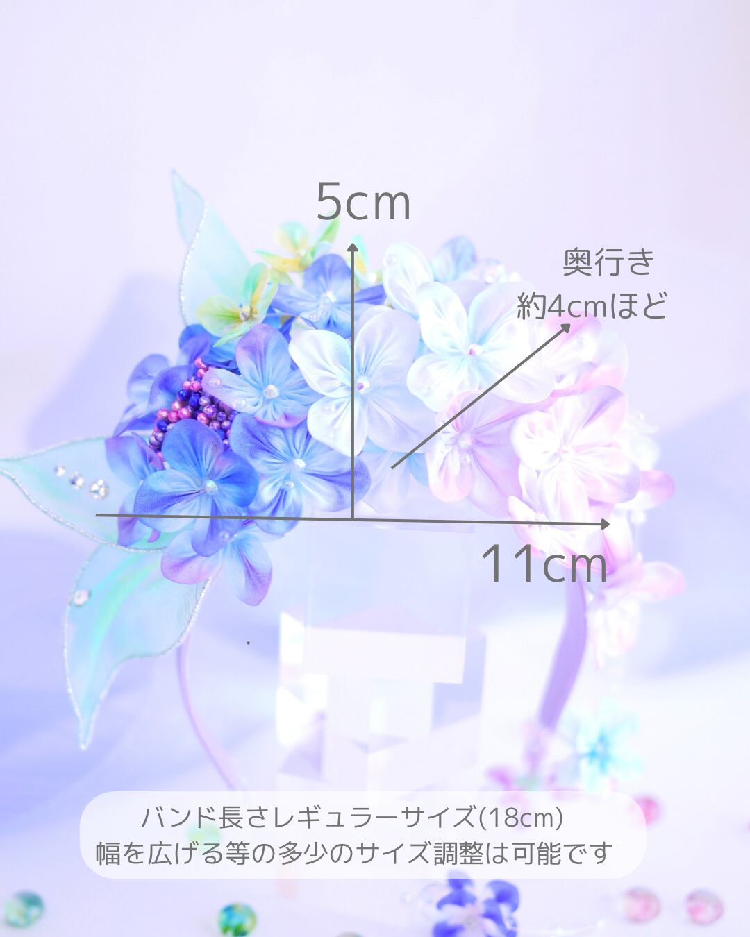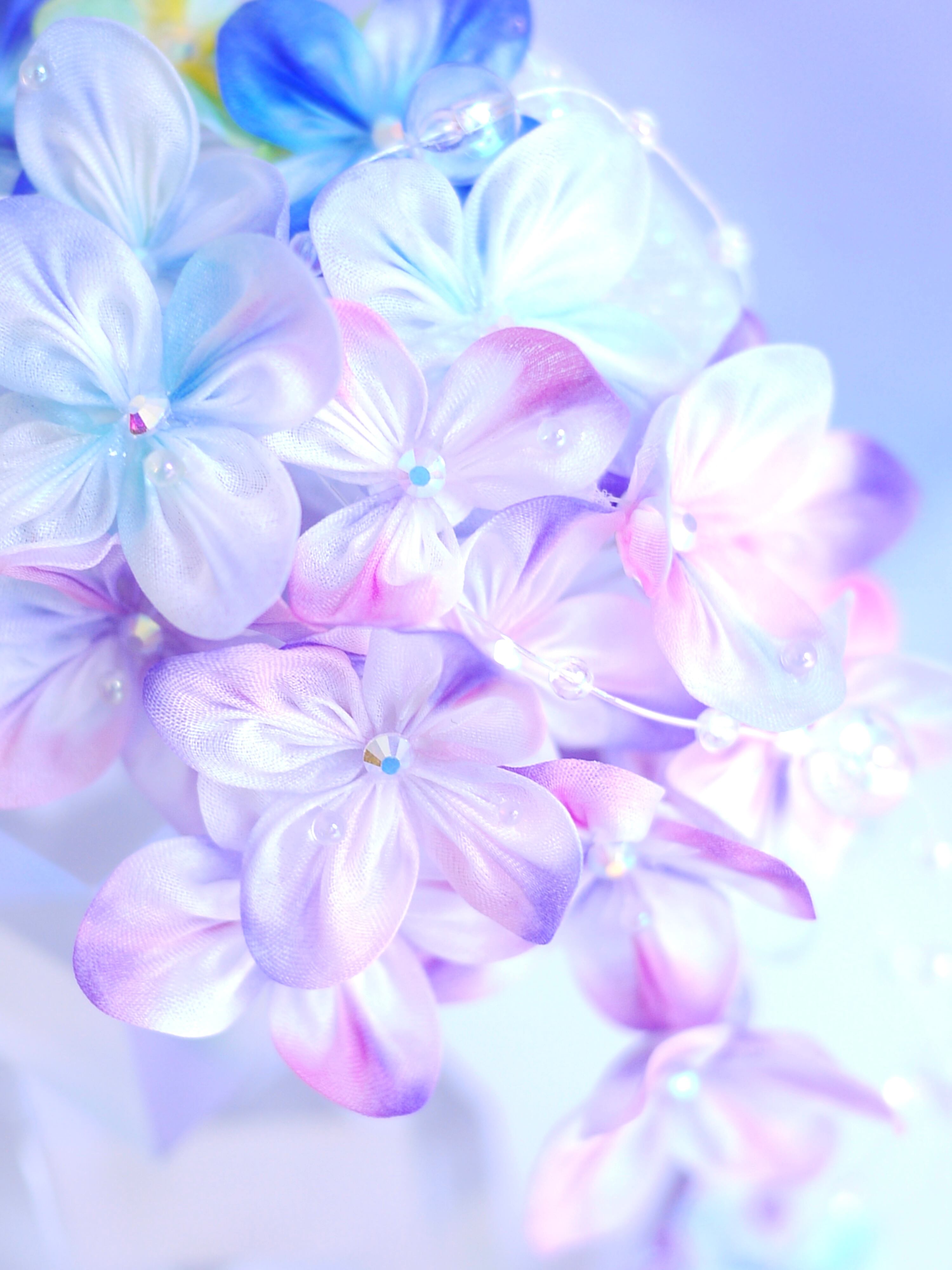 下がりのような小花付きクリアビーズワイヤーは撮影用に別に作ったもので、実は紫陽花のお花にひっかけて絡ませてるだけなのです。