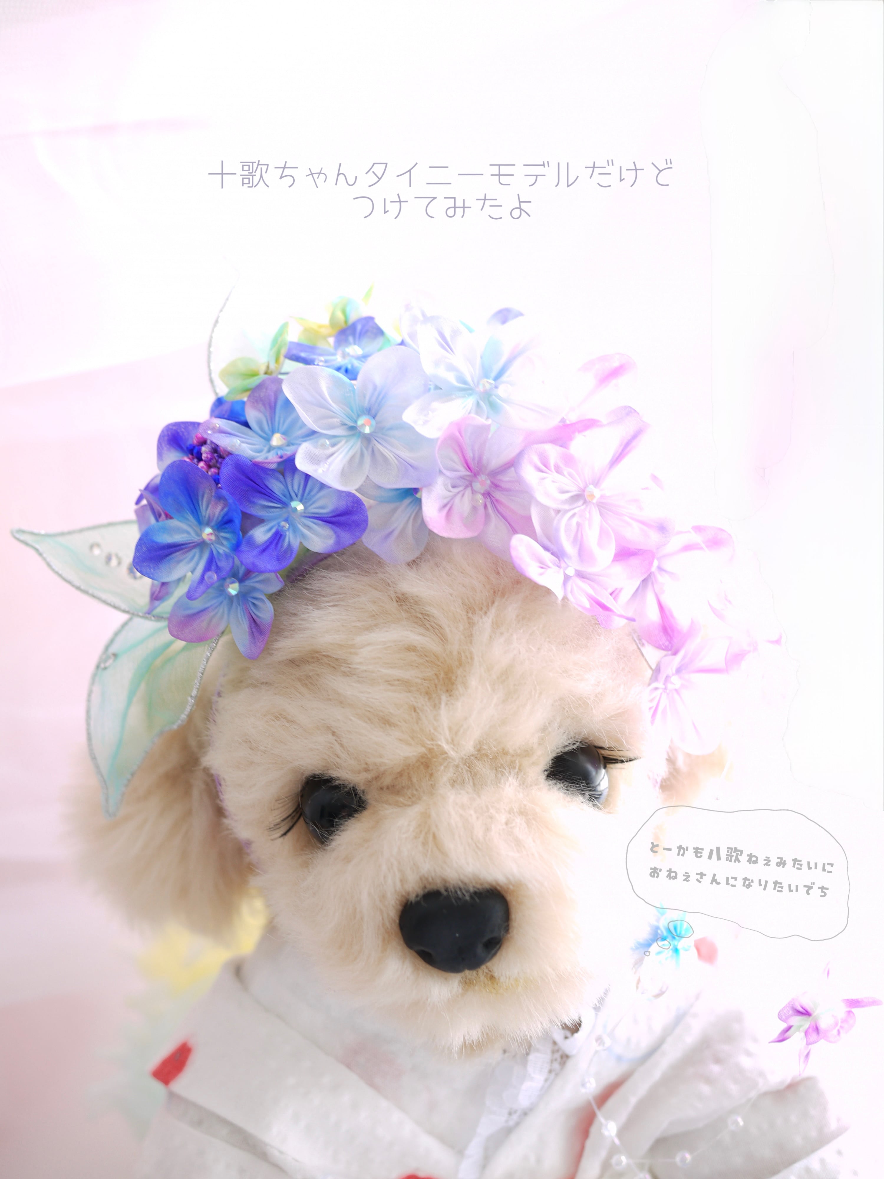 つまみ花をふんだんにあしらったカチューシャタイプの花簪、バレッタタイプの装着が難しいワンちゃんにもボリューム髪飾りを楽しでいただけますのでぜひお試しなさってください