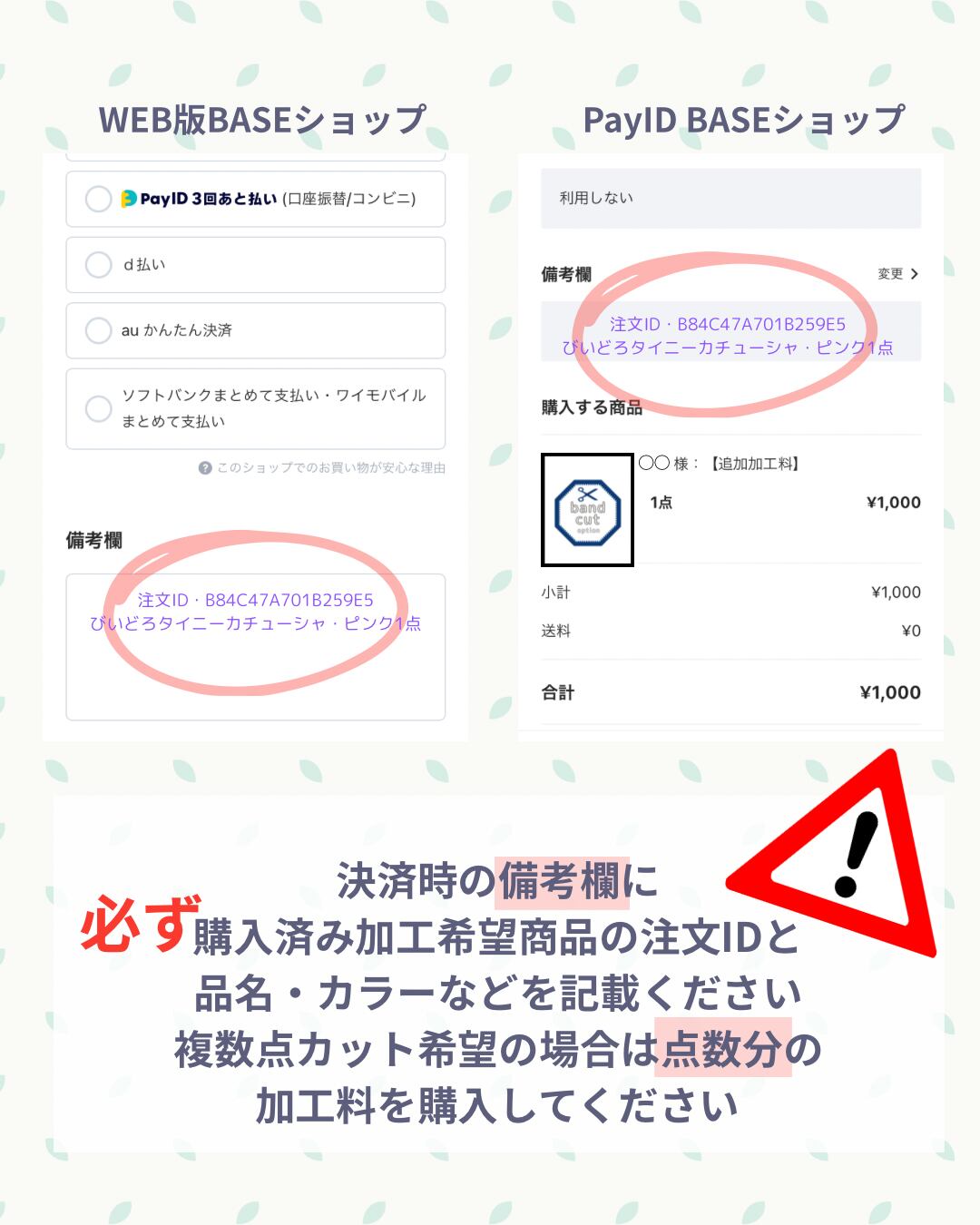 注文ID番号・品名・カラーなどを必ず記載ください
