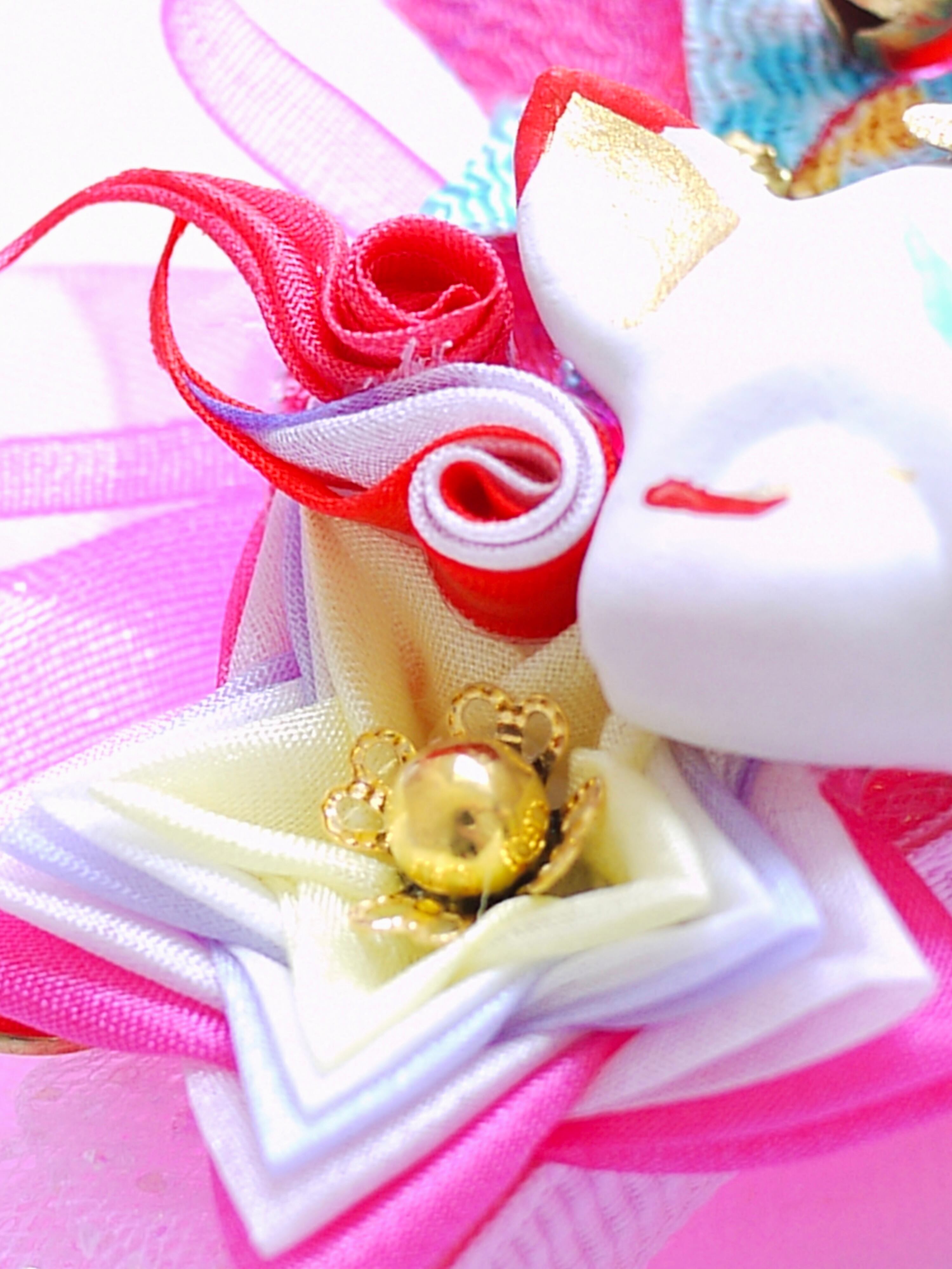つまみ細工は専用の糊のみで制作しております、水に濡れると糊が溶けて型崩れしたり、正絹地が変形・変色する原因になることがございます。 雨や水濡れ・湿気には十分お気をつけください。 濃色のものは特に色移りする場合がございます