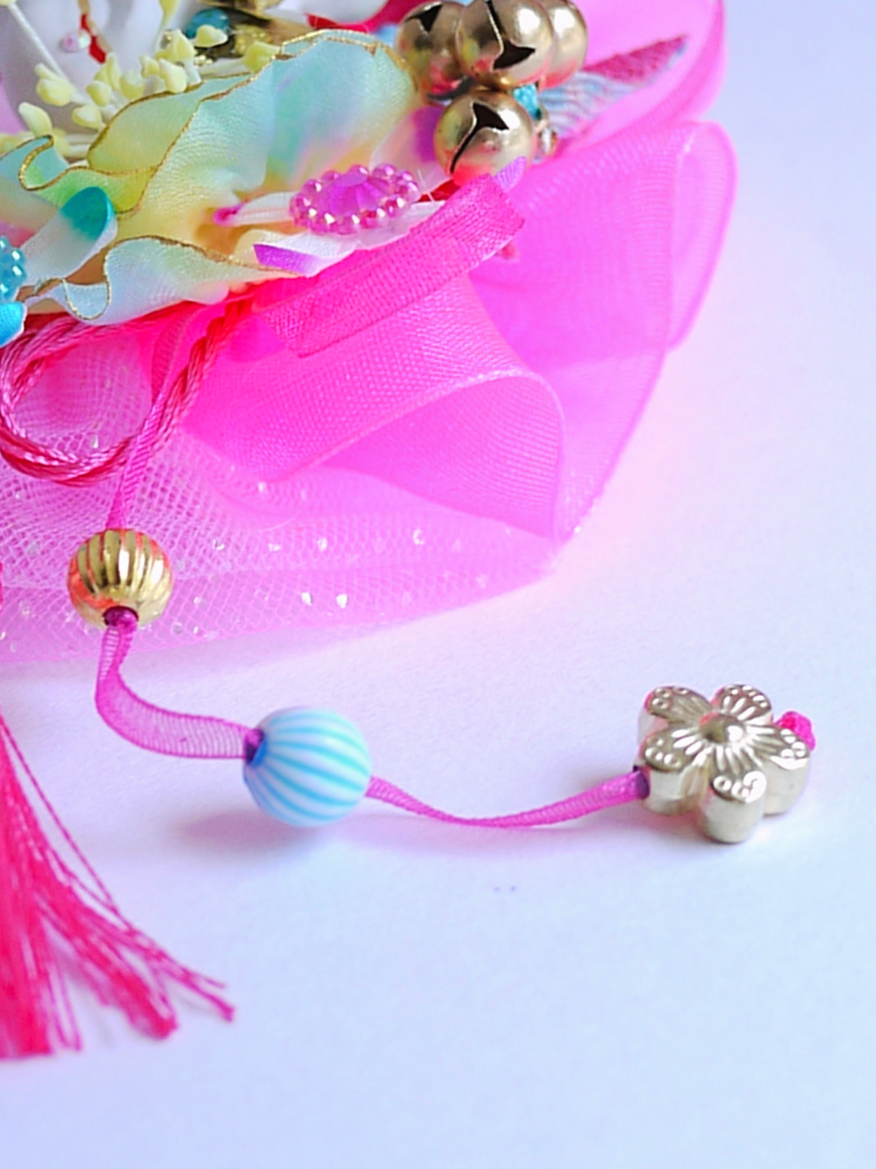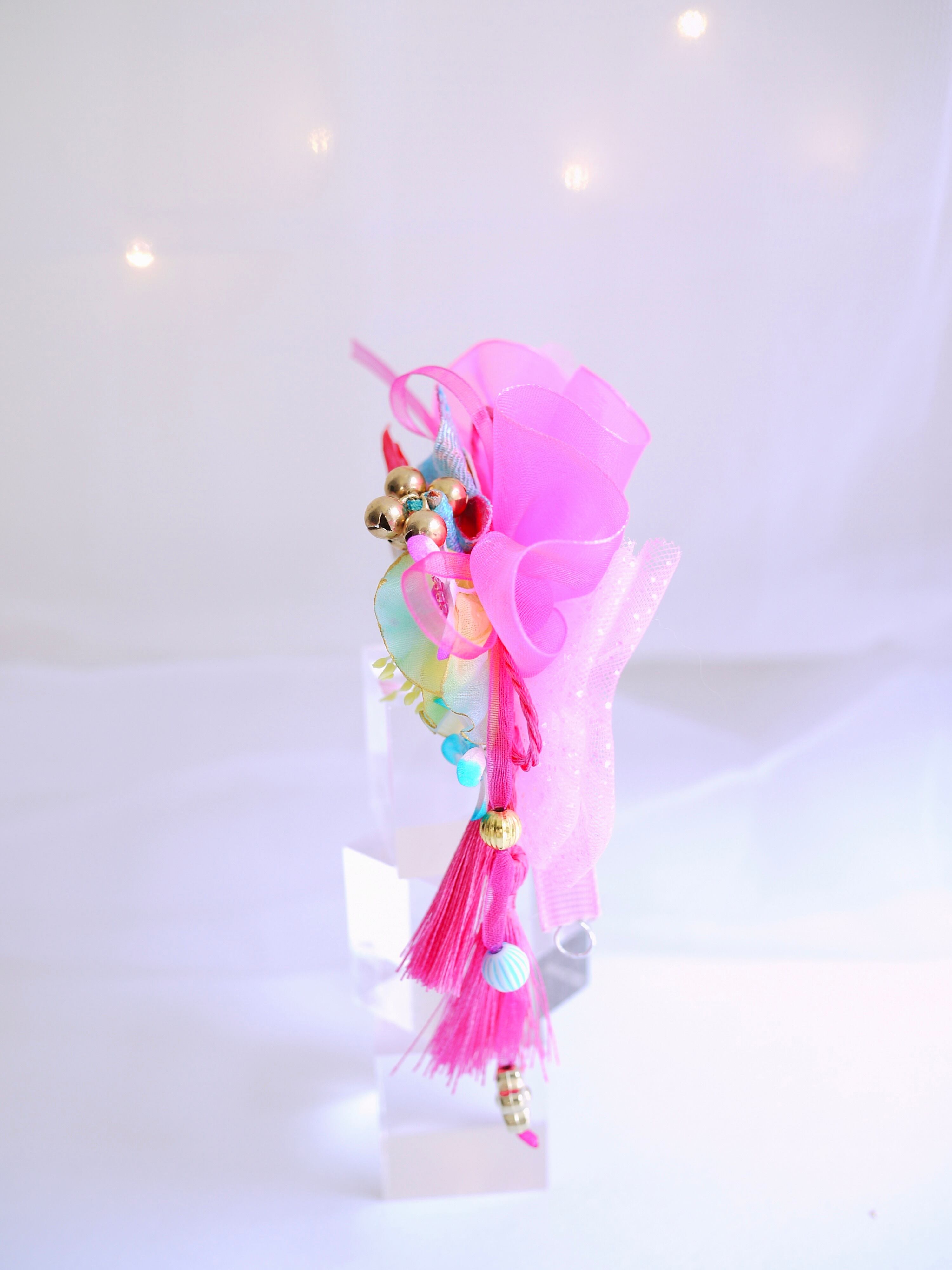 画像は少々青味が強く出ていますが、蛍光ピンクのフラッシュカラーが鮮やかなおリボン使いになっております