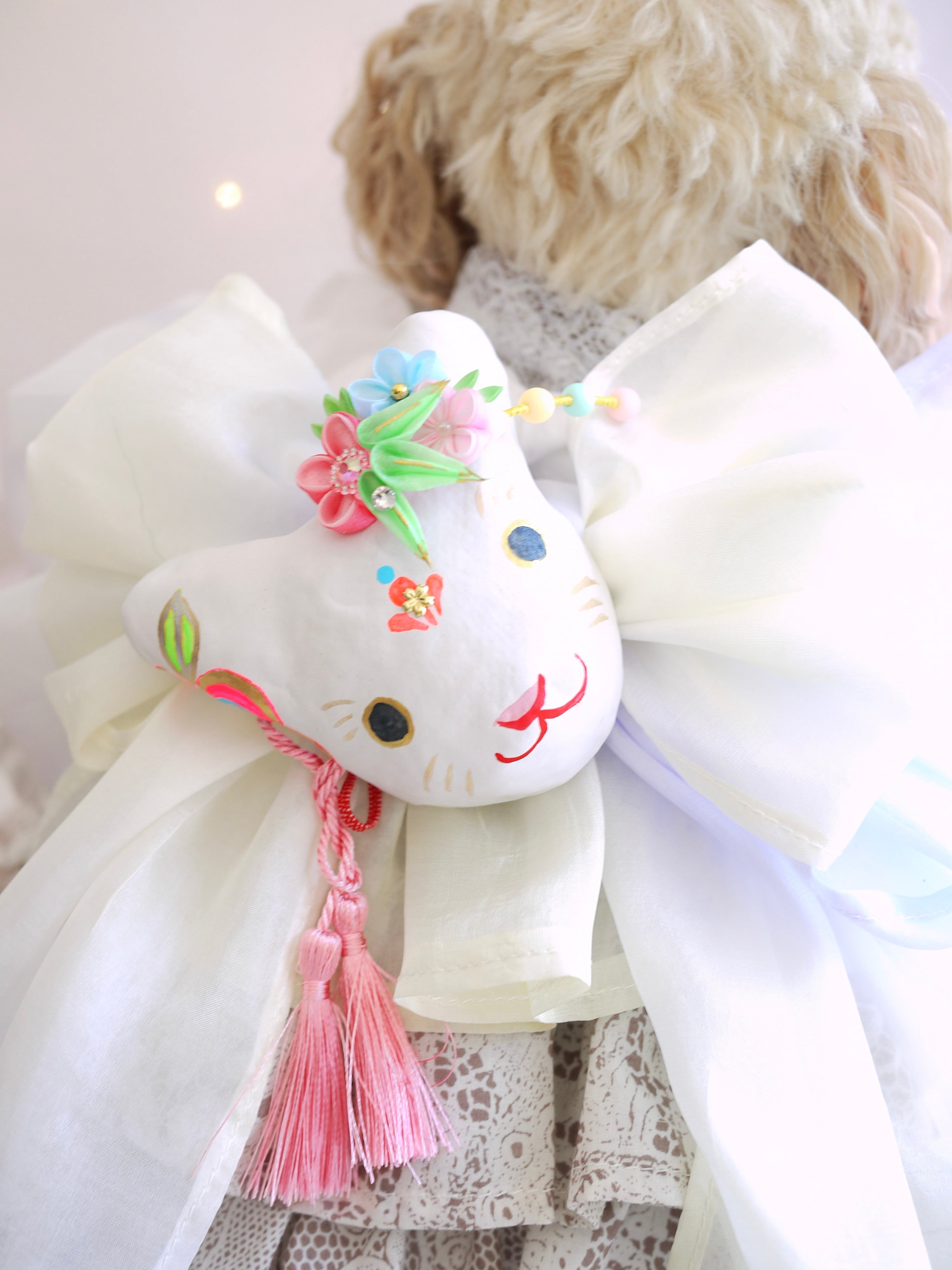 六歌の帯飾りでも人気、ちりめん貼り帯飾り【彩り狐面】ですがどうしても年間数点しか制作できないのと2〜3万円の価格帯になってしまうので、もう少し気軽に使っていただけてさらにコンパクトに小さなコもあしらいやすいサイズ感で制作しました