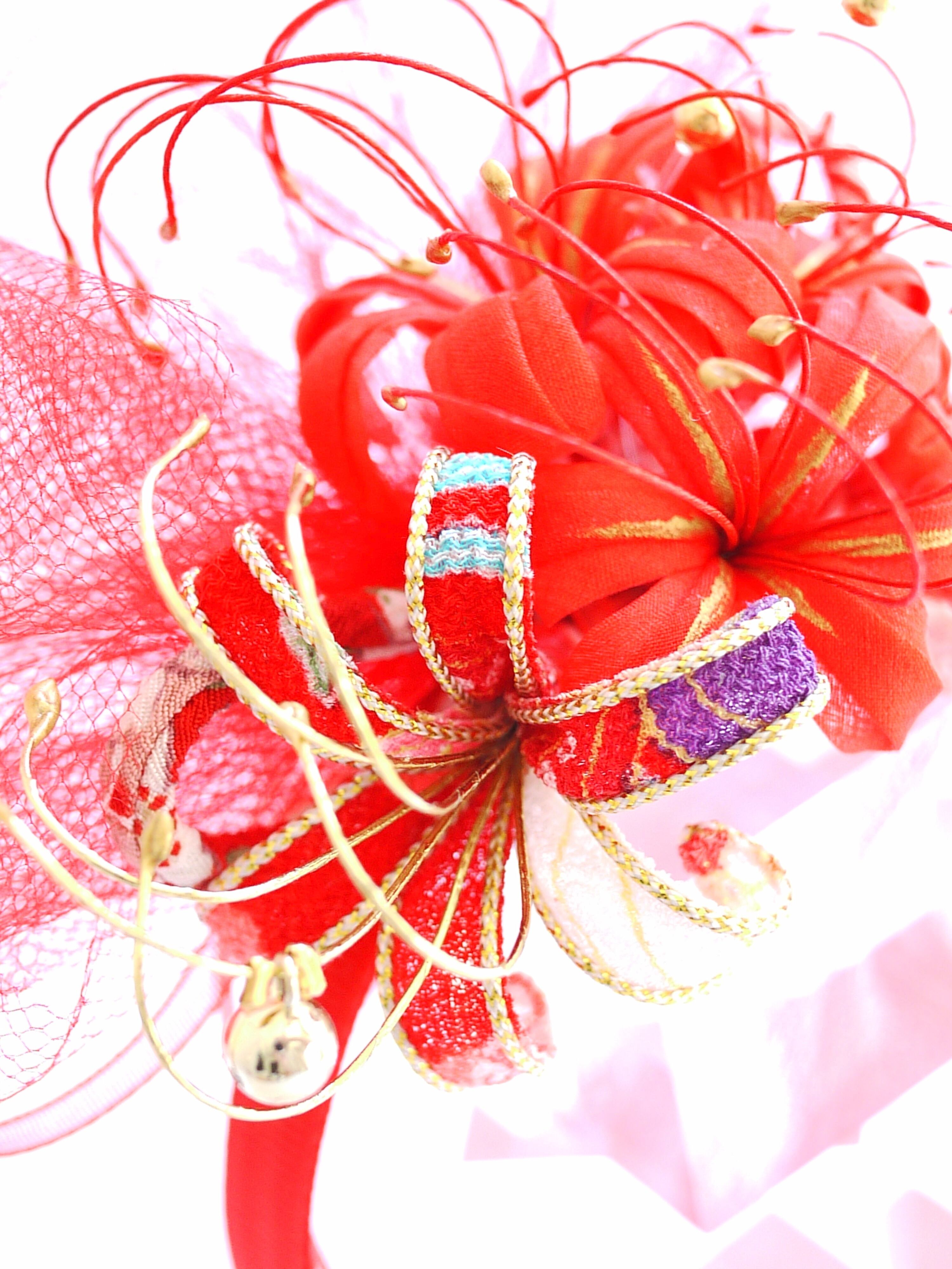 羽二重つまみに古典柄のちりめん曼珠沙華も添えて錦絵のような華やかさに仕上げました