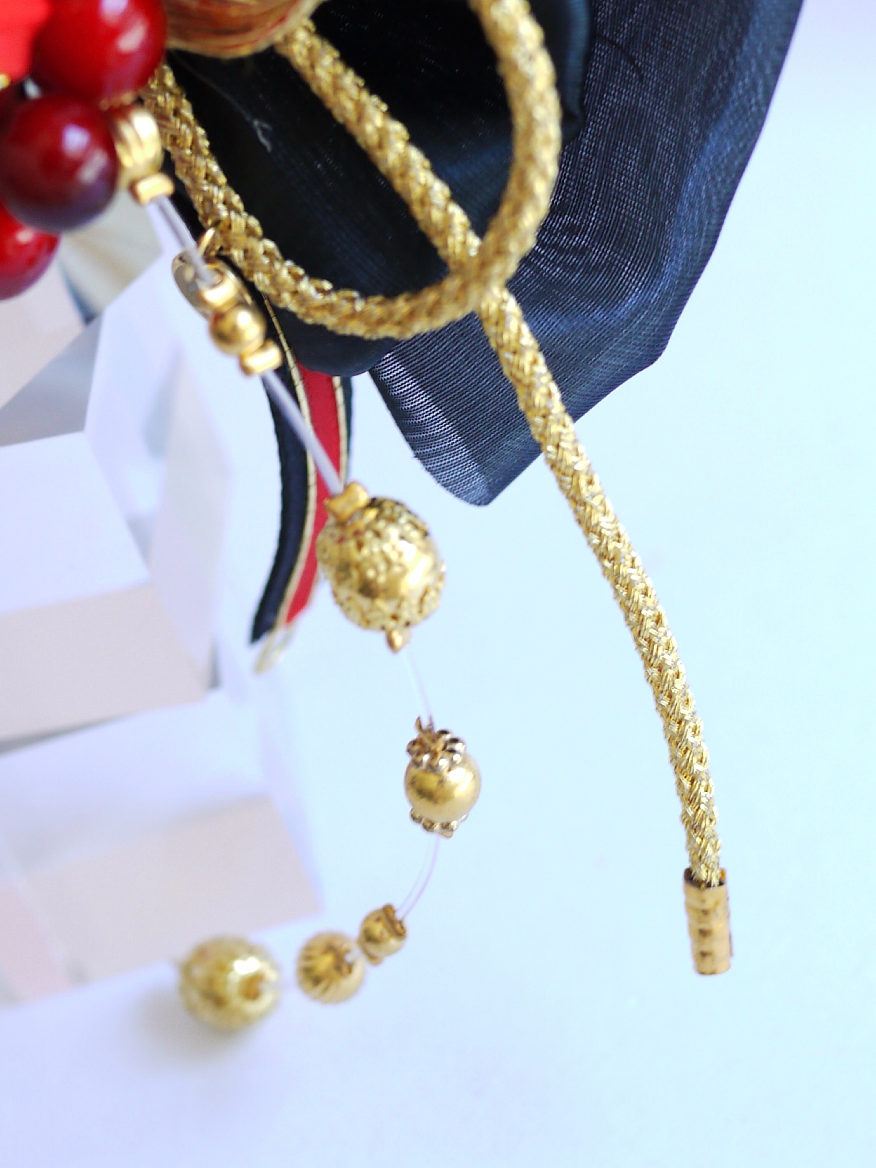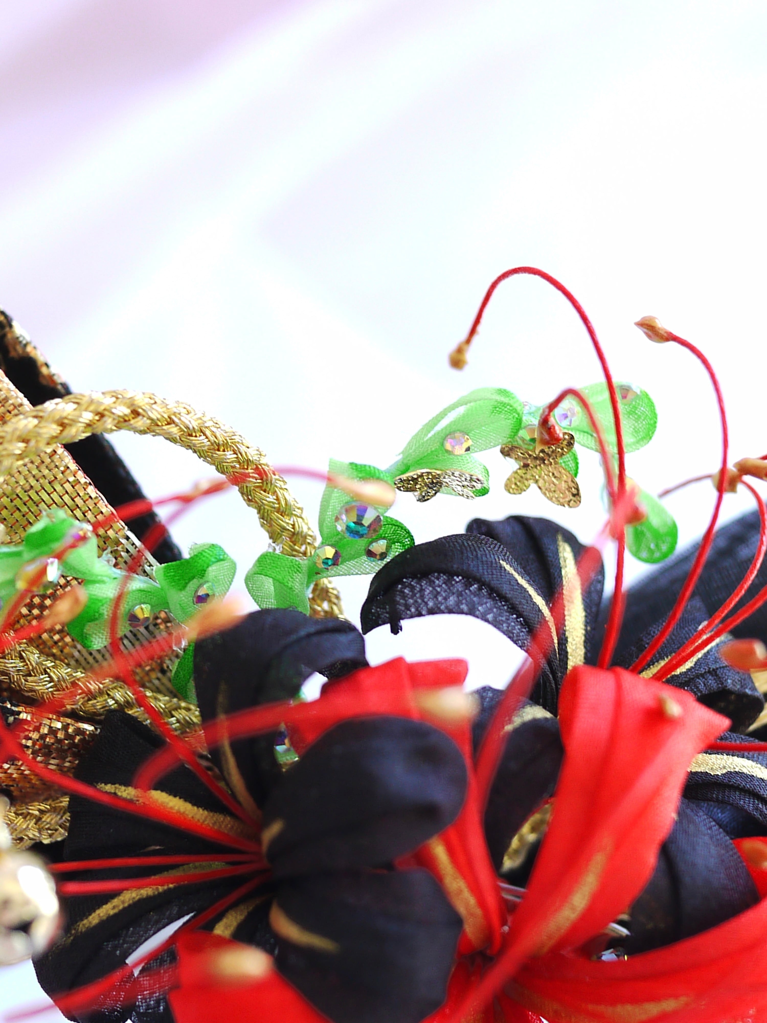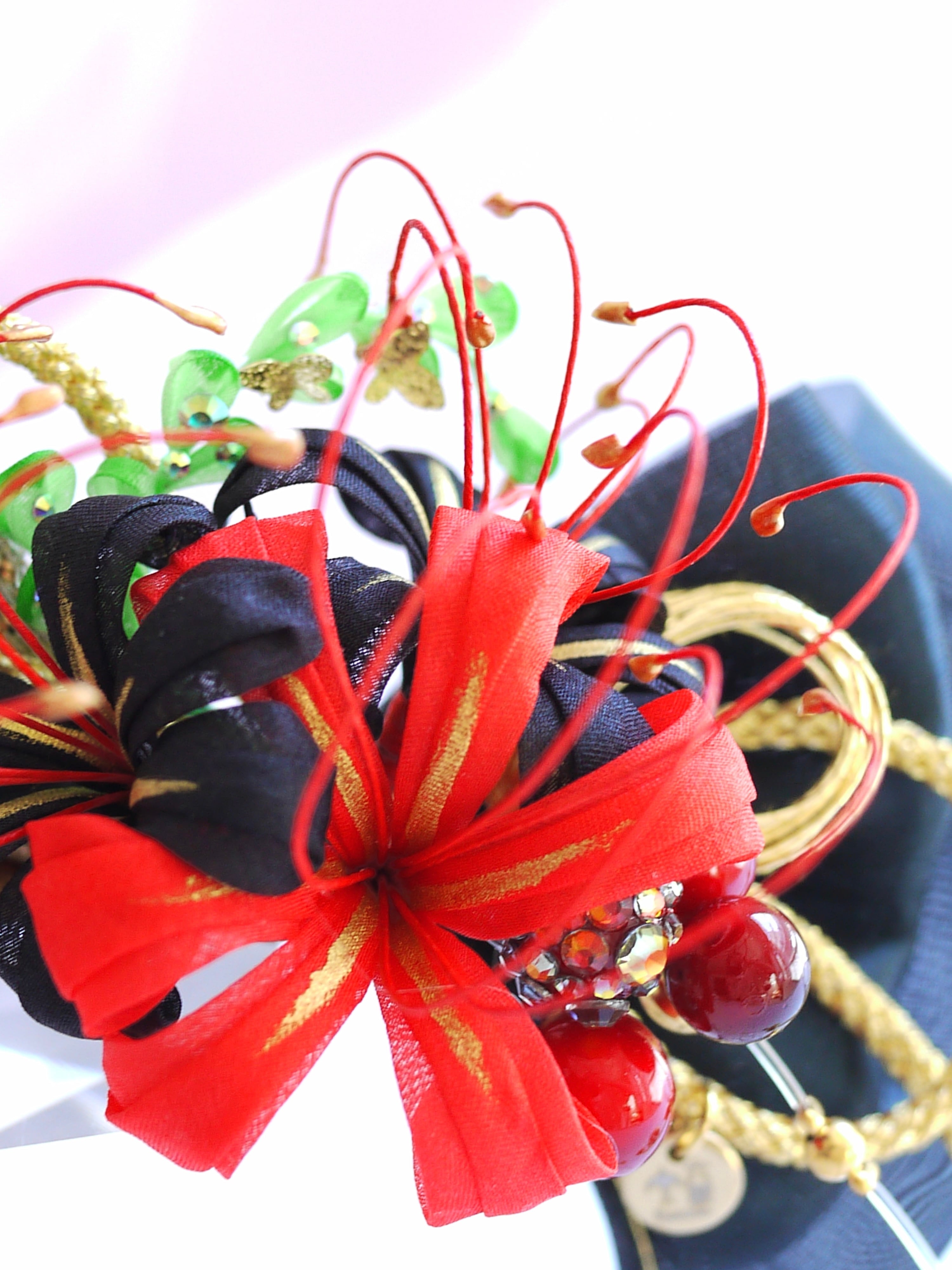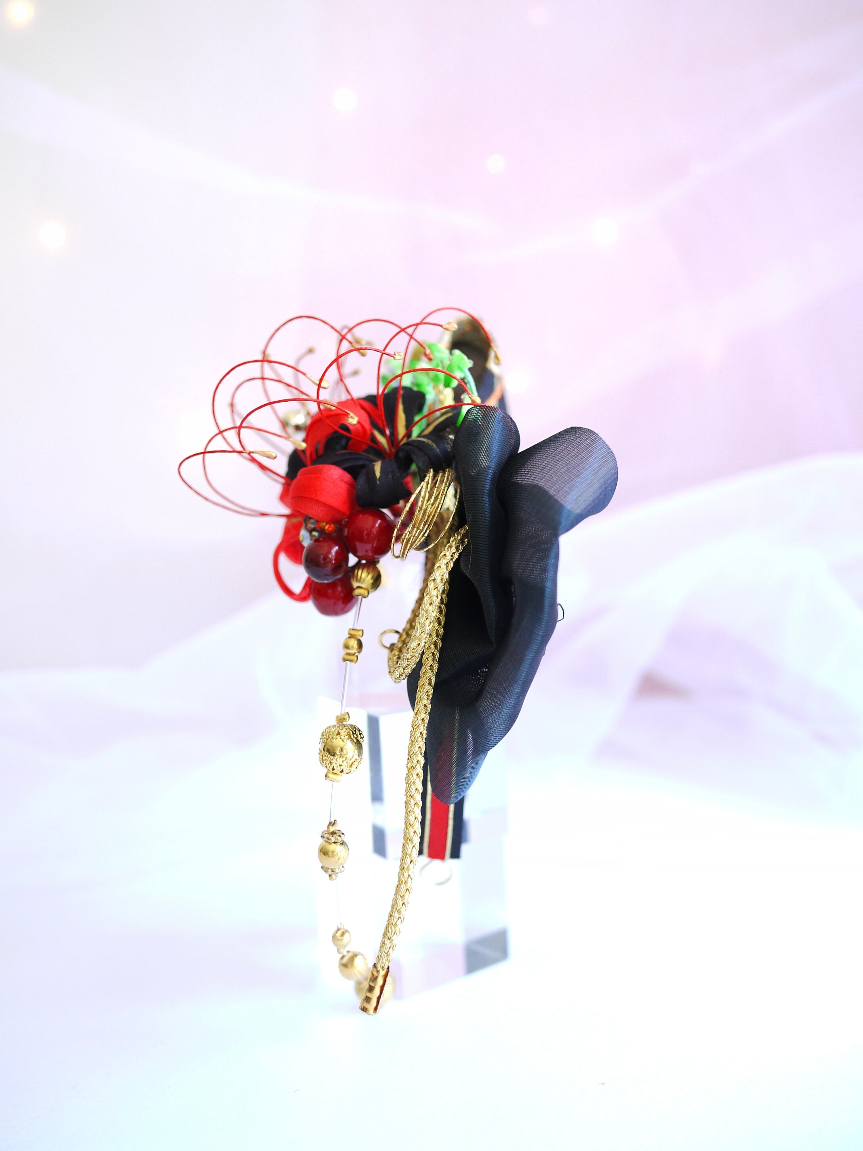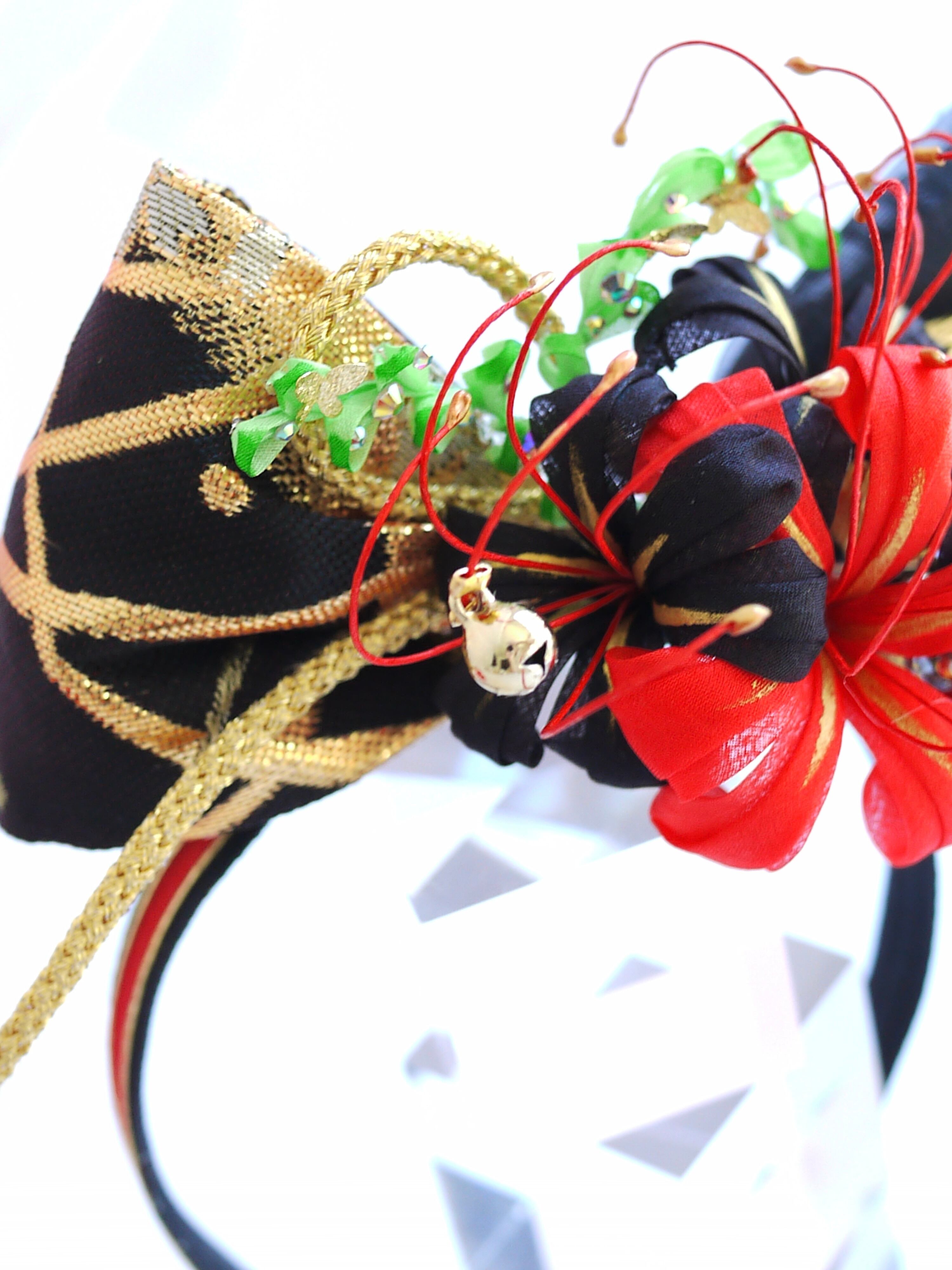 曼珠沙華のつまみ細工の空間の抜け感を活かす為にシンプルな金紐を添えて力強く伸びやかなフォルムに