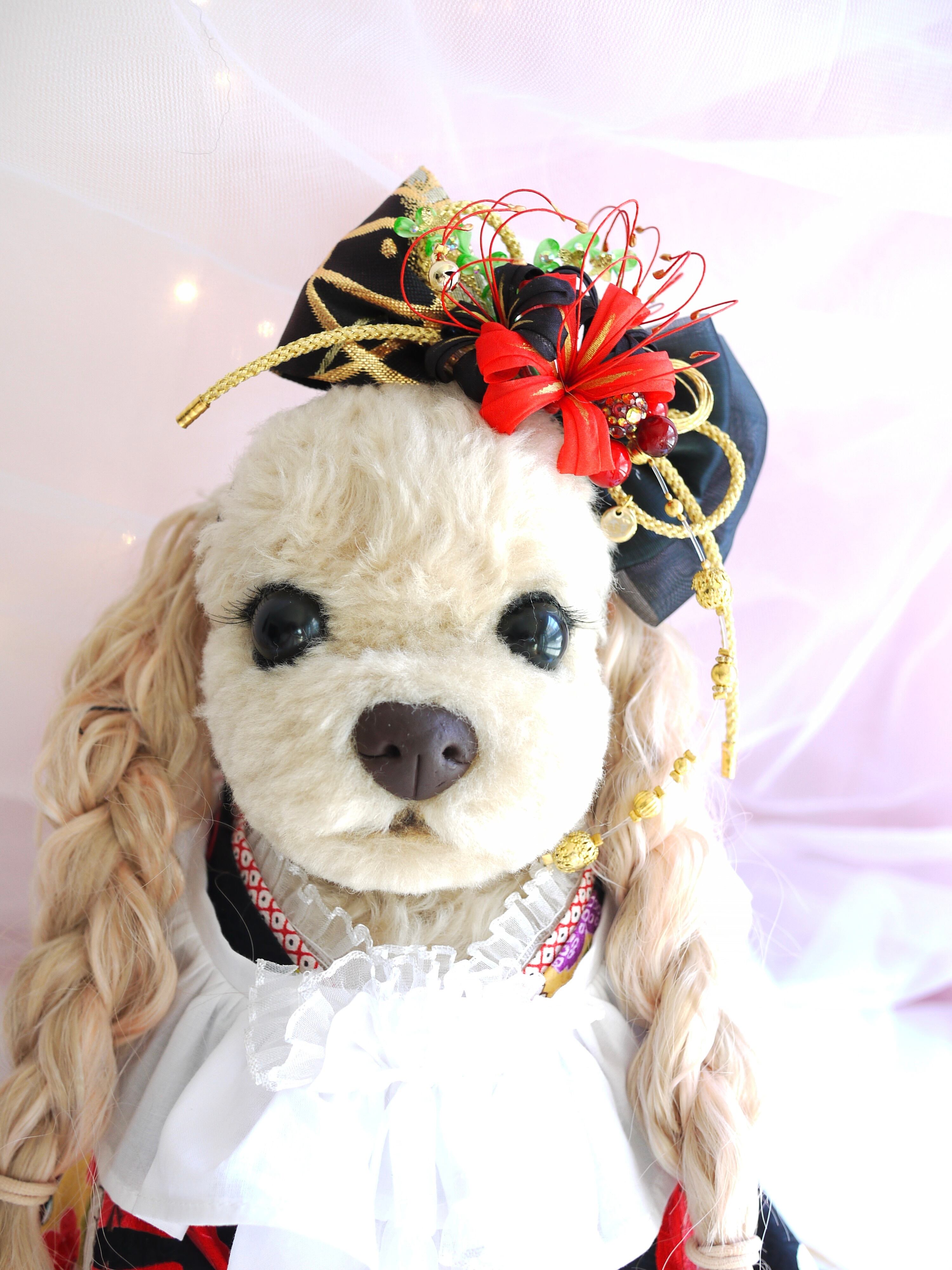 金襴素材の張りのあるリボンで比較的大ぶりなサイズ感で制作していますので小柄・小顔のワンちゃんは実寸をお確かめくださいね