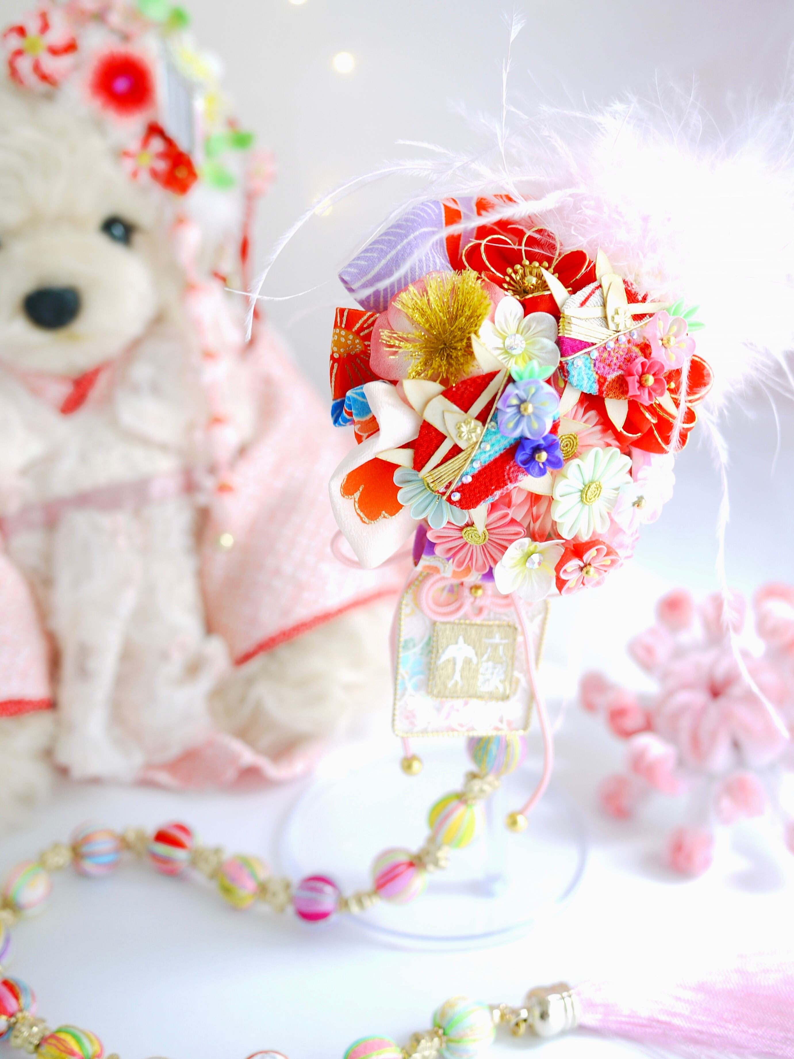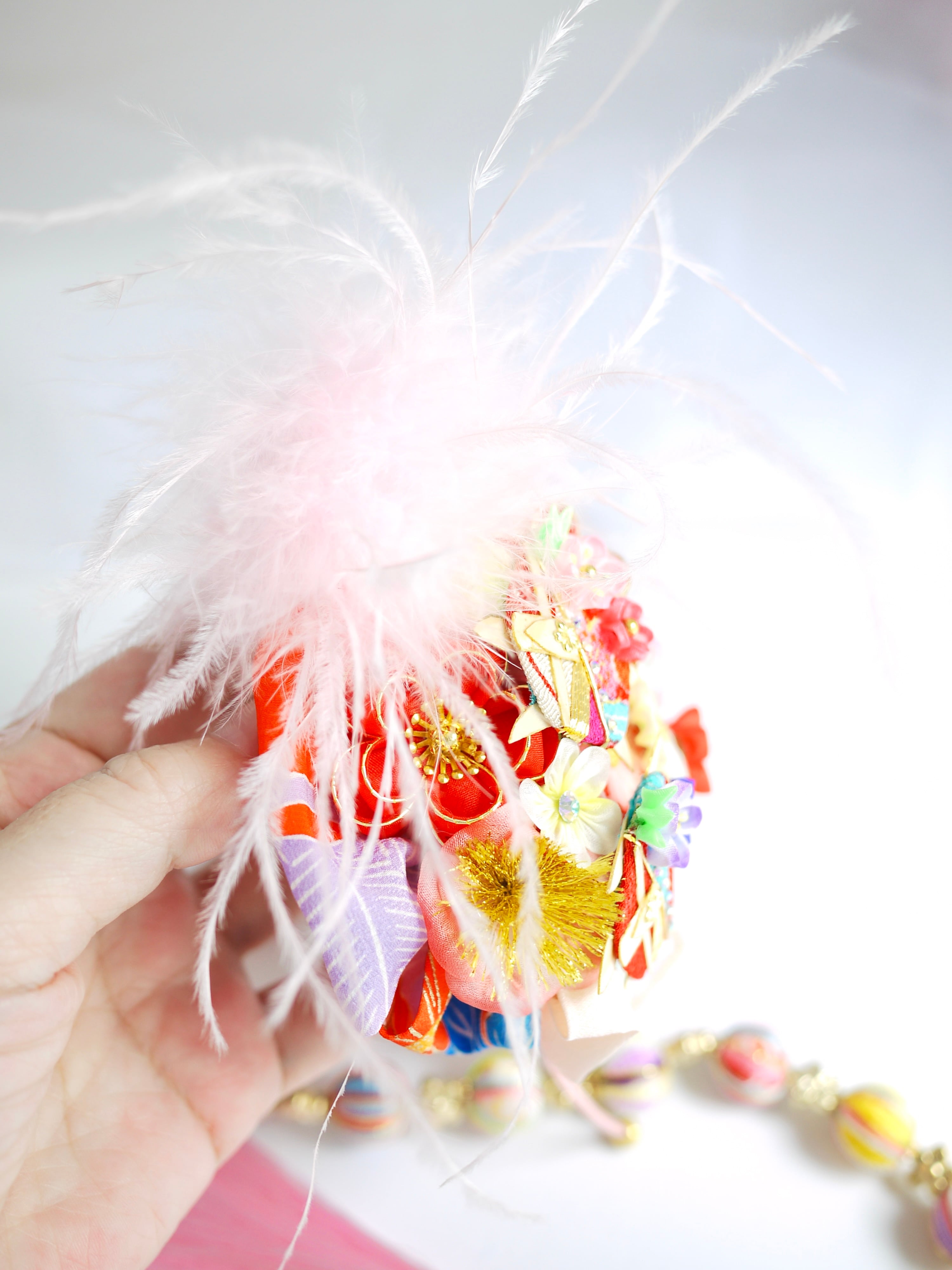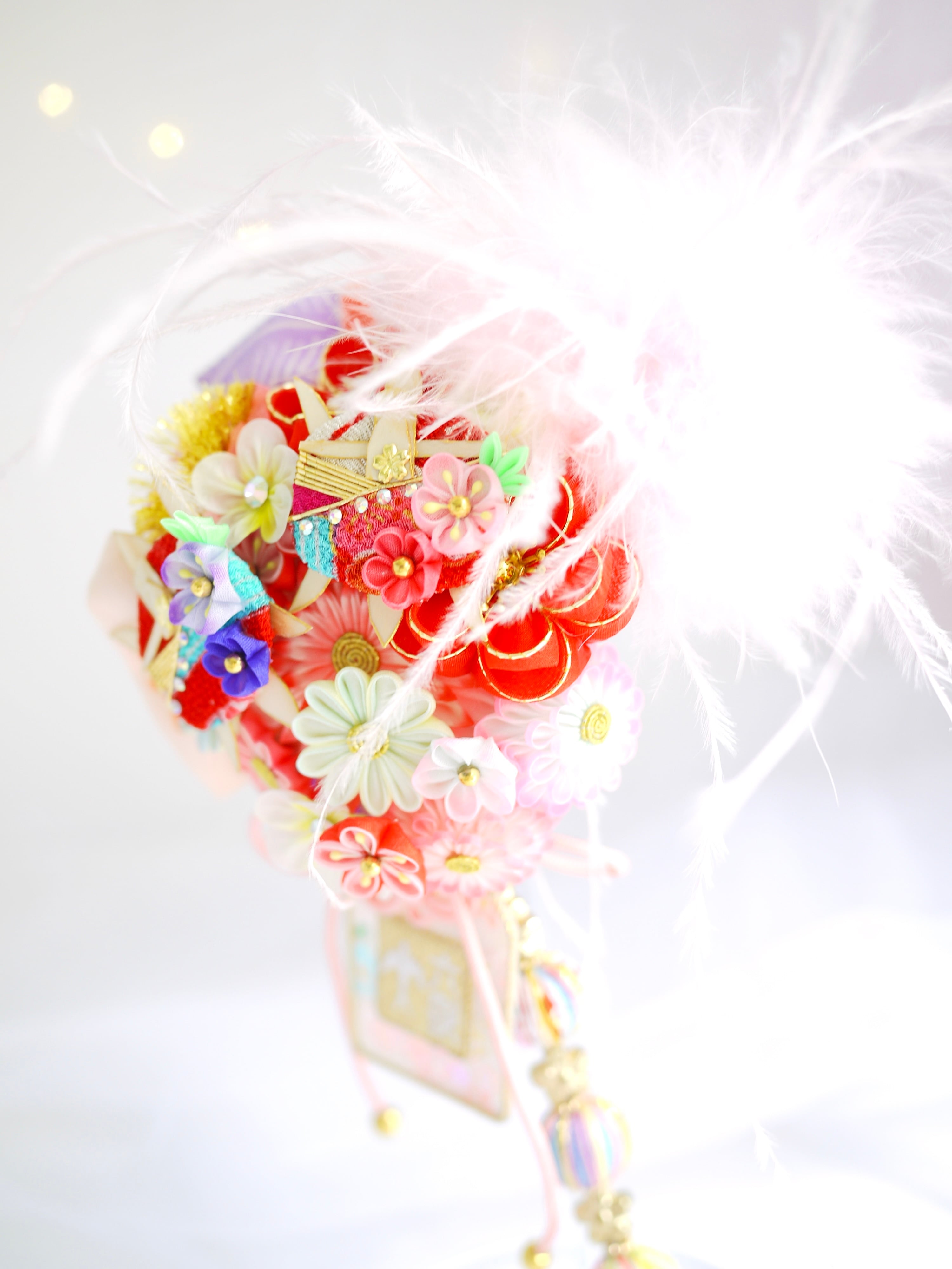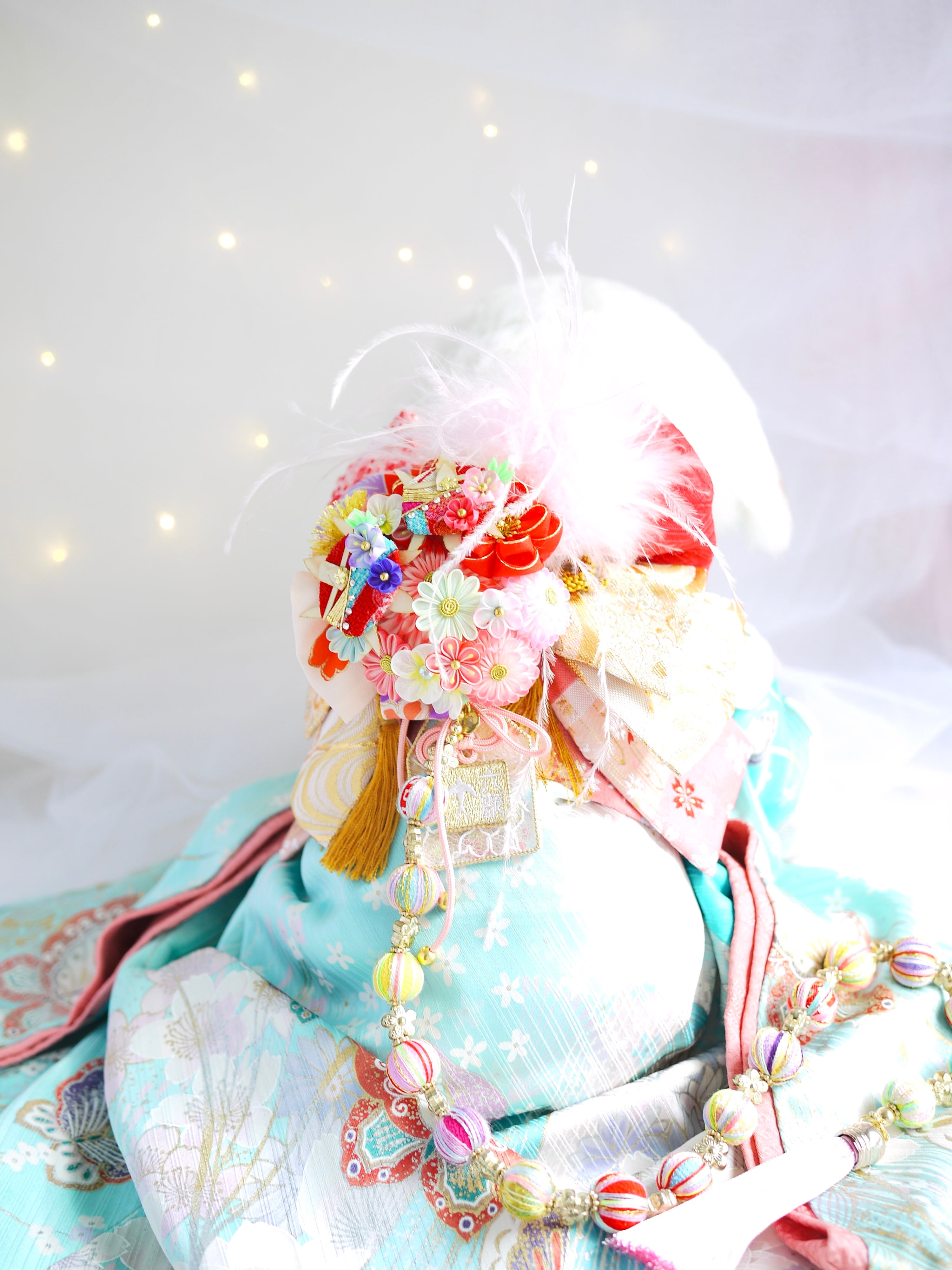七五三のお祝いに相応しくふわふわの羽飾りと