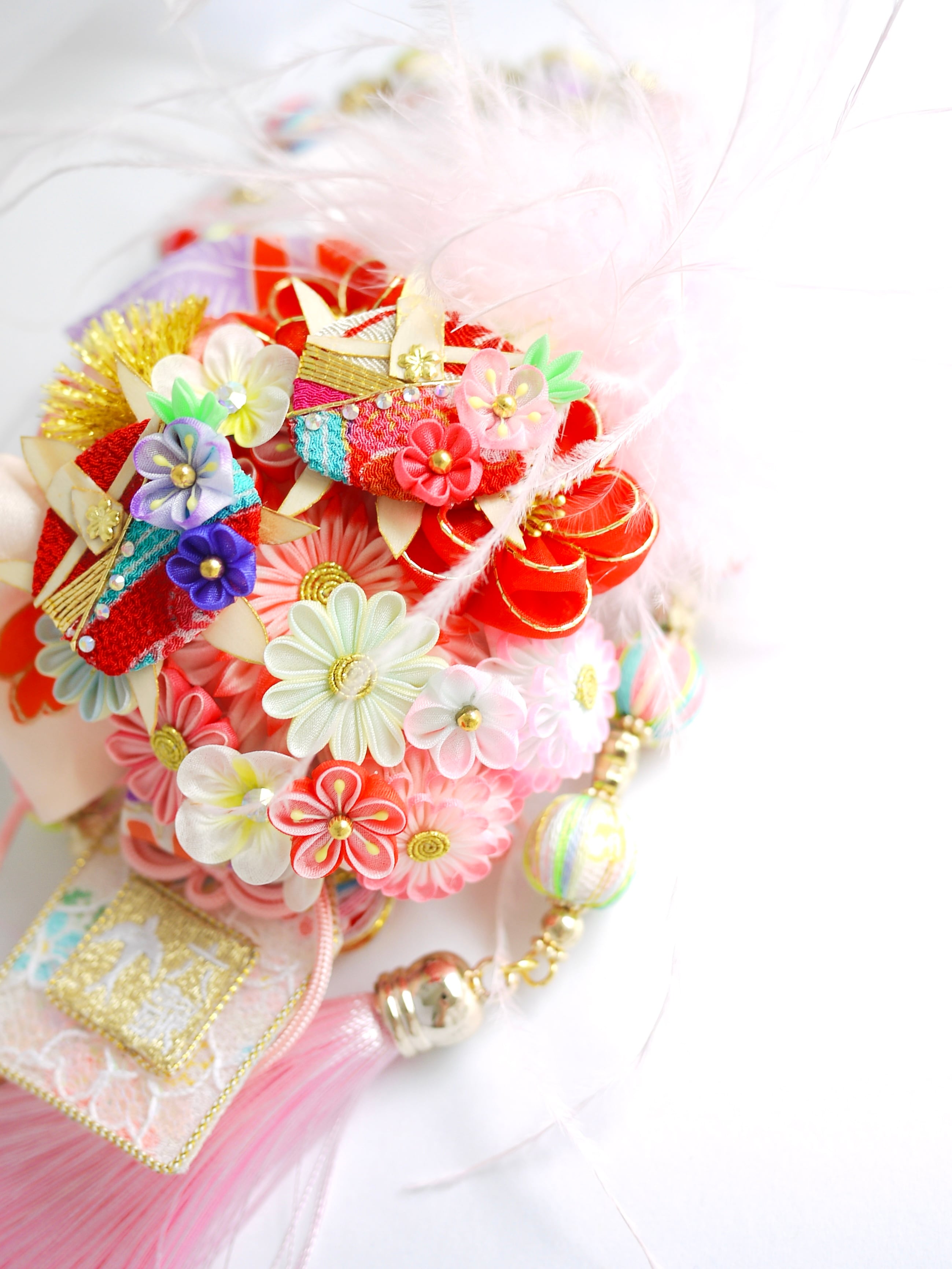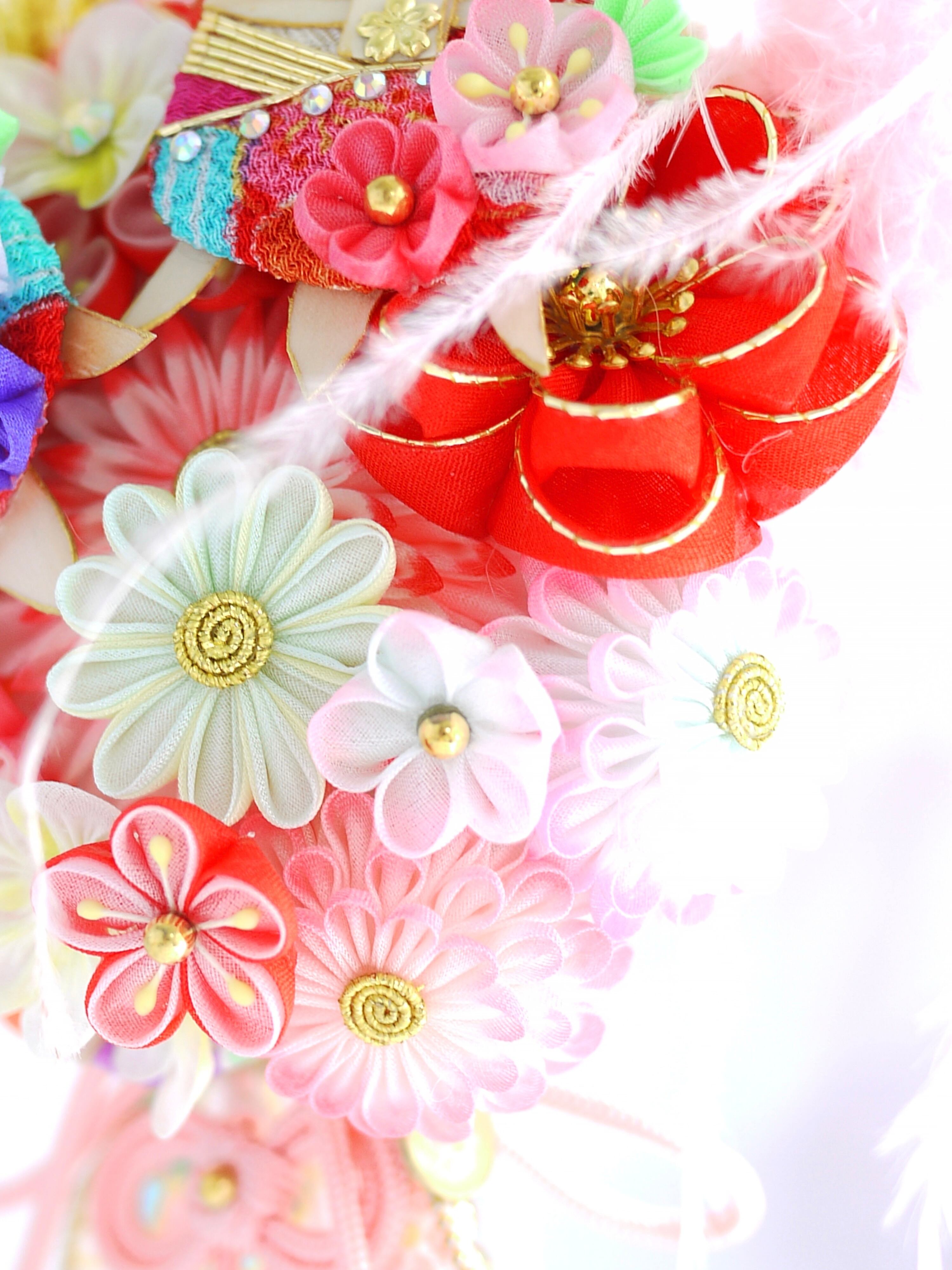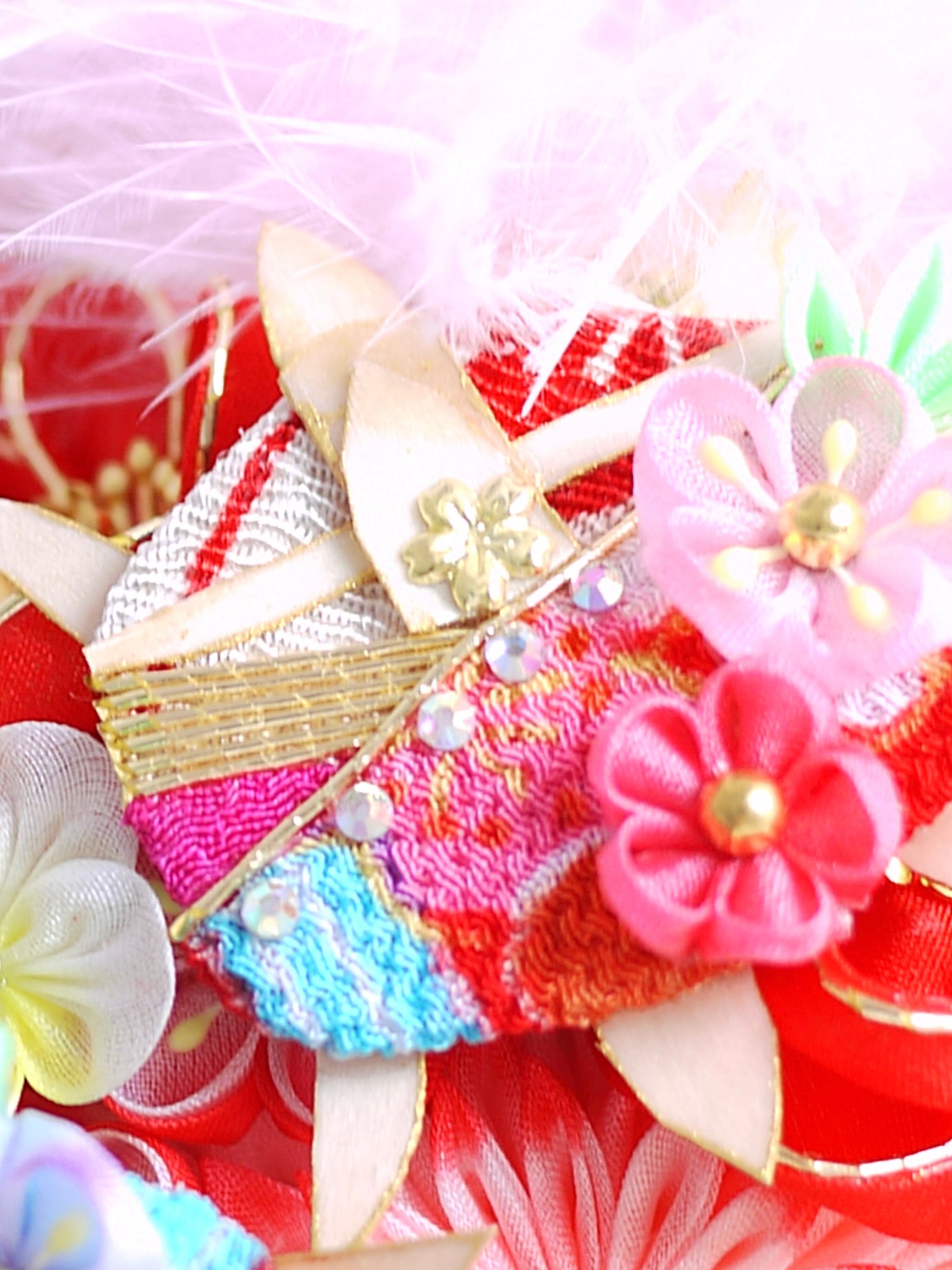 メインのつまみ細工のお花や玉飾りもマルチ配色で賑やかにまとめているタイプはお着物を選ばす合わせやすいので末長く色んな場面で使っていただけたら嬉しいです