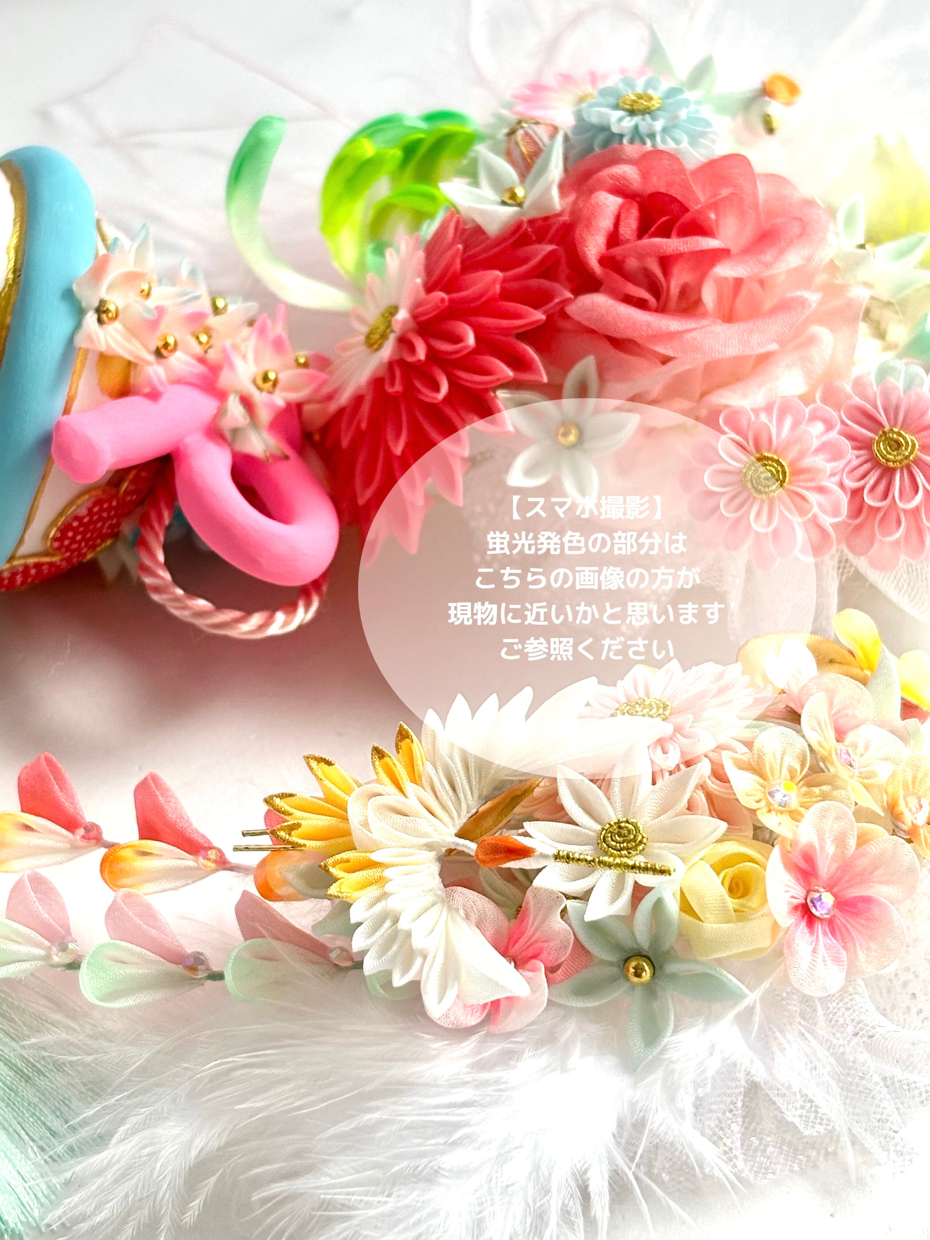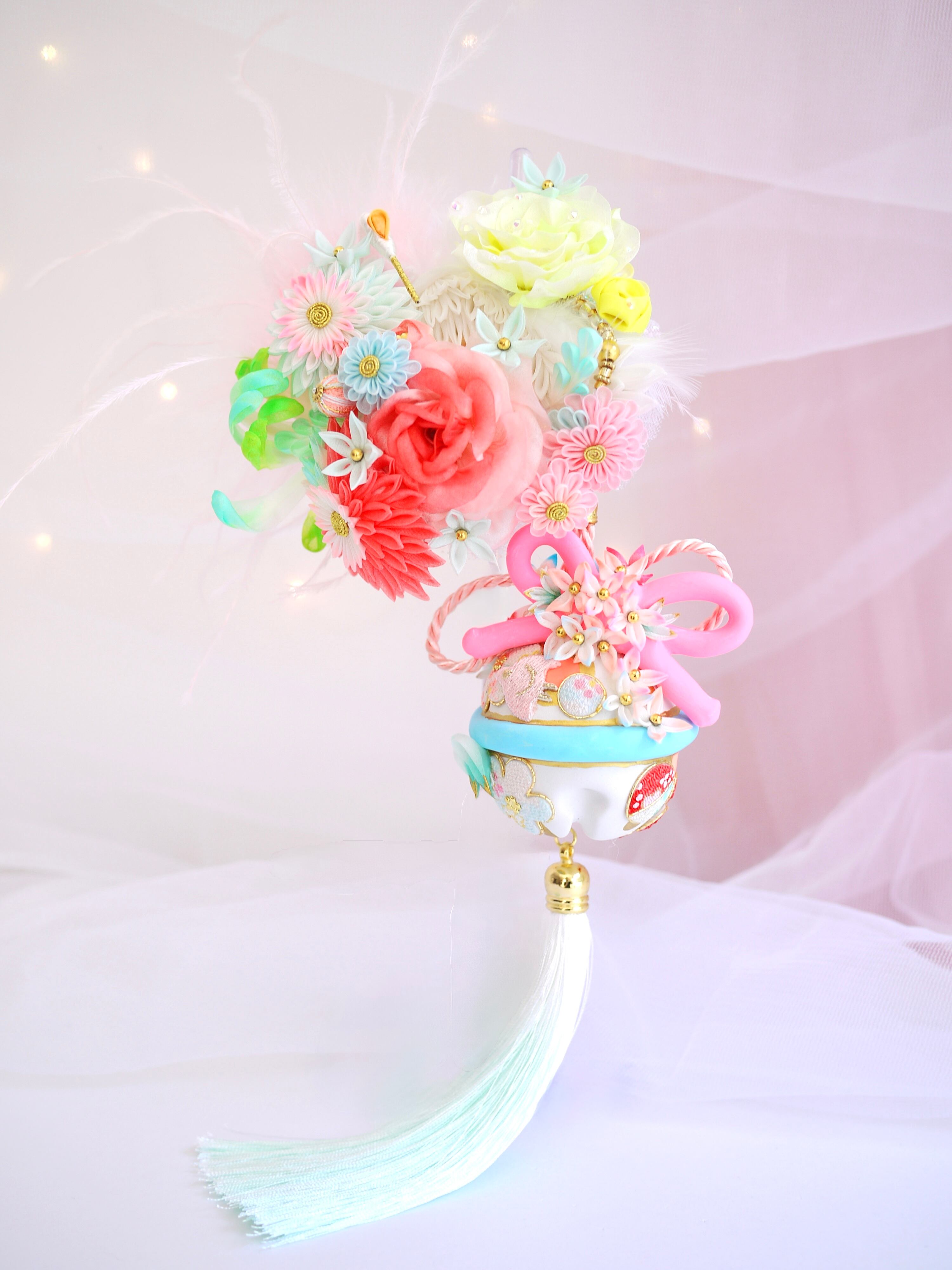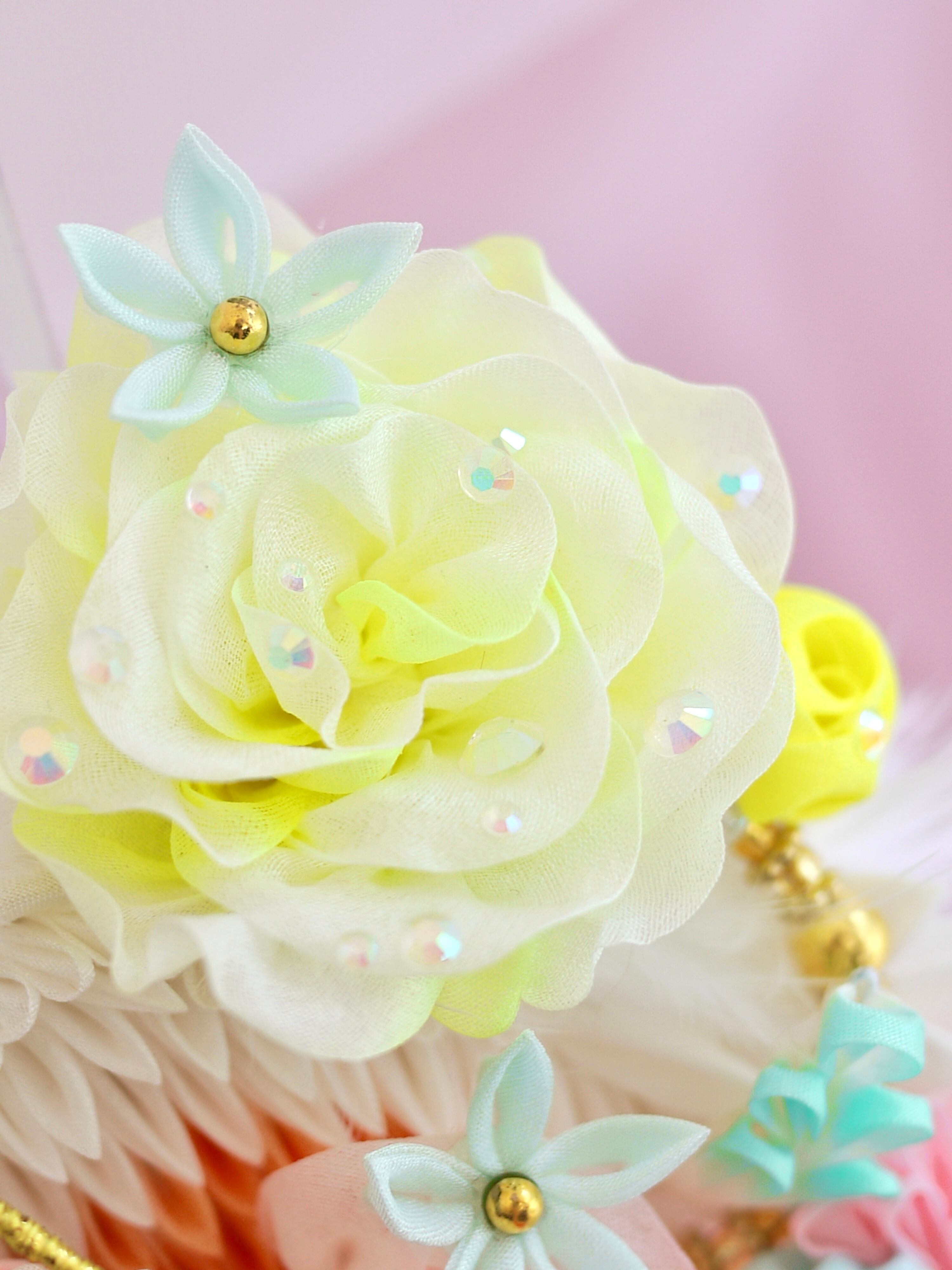 髪飾りの鶴は小さく小さく作り込んでさりげなくあしらい、夕鶴をイメージして優しい色合いに。帯飾りは極楽花にふんわり抱かれながらこっそり優雅にお昼寝をしているようにあえて消えいるような存在感にして。