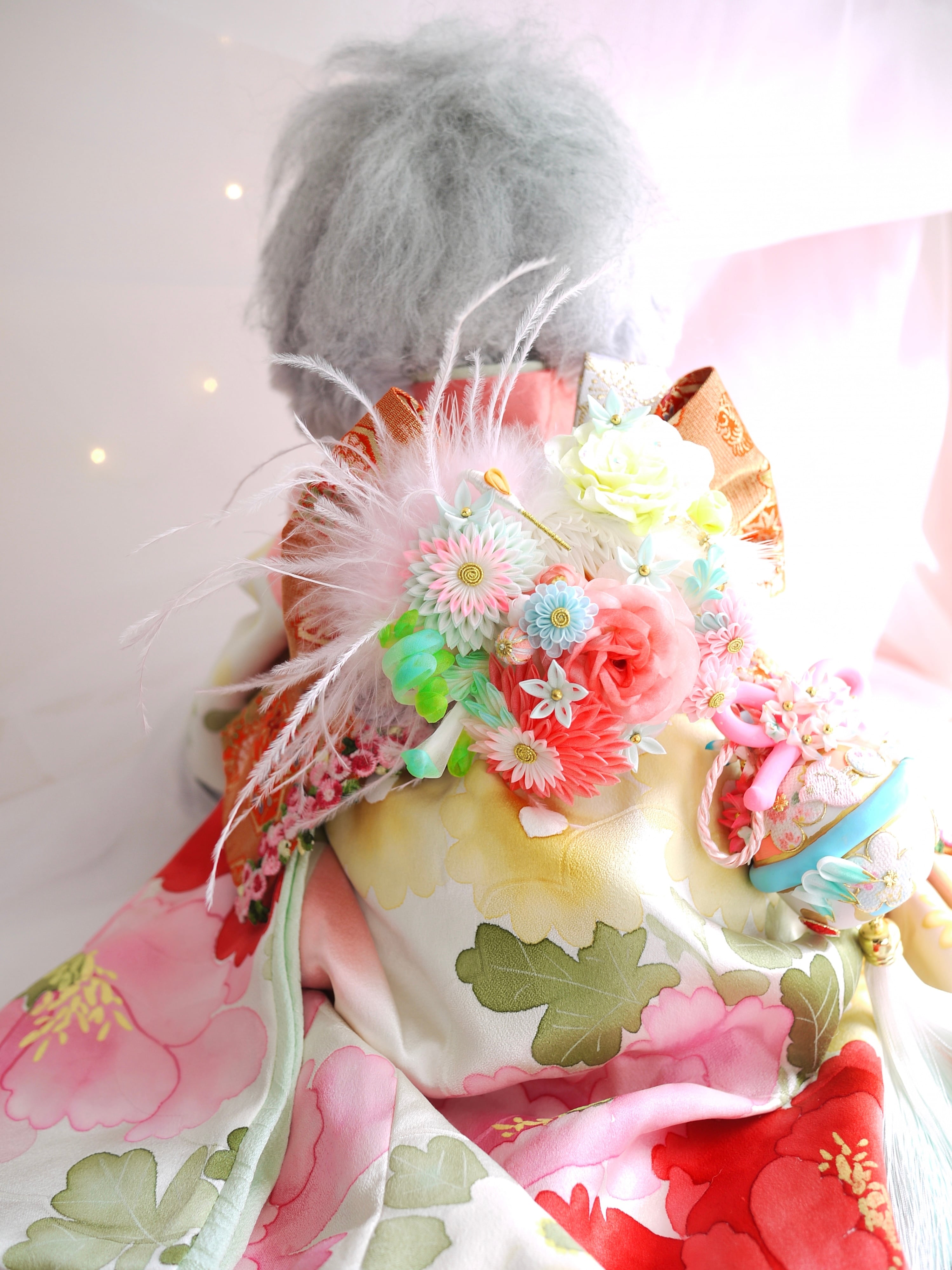 帯飾り・かんざしともに羽根飾りをあしらって祝い飾りらしい華やかさもありながら