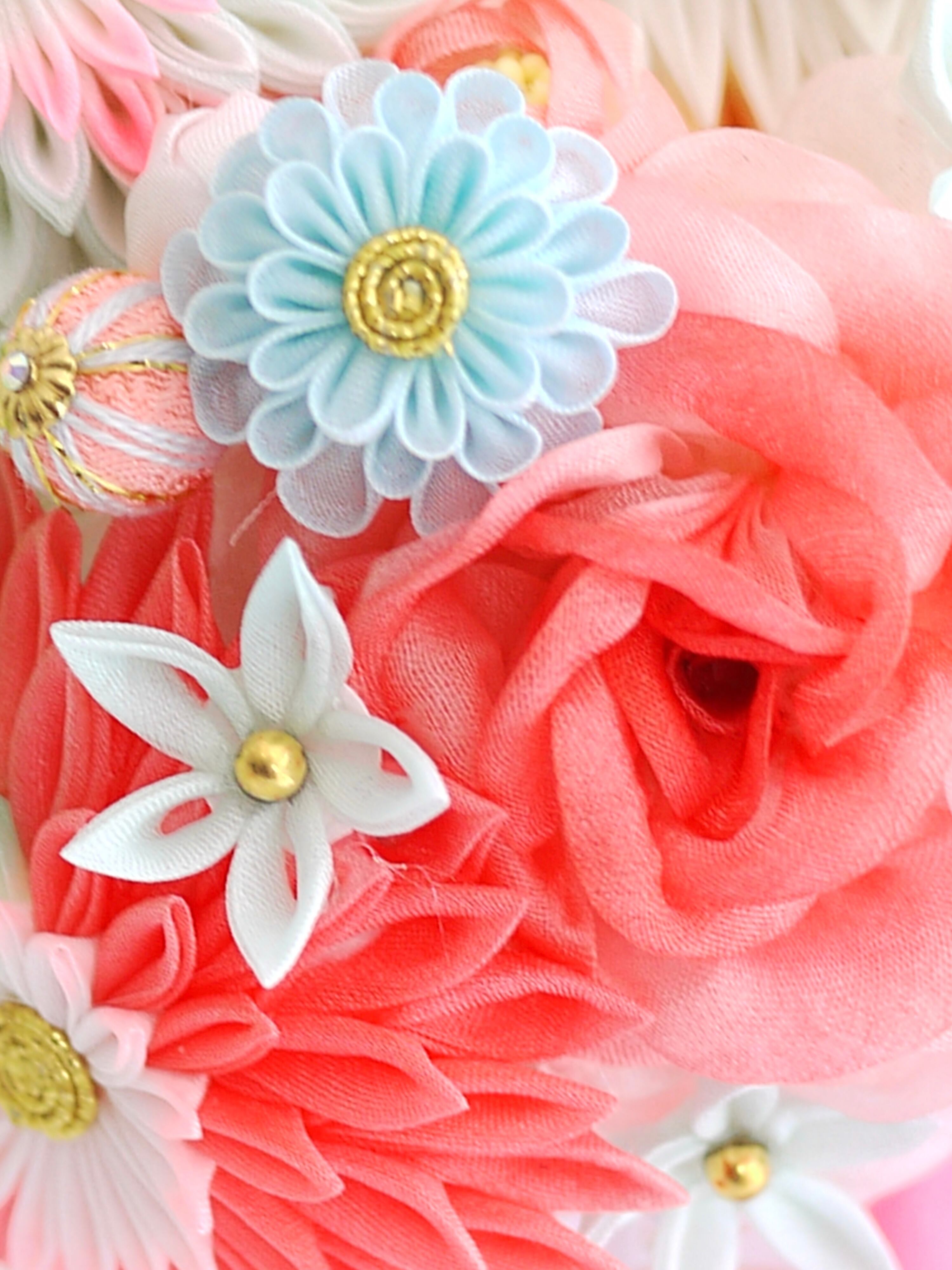 ひだつまみの小花を沢山詰め合わせてふんわり柔らかなフォルムとメインの半くすの剣つまみでキリっと引き締めて