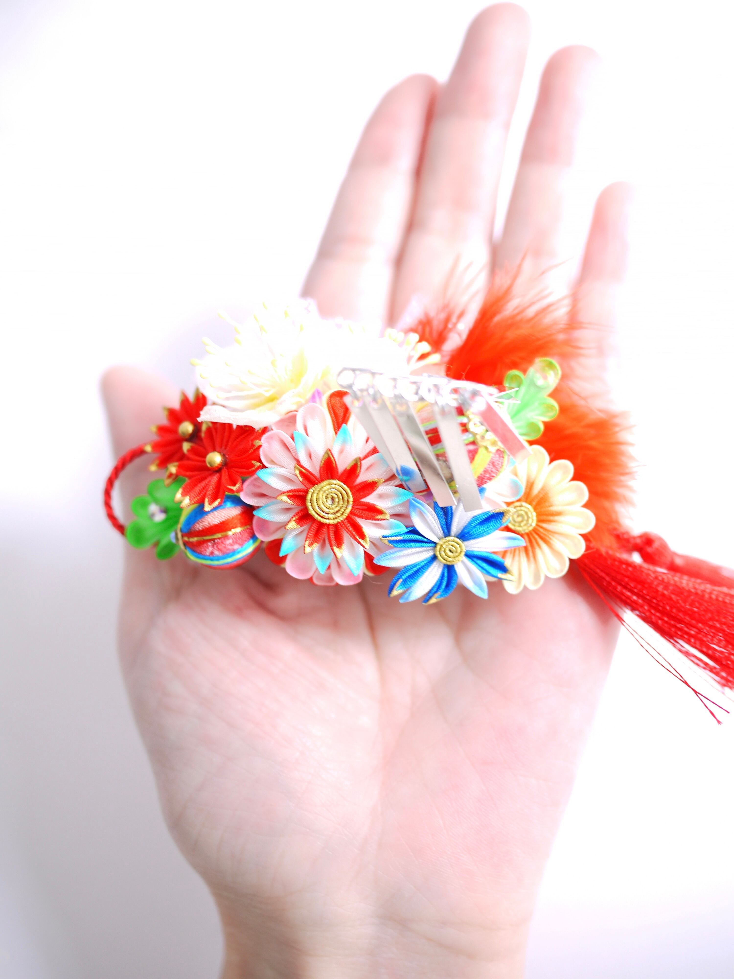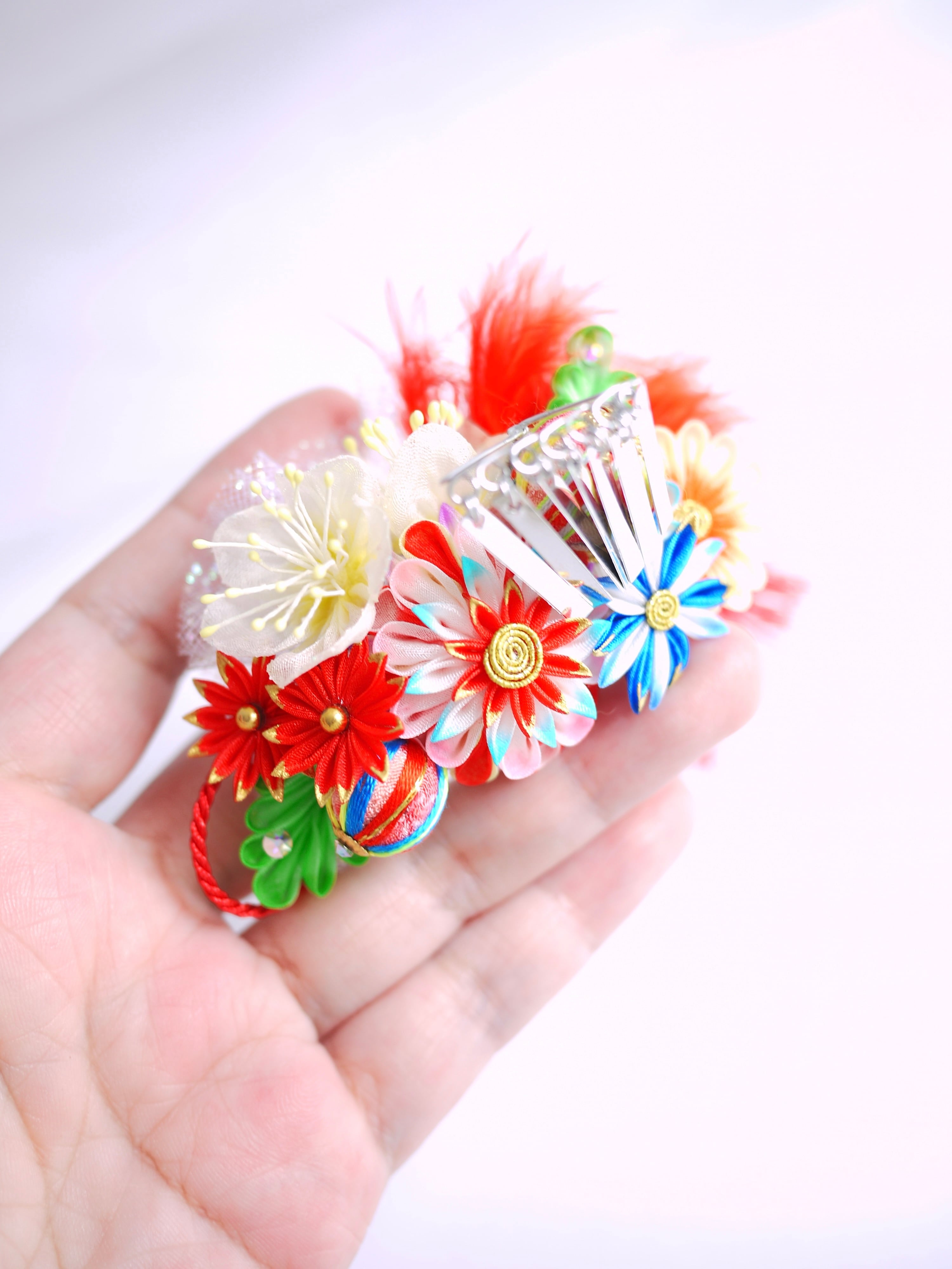 つまみ細工は専用の糊のみで制作しております、水に濡れると糊が溶けて型崩れしたり、正絹地が変形・変色する原因になることがございます。 雨や水濡れ・湿気には十分お気をつけください。 濃色のものは特に色移りする場合がございます