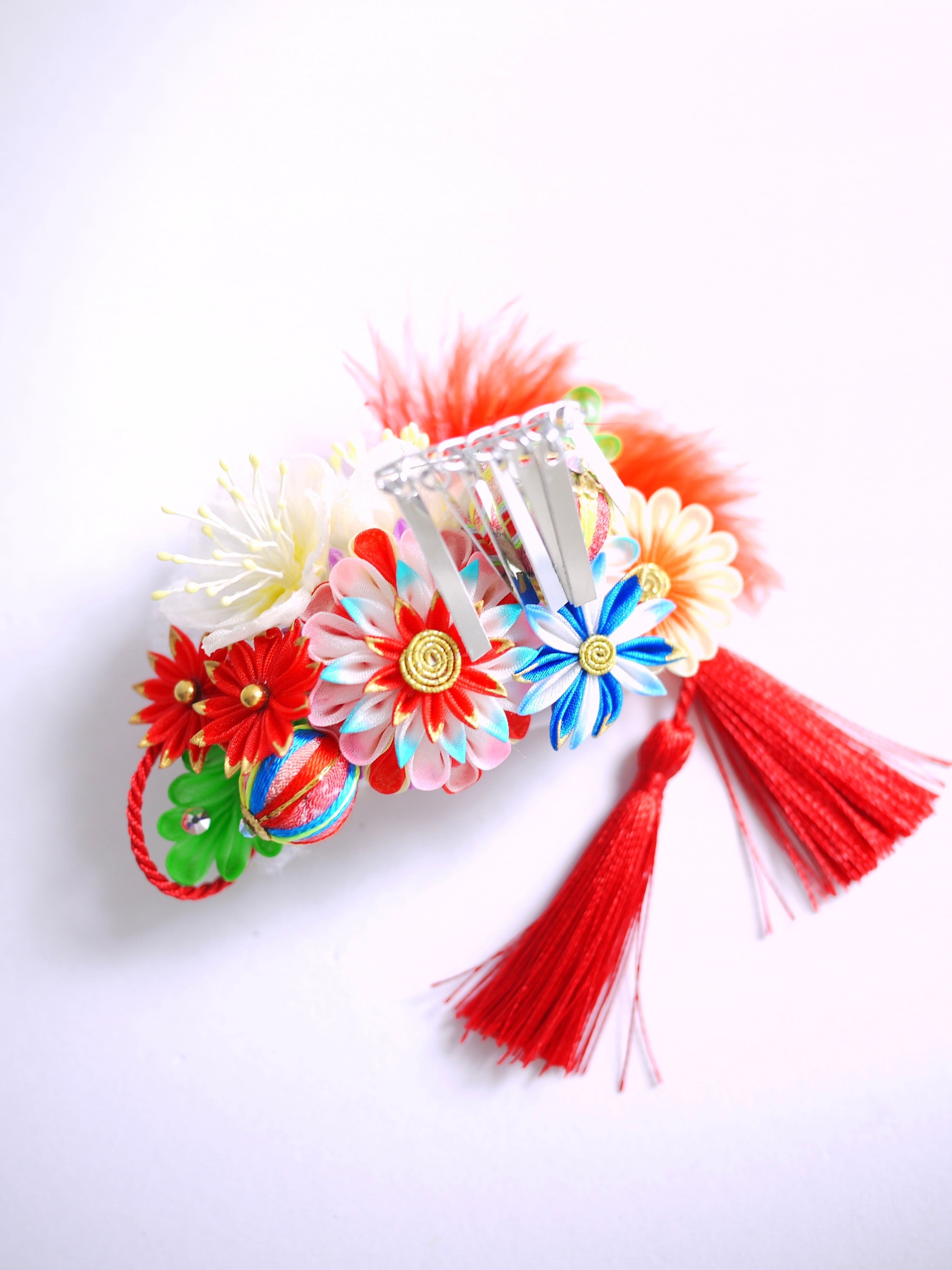 真っ赤な羽飾りとハラハラ揺れる銀ビラが初々しい愛らしさの花かんざしです