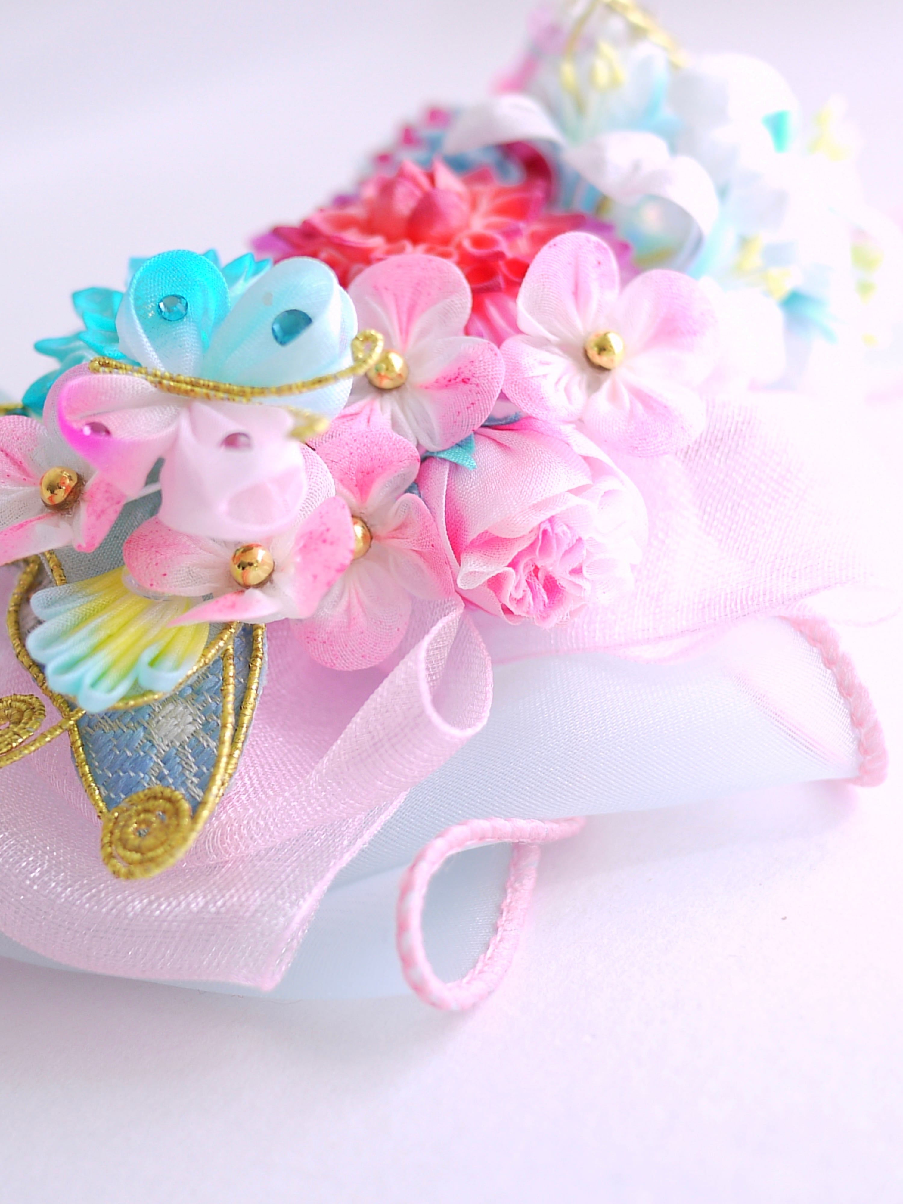 つまみ細工は専用の糊のみで制作しております、水に濡れると糊が溶けて型崩れしたり、正絹地が変形・変色する原因になることがございます。 雨や水濡れ・湿気には十分お気をつけください。 濃色のものは特に色移りする場合がございます