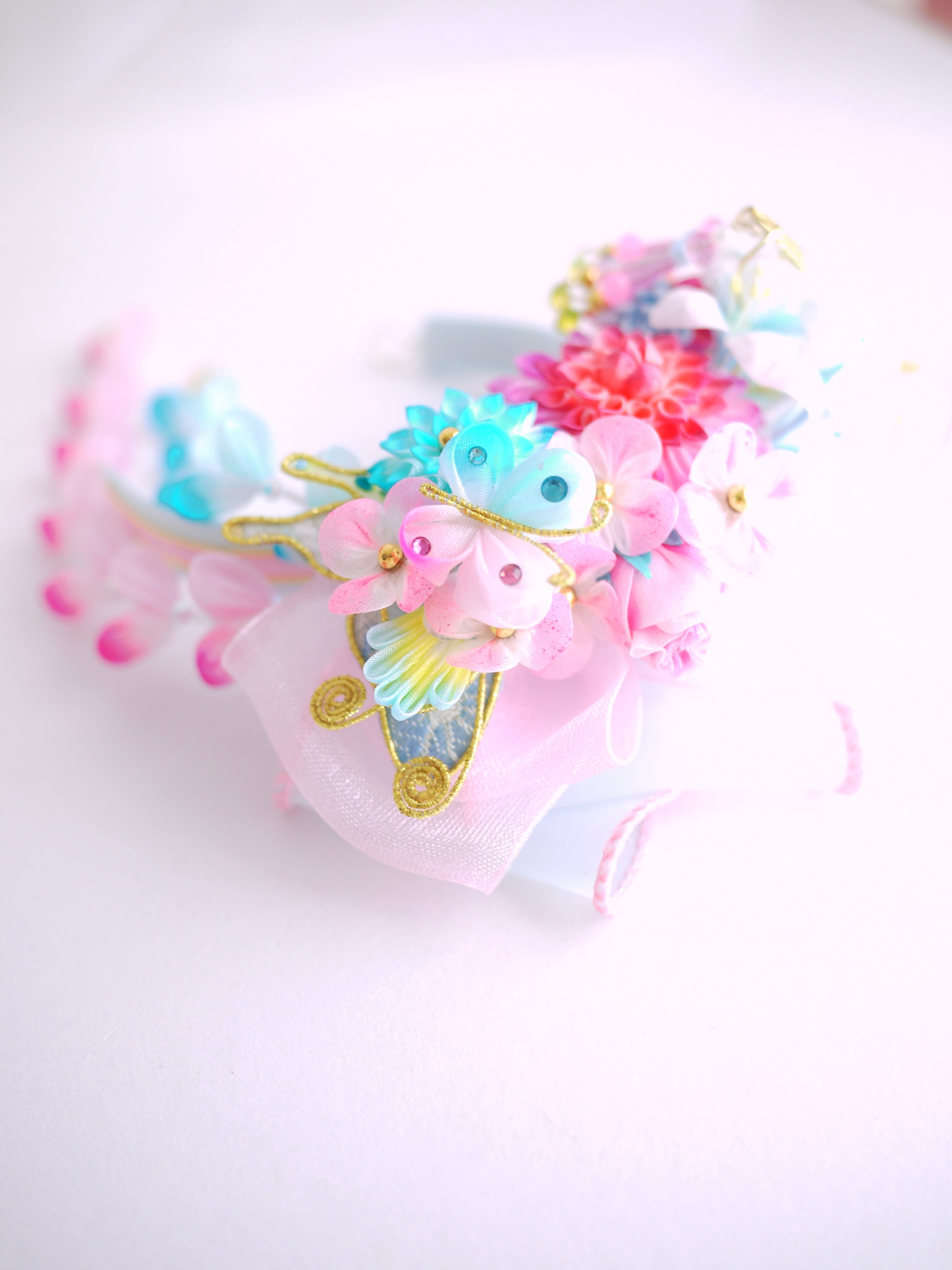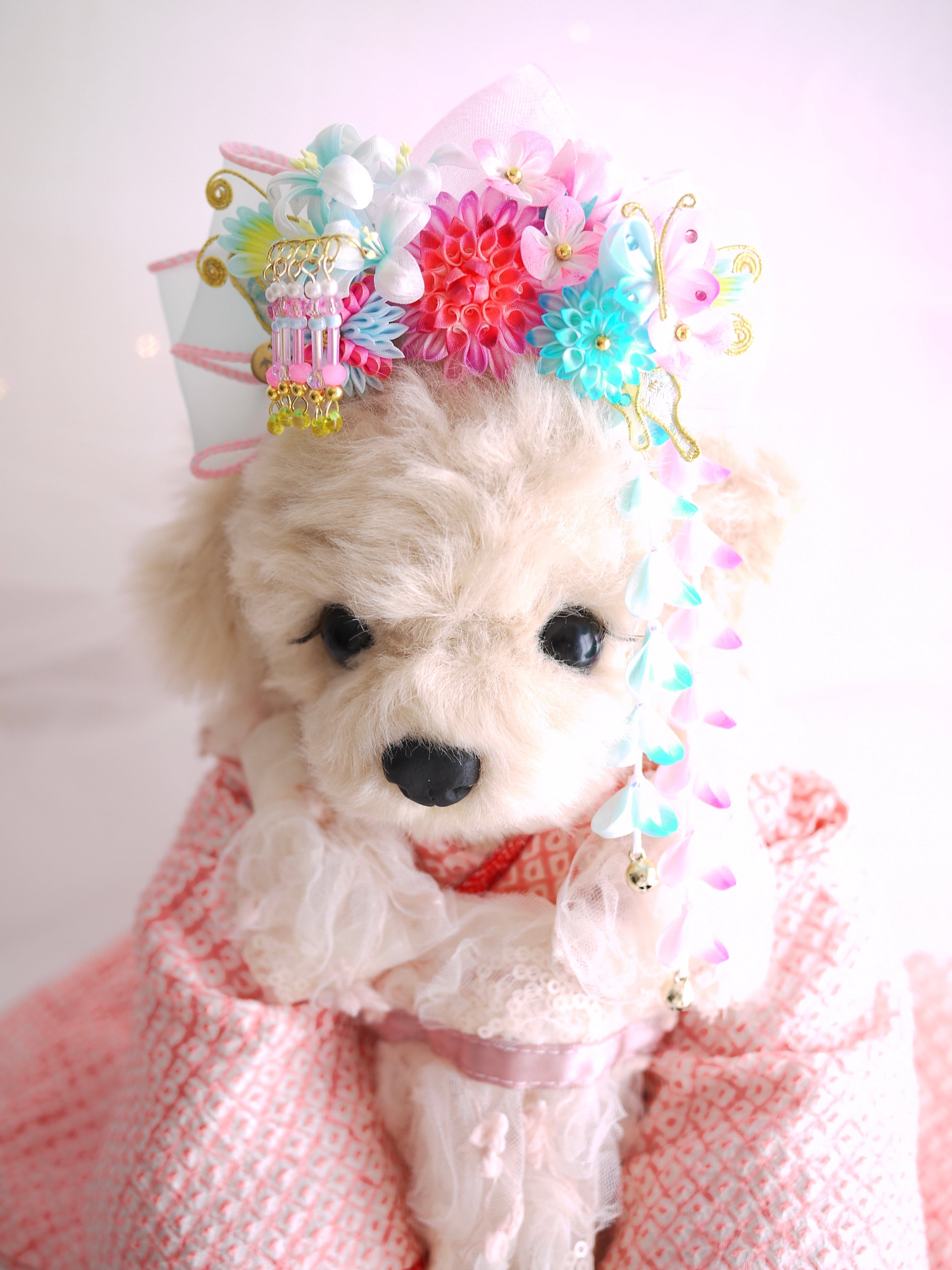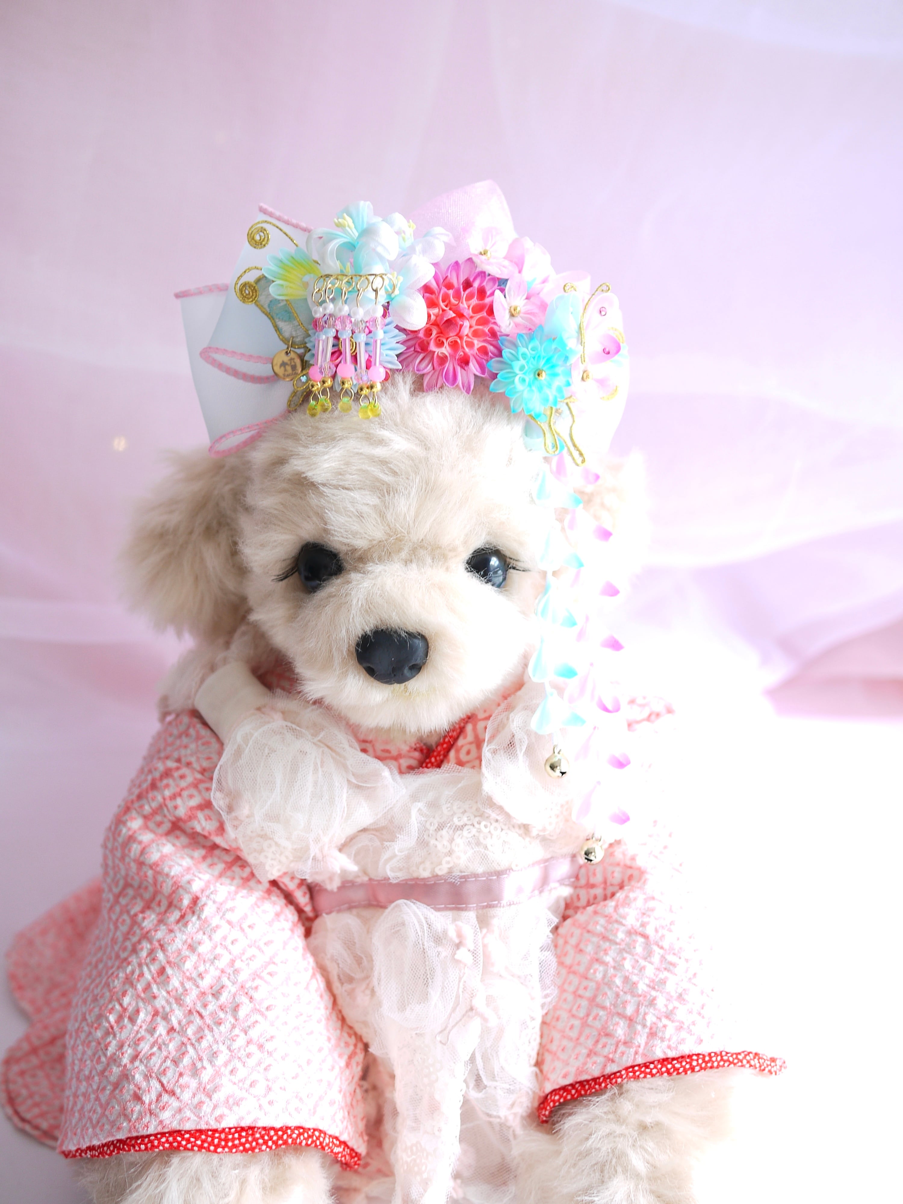 こちらの簪はよく可愛いらしい鮮やかな水色ベースのお着物を着ているワンちゃんをお見かけするけれど、水色は春夏物ではよく作るのですが、改まった祝い簪のような華やかタイプのお飾りはあまり無いかもと思い立ち制作したもの