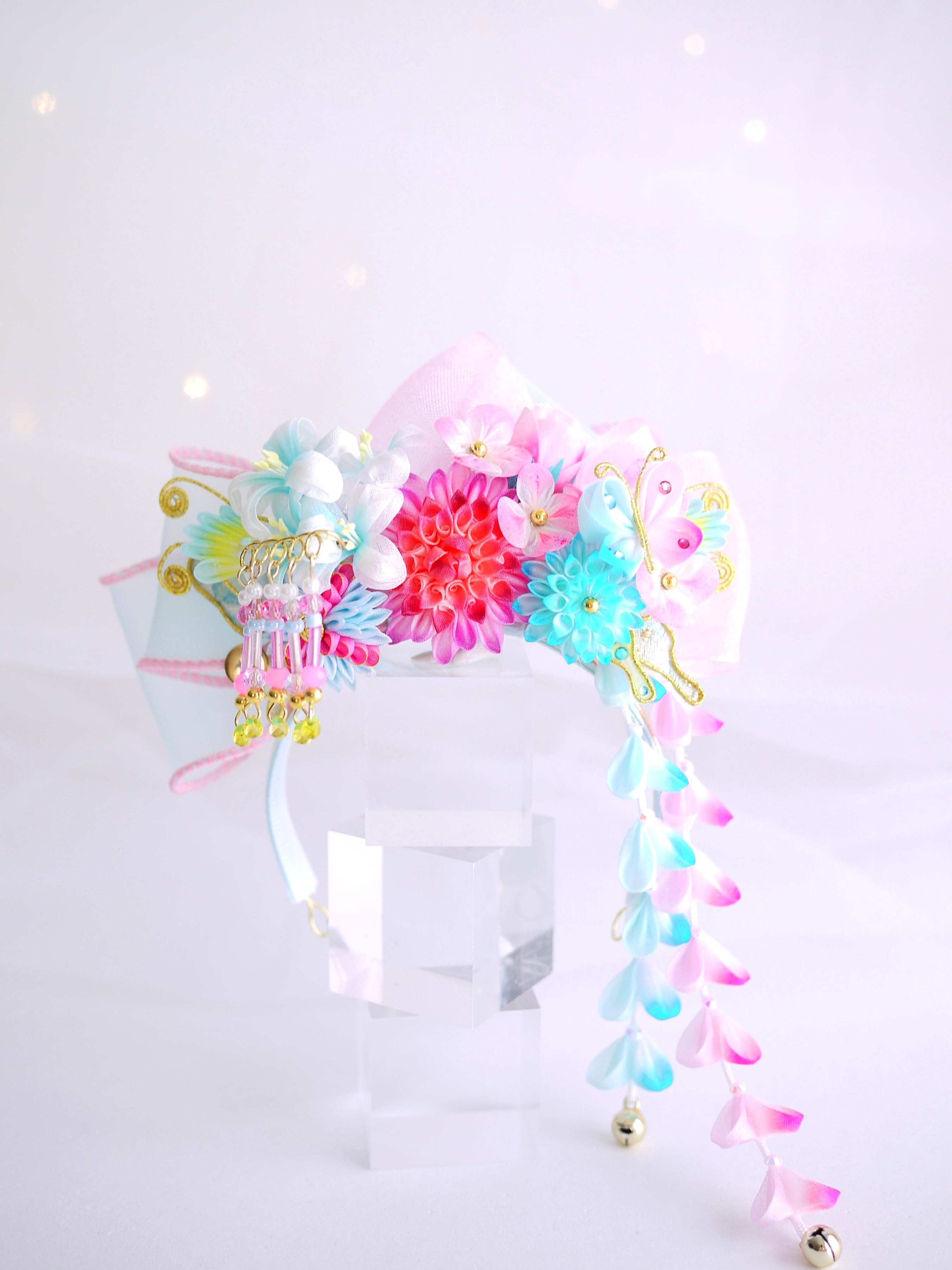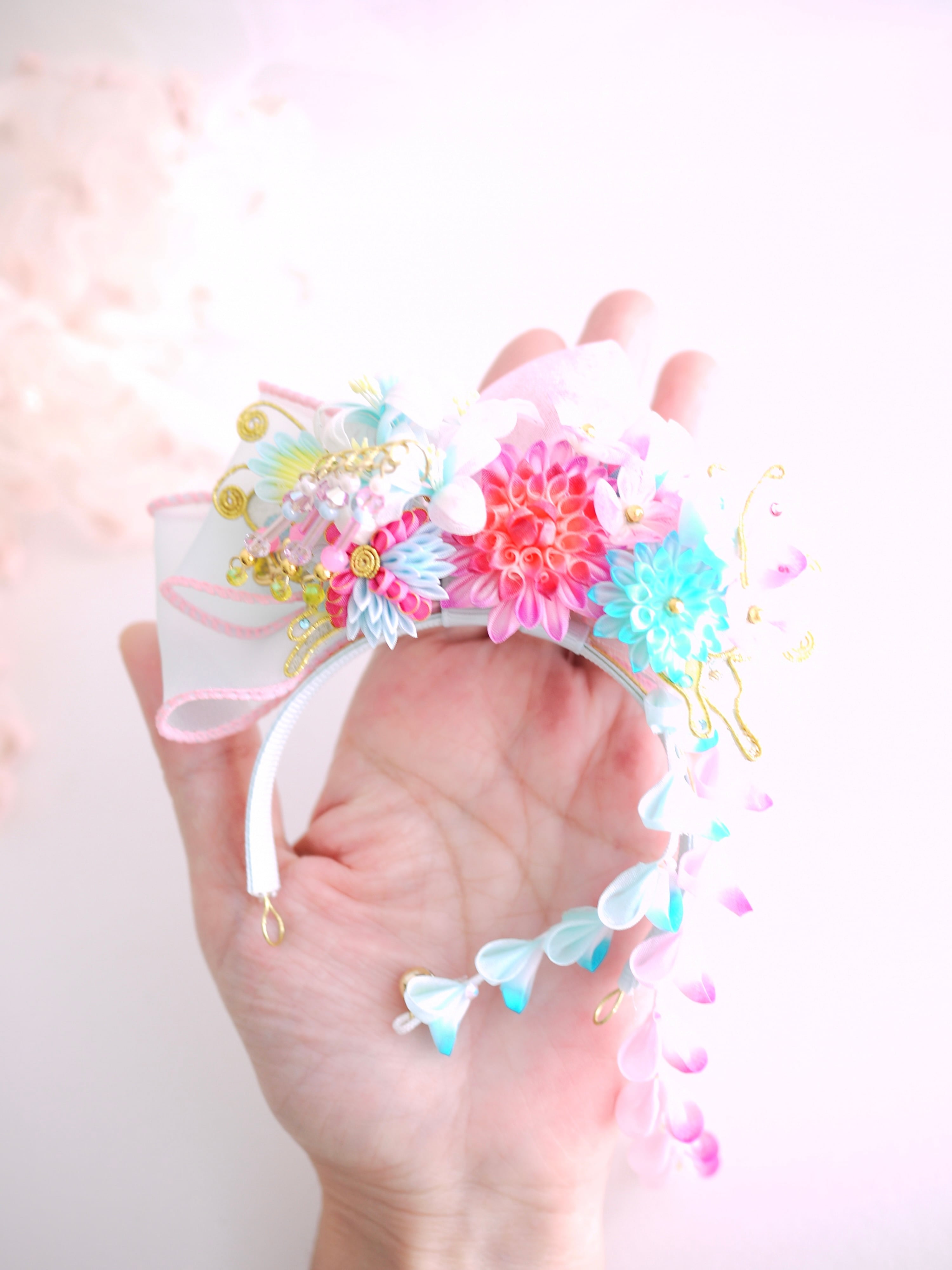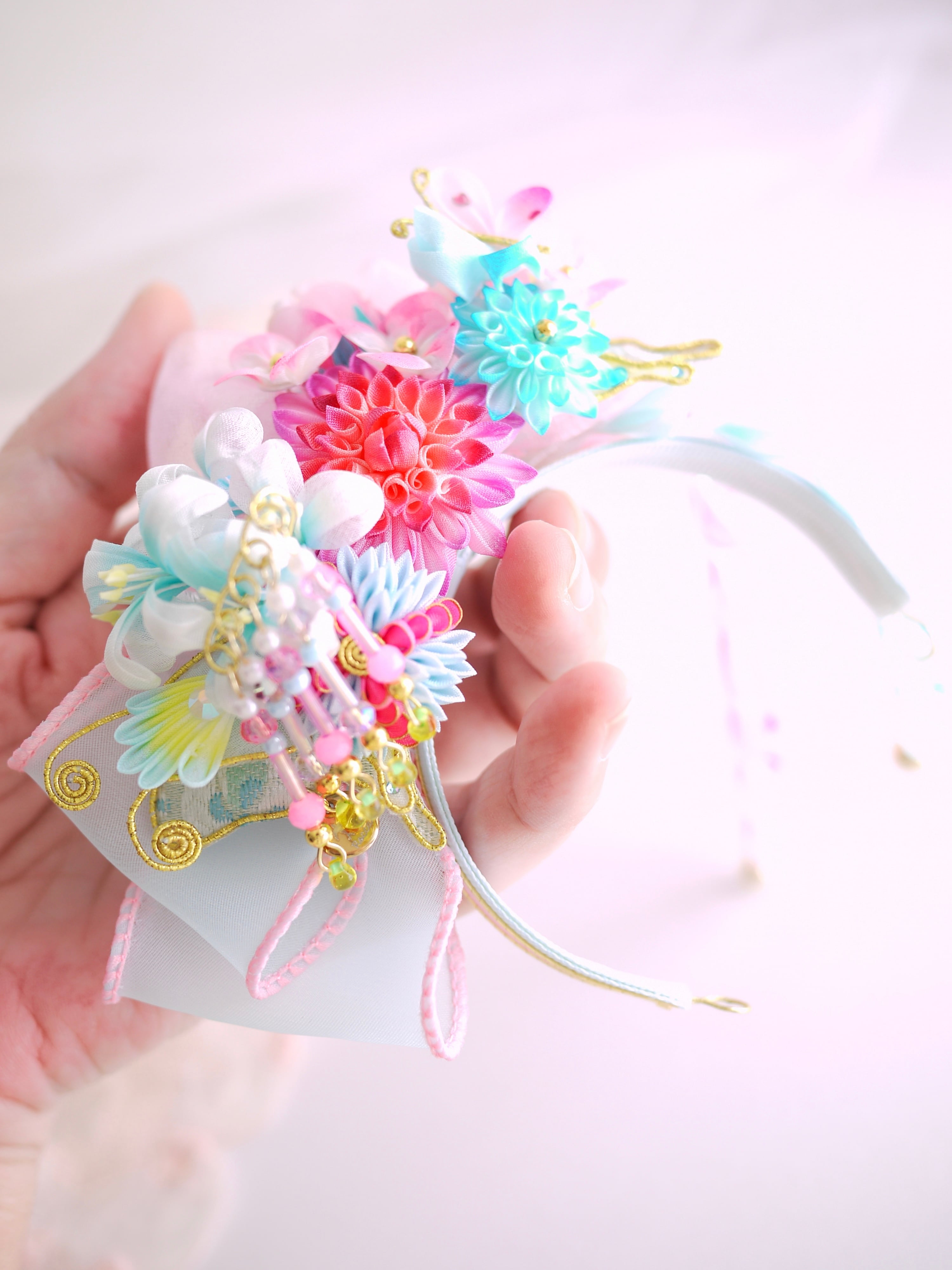 こちらの簪はよく可愛いらしい鮮やかな水色ベースのお着物を着ているワンちゃんをお見かけするけれど、水色は春夏物ではよく作るのですが、改まった祝い簪のような華やかタイプのお飾りはあまり無いかもと思い立ち制作したもの