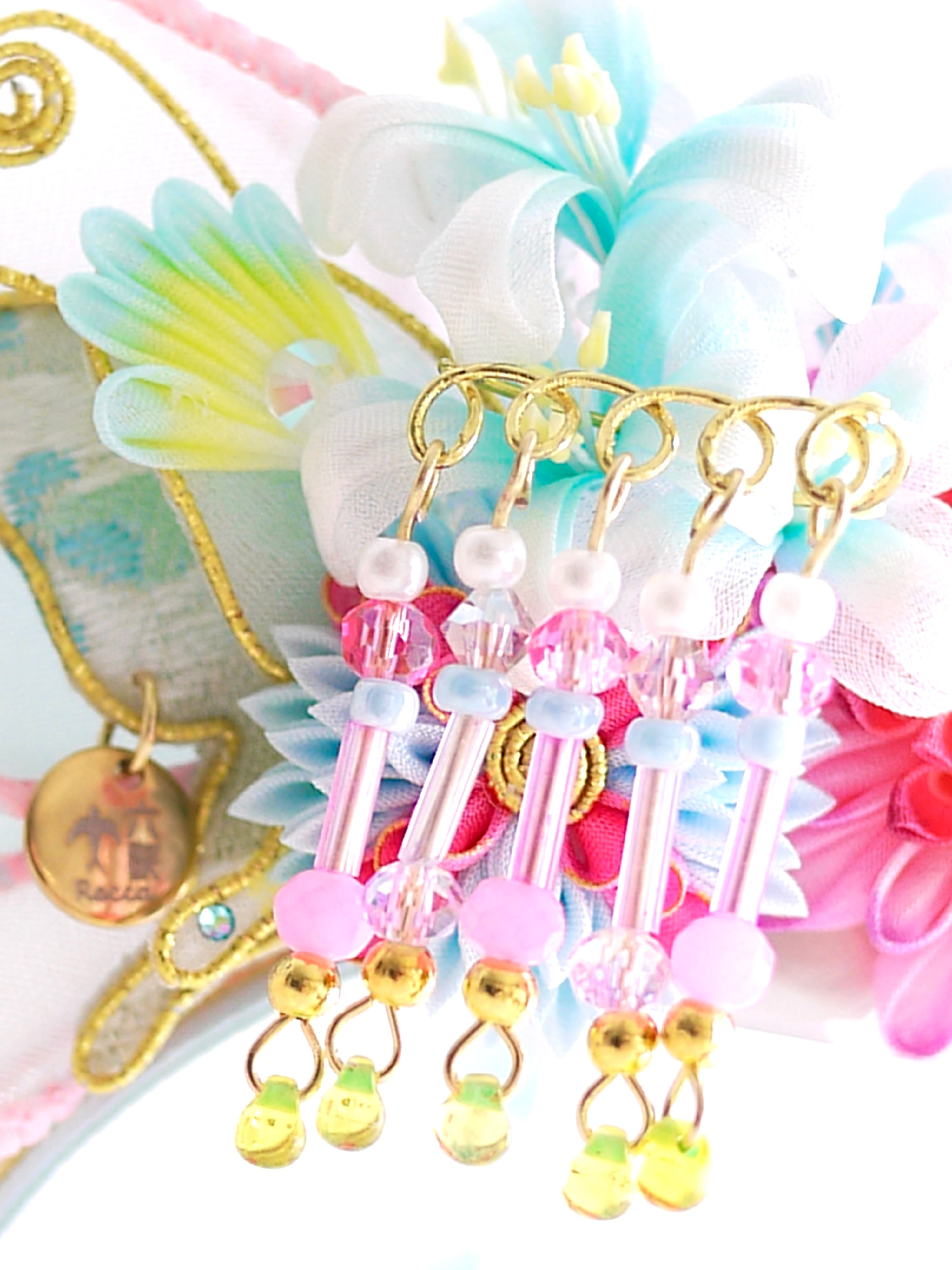 キラキラビーズの下がりはつまみ花の配色に合わせて主張し過ぎず優しい印象になるよう同系色でまとめました