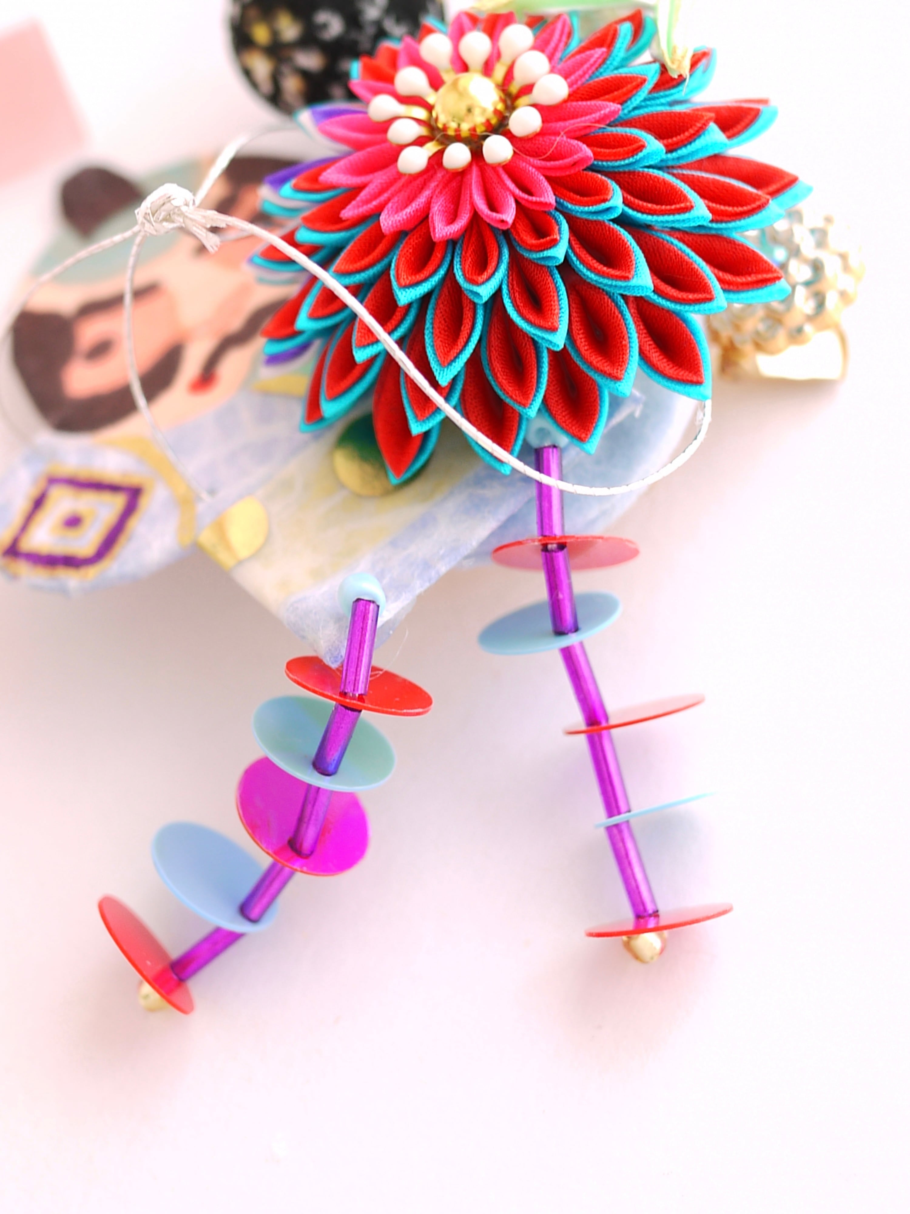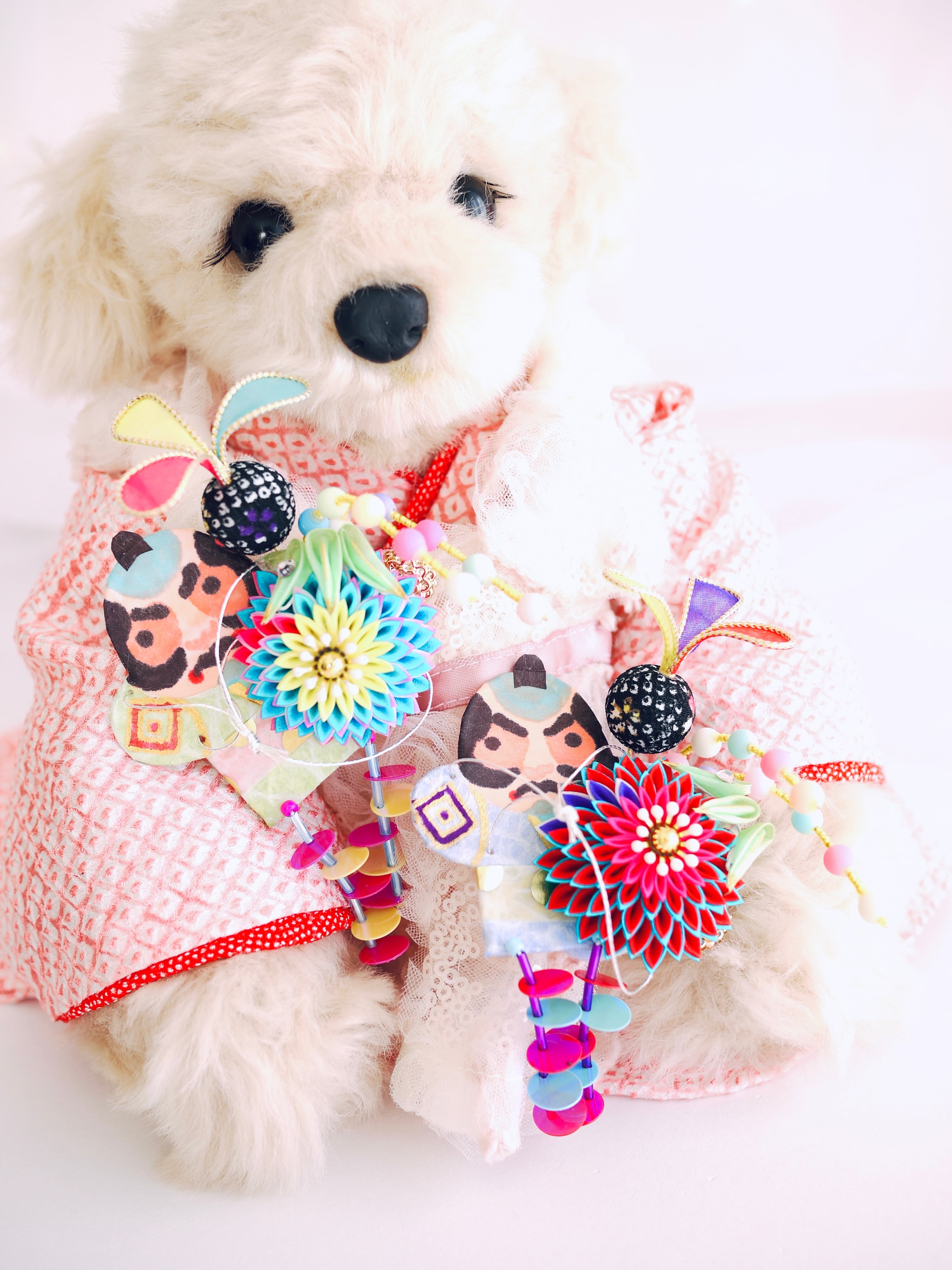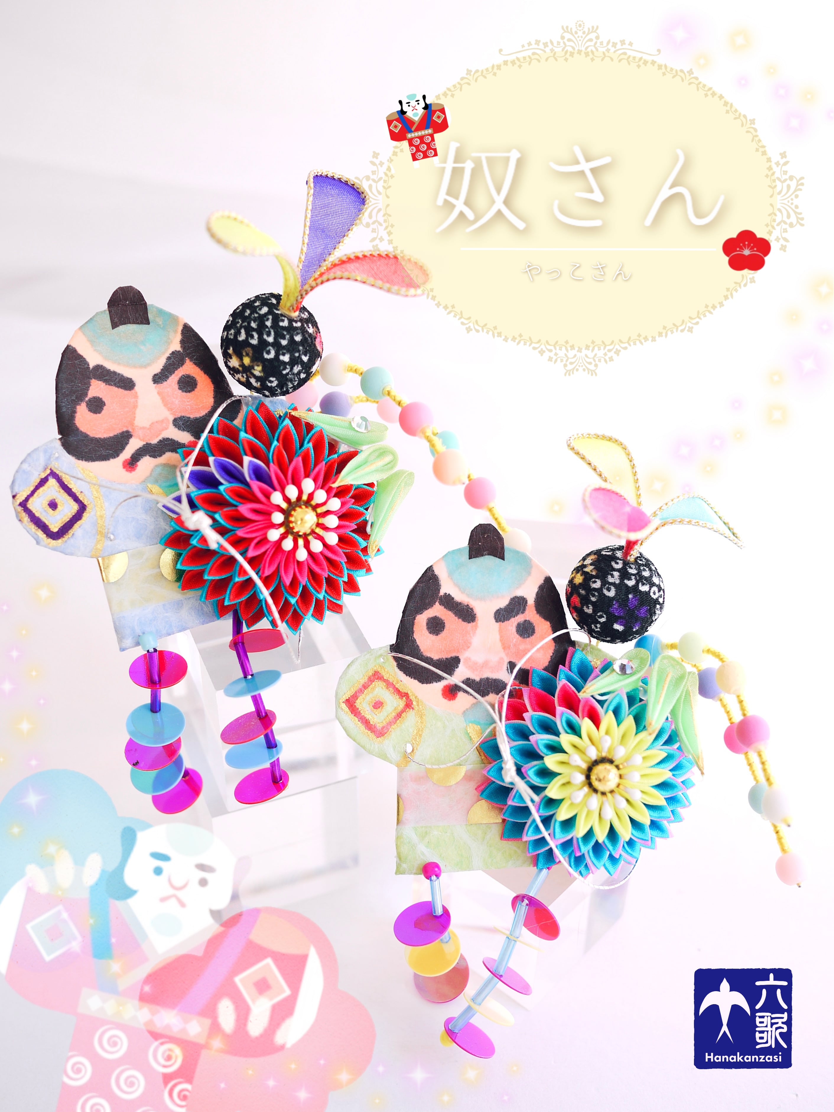 ちんまりサイズだから振り向き苦手ちゃんは胸元に付けたりもできるし、お嬢さん達は帯飾りメガ盛りだとオカワだからふわふわのお花と一緒に奴さんつけても良い感じ