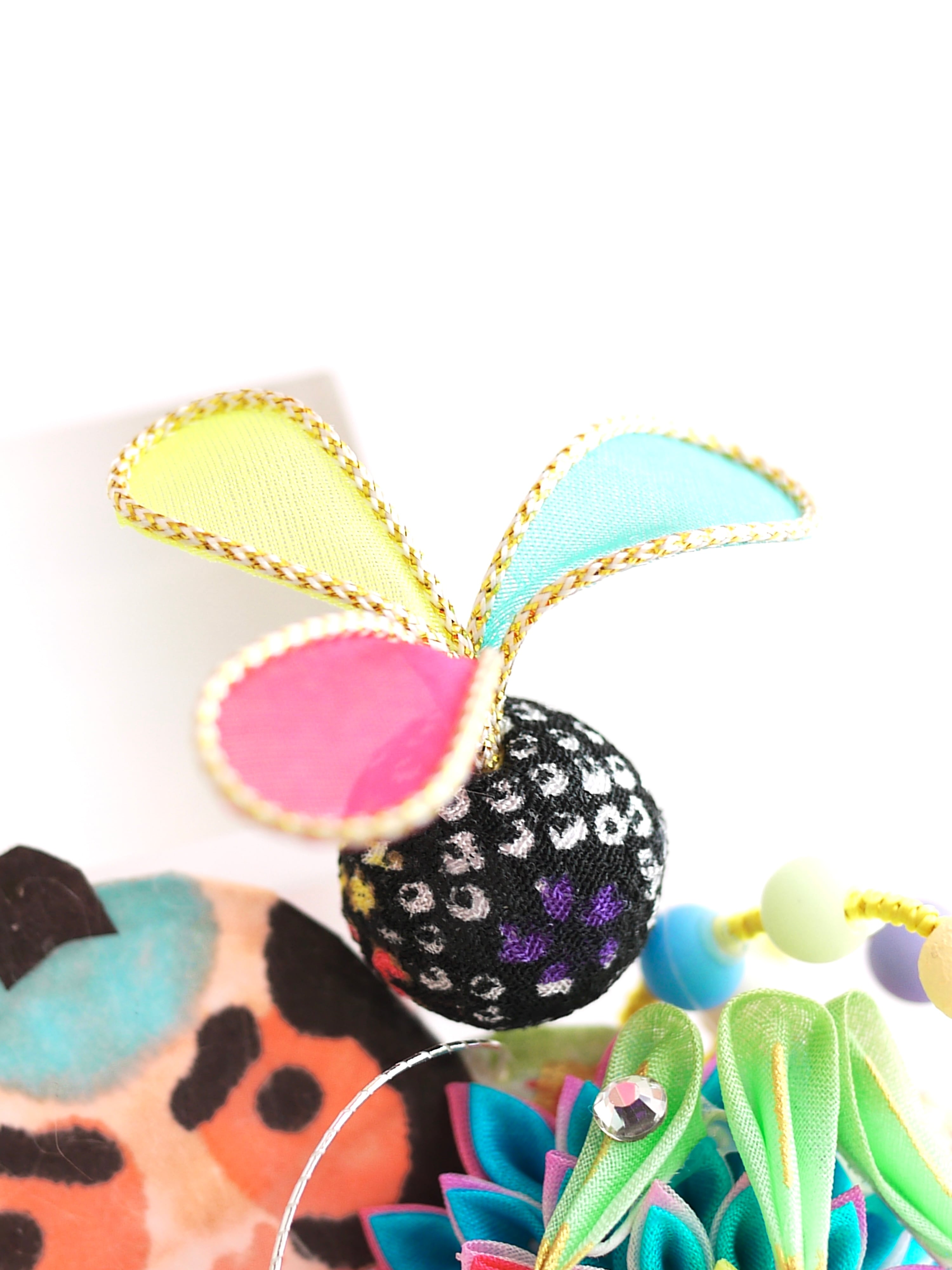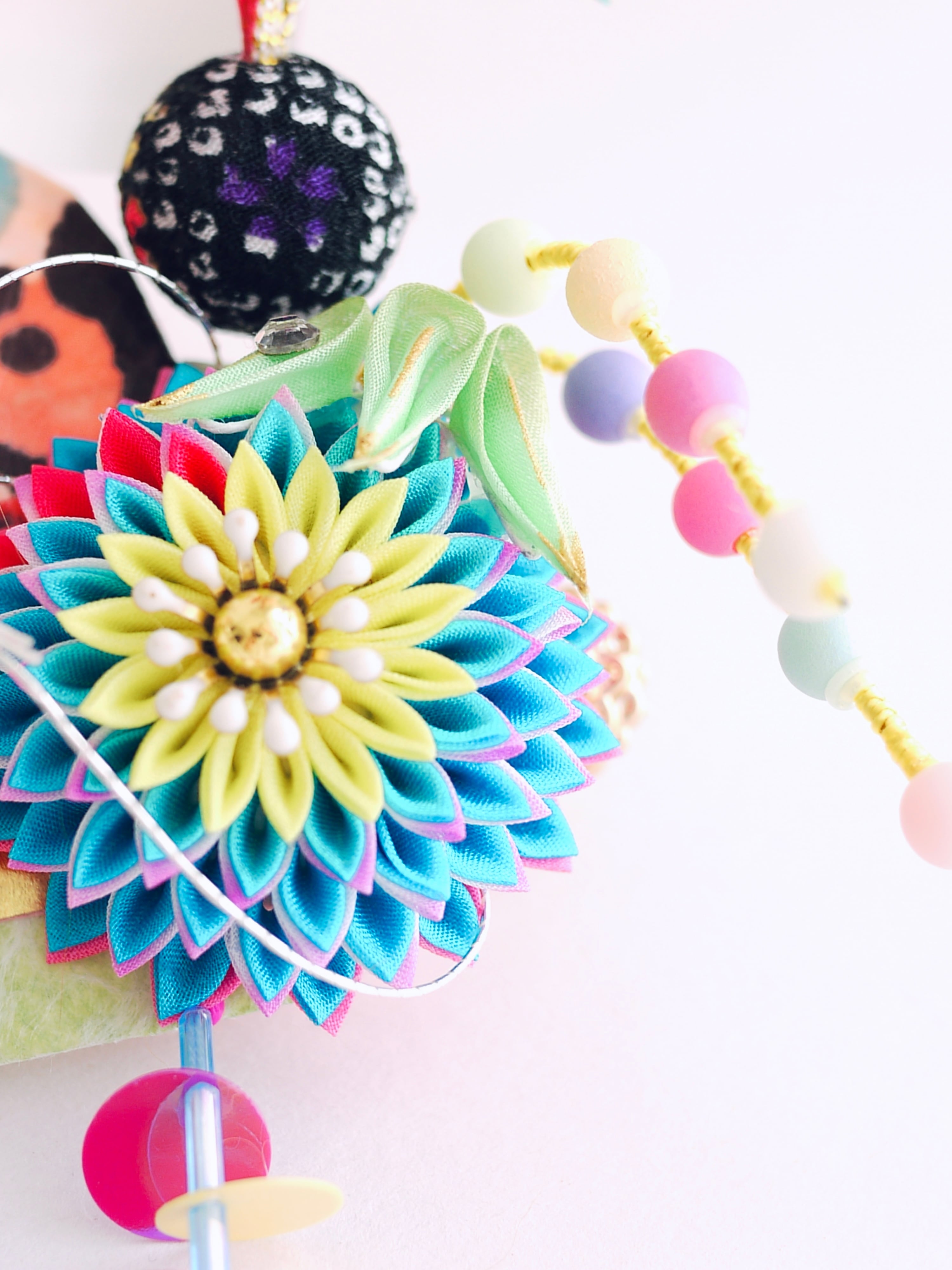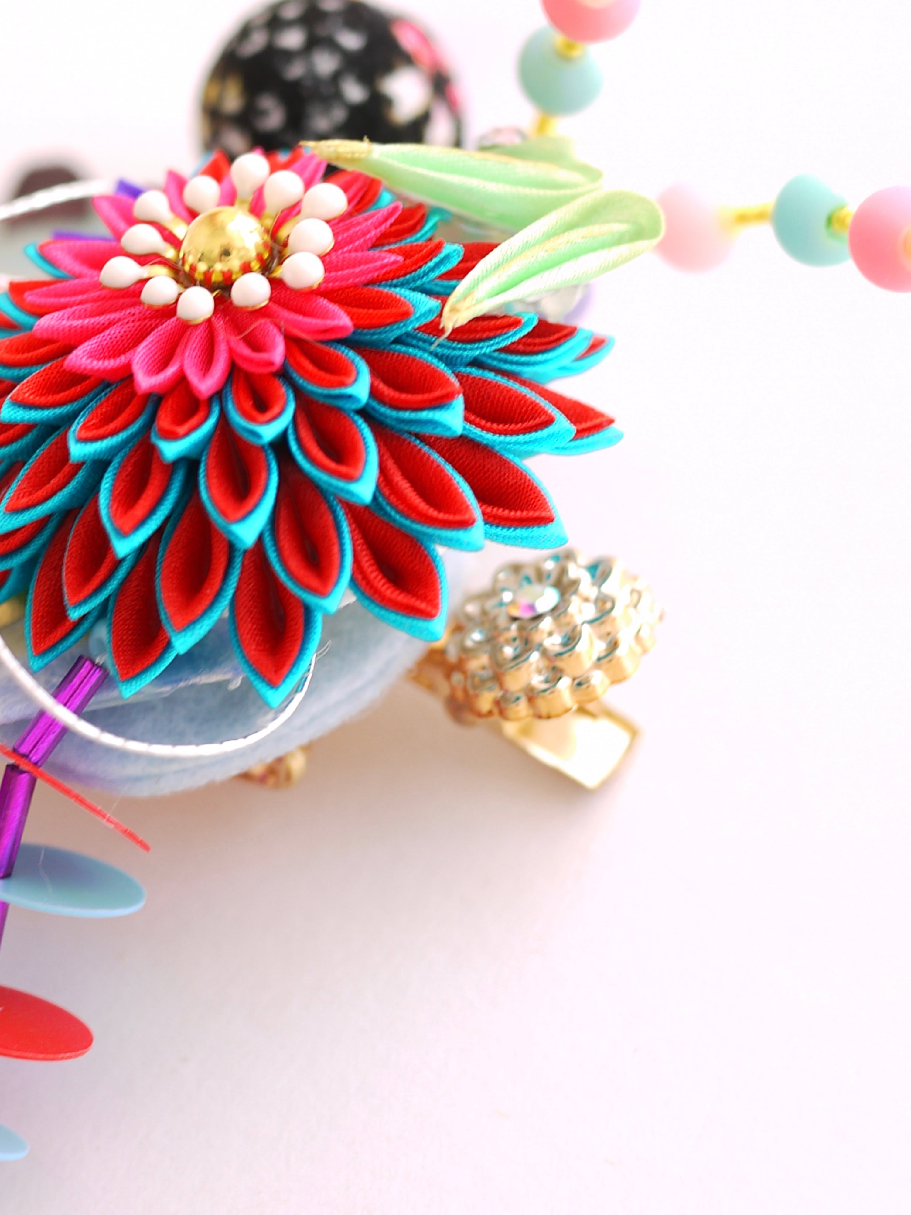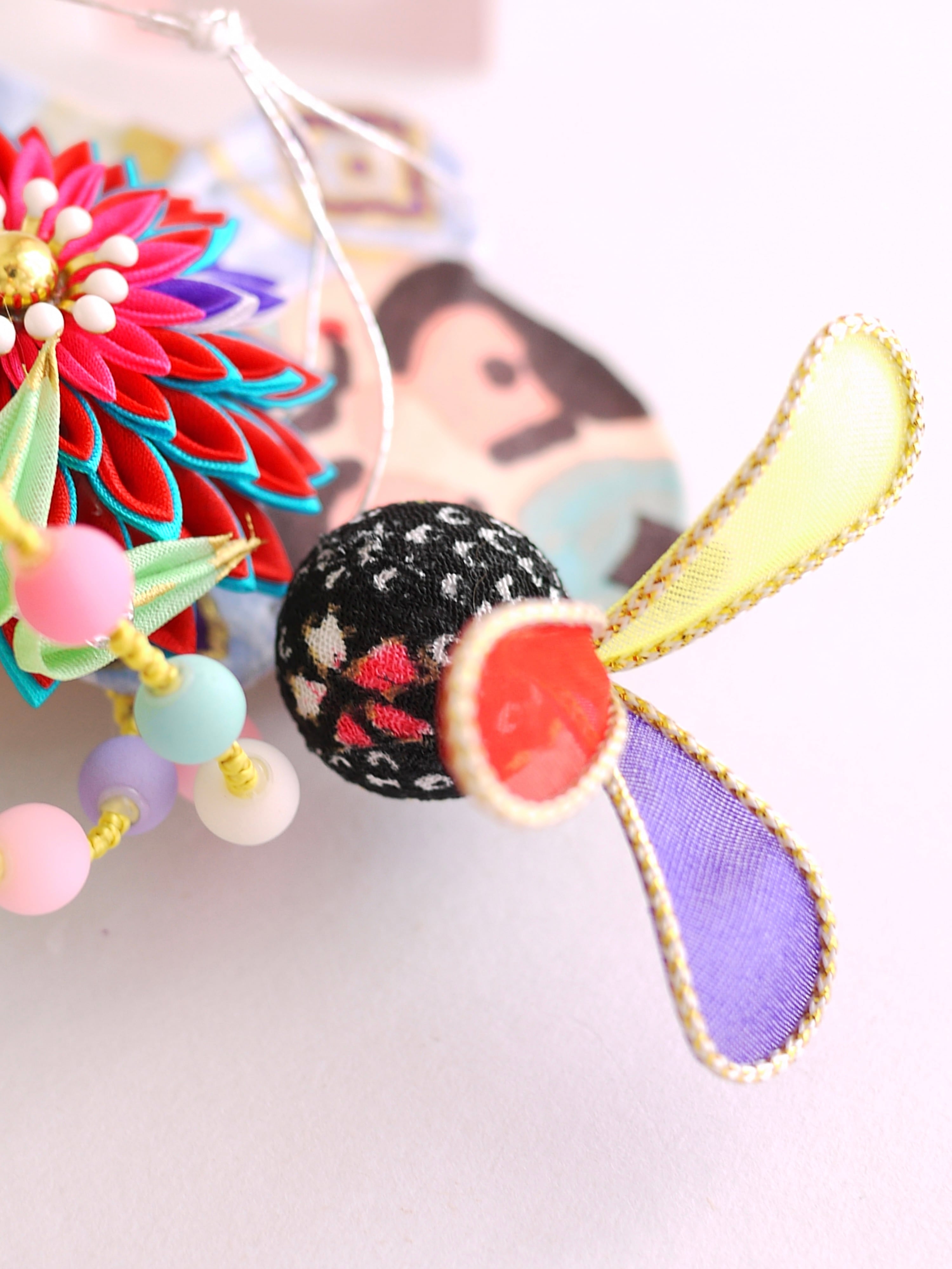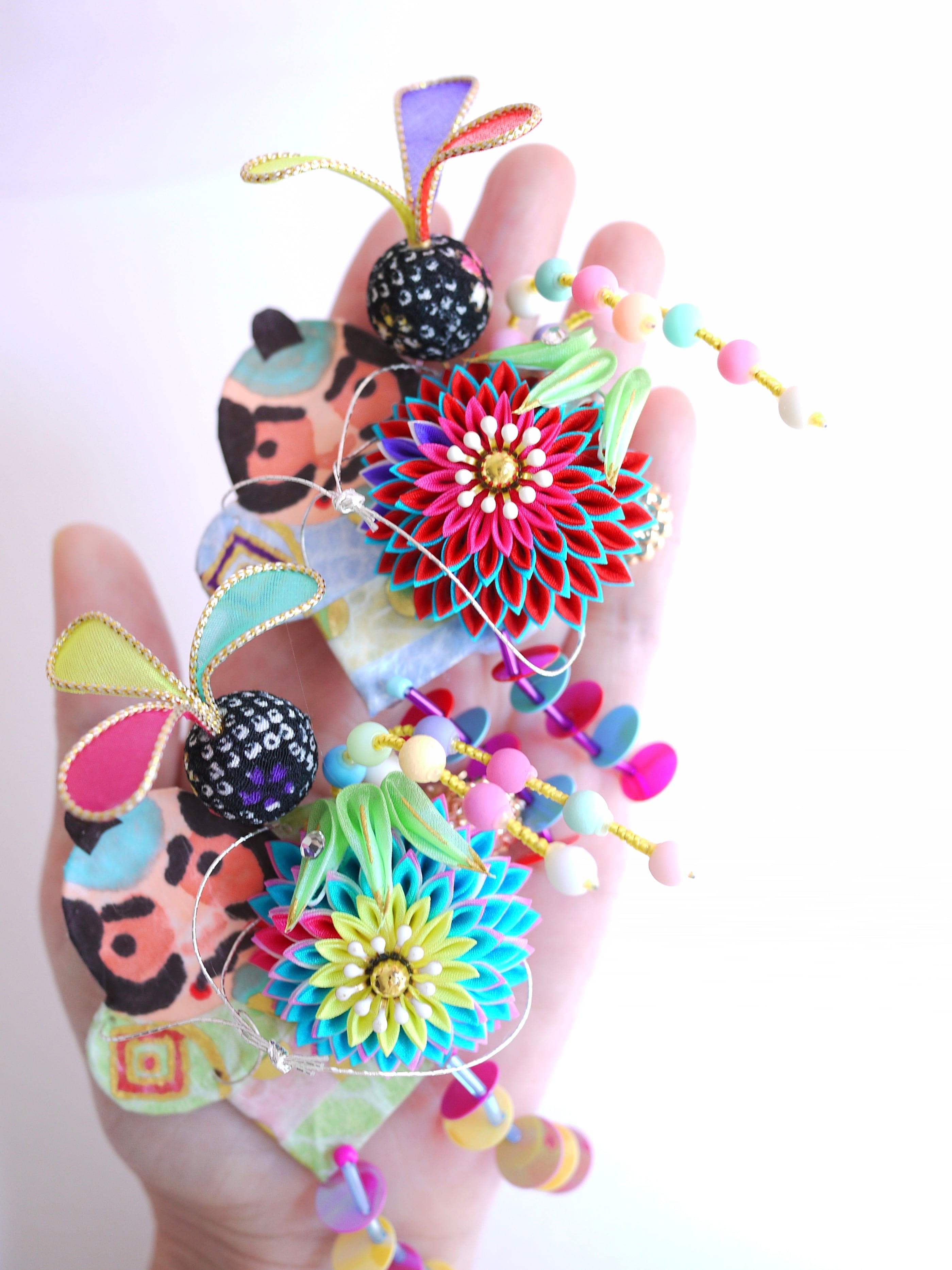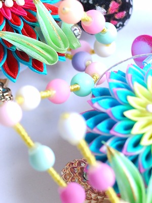 つまみ細工は専用の糊のみで制作しております、水に濡れると糊が溶けて型崩れしたり、正絹地が変形・変色する原因になることがございます。 雨や水濡れ・湿気には十分お気をつけください。 濃色のものは特に色移りする場合がございます