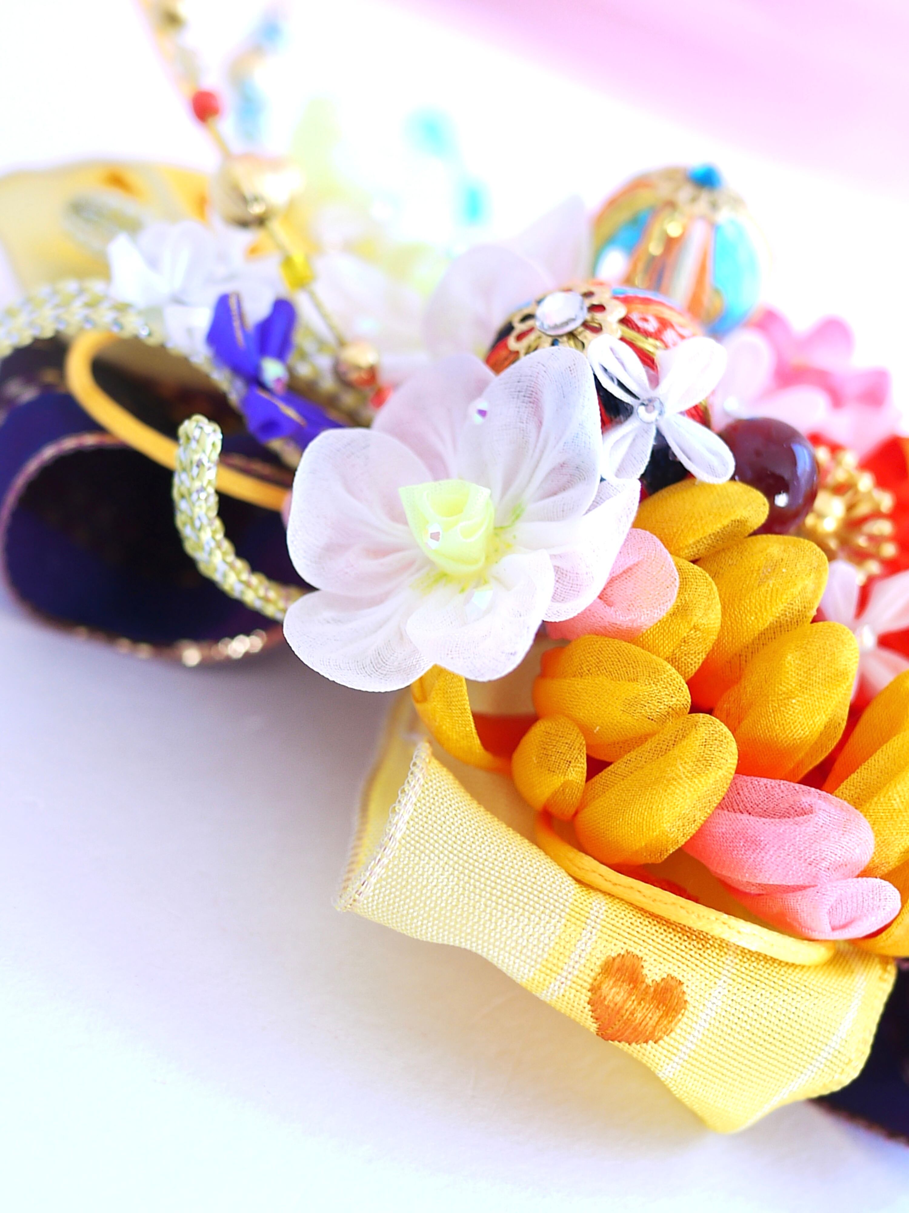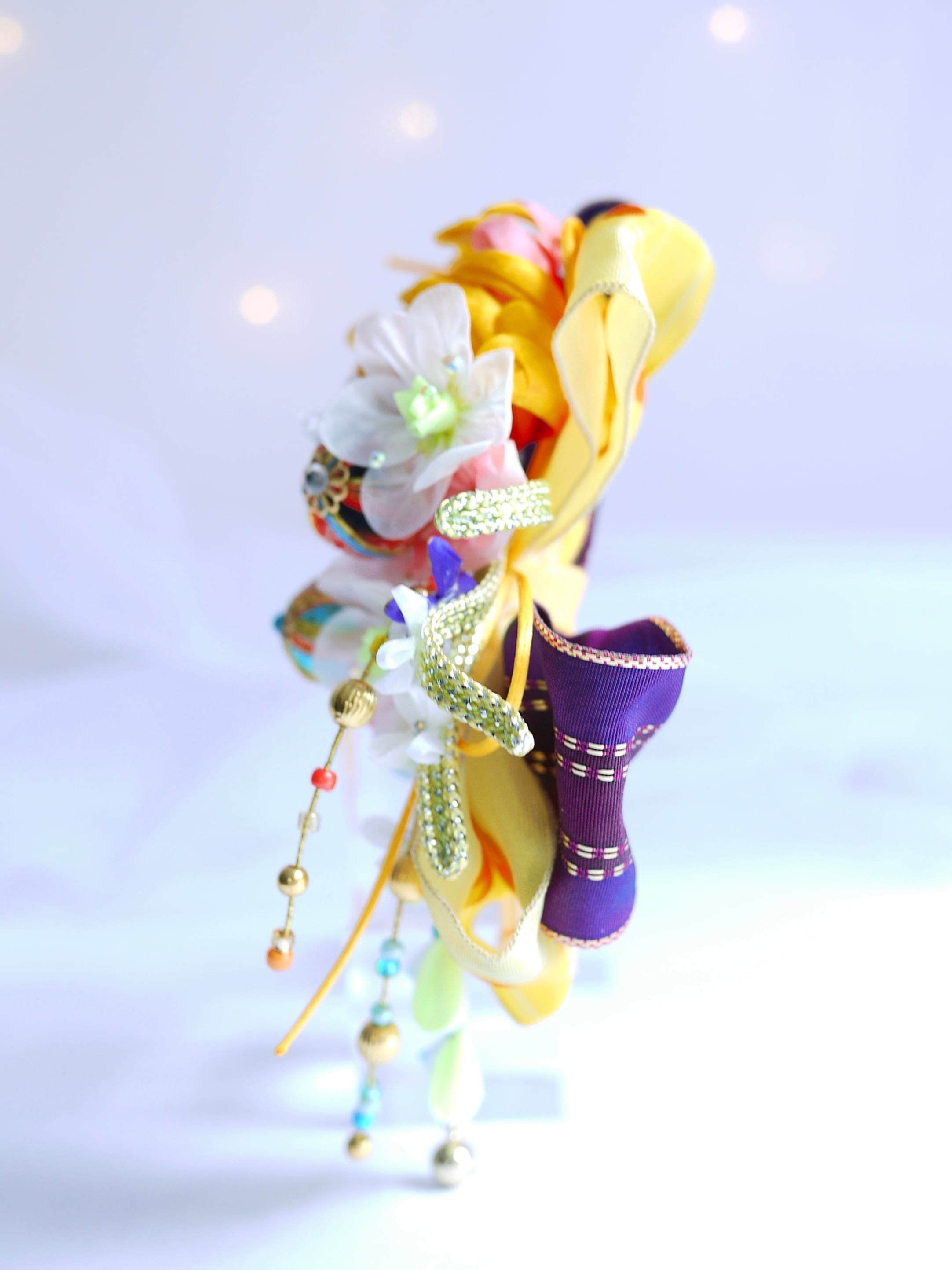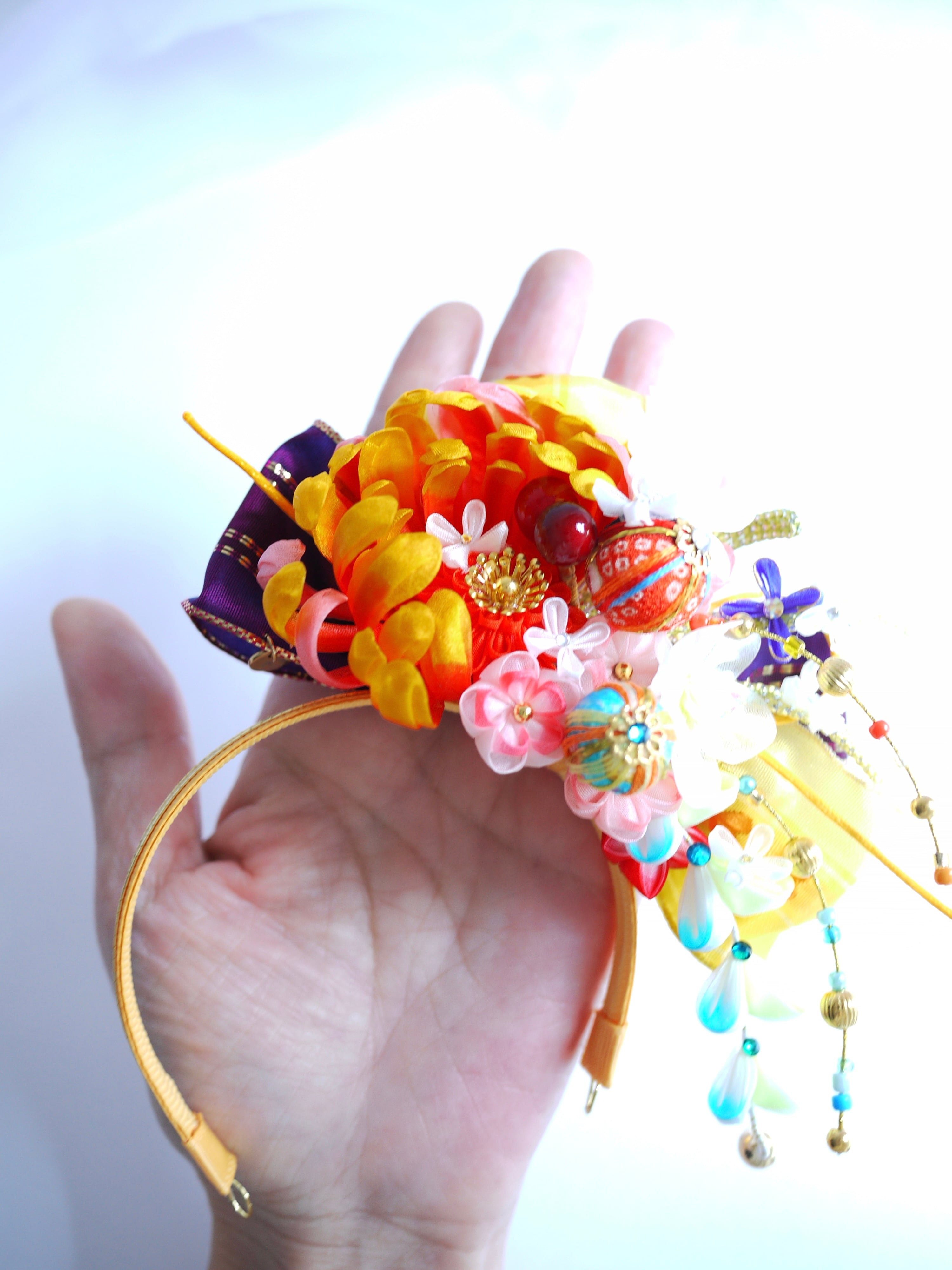元々は芥子色や蜜柑色・萌黄色のお着物に合わせて配色したのですがリボンのカラーを合わせて紫色にも合いそう!ワイヤー入りリボンはボリューム感も調整できてお気に入り
