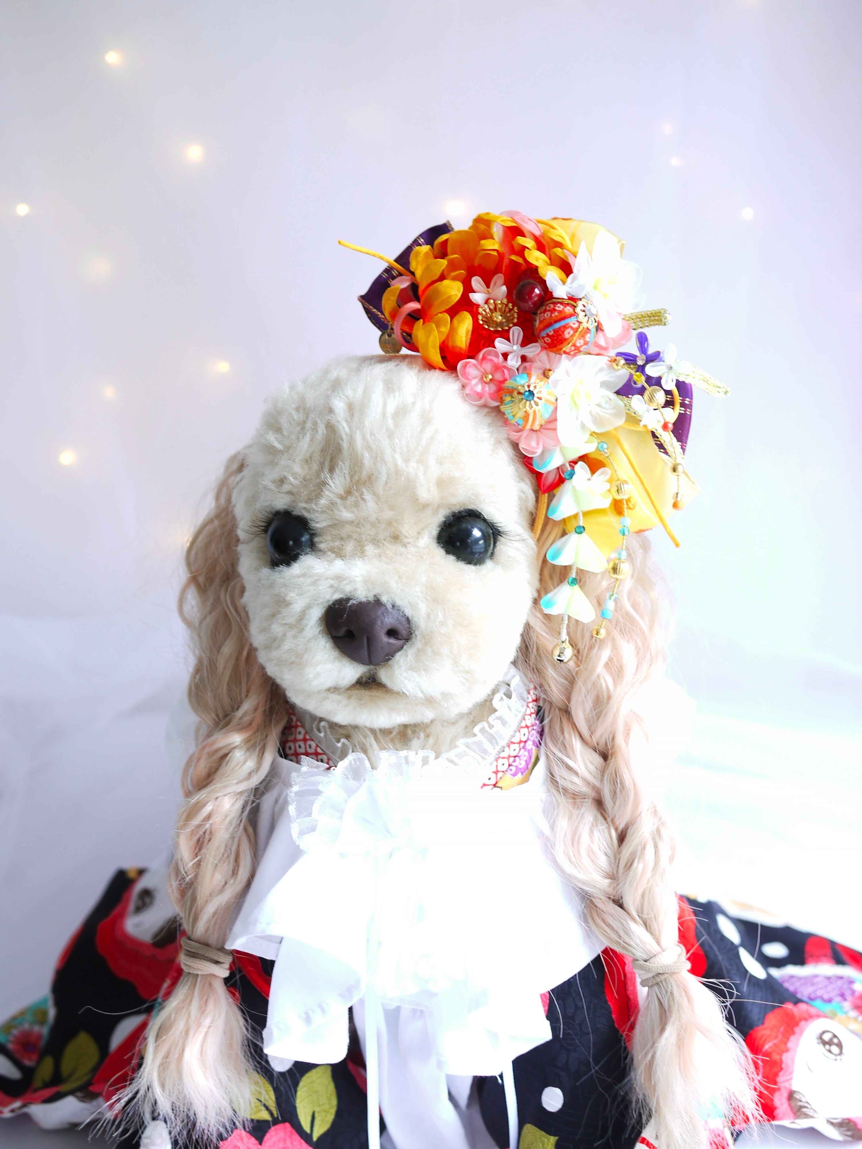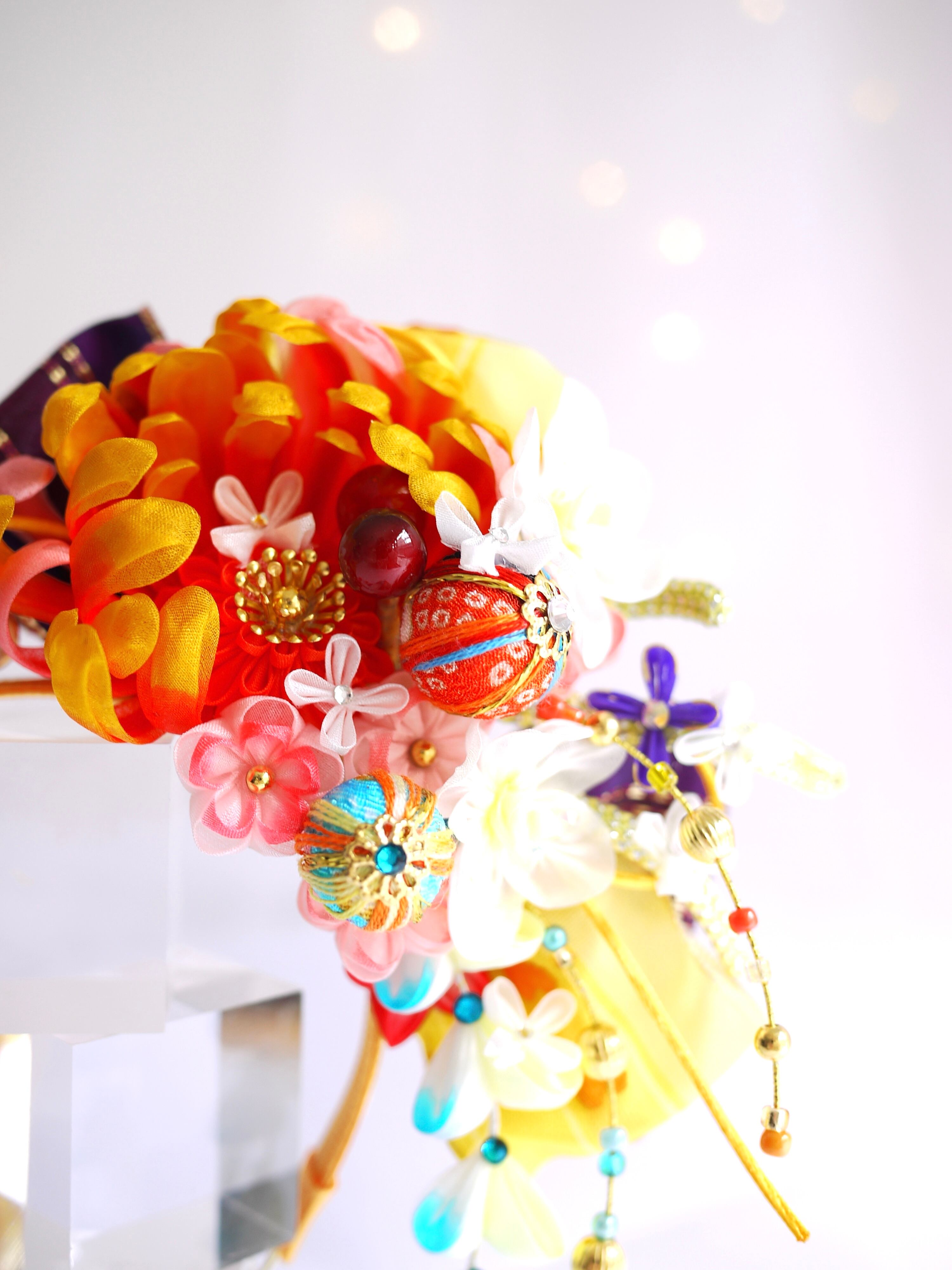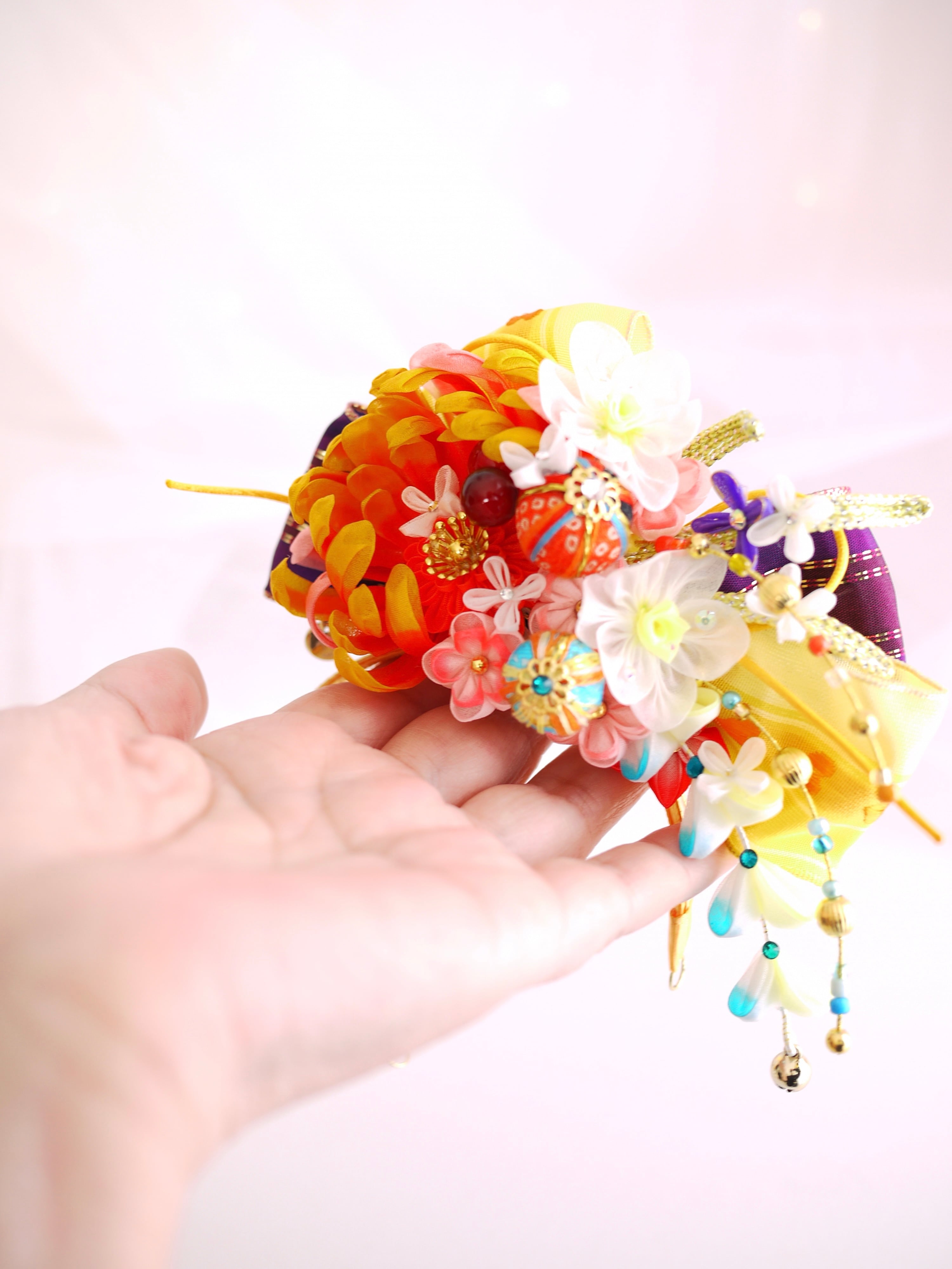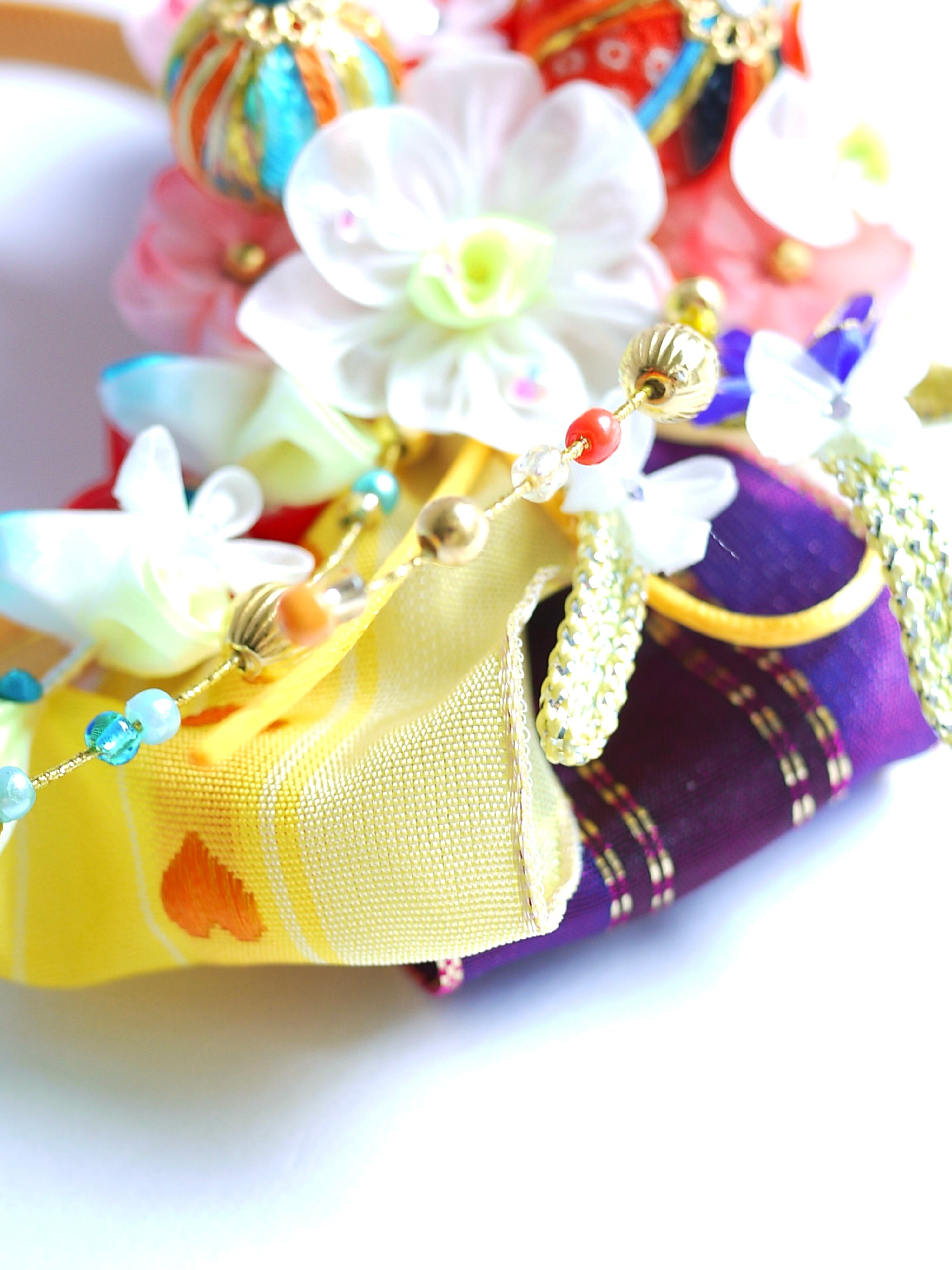 元々は芥子色や蜜柑色・萌黄色のお着物に合わせて配色したのですがリボンのカラーを合わせて紫色にも合いそう!ワイヤー入りリボンはボリューム感も調整できてお気に入り