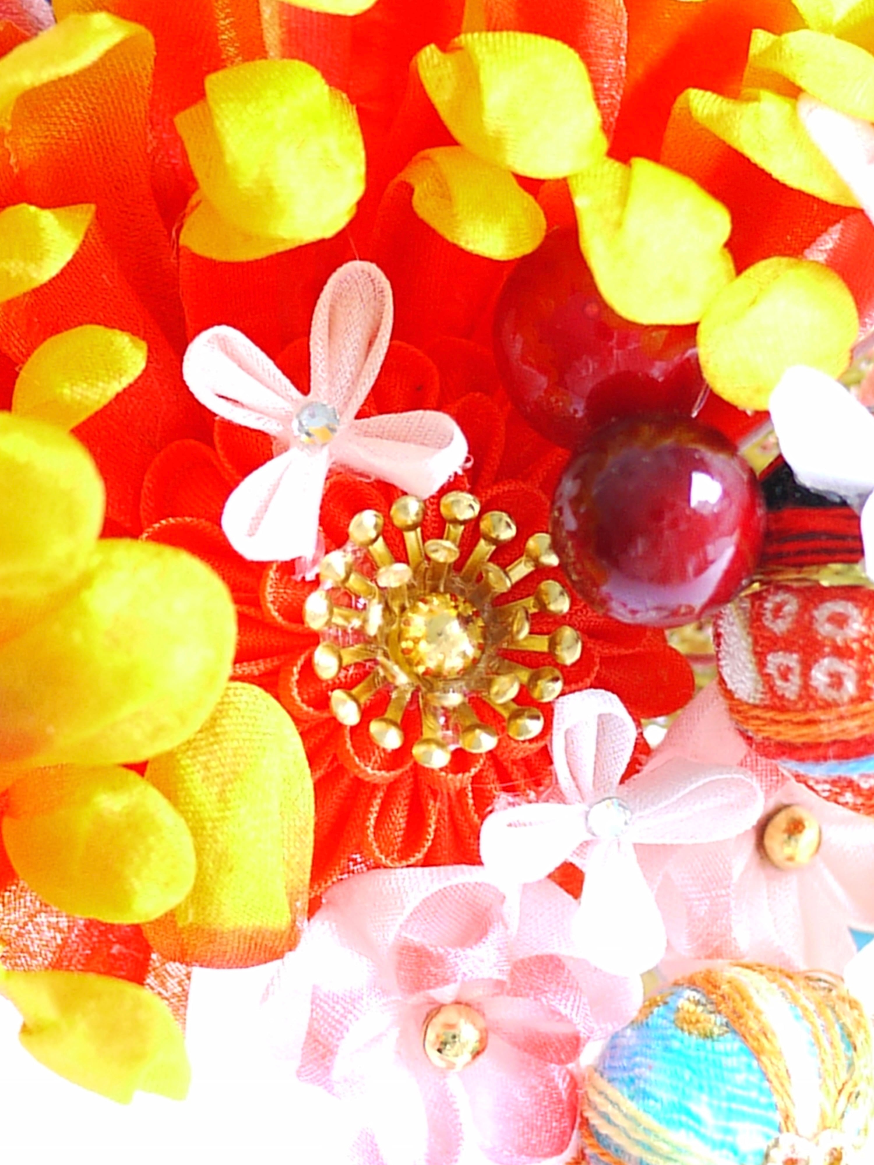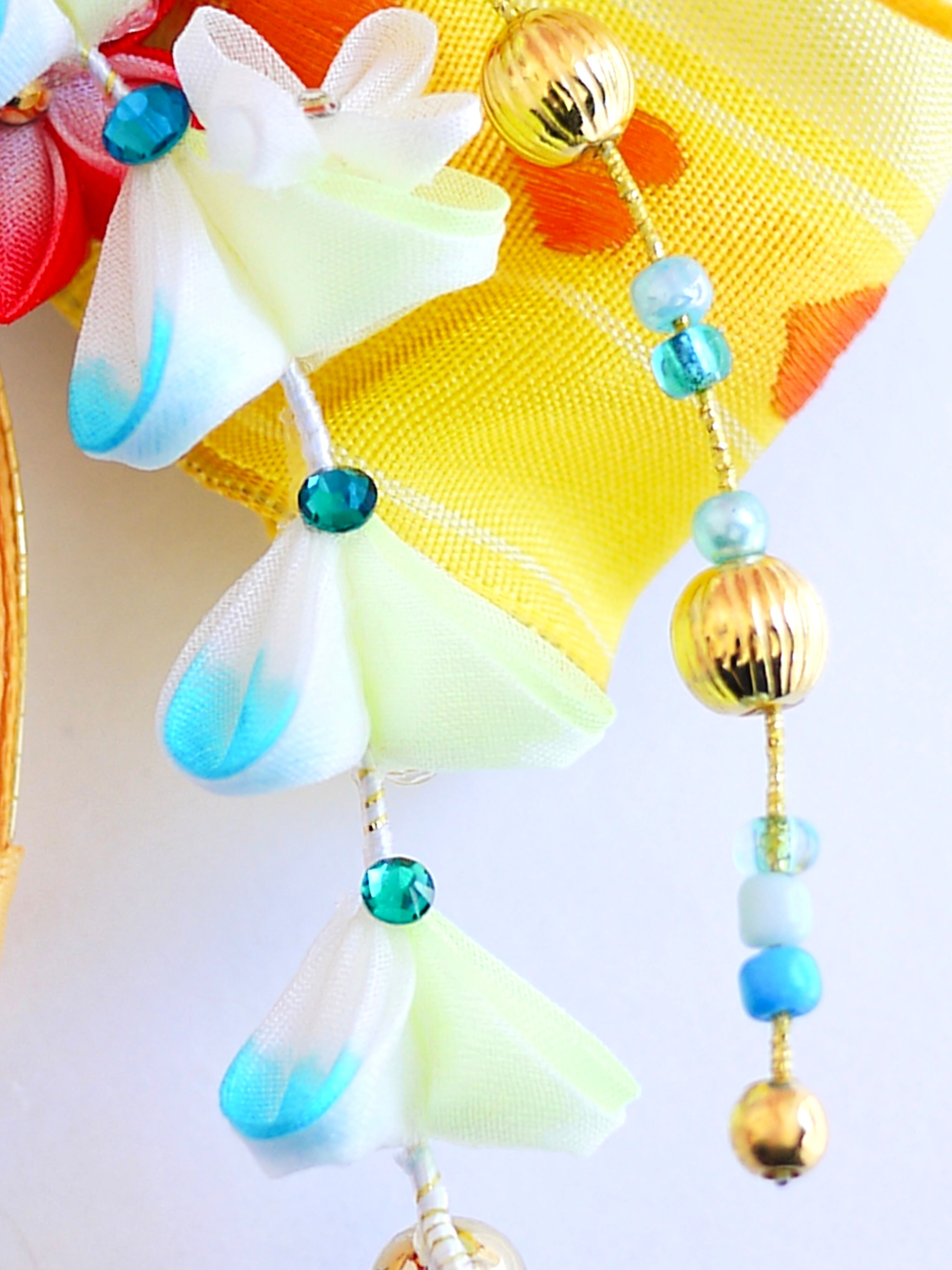 つまみ細工は専用の糊のみで制作しております、水に濡れると糊が溶けて型崩れしたり、正絹地が変形・変色する原因になることがございます。 雨や水濡れ・湿気には十分お気をつけください。 濃色のものは特に色移りする場合がございます