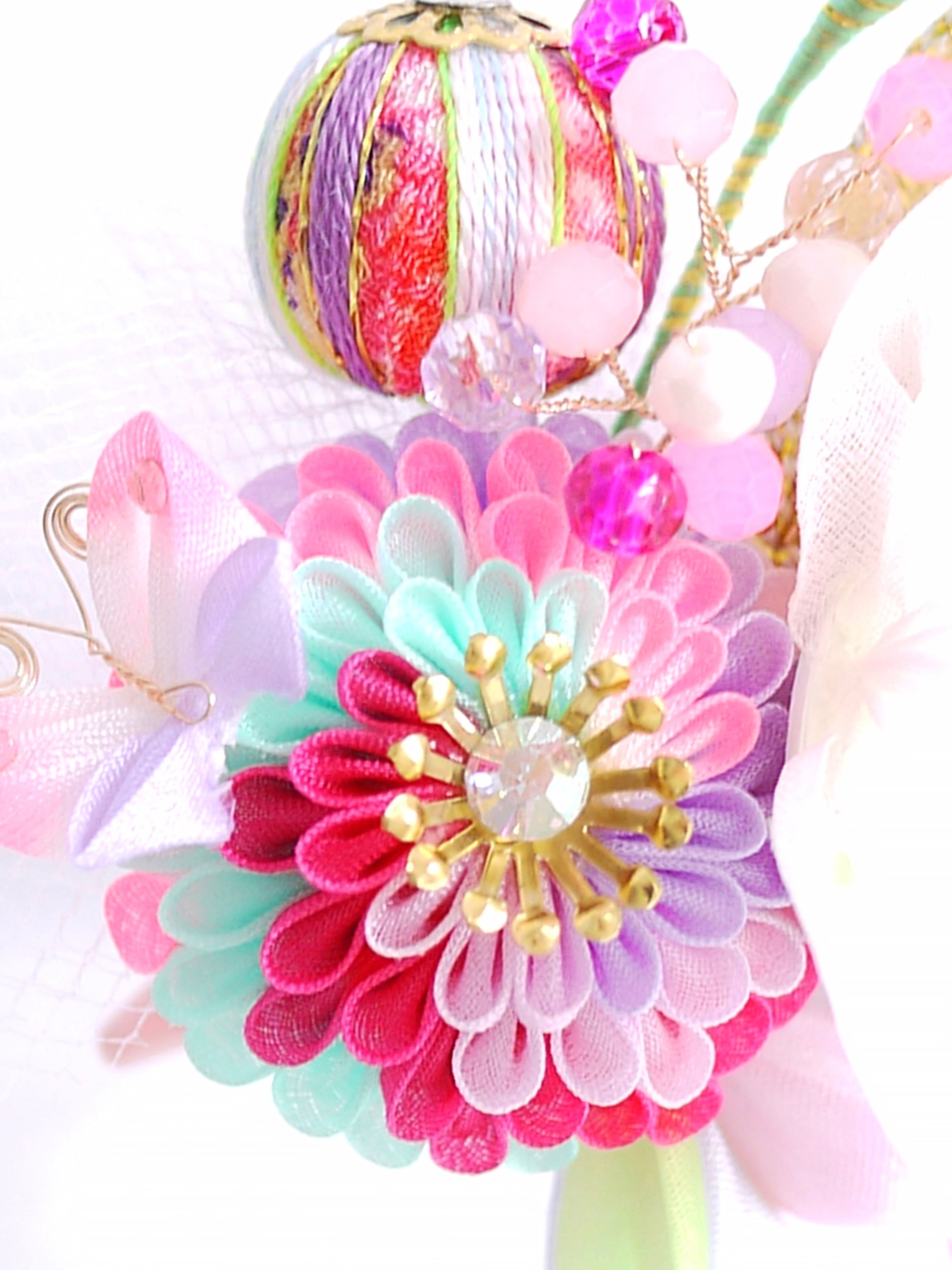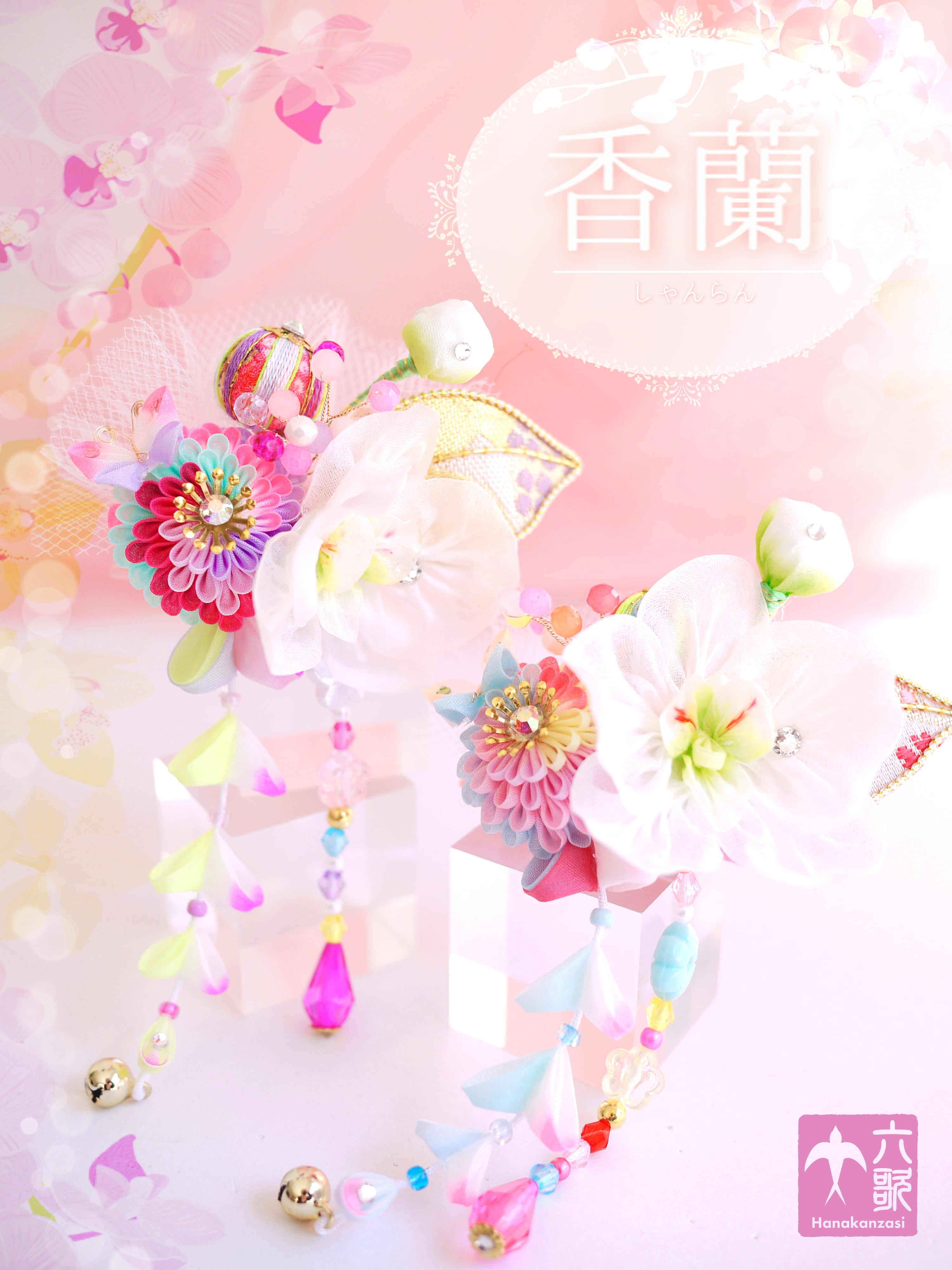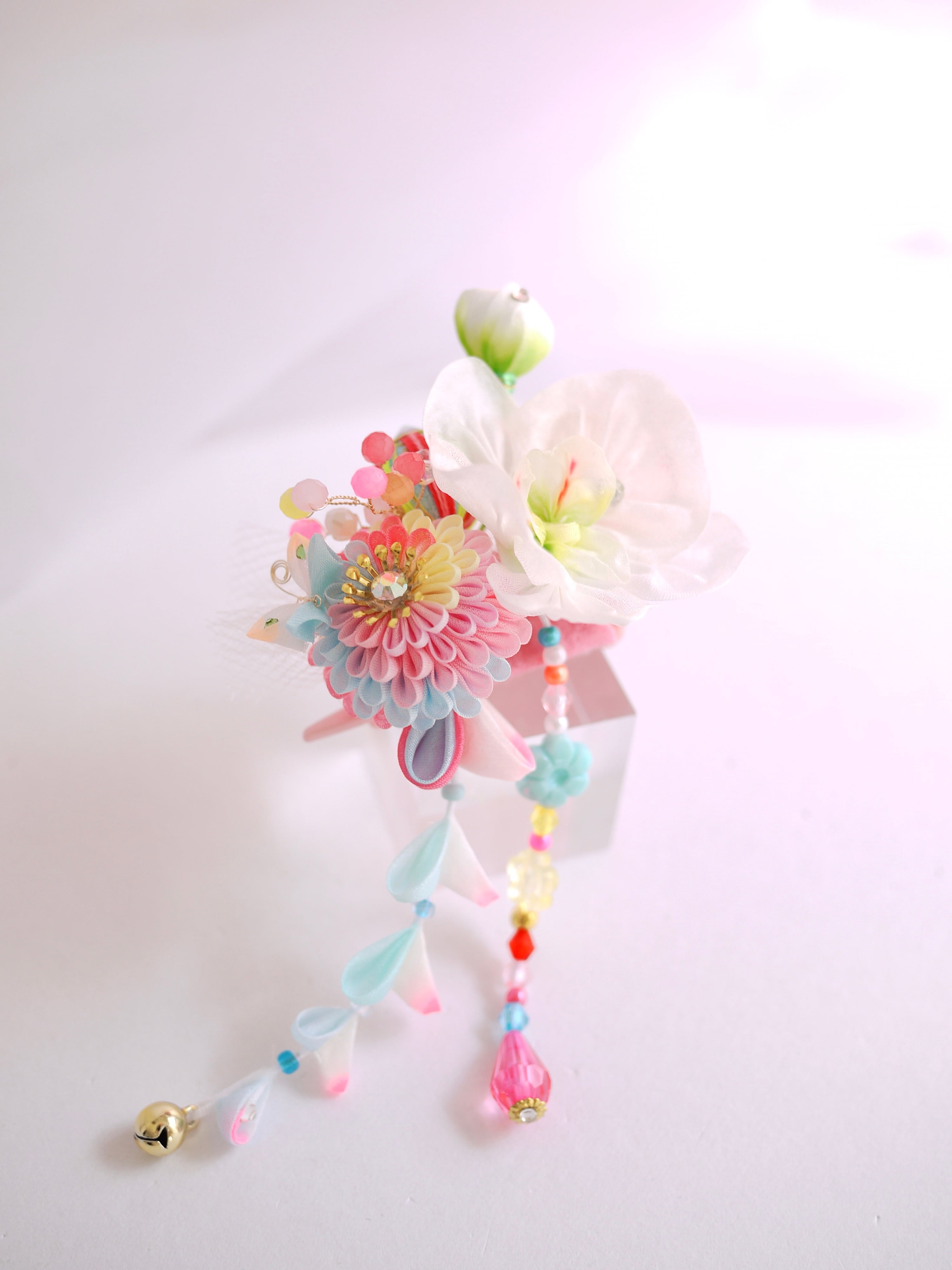 つまみ細工の胡蝶蘭はあのお馴染みの規則正しく連咲きする花姿を簪に表現することが多いので小さくてわりとカッチリしたデザインが主流ですが、あえてパキッと一輪咲きにキャンディカラーの半くすを組み合わせてみました