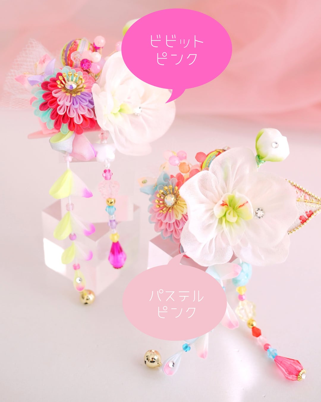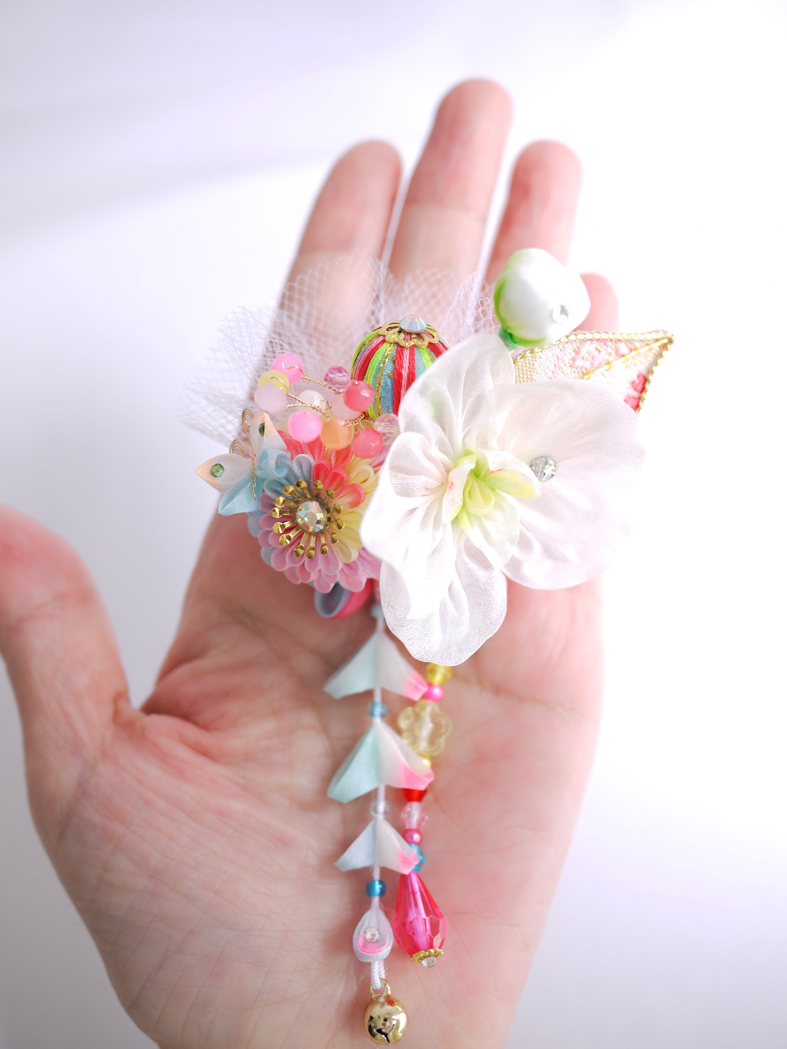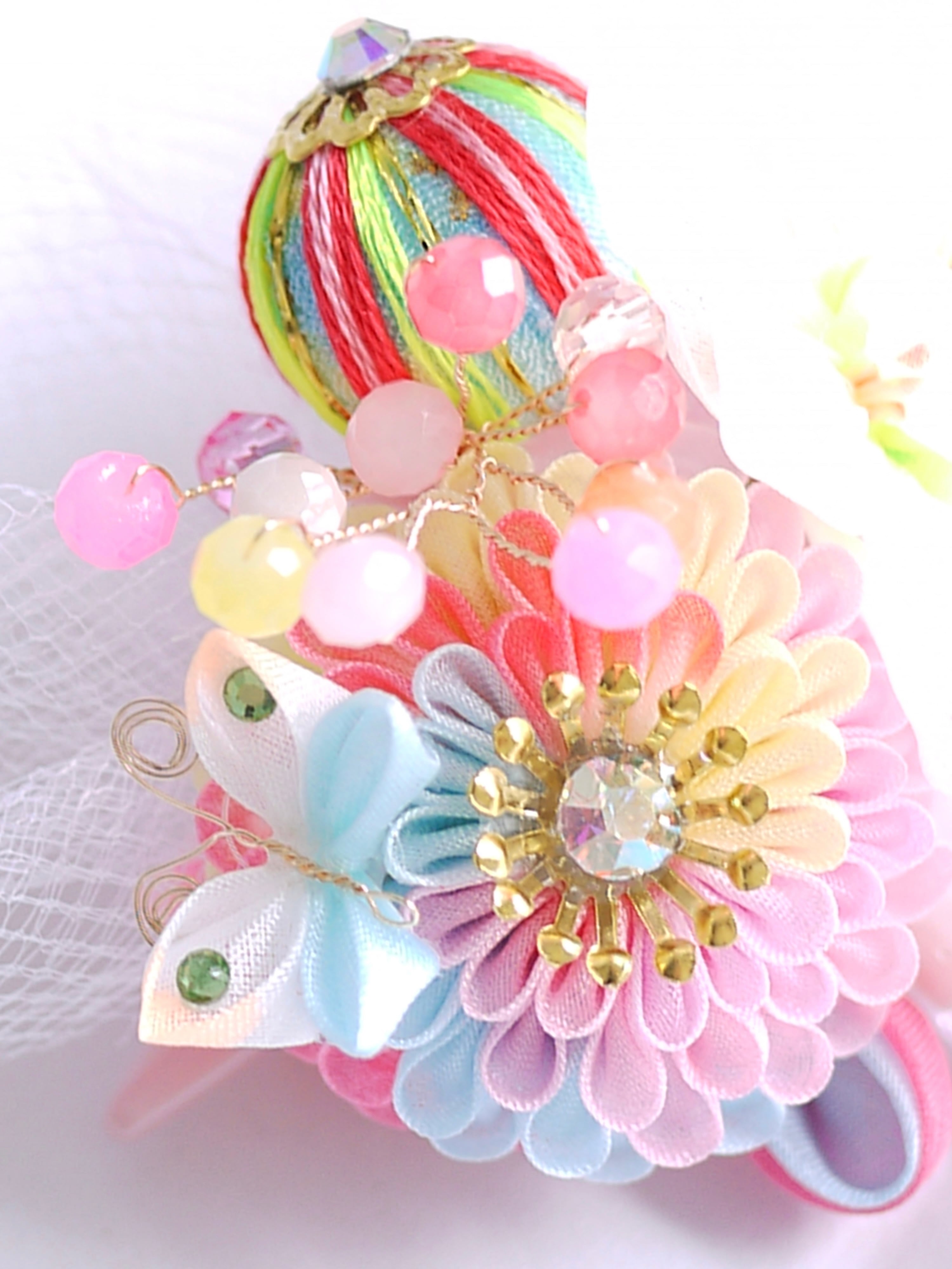 つまみ細工の胡蝶蘭はあのお馴染みの規則正しく連咲きする花姿を簪に表現することが多いので小さくてわりとカッチリしたデザインが主流ですが、あえてパキッと一輪咲きにキャンディカラーの半くすを組み合わせてみました