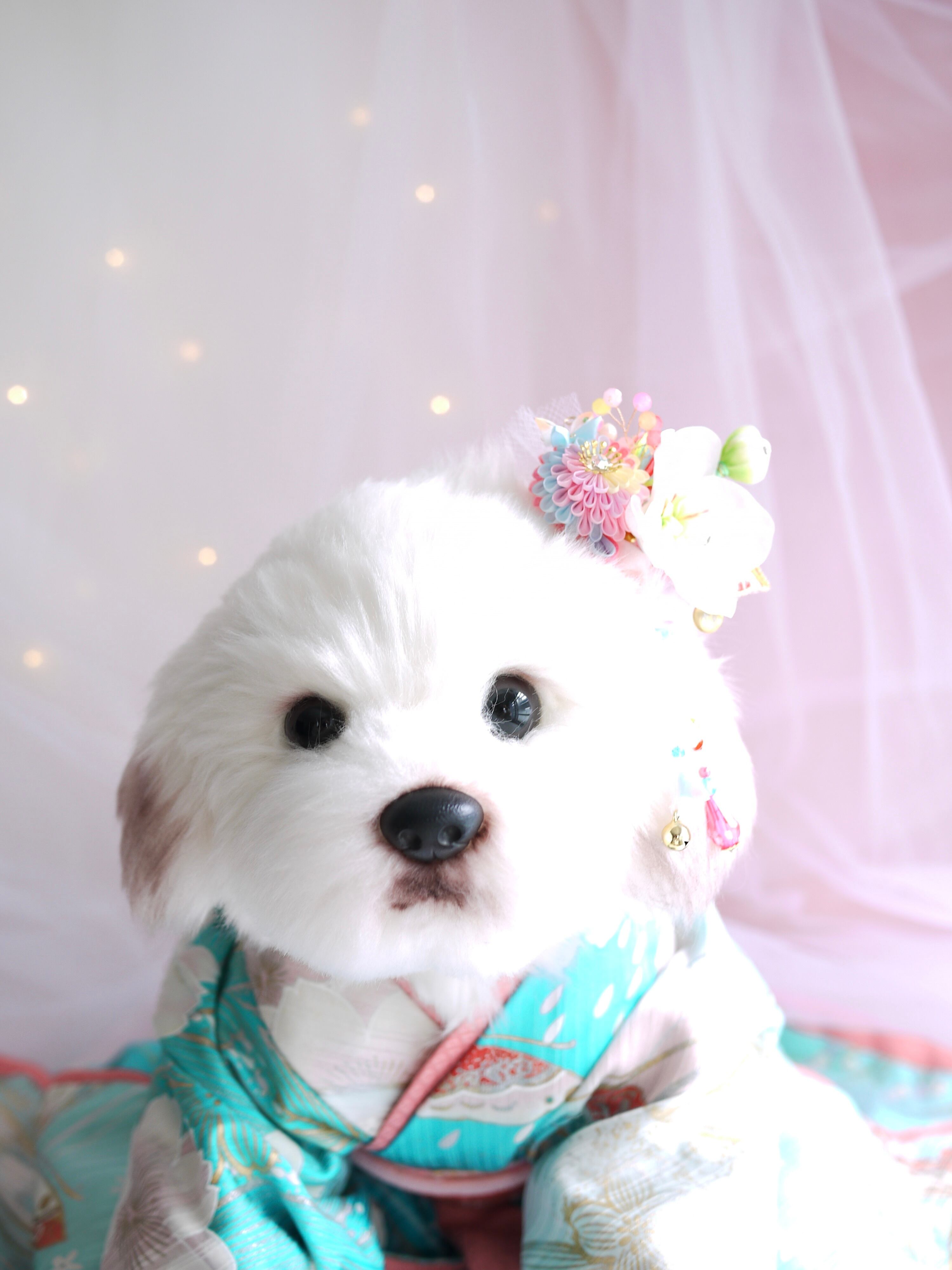 アートフラワーの胡蝶蘭はかなり大きなサイズが多いので小柄なワンちゃんにも品よく和装に馴染むようなサイズ感で作ってます