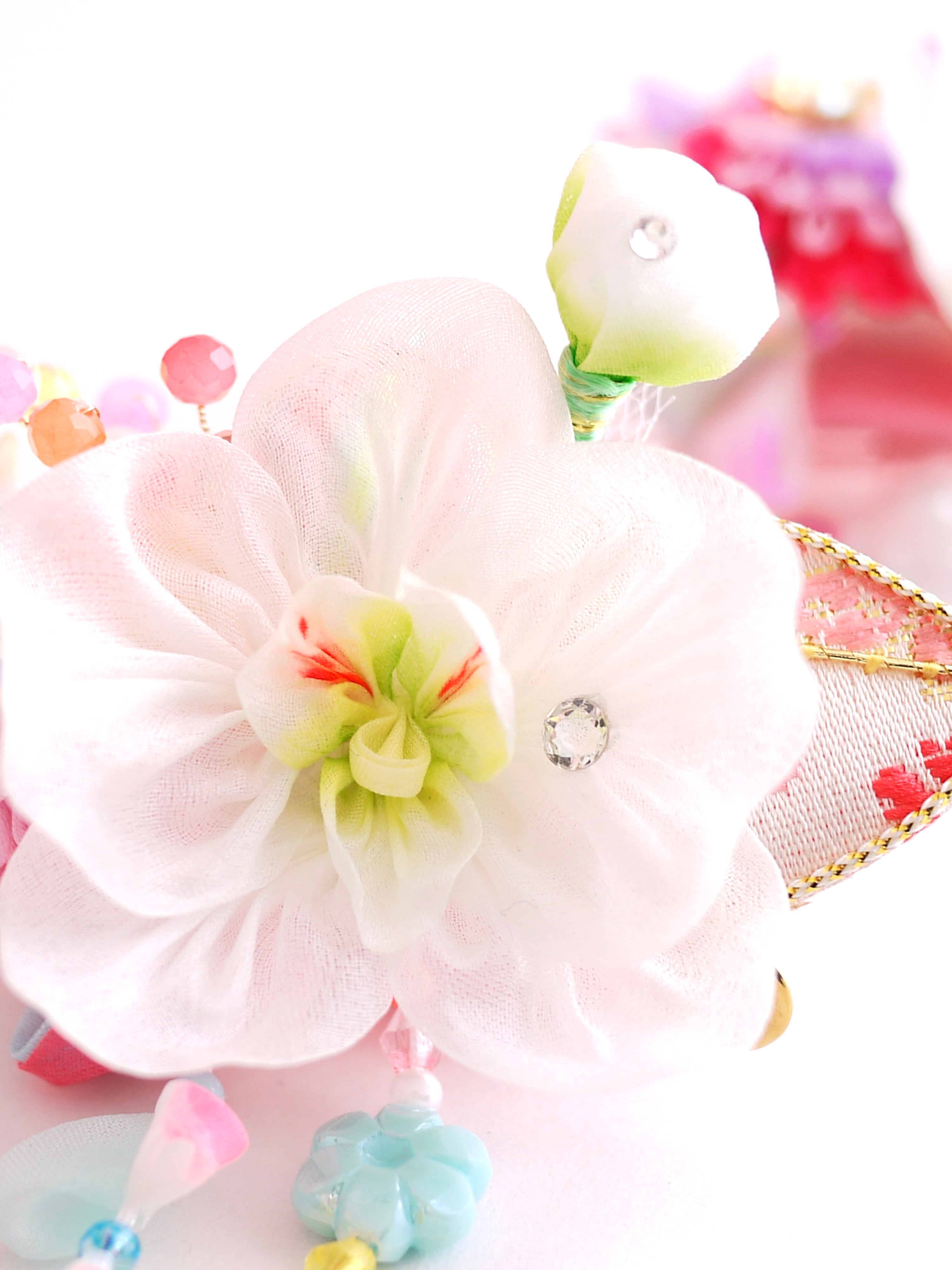 つまみ細工は専用の糊のみで制作しております、水に濡れると糊が溶けて型崩れしたり、正絹地が変形・変色する原因になることがございます。 雨や水濡れ・湿気には十分お気をつけください。 濃色のものは特に色移りする場合がございます