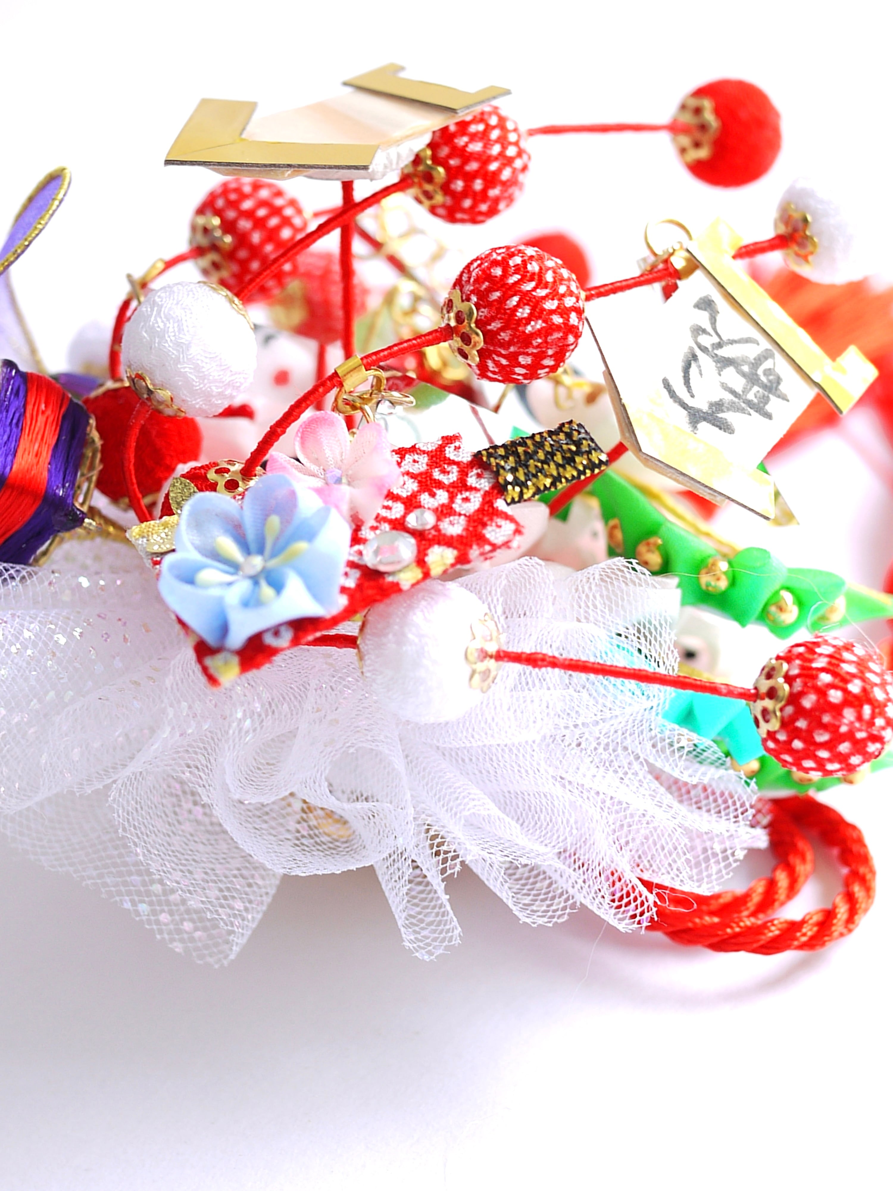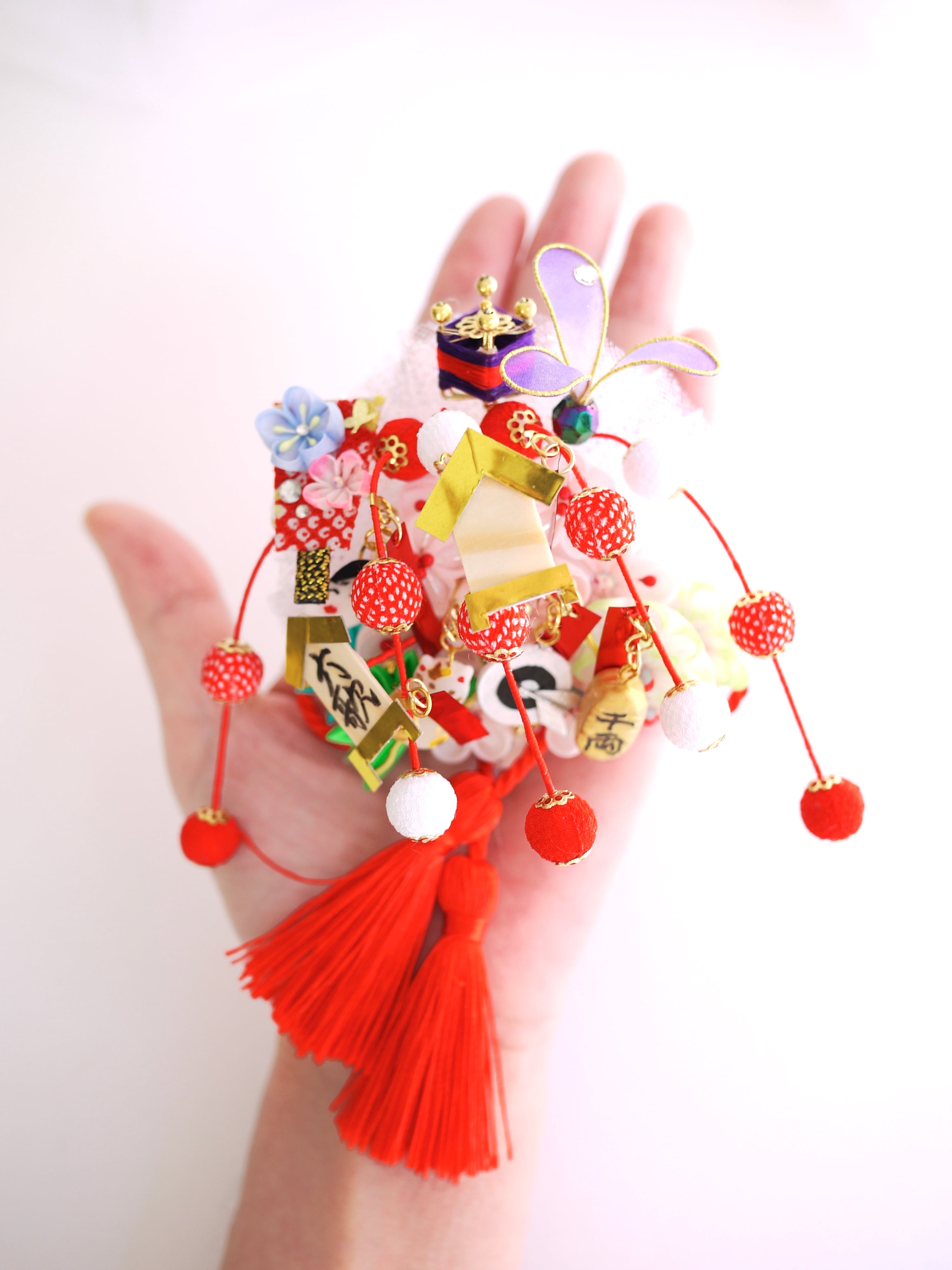 ちいさな羽子板やお多福・サイコロに招き猫などお正月の縁起物が綺羅星のごとく散りばめられた楽しいお飾り