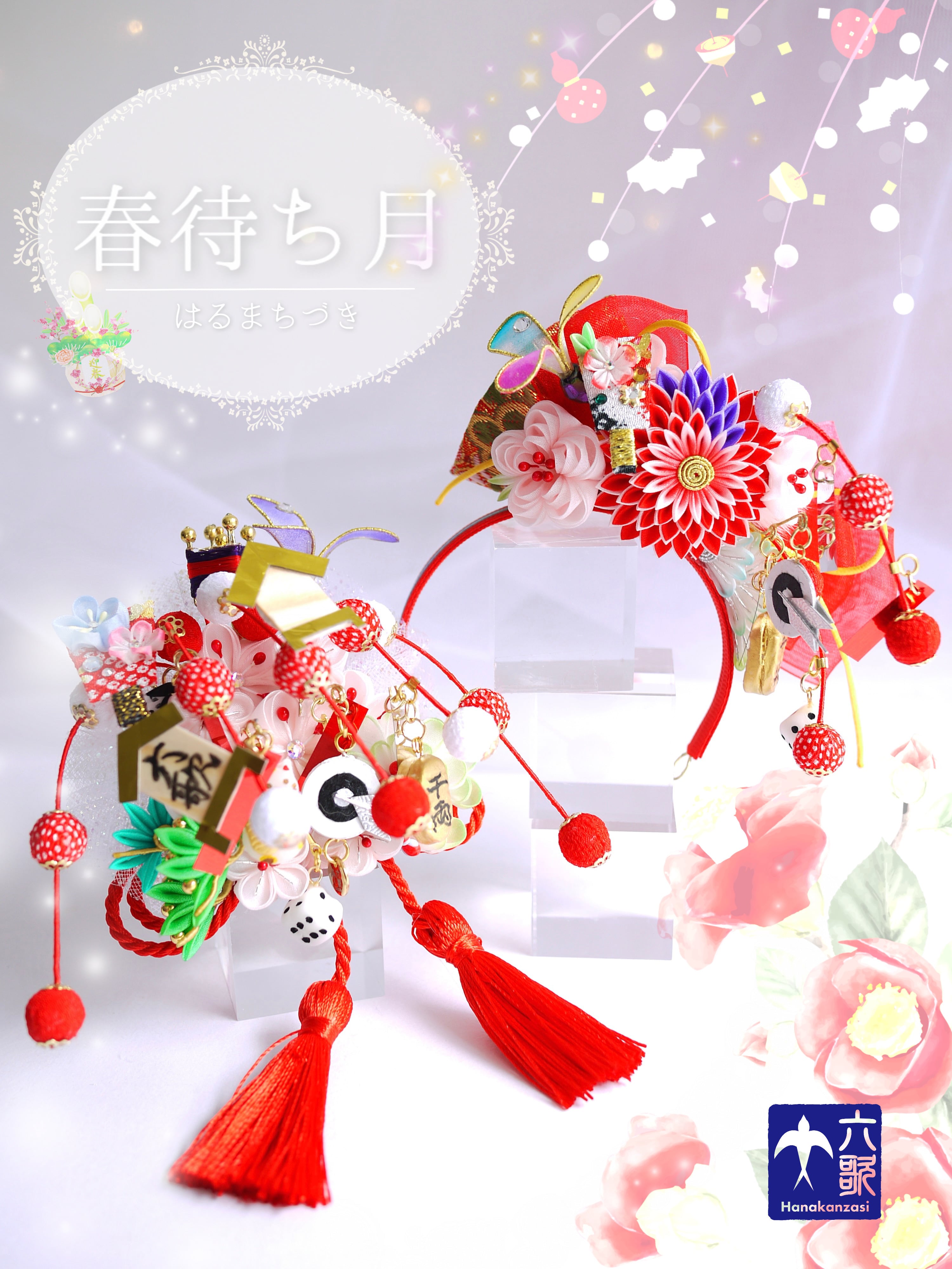 【春待ち月】タイニーカチューシャ花簪&帯飾りセット
