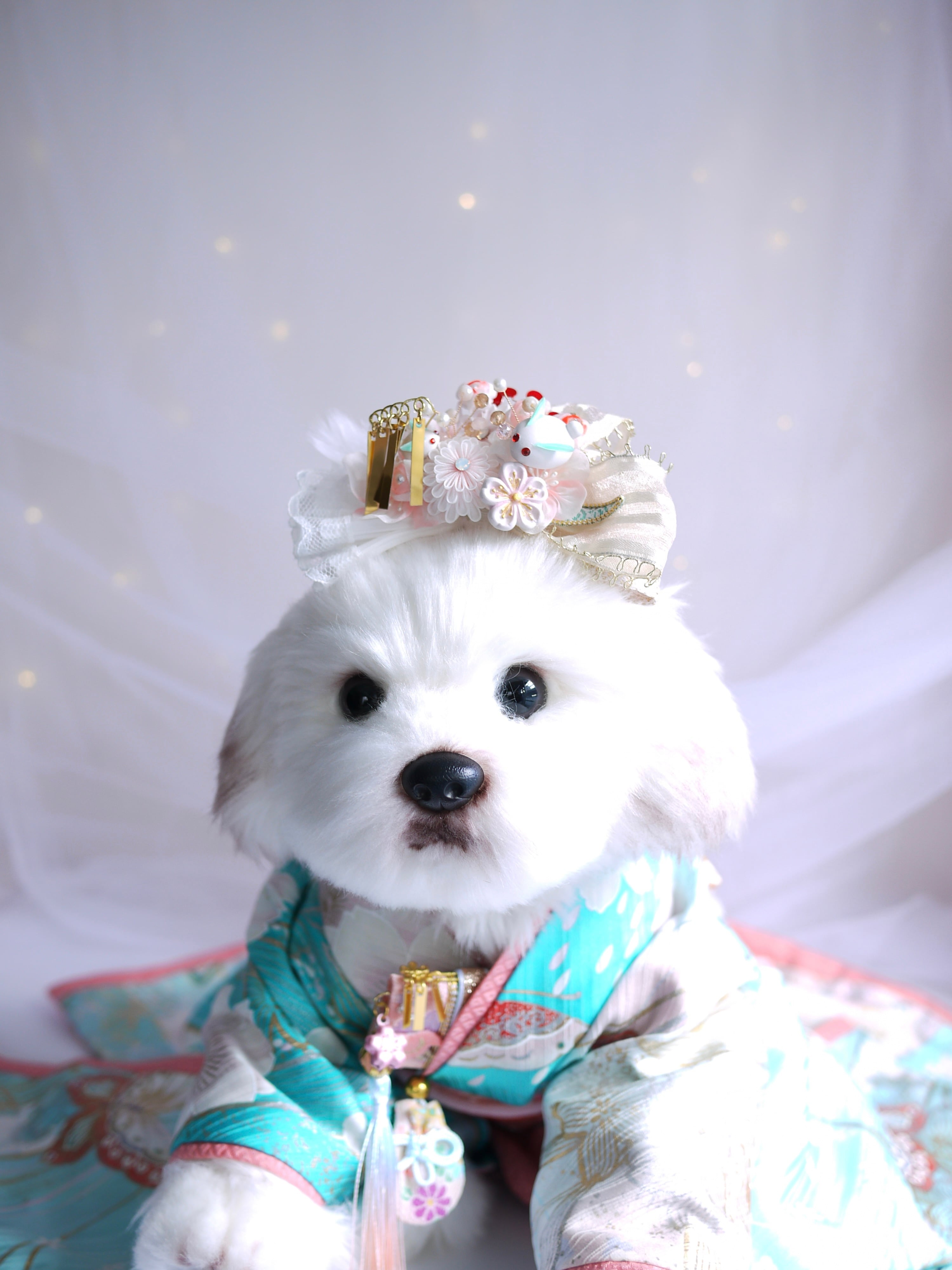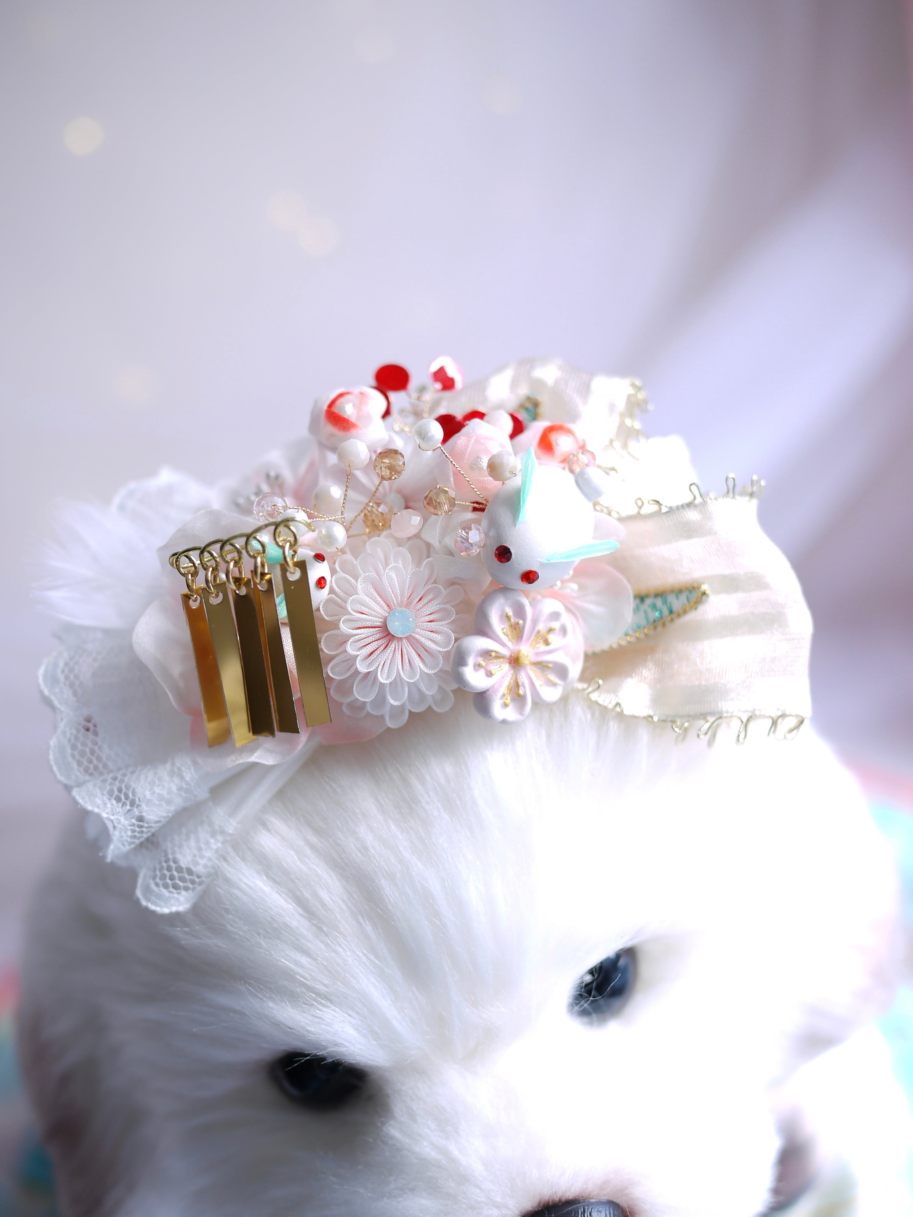 ガラスビーズパーツや金襴をリボンに使用してるのでつまみ細工オンリーの作品より少し重さあります、リボン横幅も10cmほどで大ぶりですのでしっかり止められる毛量があるワンちゃんにおすすめ