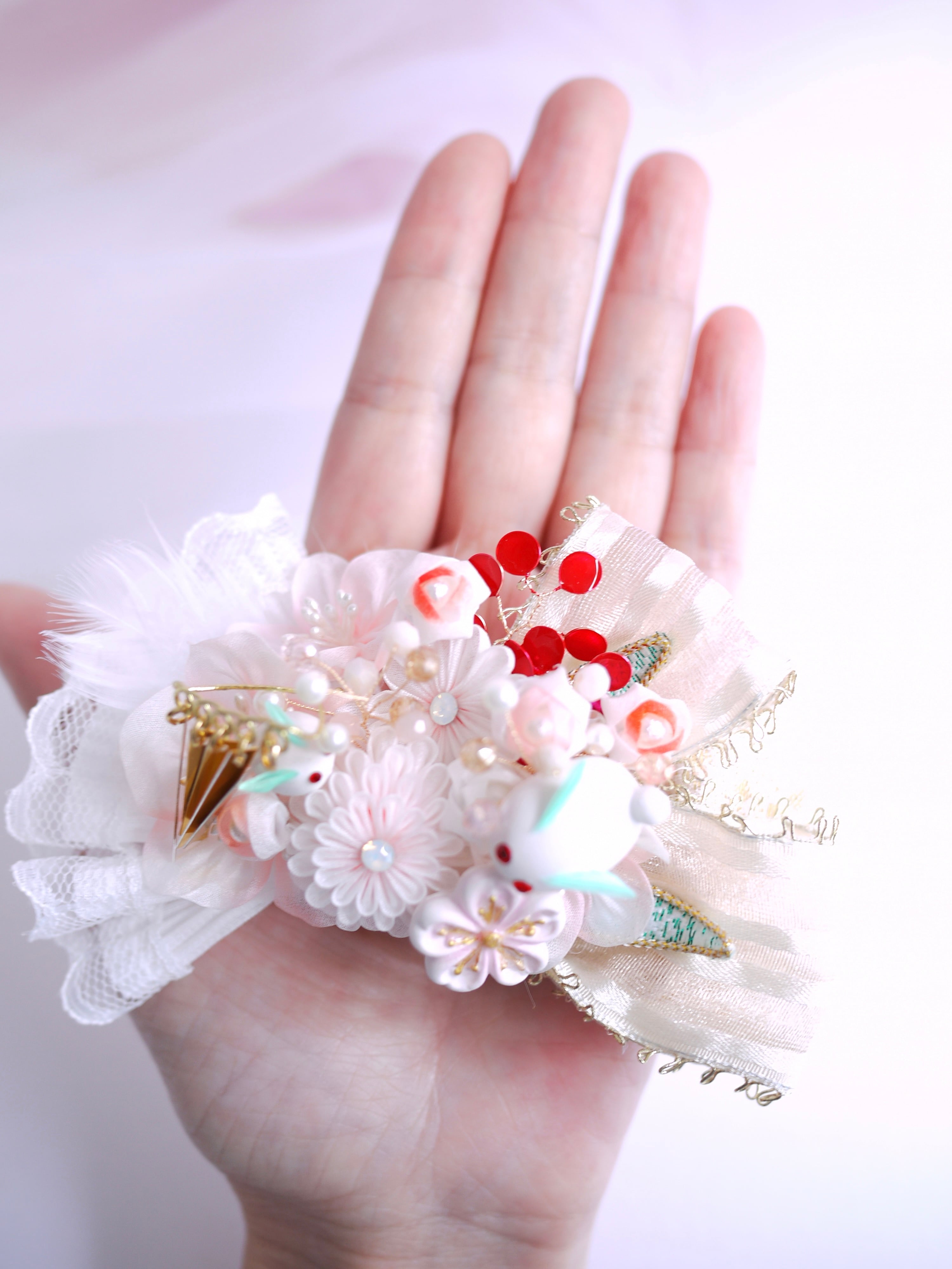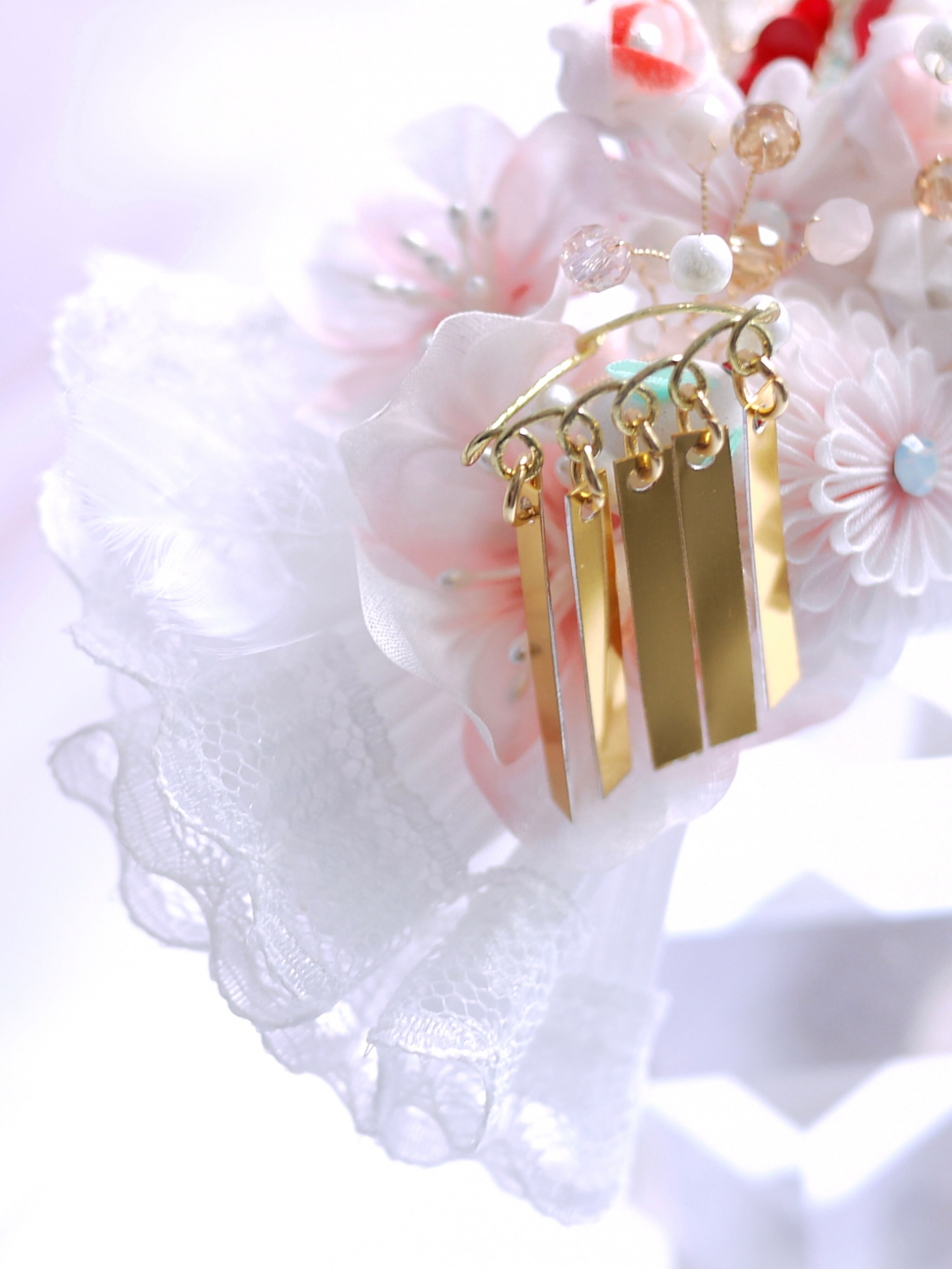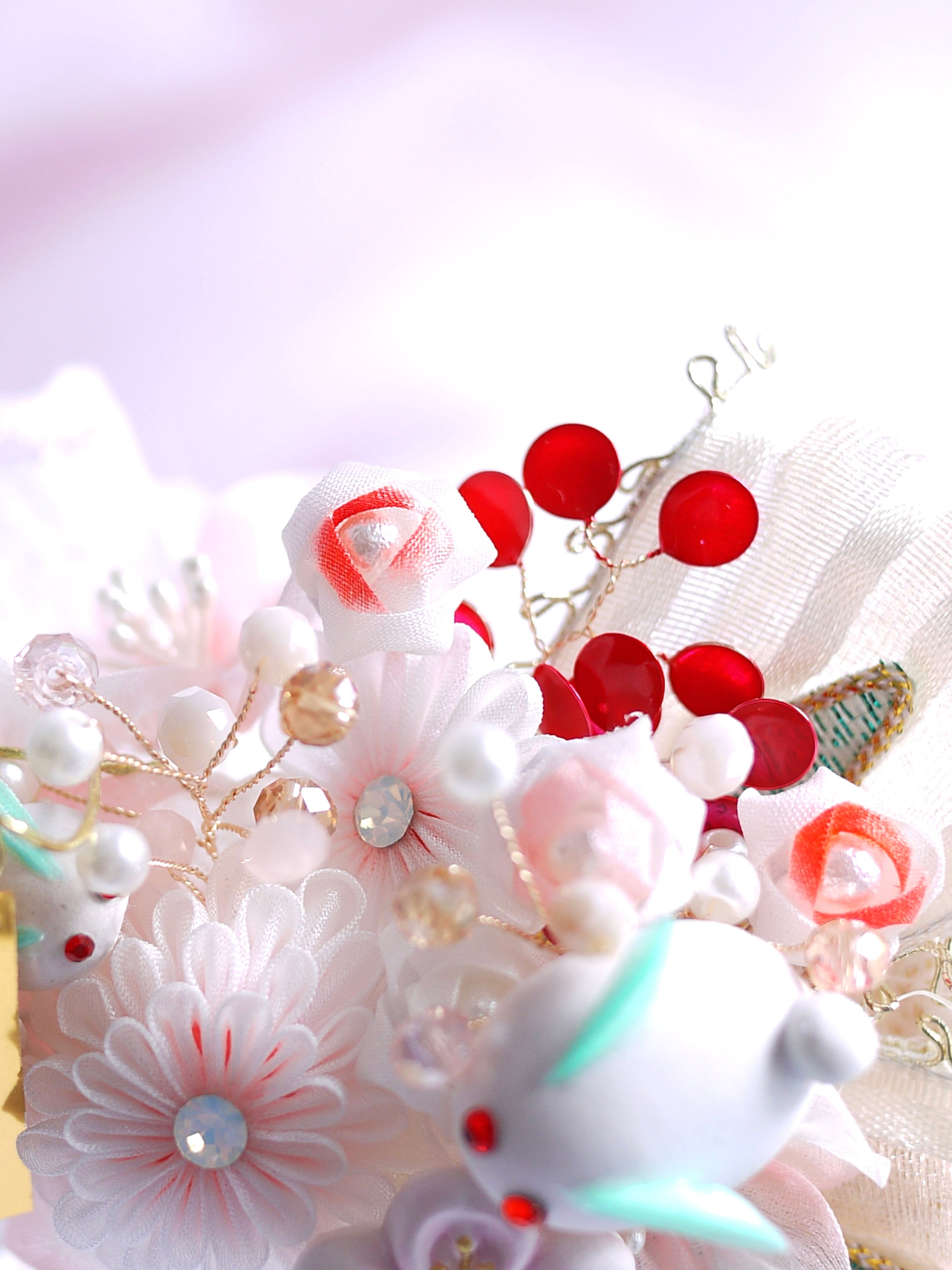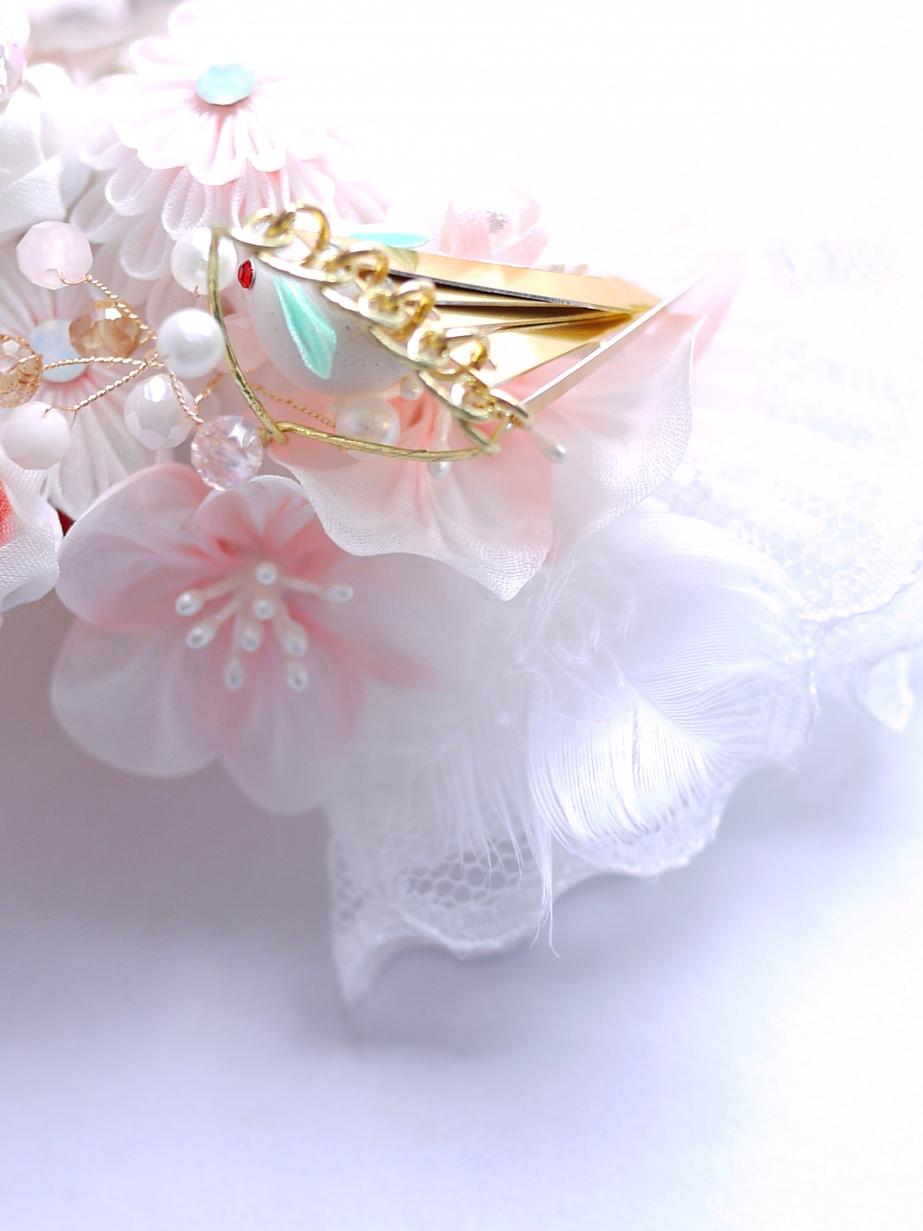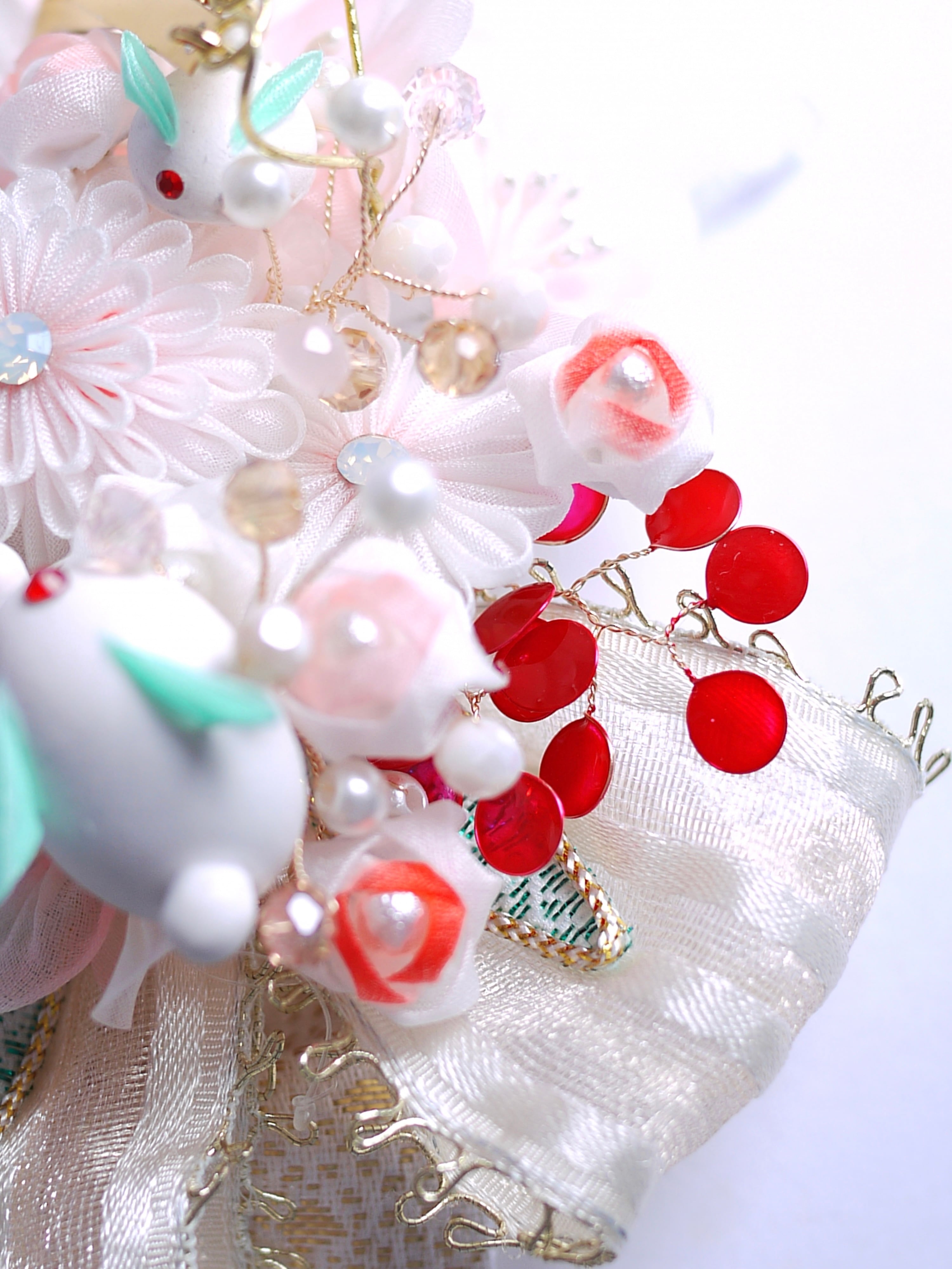 つまみ細工は専用の糊のみで制作しております、水に濡れると糊が溶けて型崩れしたり、正絹地が変形・変色する原因になることがございます。 雨や水濡れ・湿気には十分お気をつけください。 濃色のものは特に色移りする場合がございます