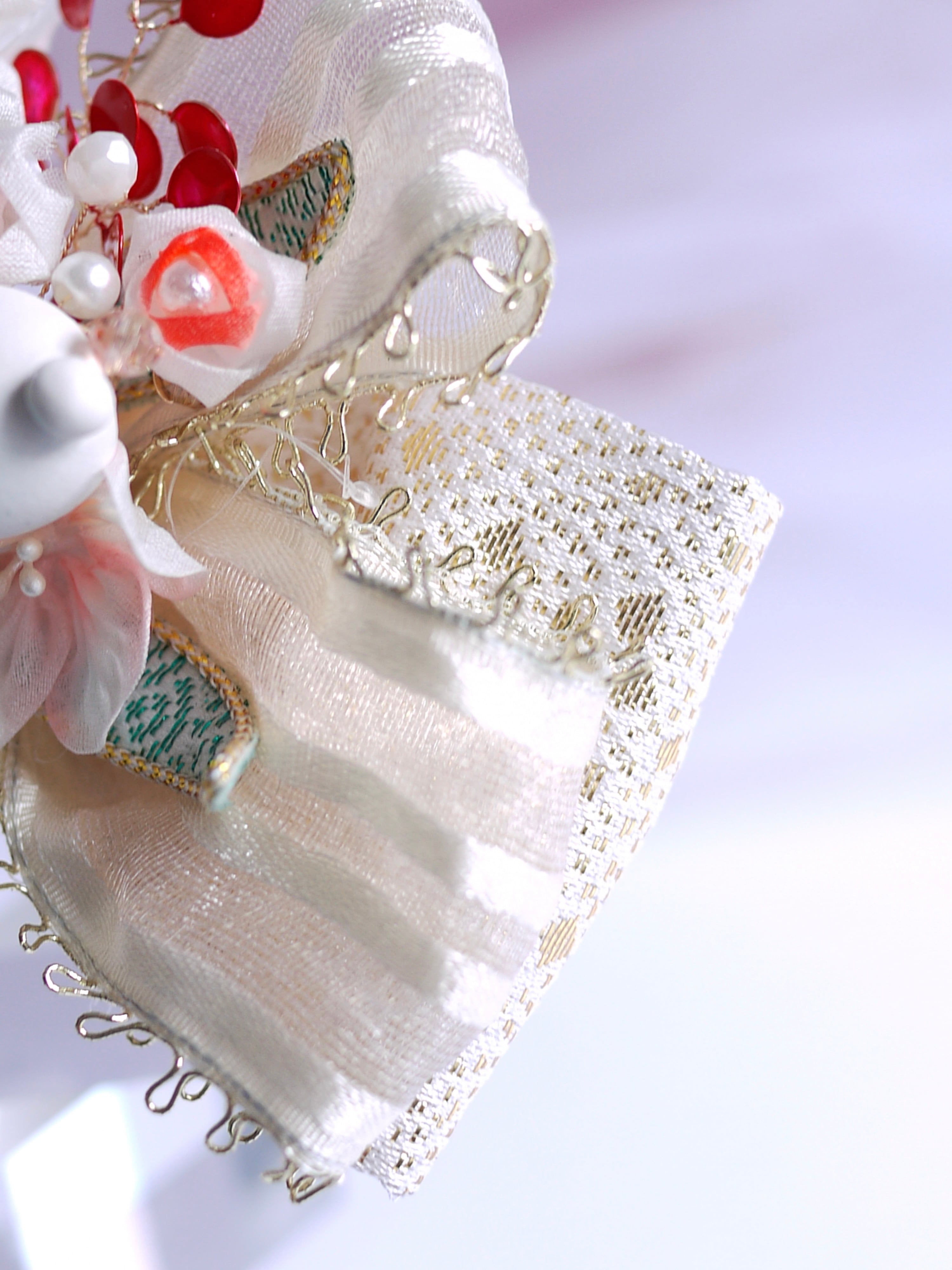 レースやゴールドピコットのフレンチリボンに金襴をミックス使いしたボリュームリボンもポイントです