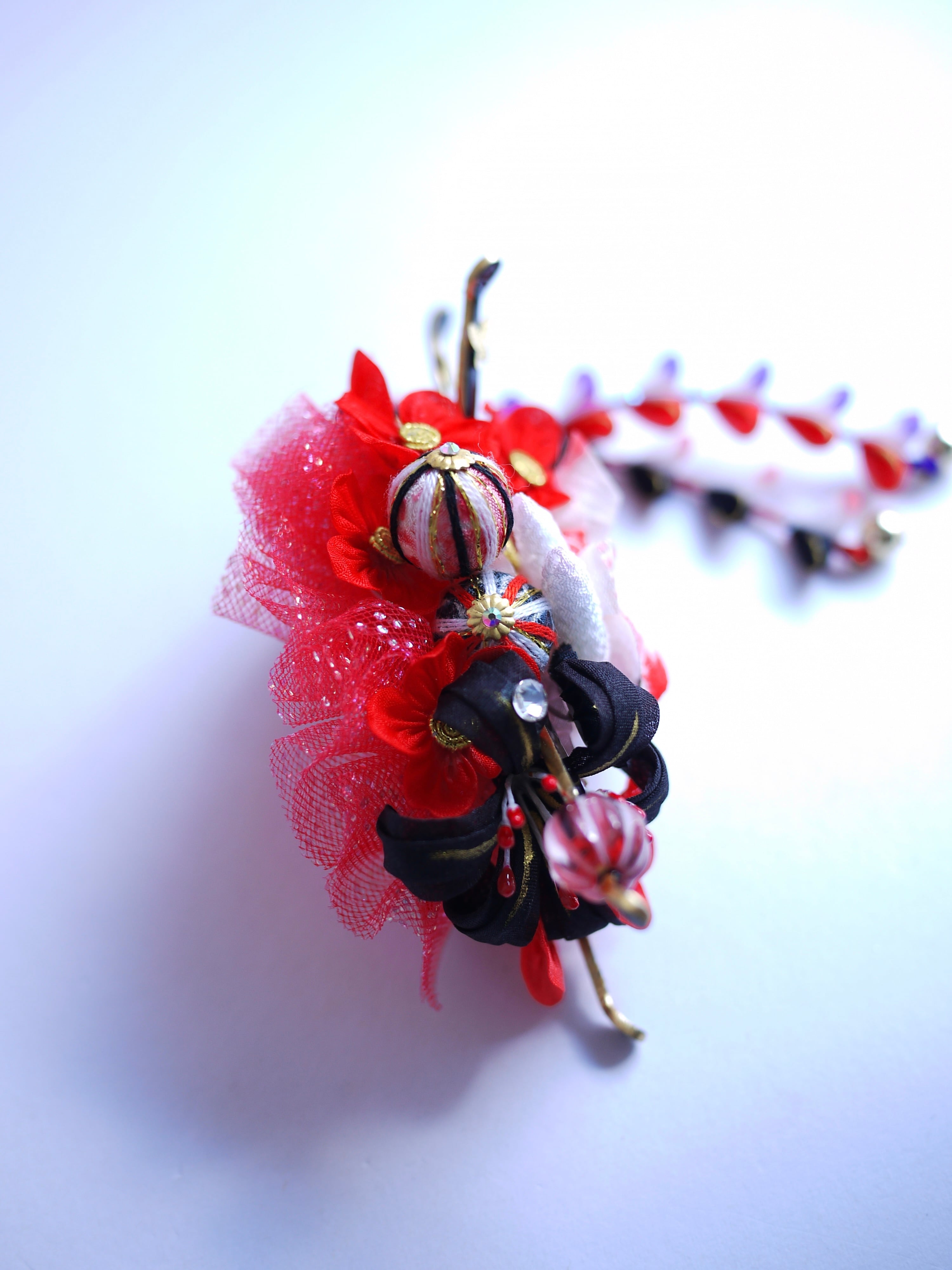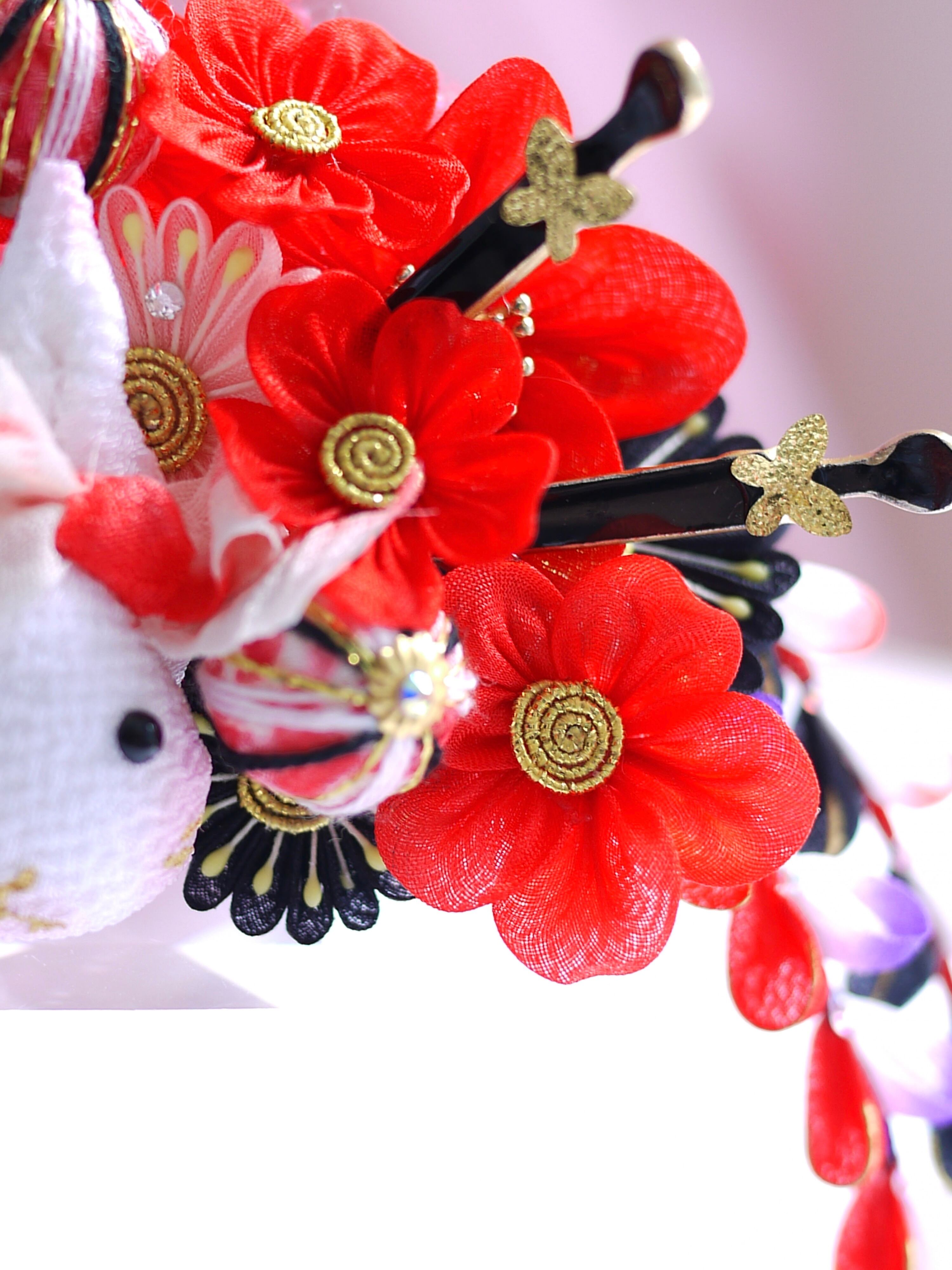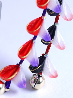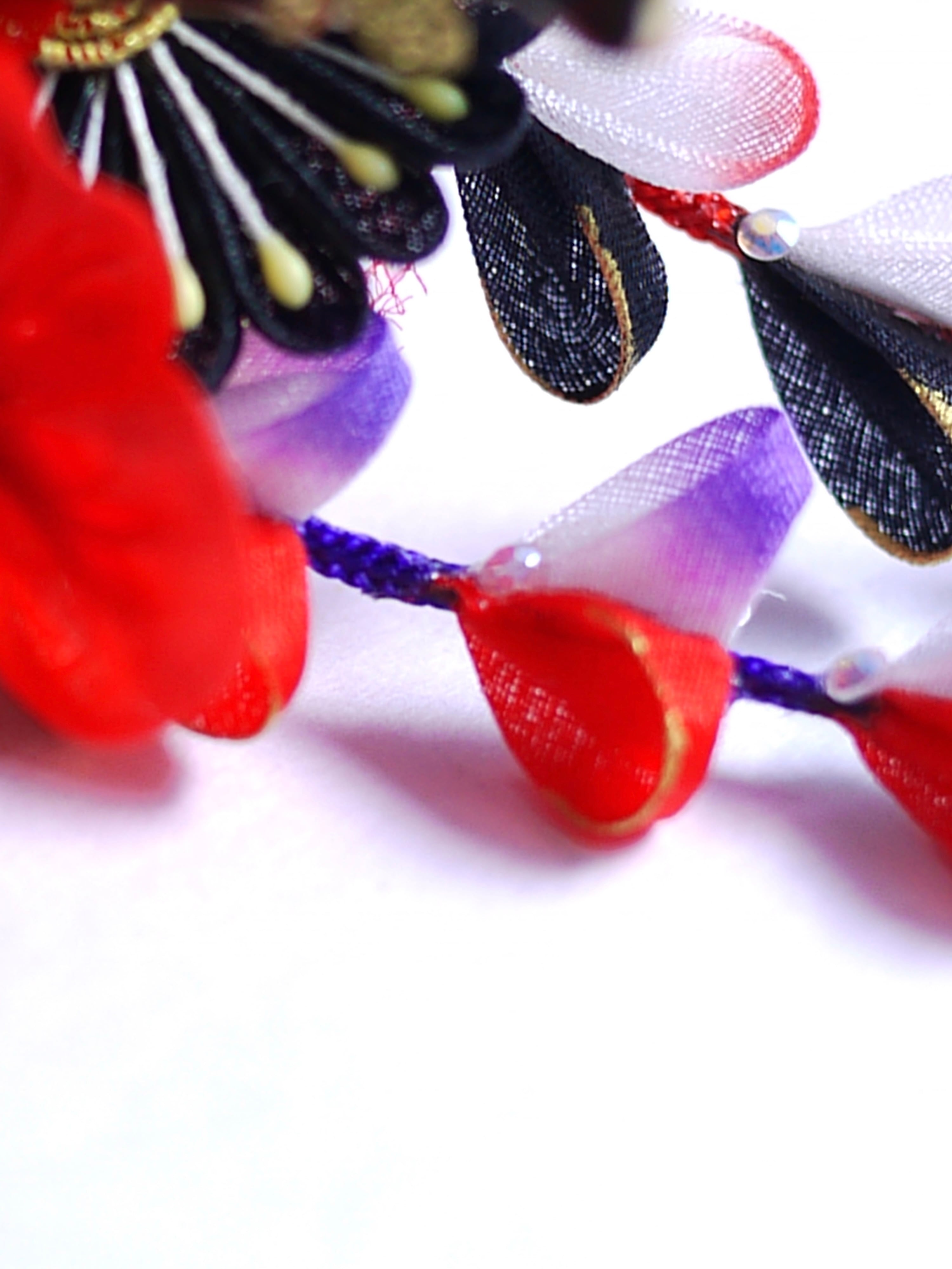 つまみ細工は専用の糊のみで制作しております、水に濡れると糊が溶けて型崩れしたり、正絹地が変形・変色する原因になることがございます。 雨や水濡れ・湿気には十分お気をつけください。 濃色のものは特に色移りする場合がございます