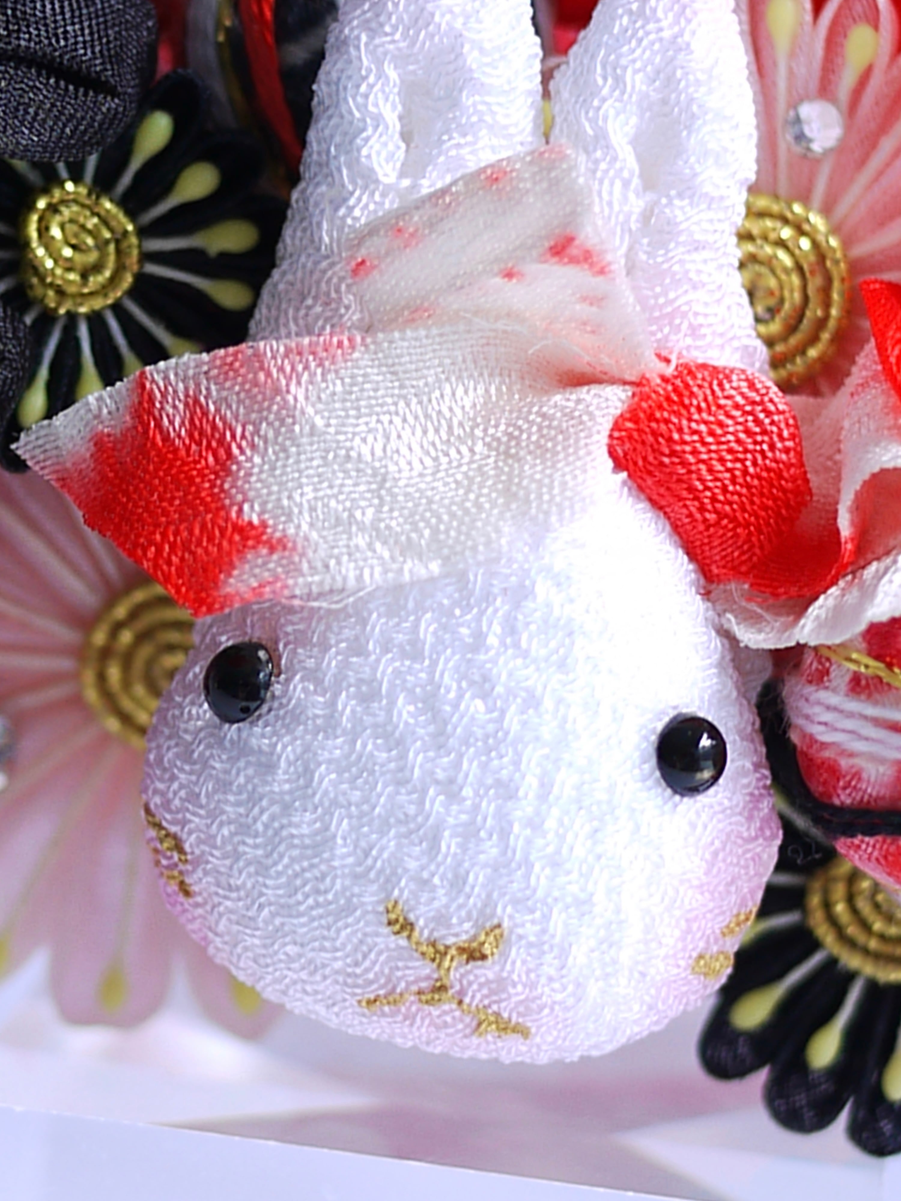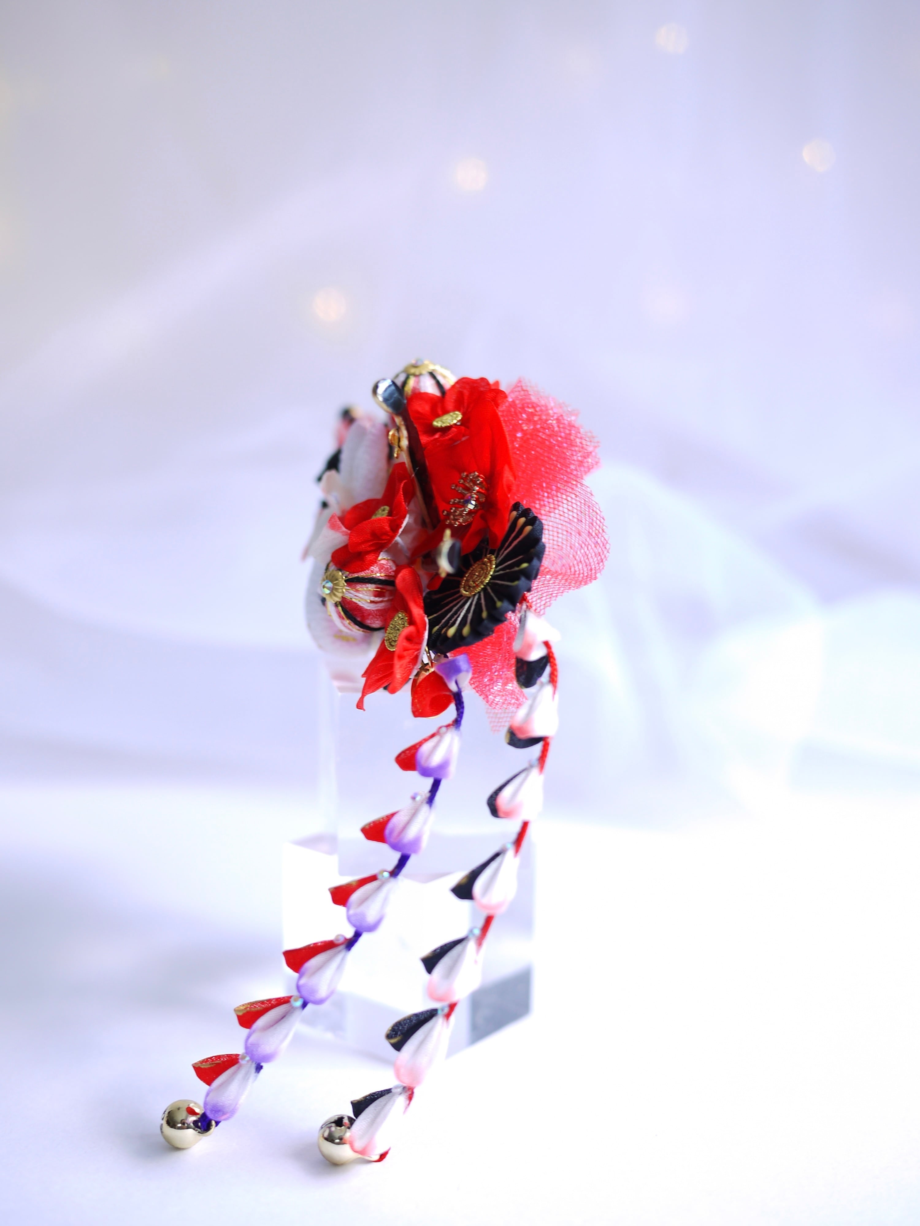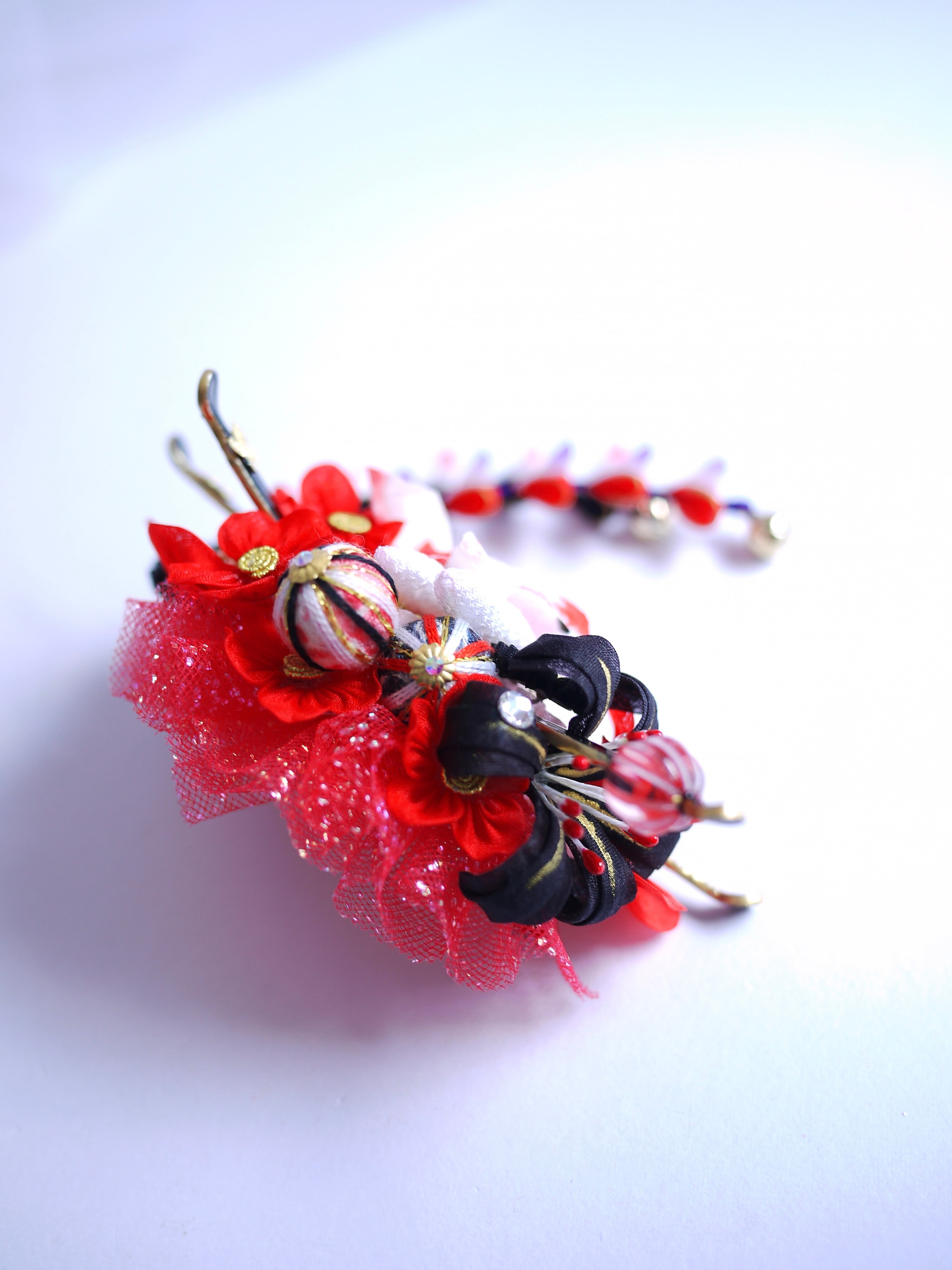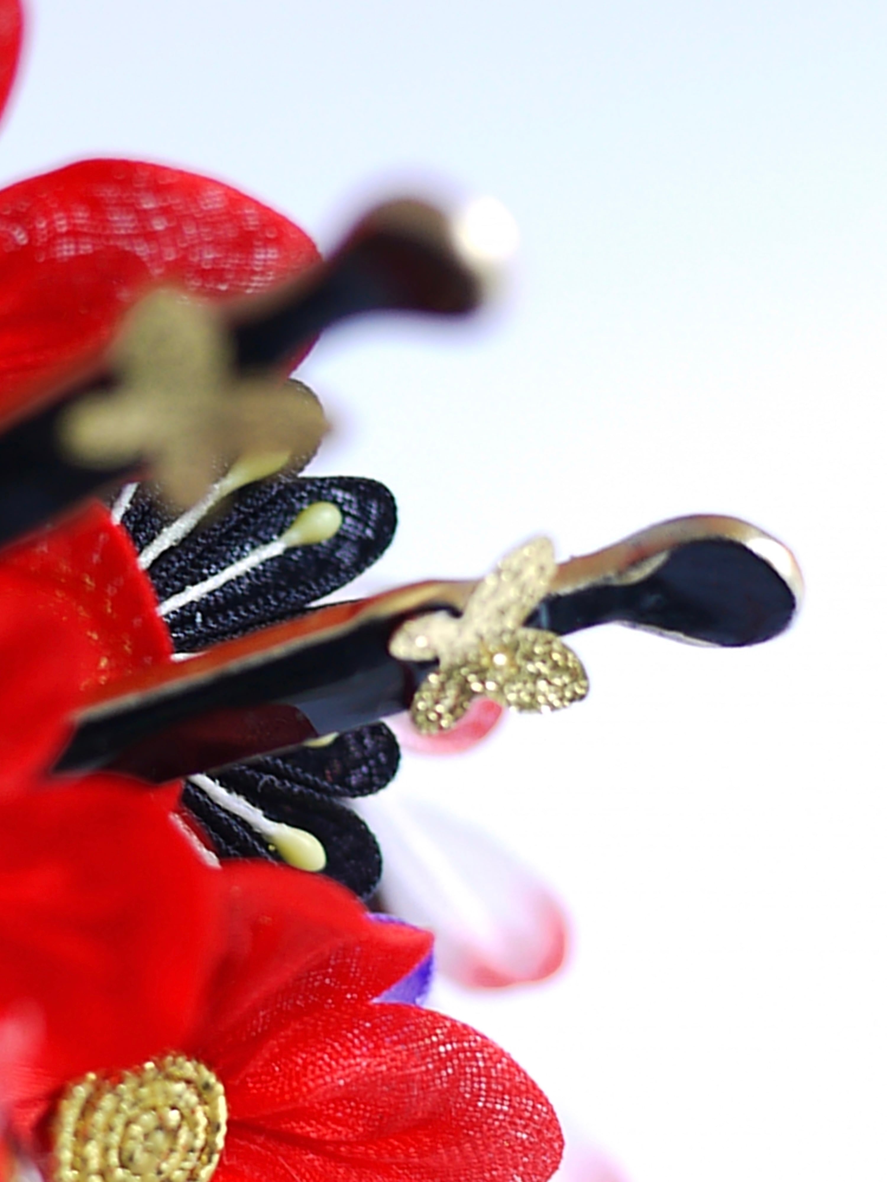 つまみ細工は専用の糊のみで制作しております、水に濡れると糊が溶けて型崩れしたり、正絹地が変形・変色する原因になることがございます。 雨や水濡れ・湿気には十分お気をつけください。 濃色のものは特に色移りする場合がございます