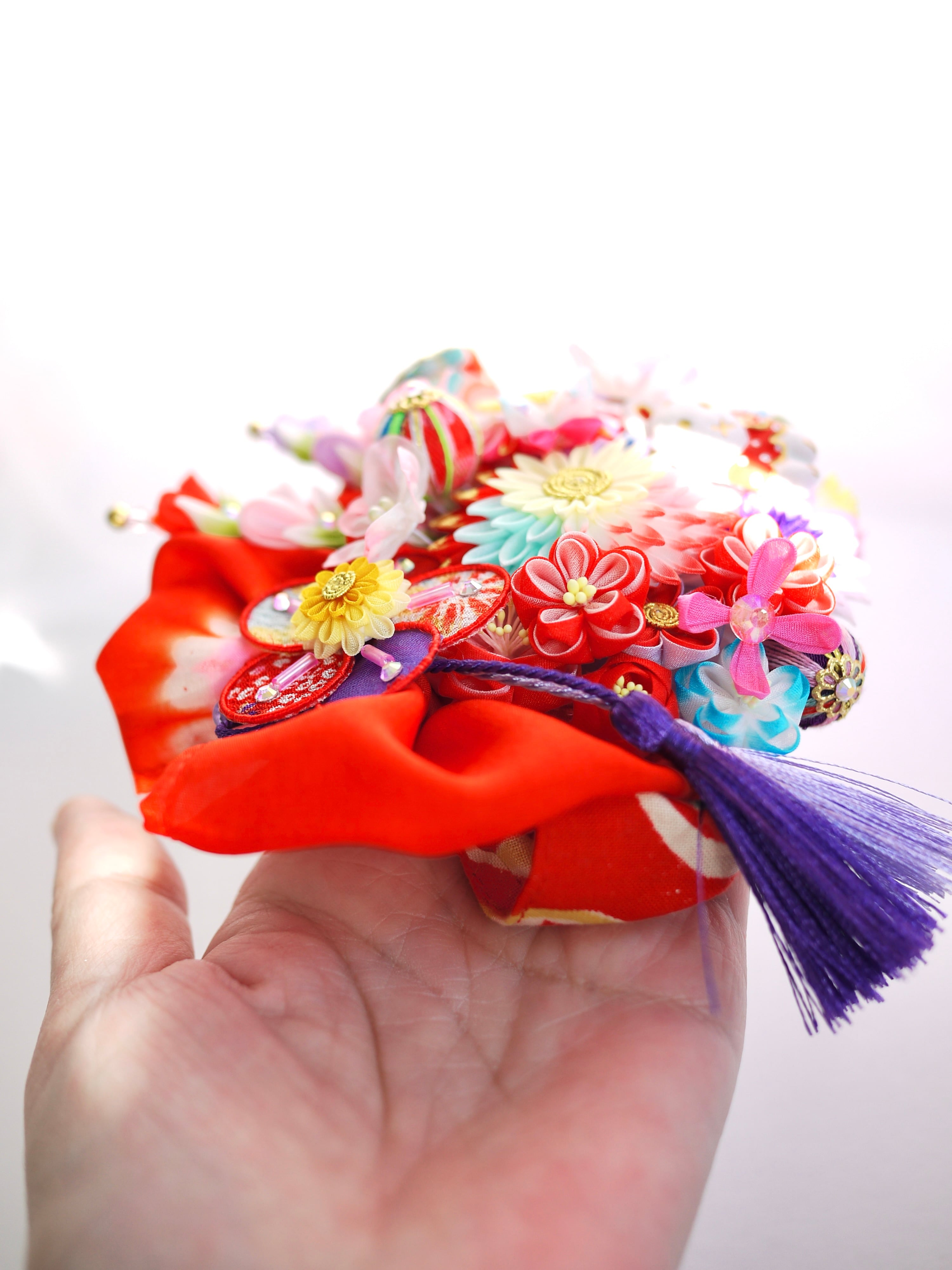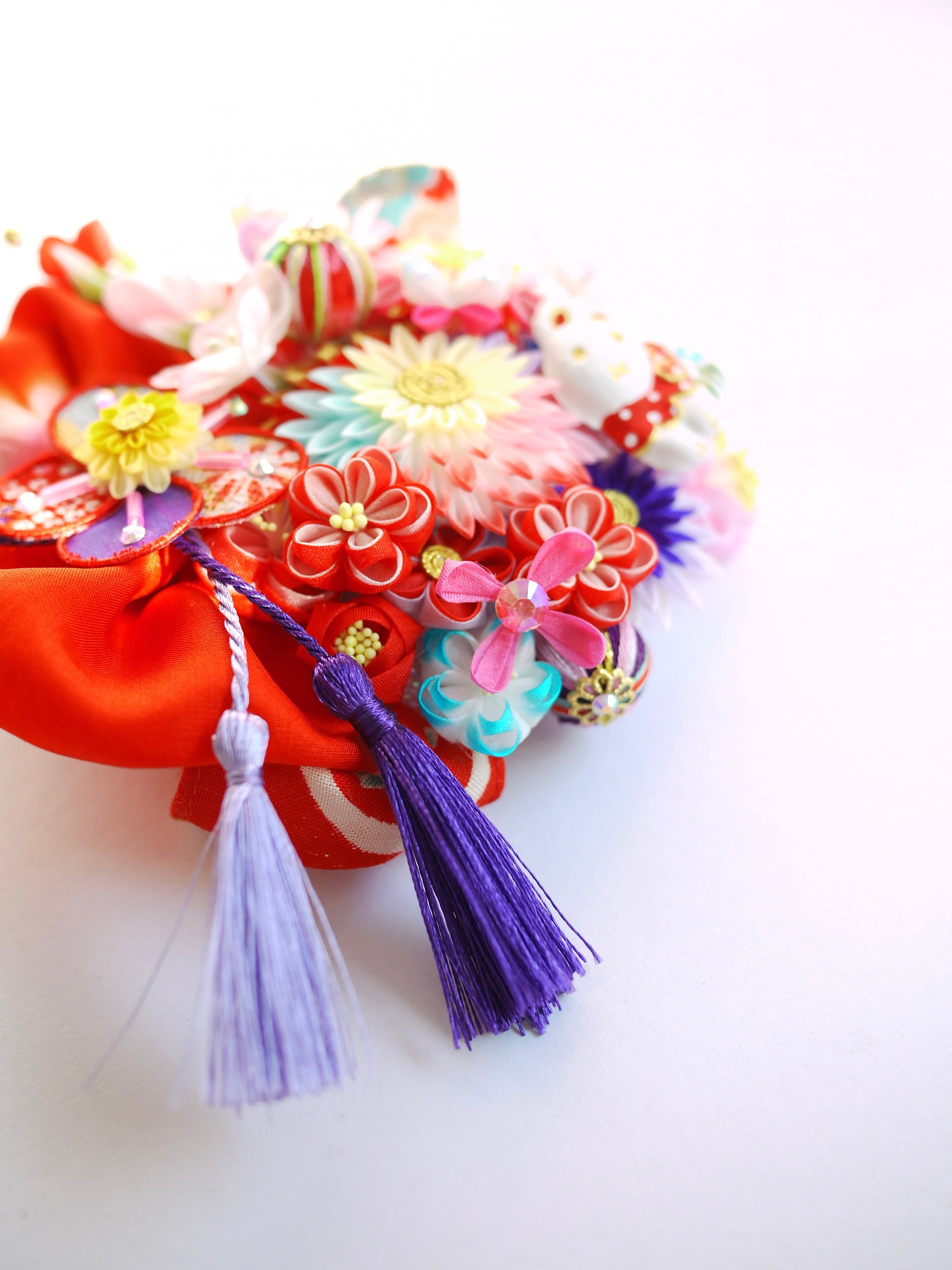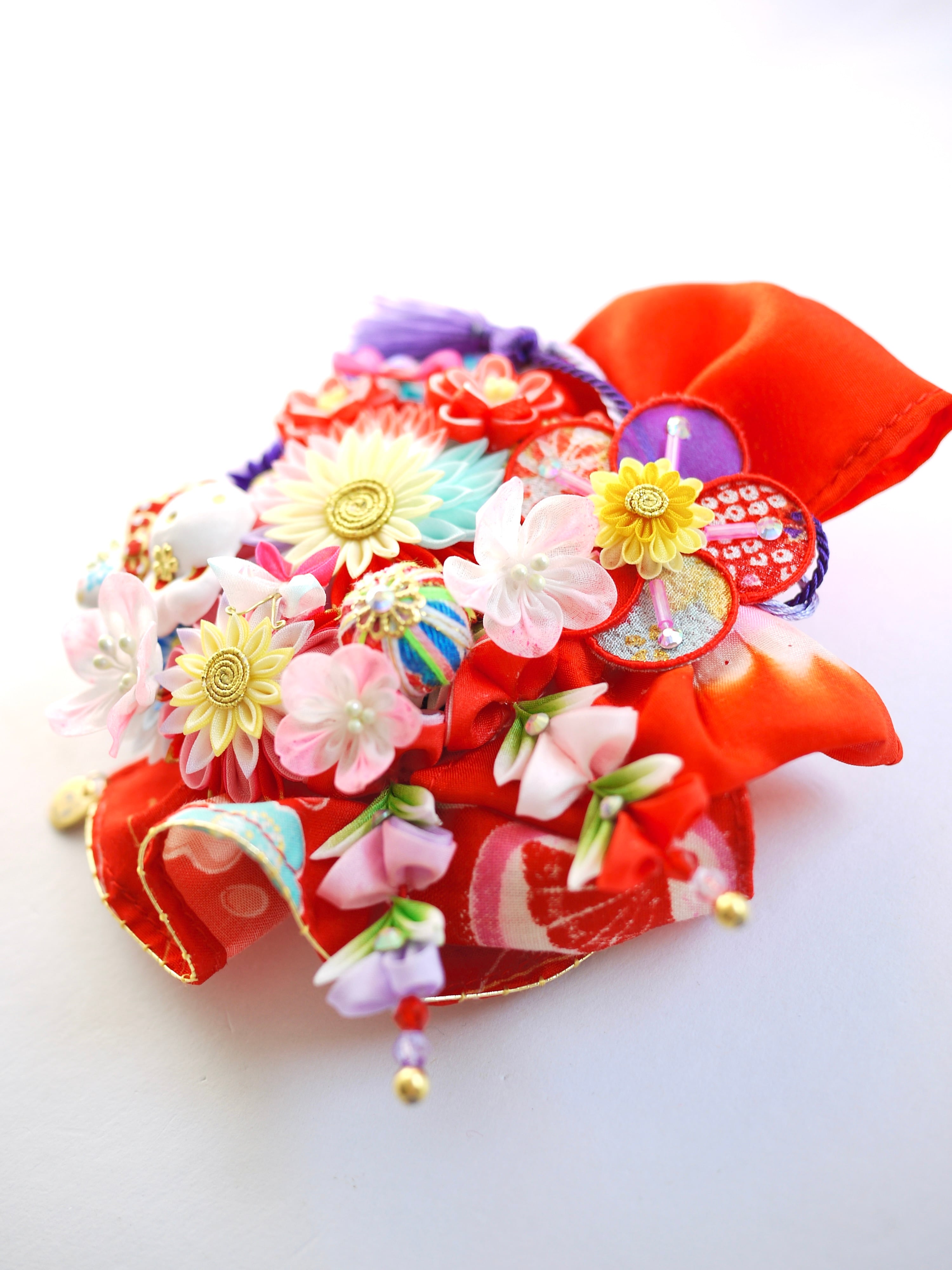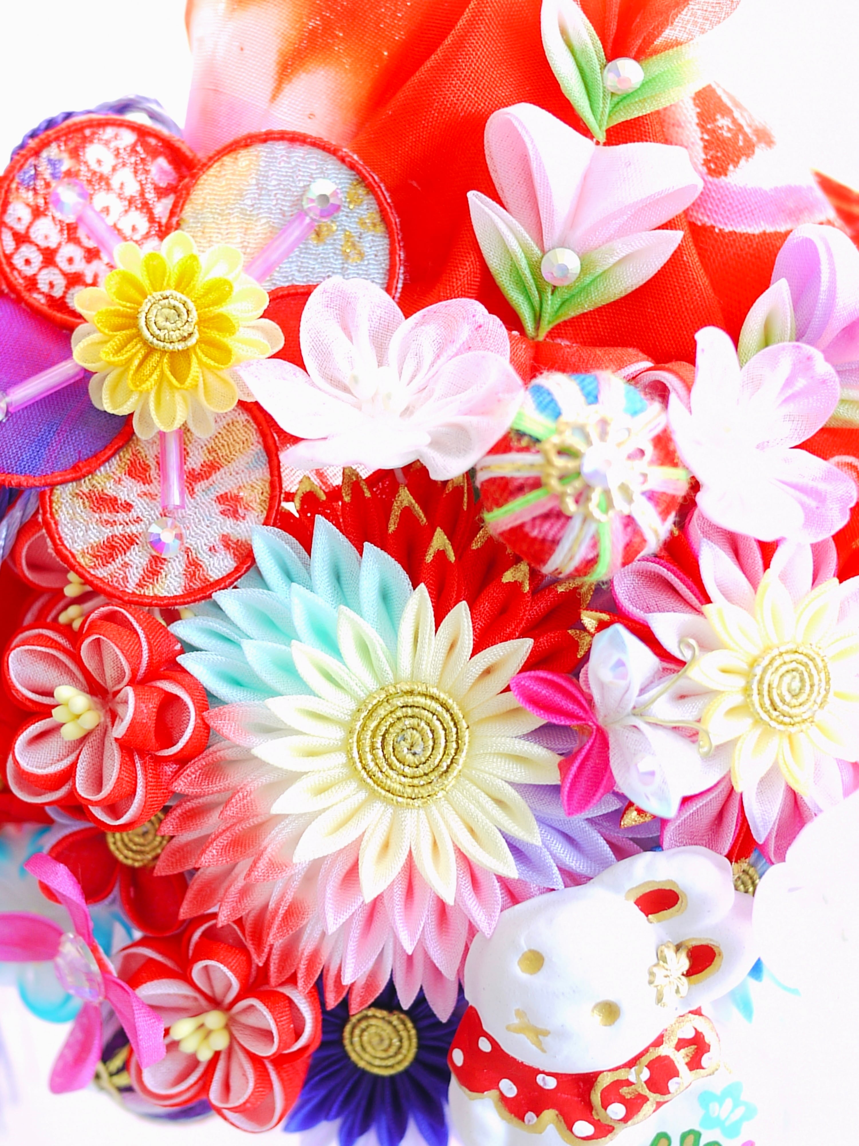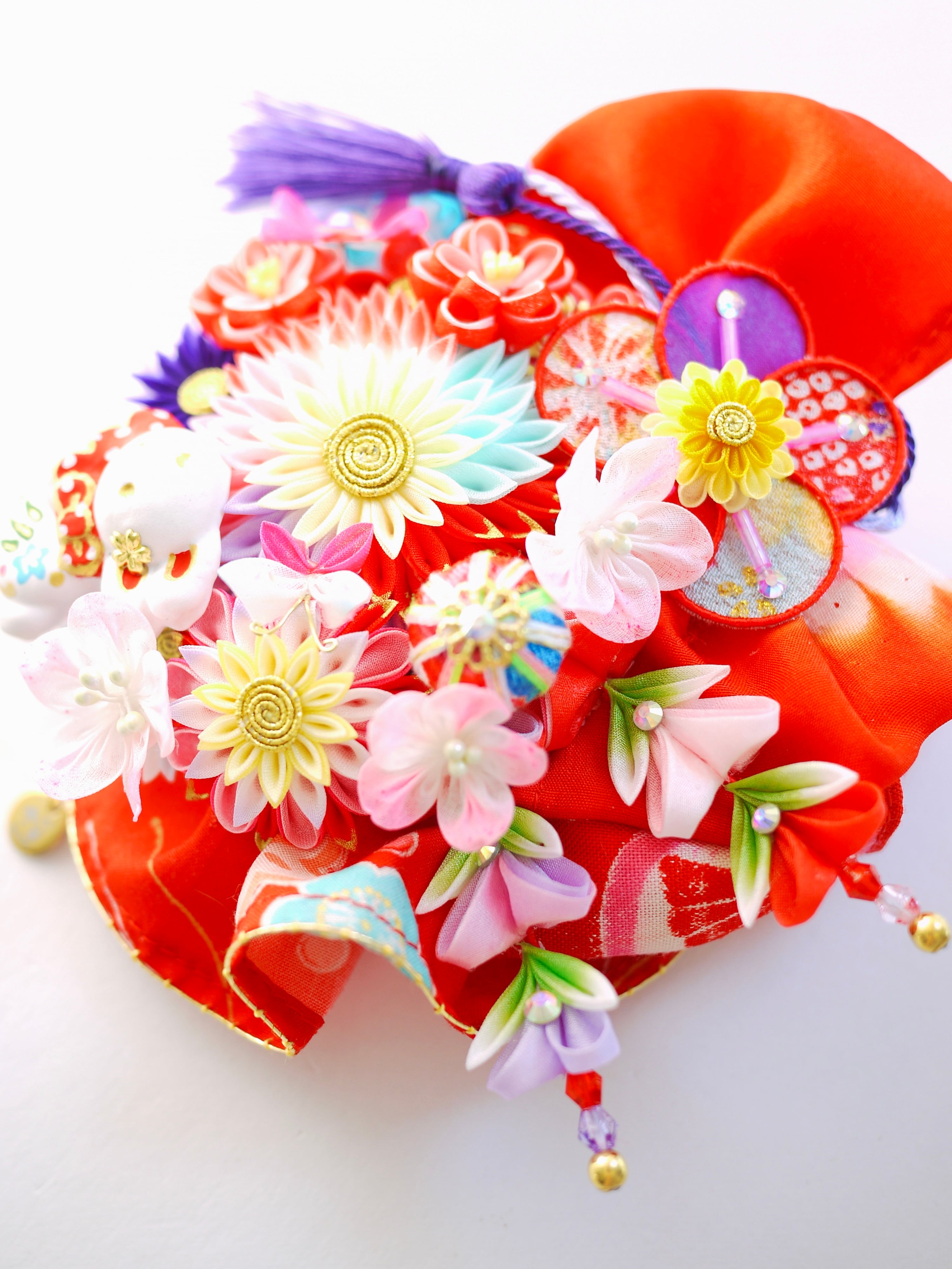 チューリップみたいなつまみピックや縁貼り仕立てのお花が重なり合って玉手箱のような賑やかな華やかさです