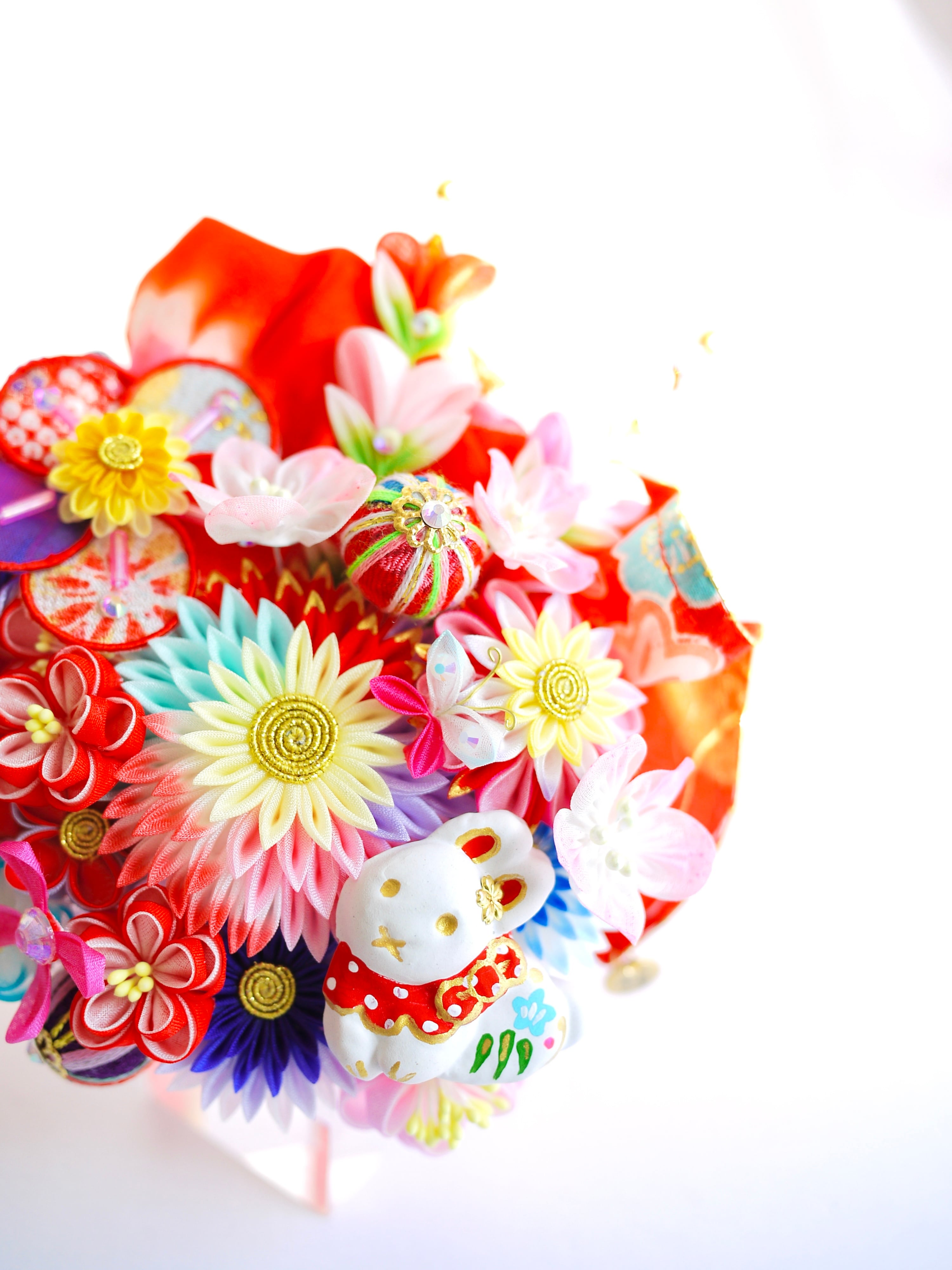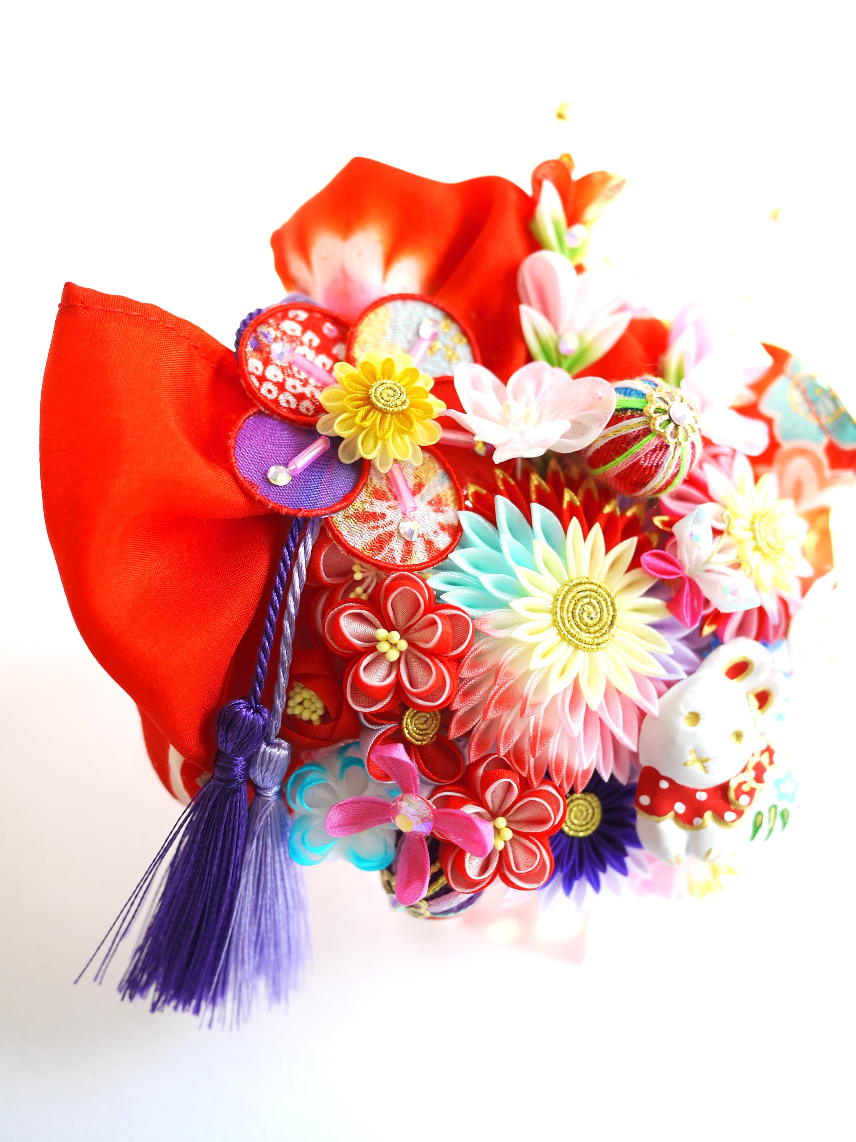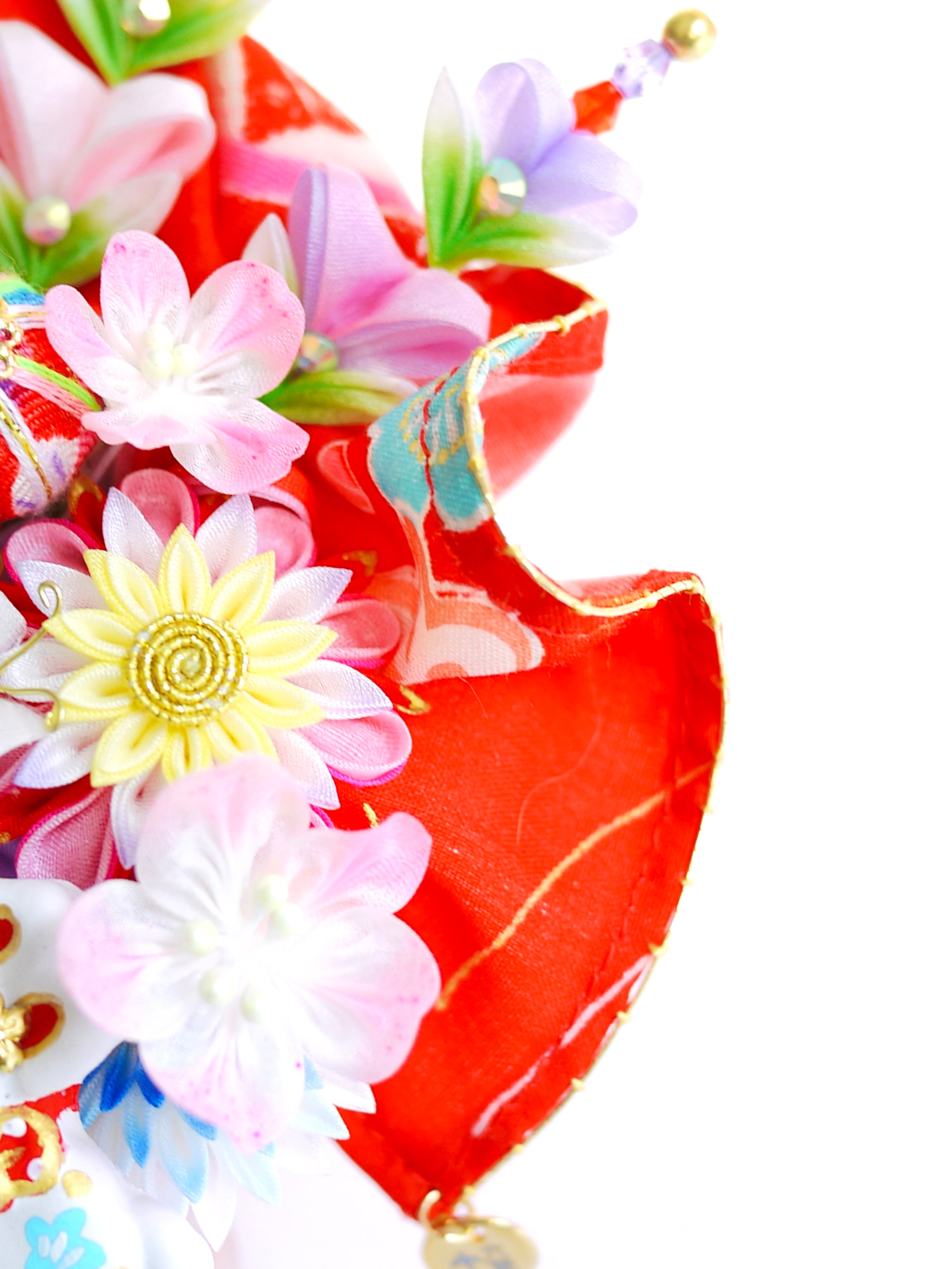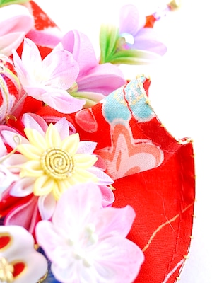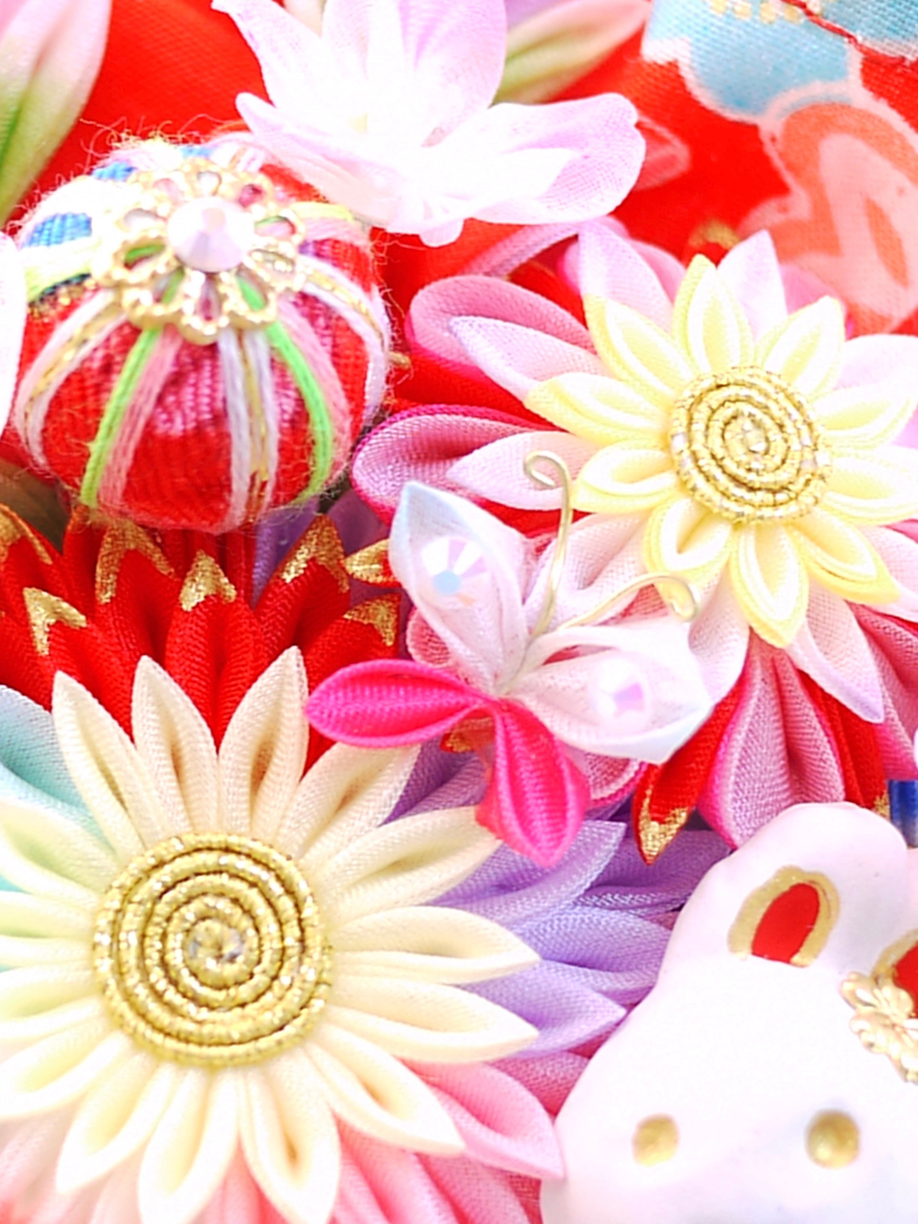 チューリップみたいなつまみピックや縁貼り仕立てのお花が重なり合って玉手箱のような賑やかな華やかさです