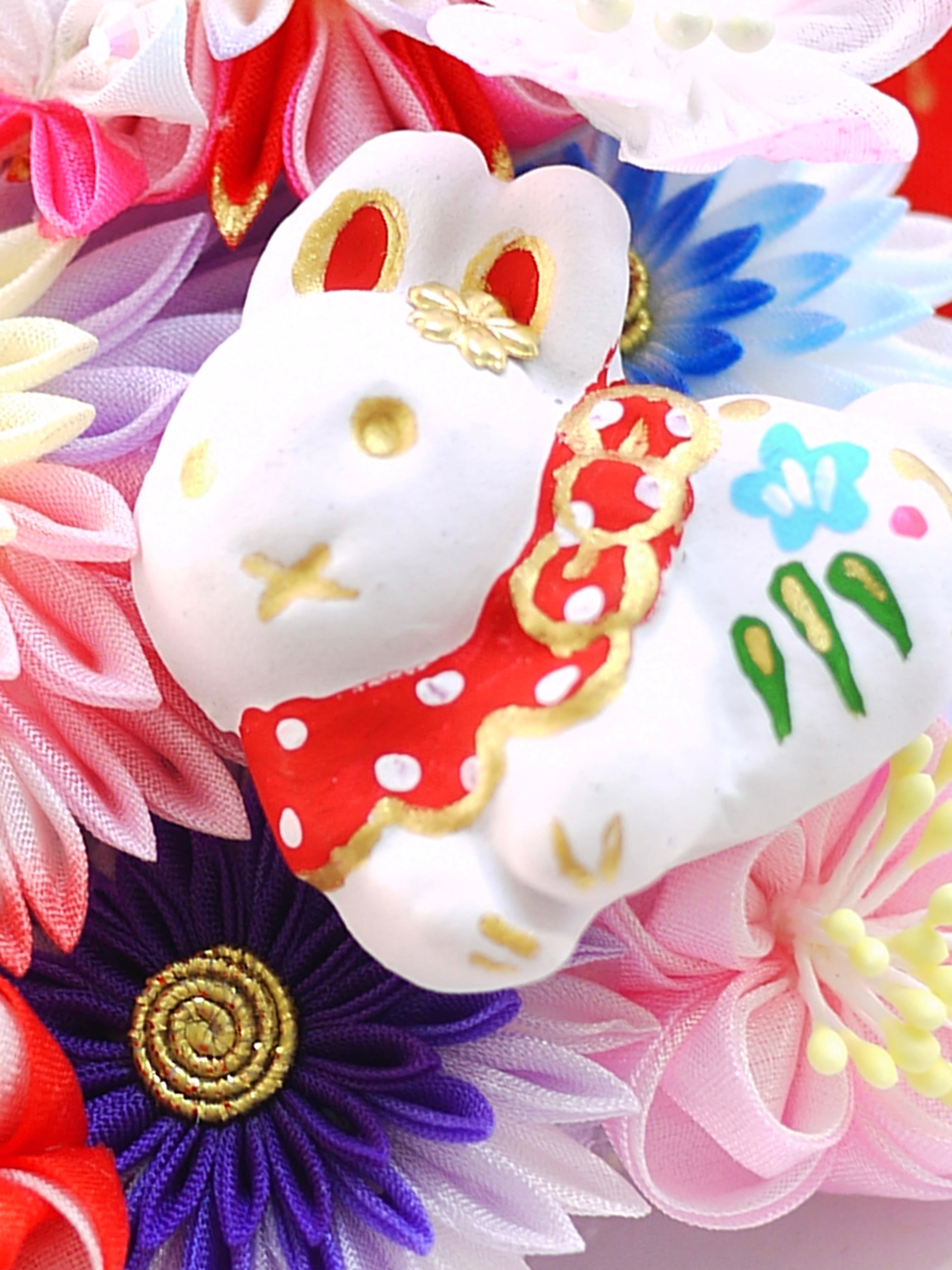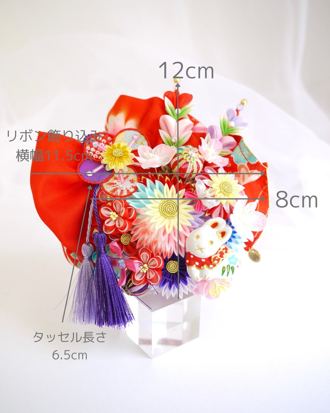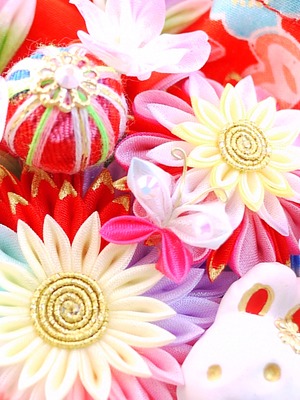 つまみ細工は専用の糊のみで制作しております、水に濡れると糊が溶けて型崩れしたり、正絹地が変形・変色する原因になることがございます。 雨や水濡れ・湿気には十分お気をつけください。 濃色のものは特に色移りする場合がございます
