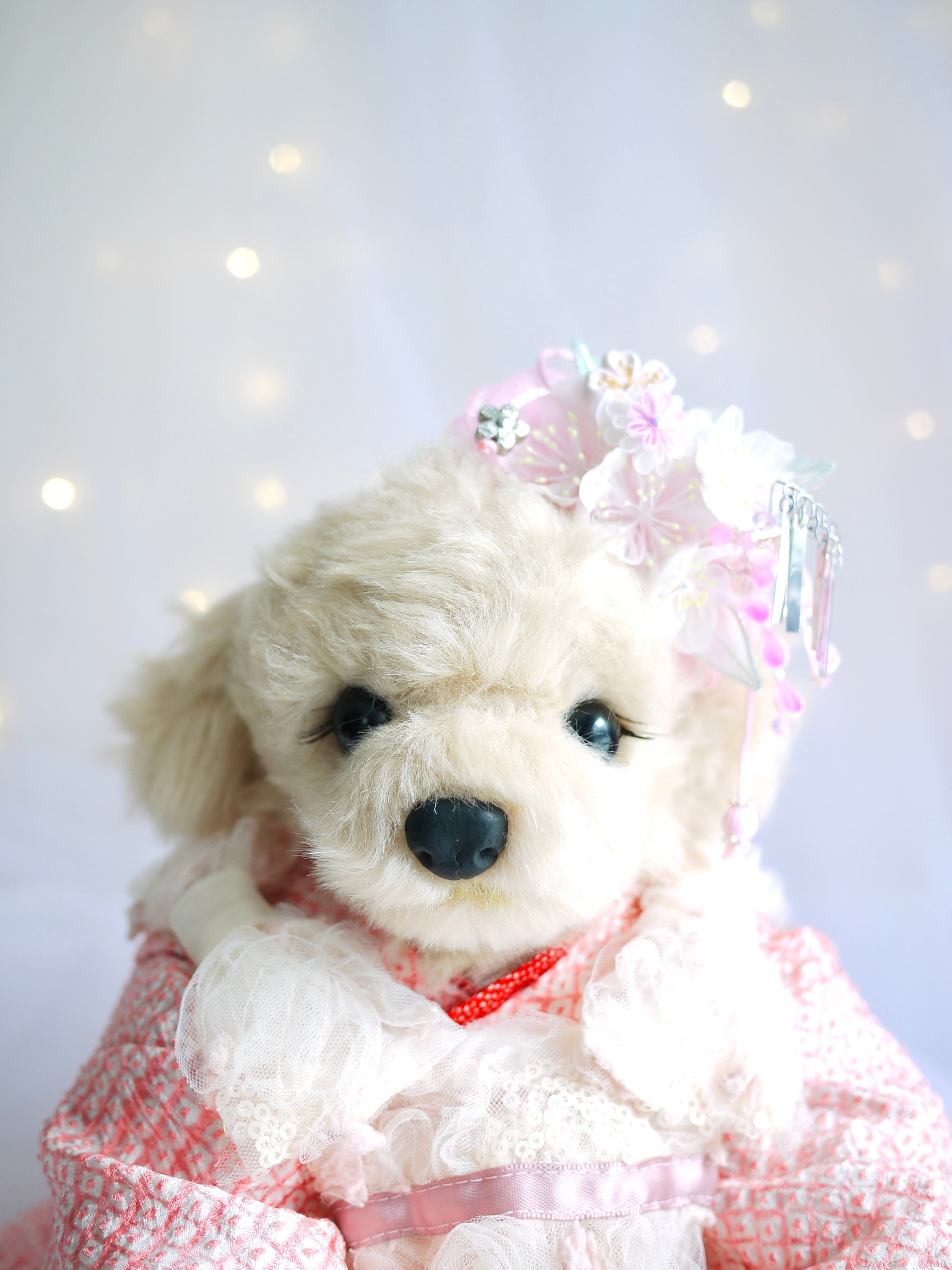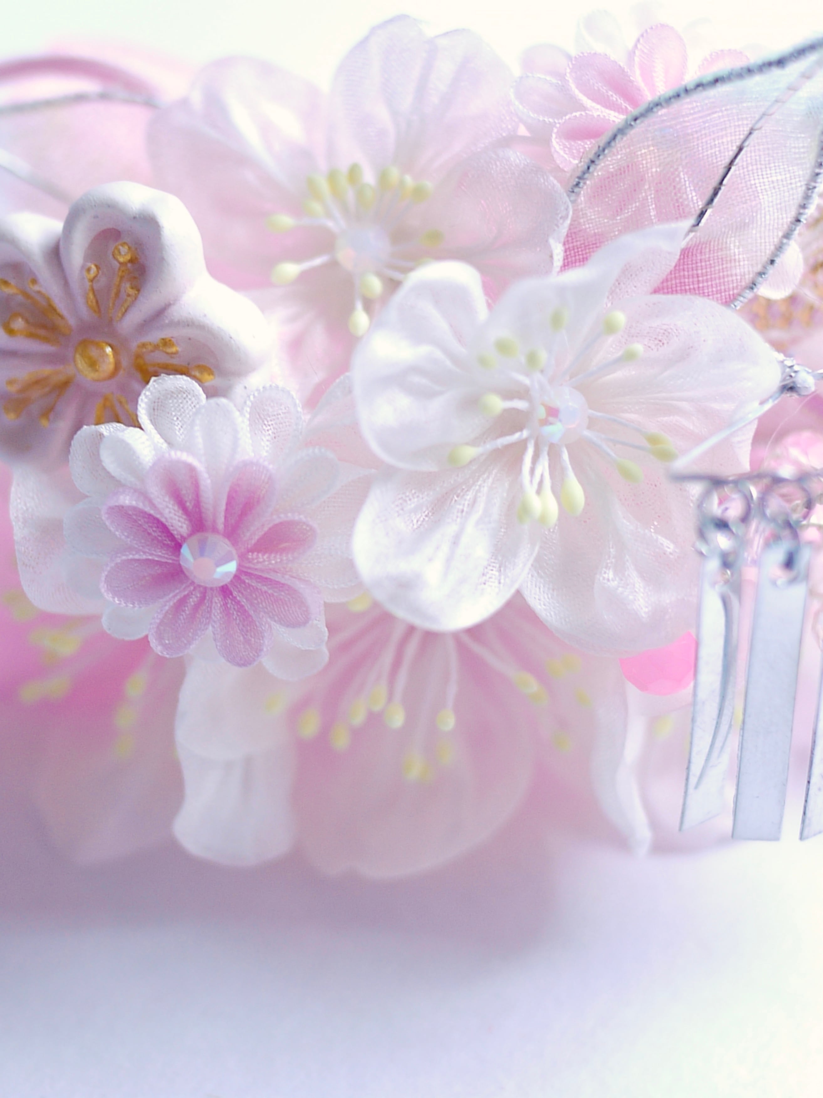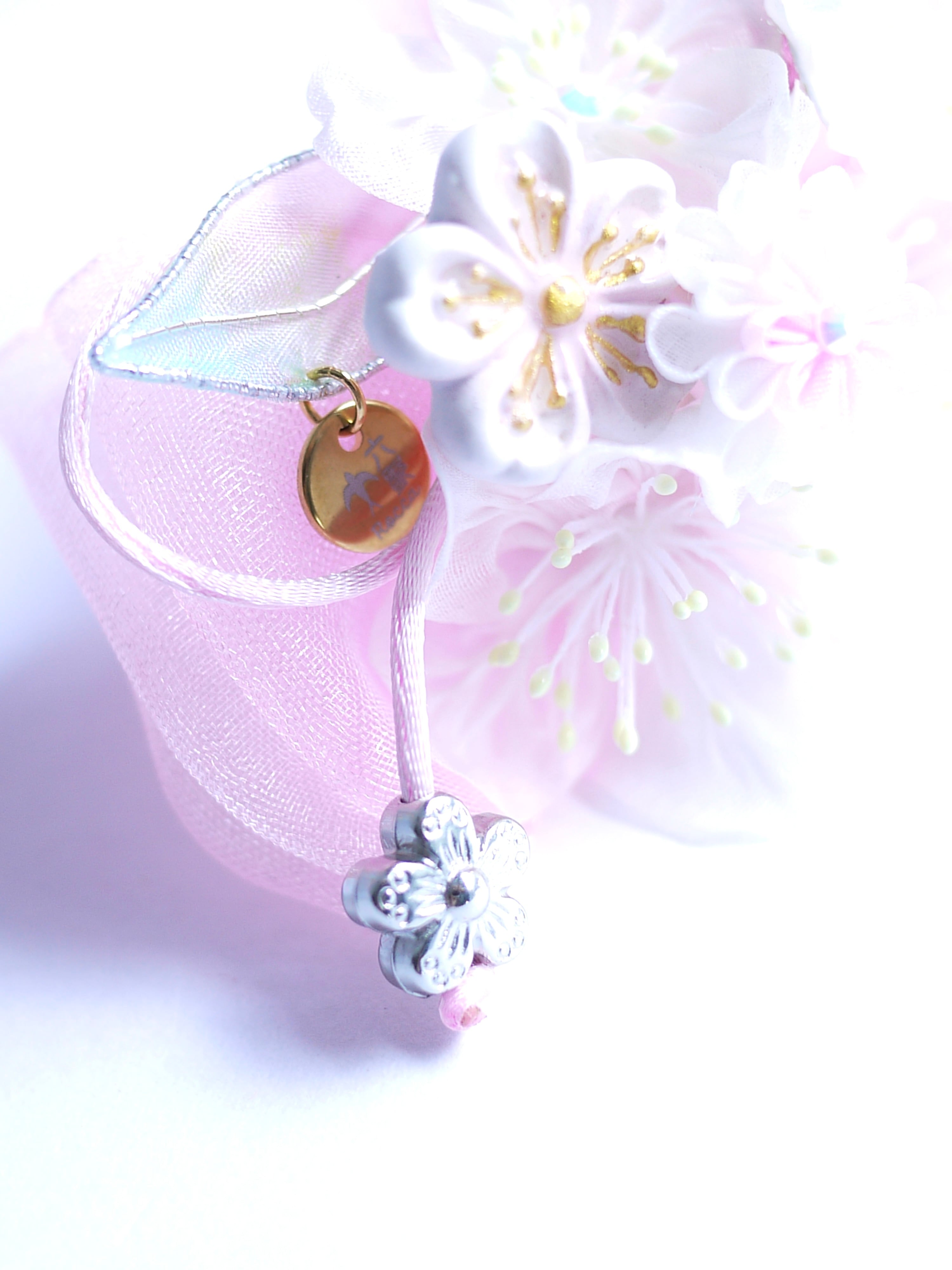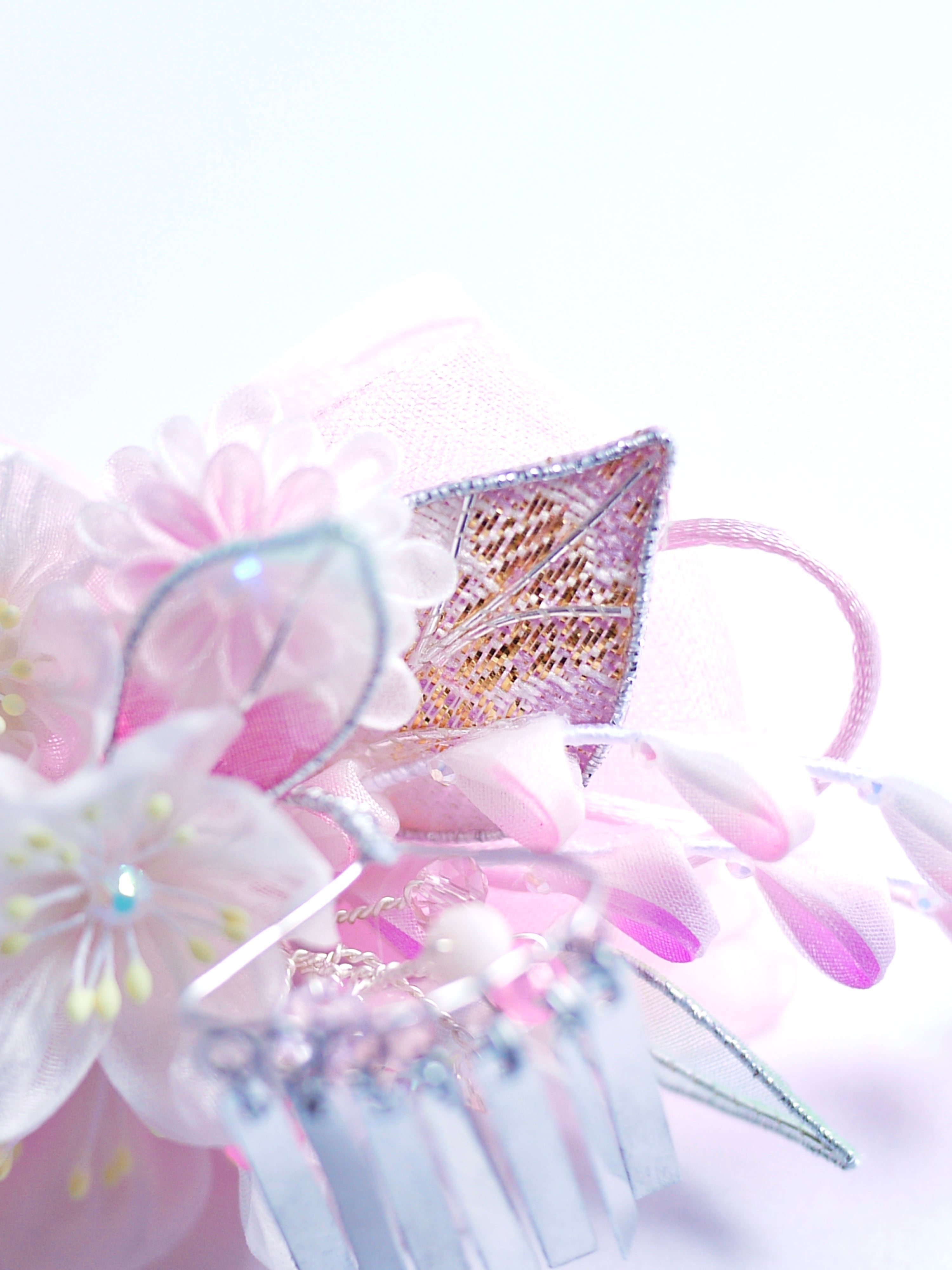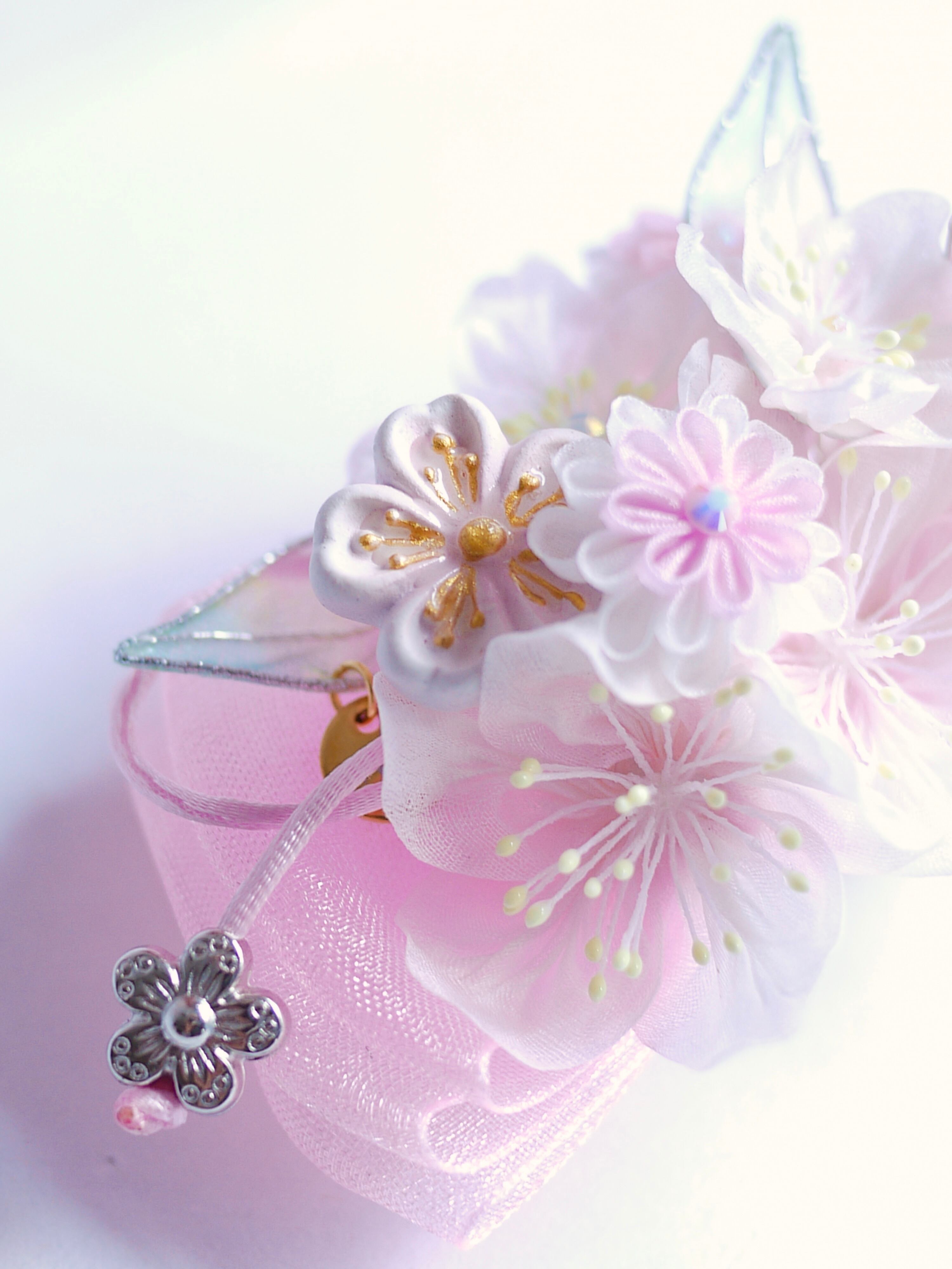 つまみ細工は専用の糊のみで制作しております、水に濡れると糊が溶けて型崩れしたり、正絹地が変形・変色する原因になることがございます。 雨や水濡れ・湿気には十分お気をつけください。 濃色のものは特に色移りする場合がございます