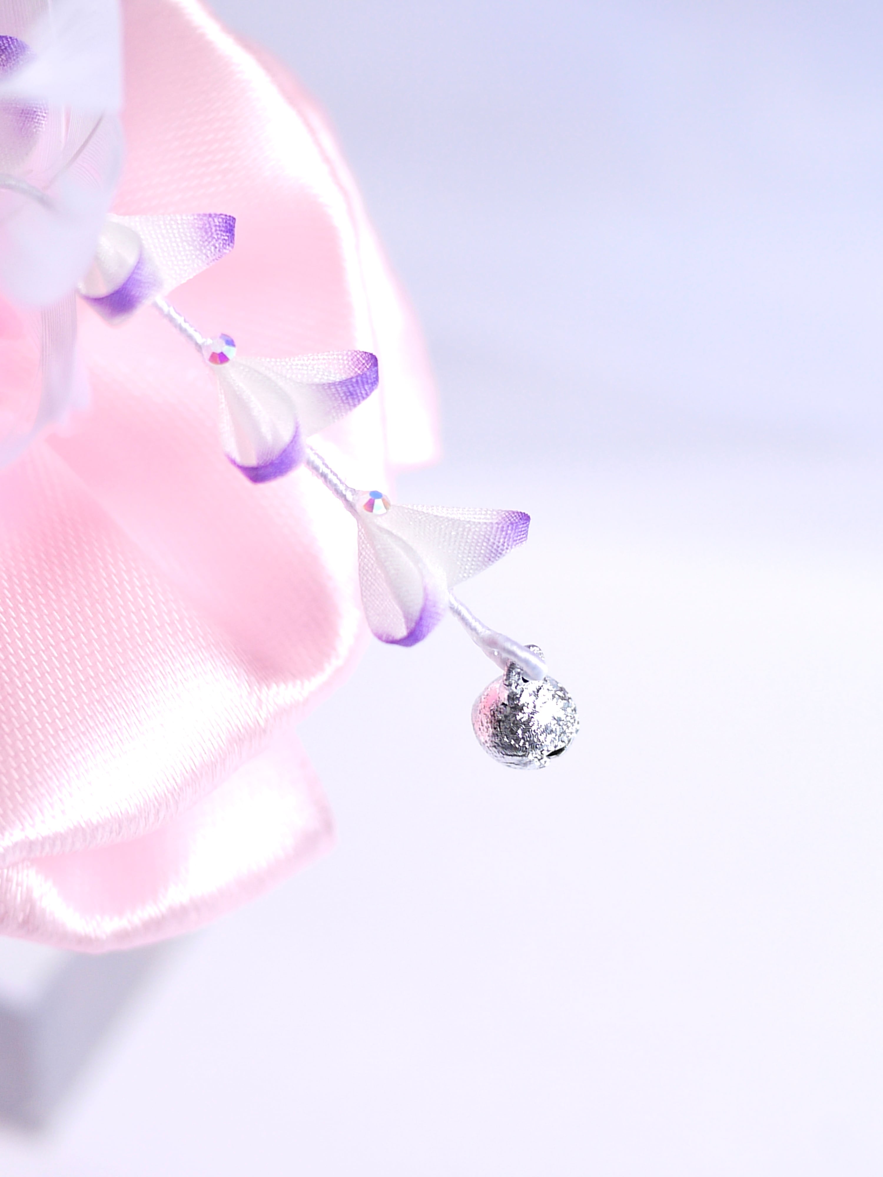 つまみ細工は専用の糊のみで制作しております、水に濡れると糊が溶けて型崩れしたり、正絹地が変形・変色する原因になることがございます。 雨や水濡れ・湿気には十分お気をつけください。 濃色のものは特に色移りする場合がございます