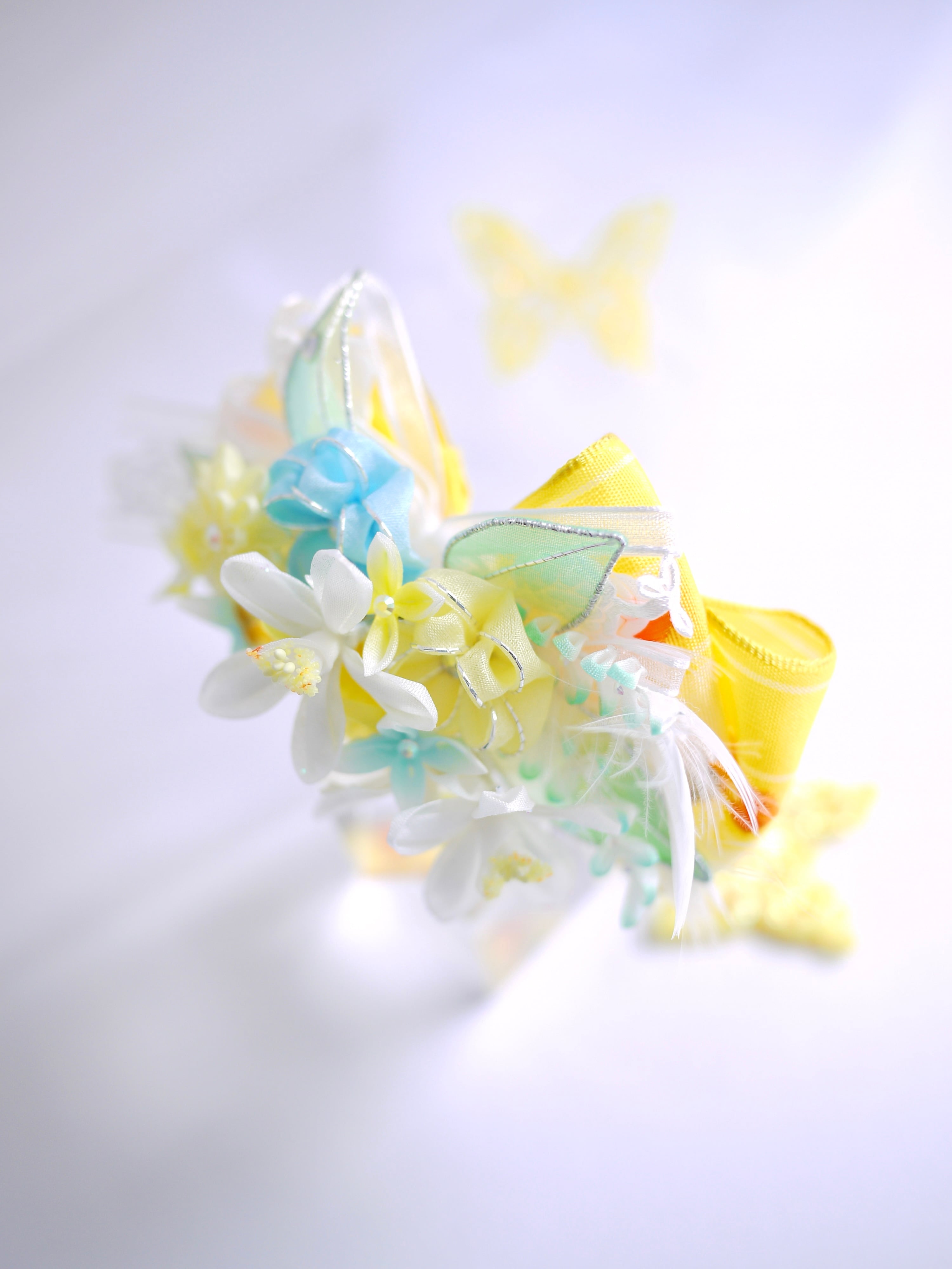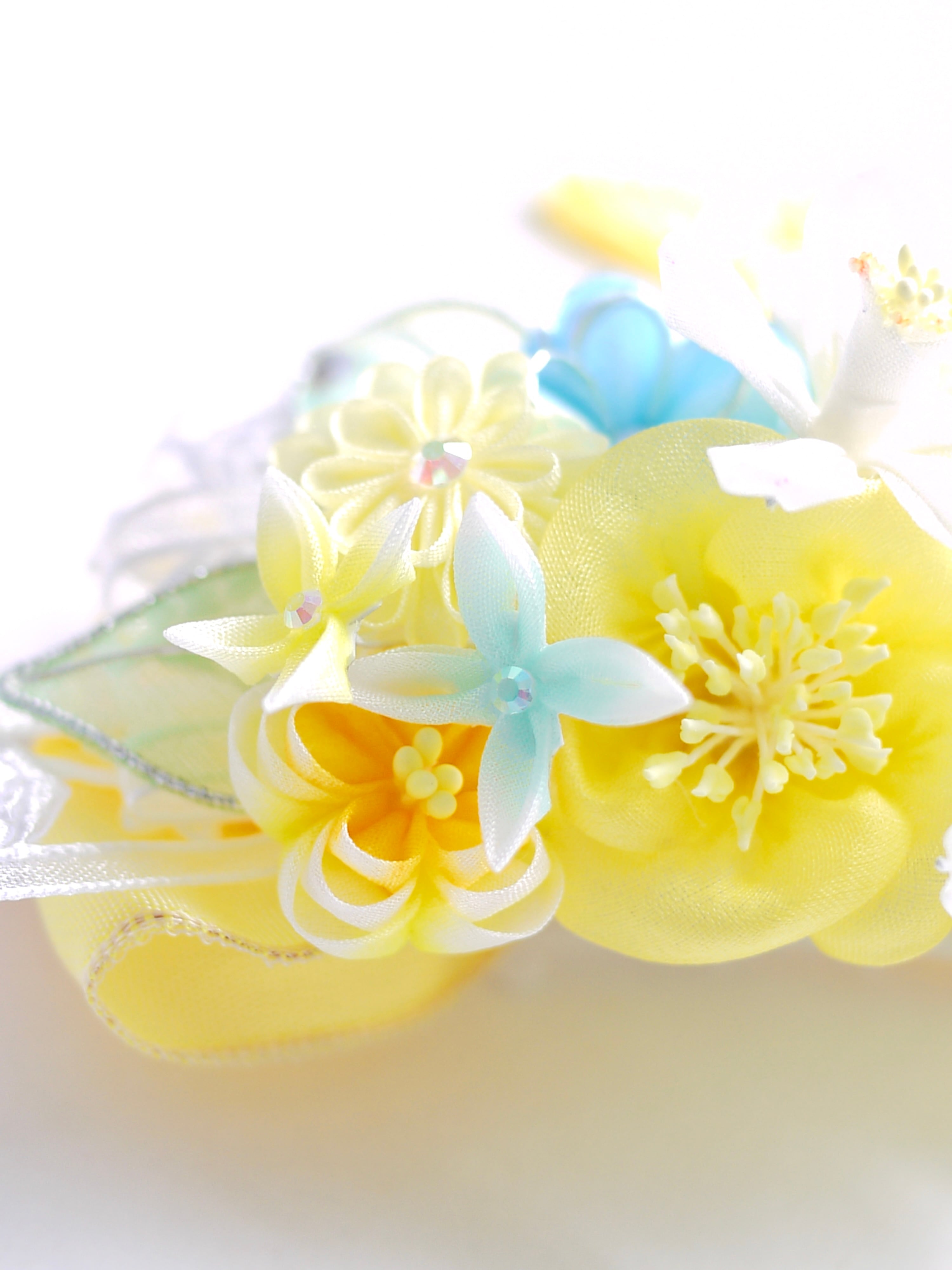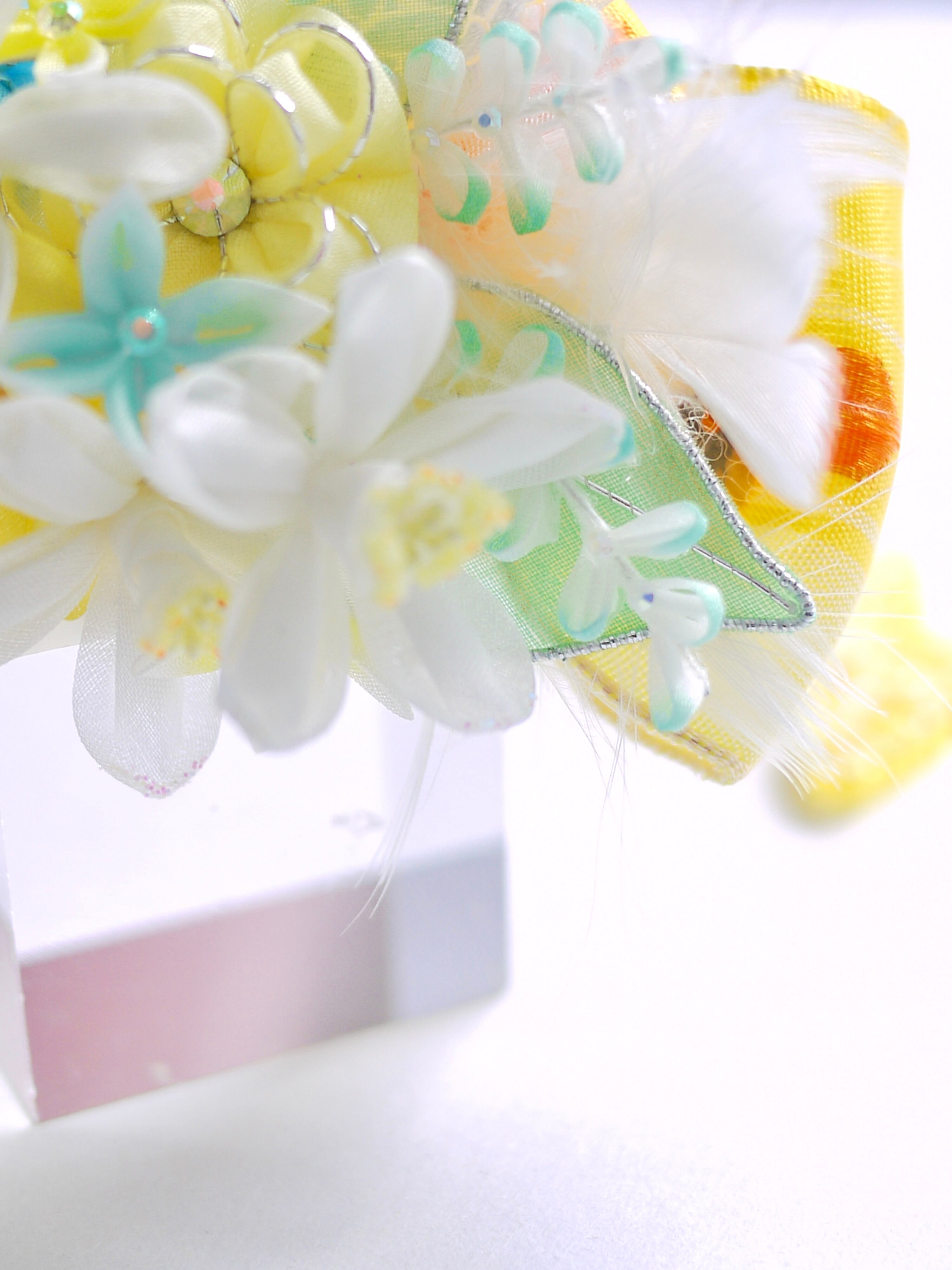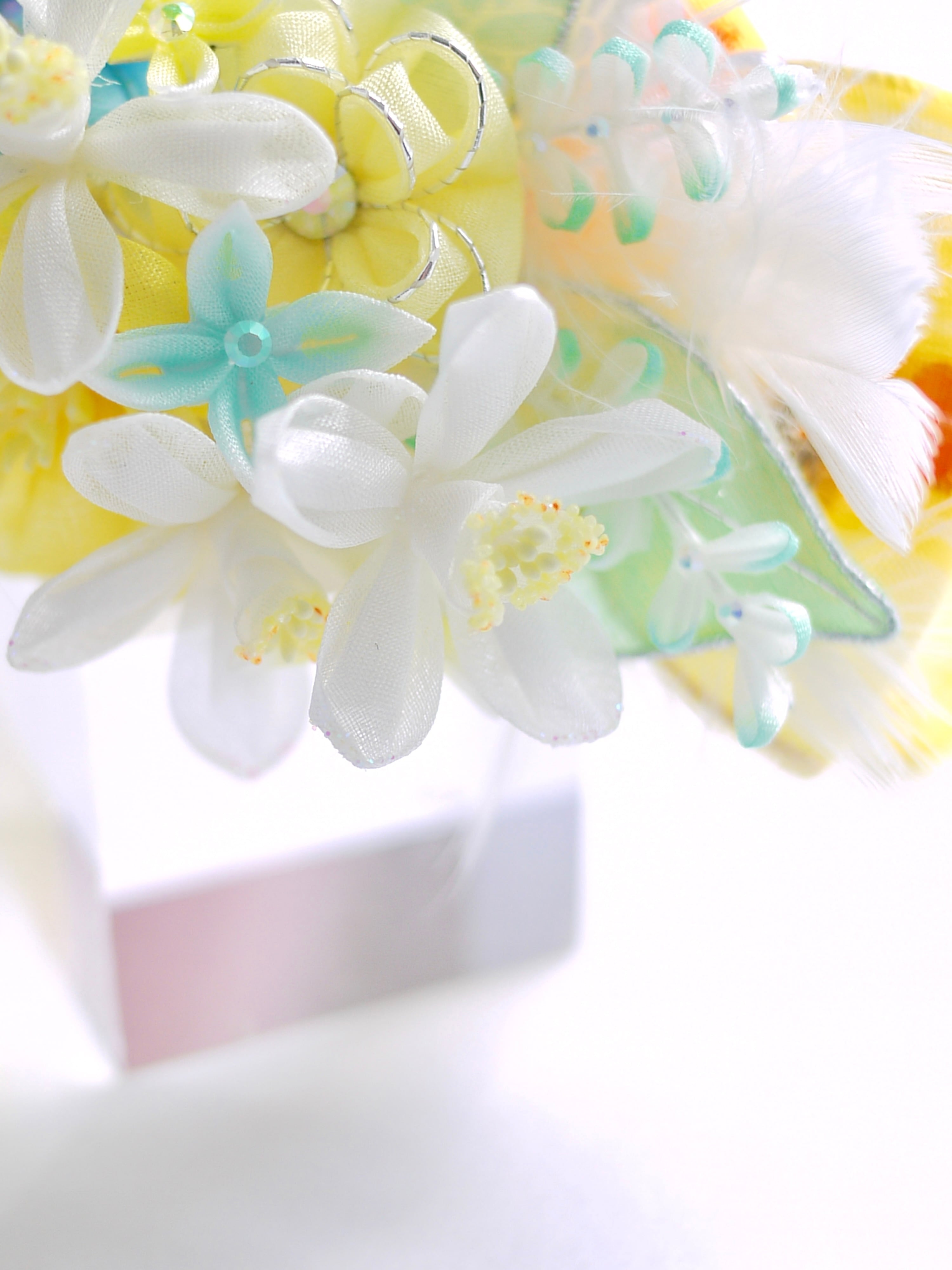 以前制作した『琴菊』にも使用したイエローのフレンチリボンをあしらって今回は春らしい清涼イメージです、ミモザの季節の撮影にも可愛らしいのではないでしょうか