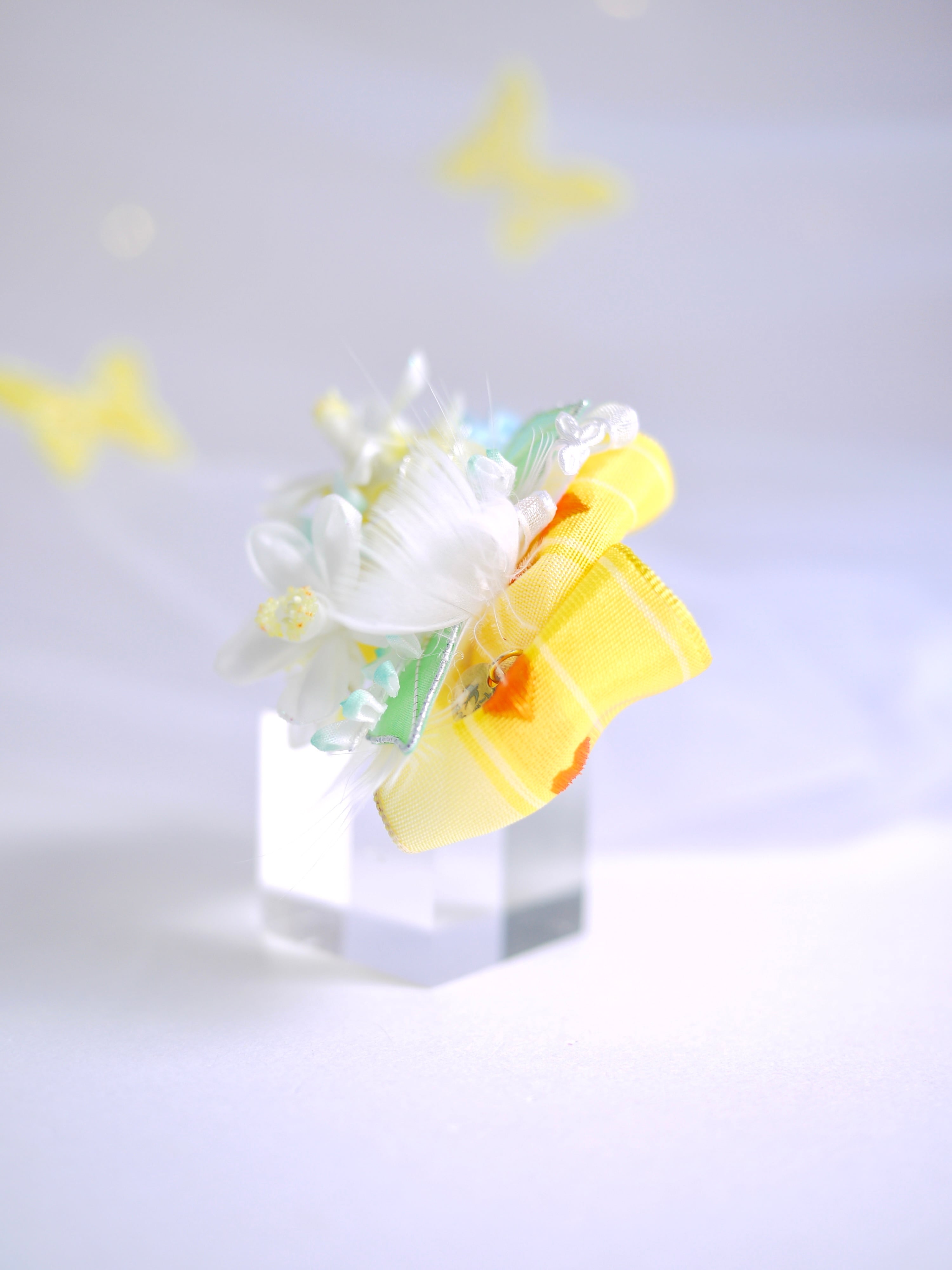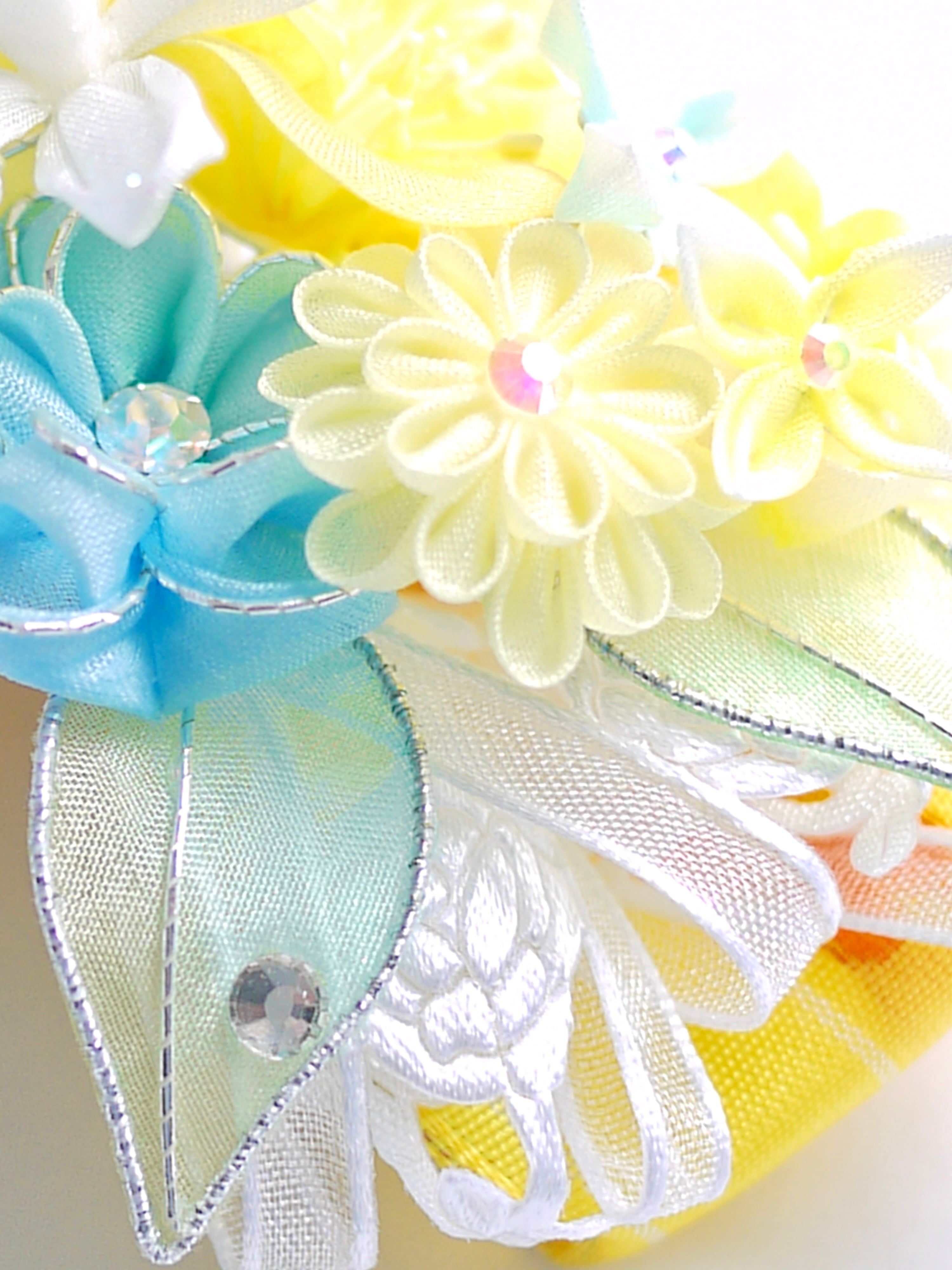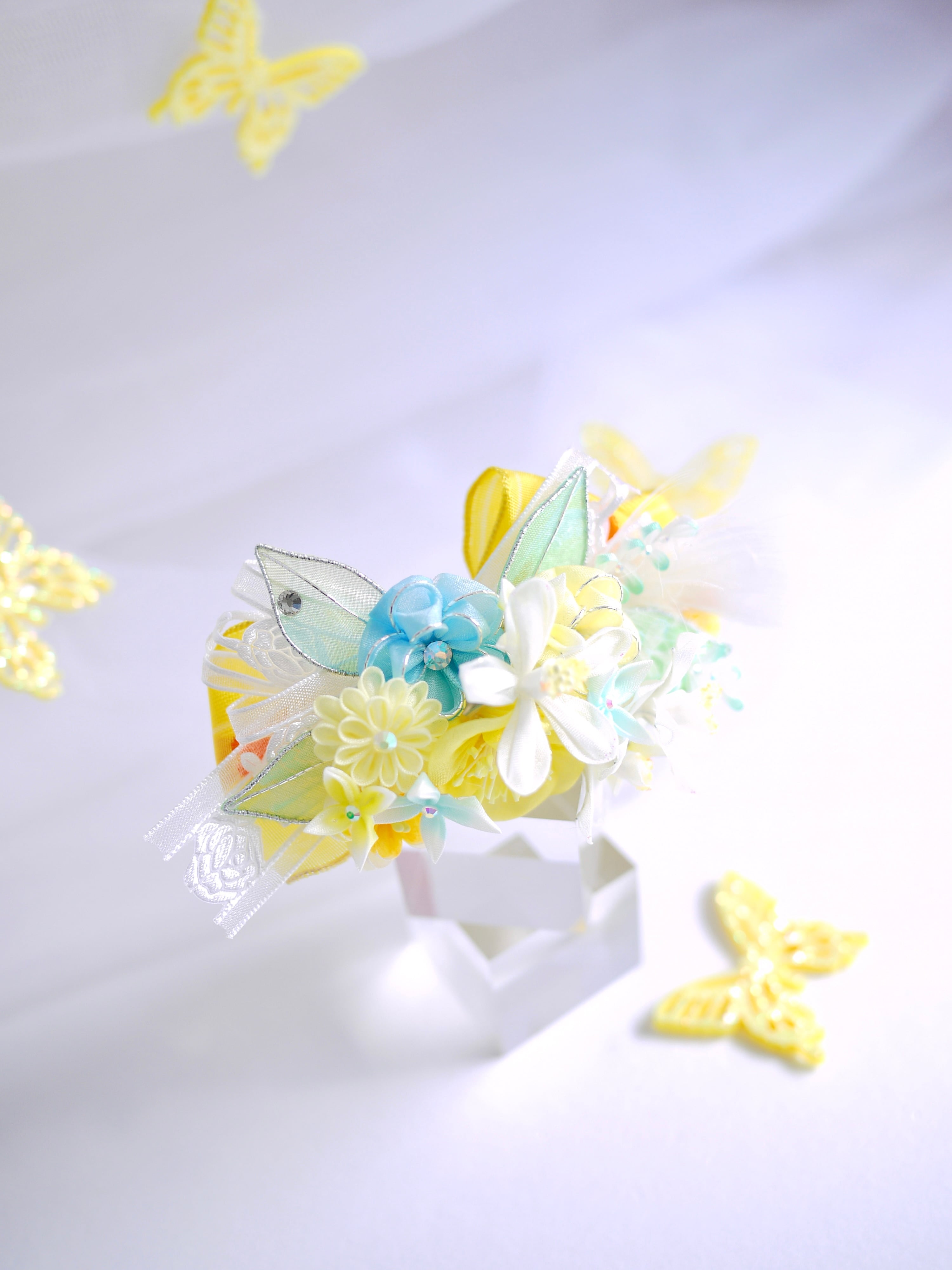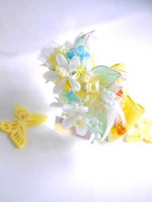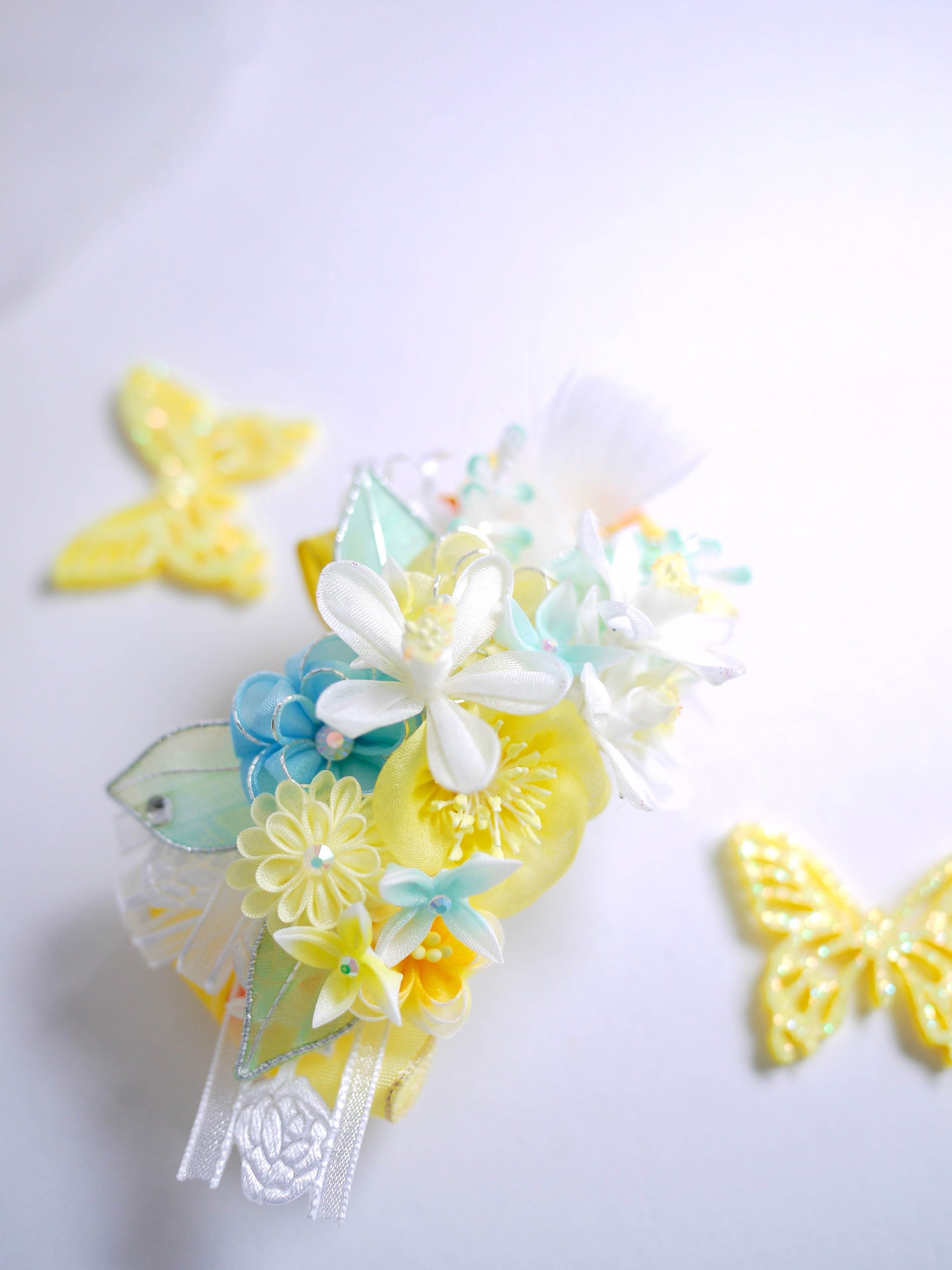 以前制作した『琴菊』にも使用したイエローのフレンチリボンをあしらって今回は春らしい清涼イメージです、ミモザの季節の撮影にも可愛らしいのではないでしょうか