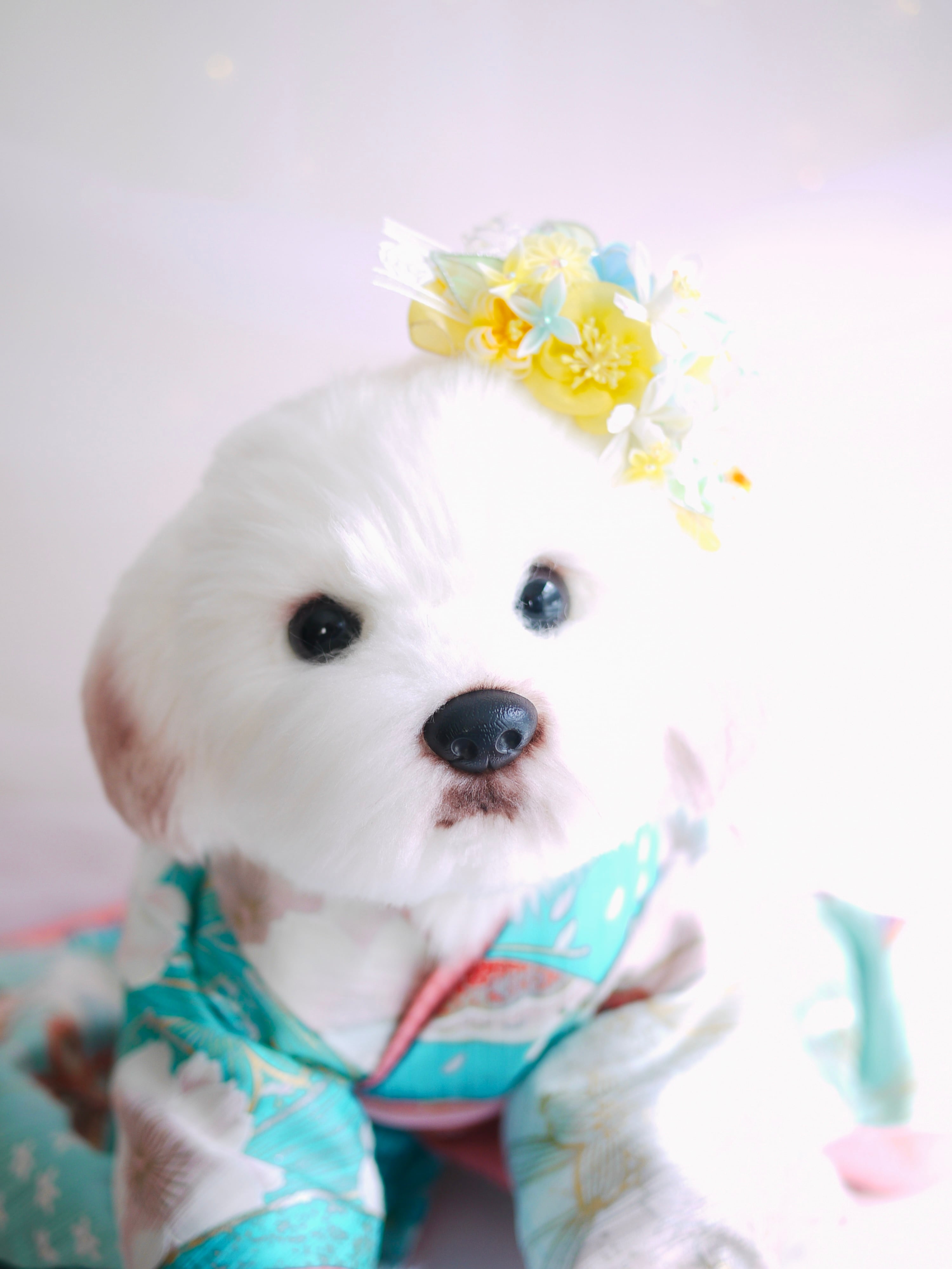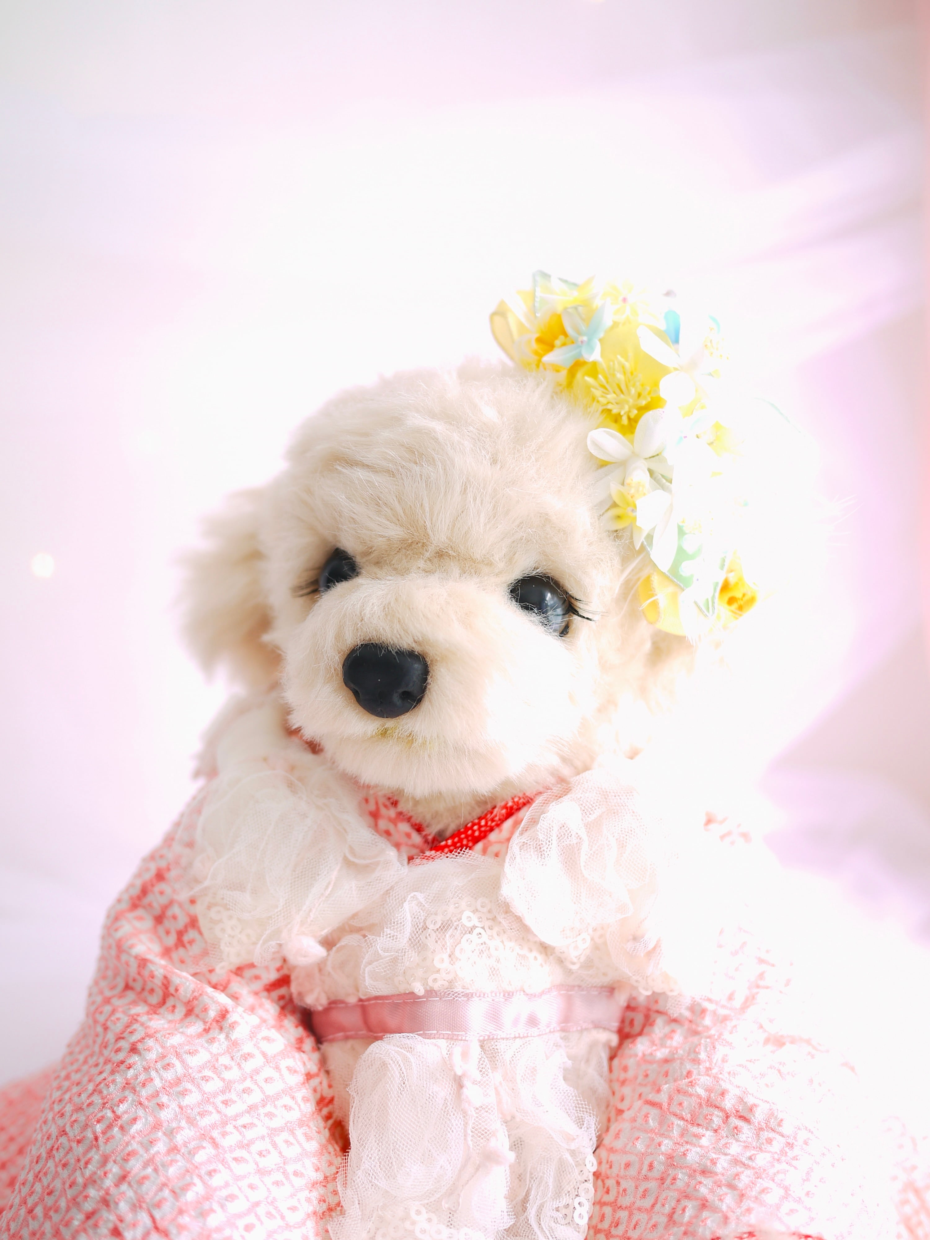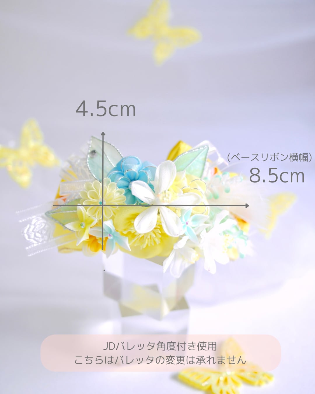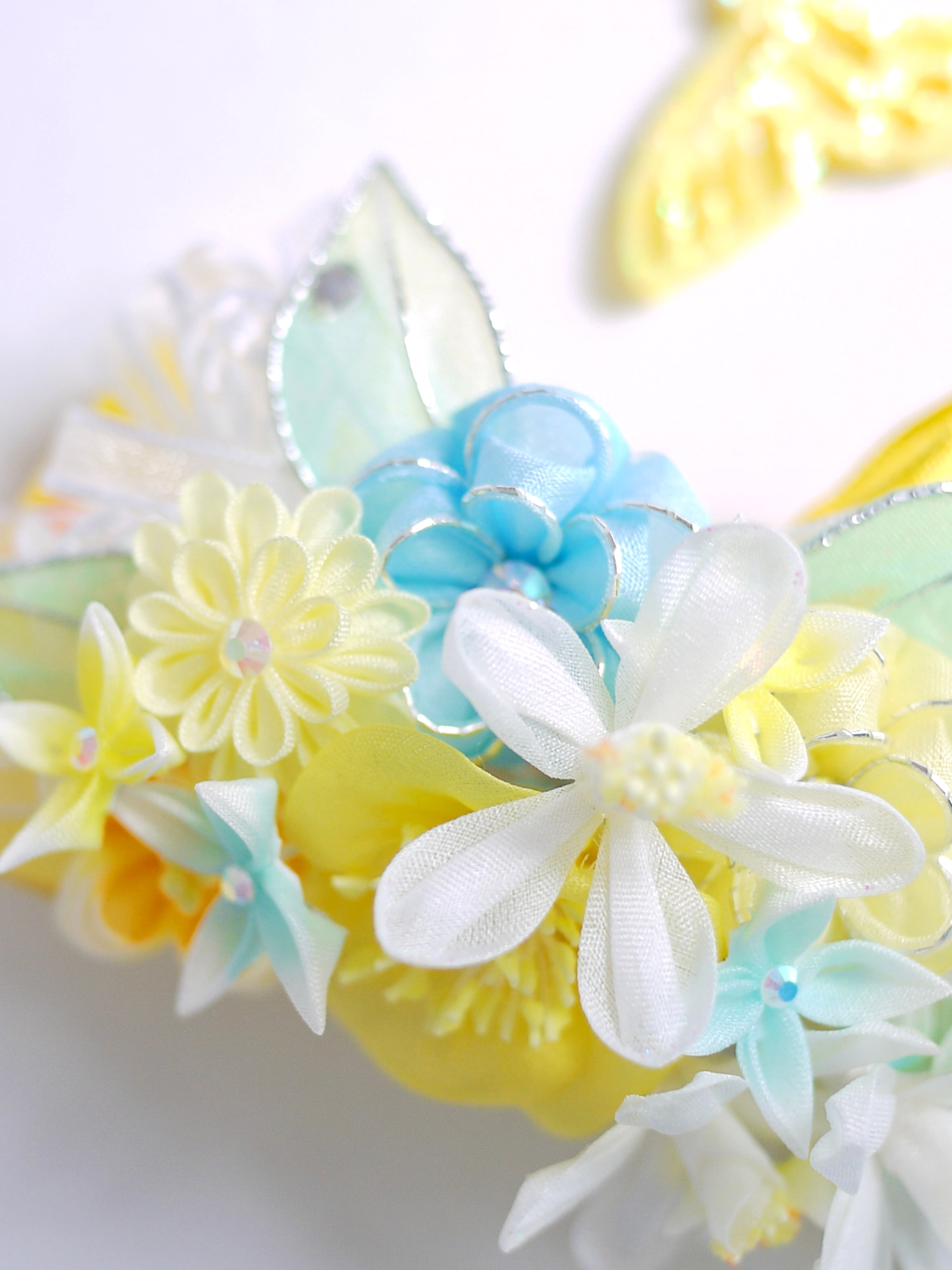 以前制作した『琴菊』にも使用したイエローのフレンチリボンをあしらって今回は春らしい清涼イメージです、ミモザの季節の撮影にも可愛らしいのではないでしょうか