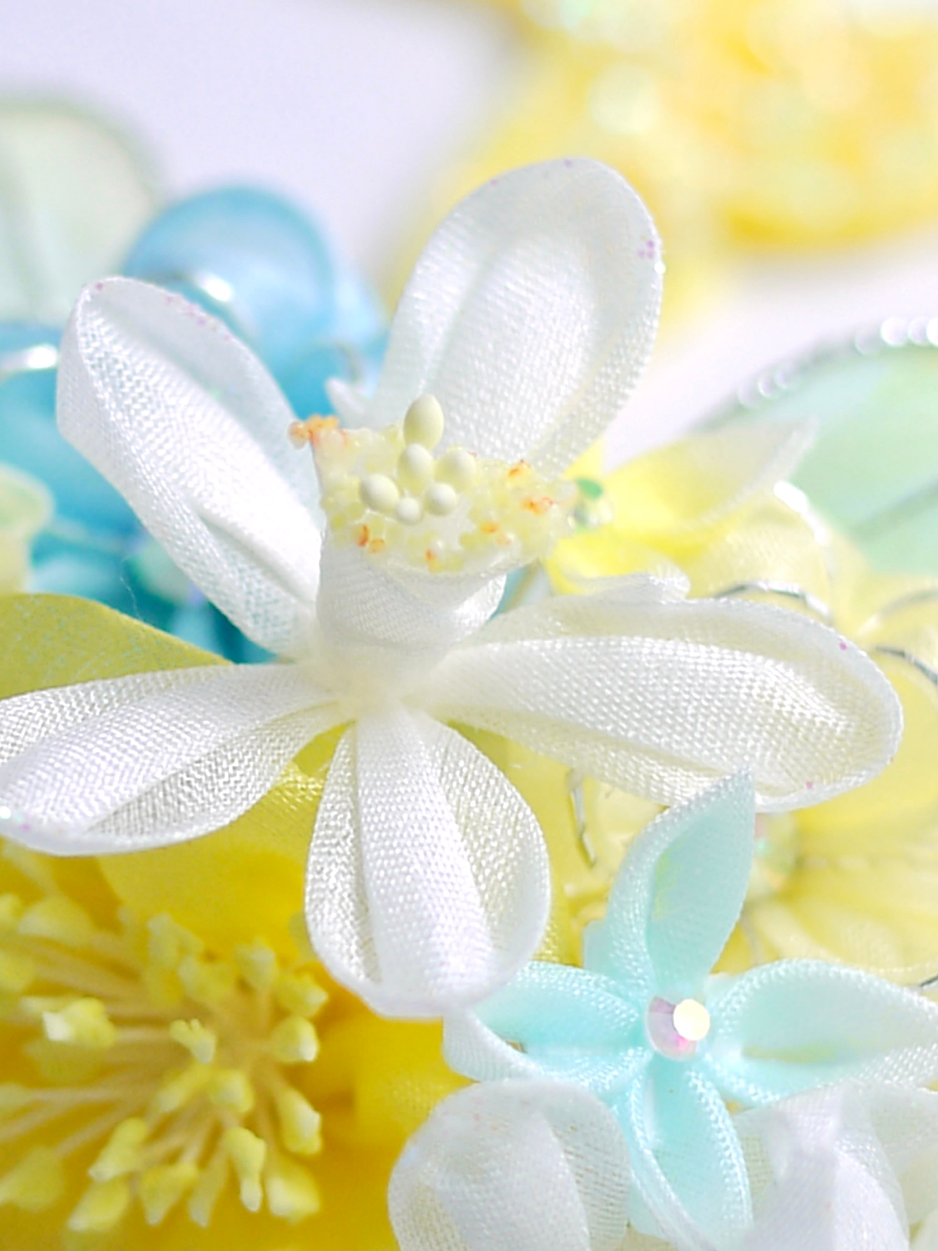 つまみ細工は専用の糊のみで制作しております、水に濡れると糊が溶けて型崩れしたり、正絹地が変形・変色する原因になることがございます。 雨や水濡れ・湿気には十分お気をつけください。 濃色のものは特に色移りする場合がございます