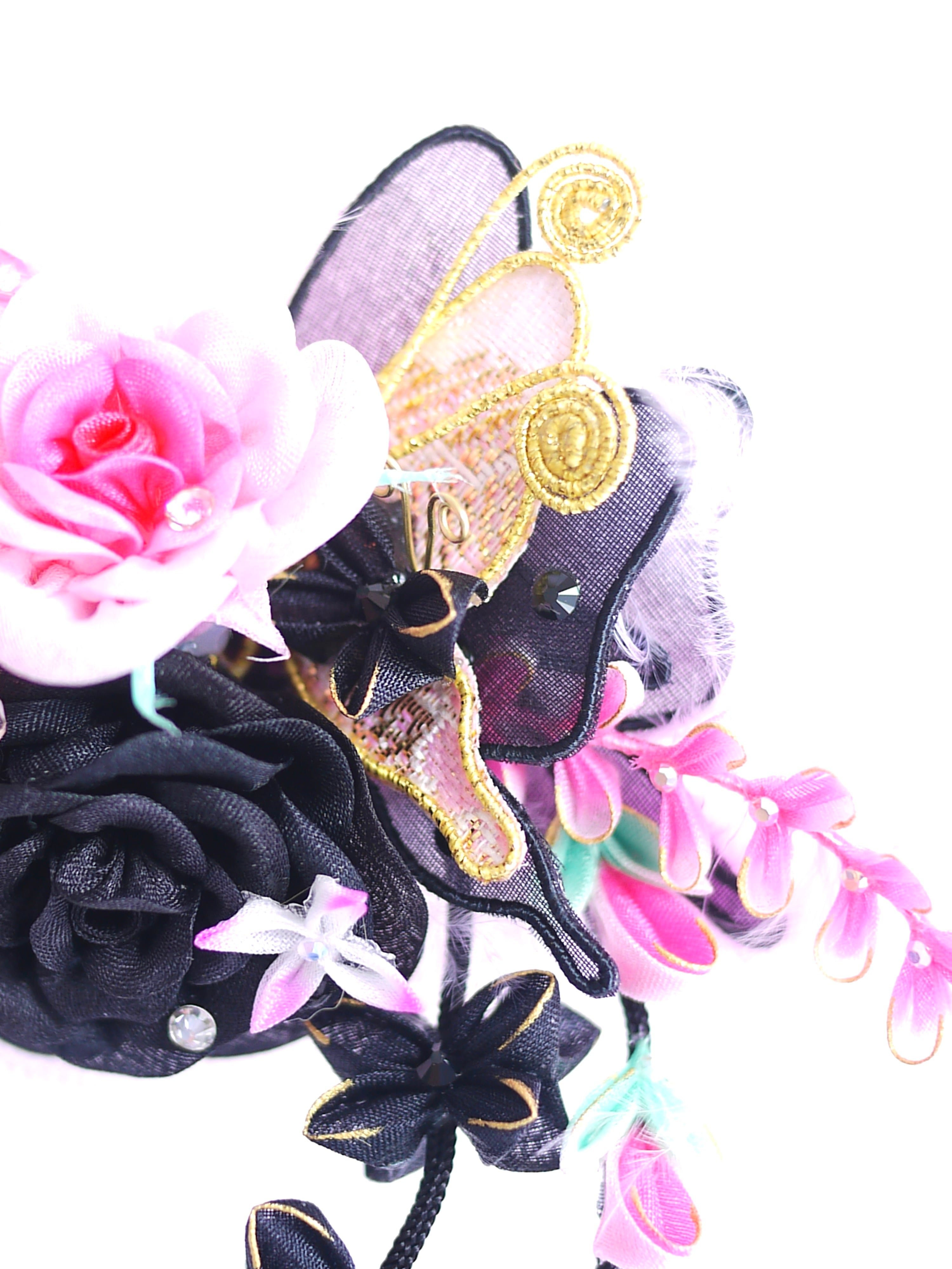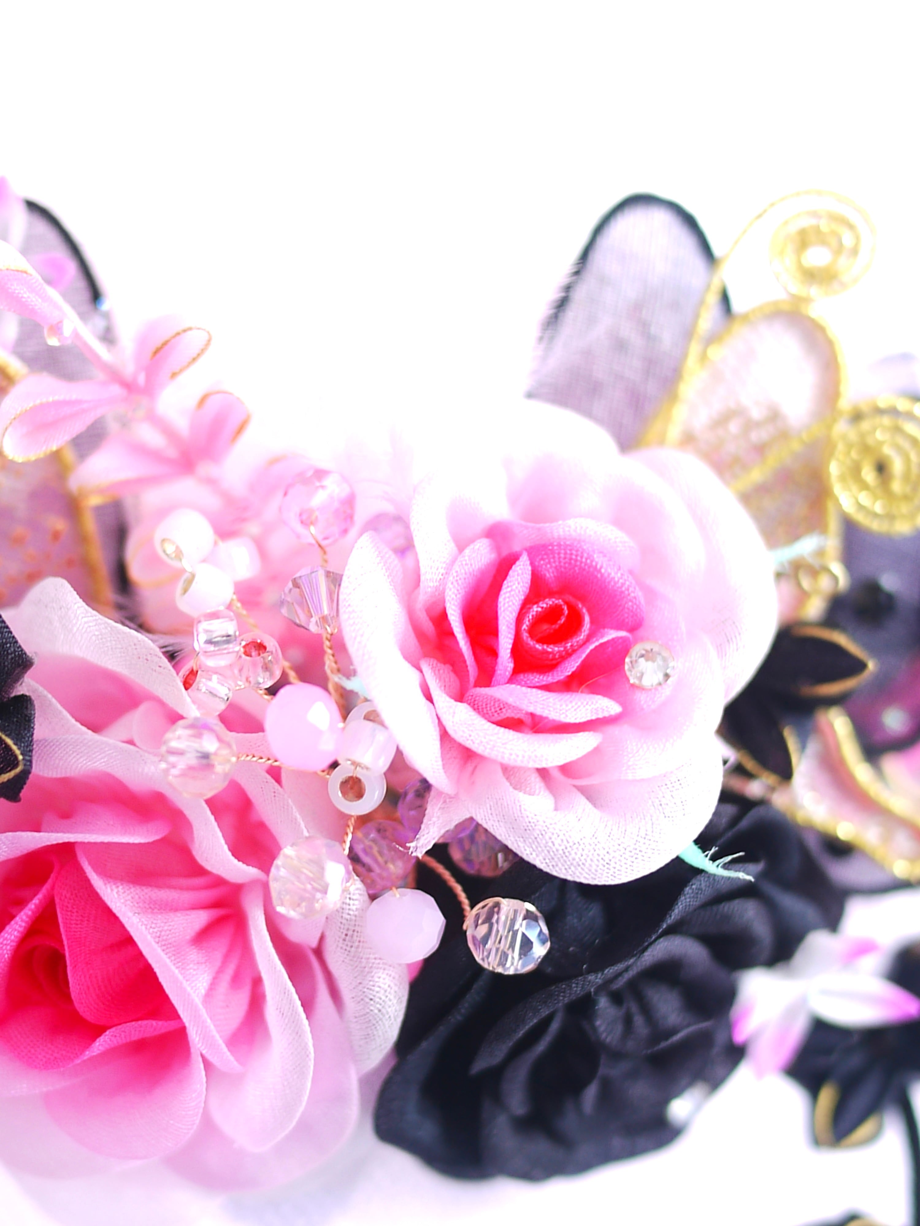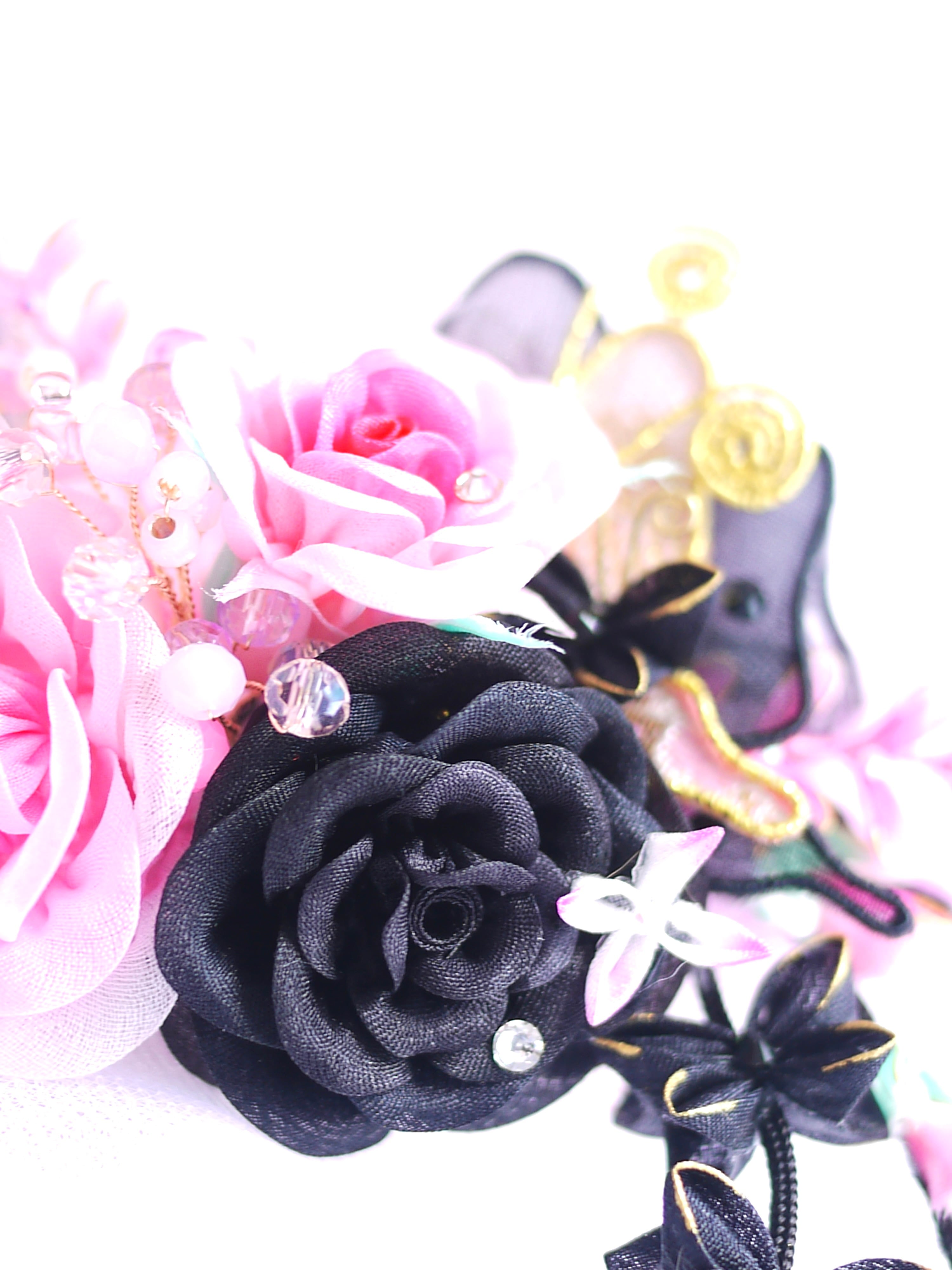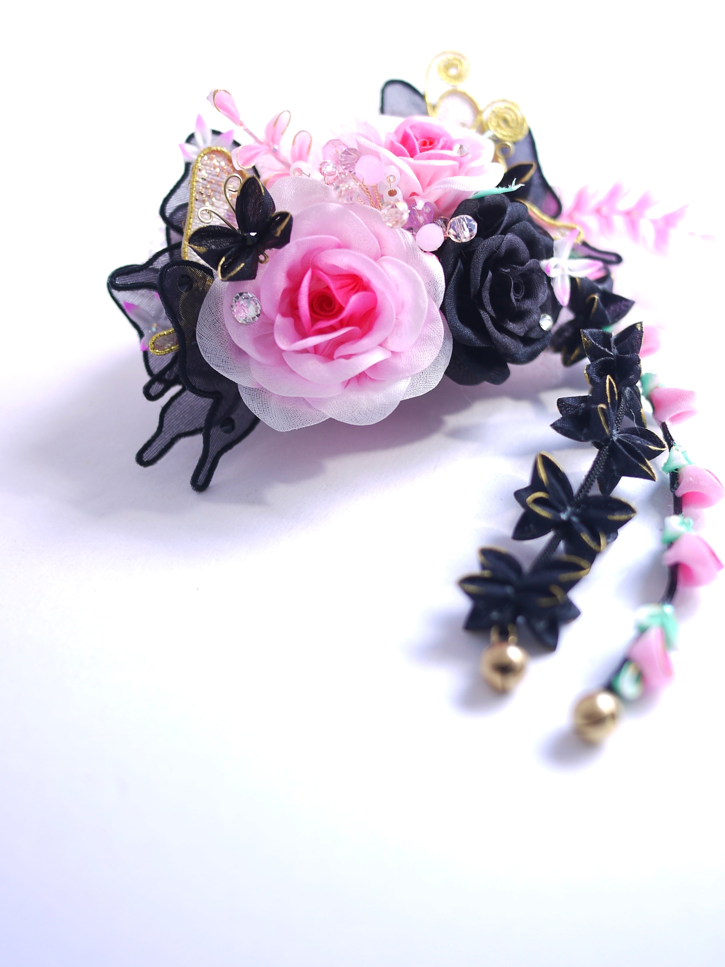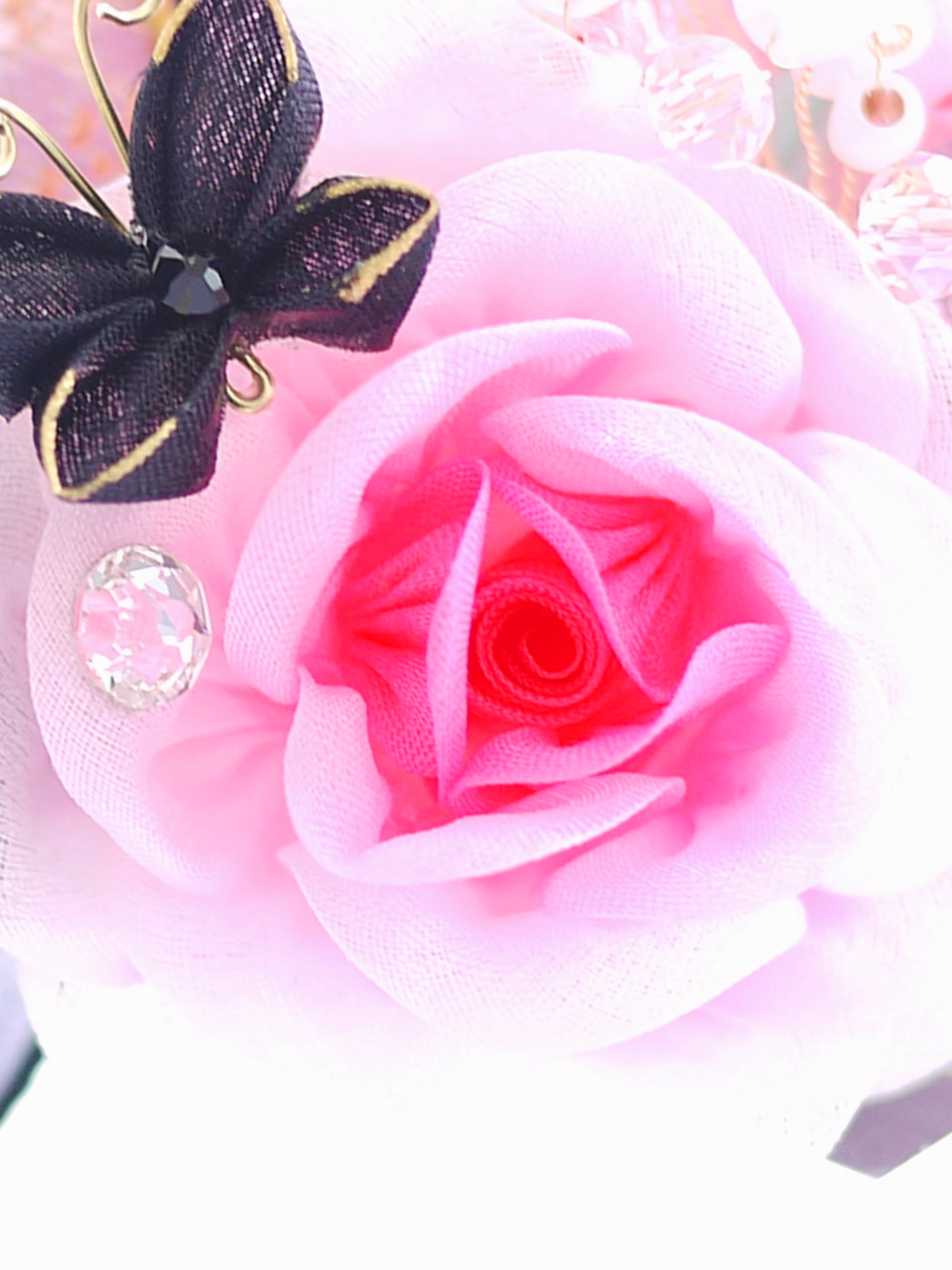 しなやかで透明感のある花びらと空気をはらんでふっくら咲く薔薇に極薄シルクで作った黒アゲハ蝶が舞い群れる小悪魔花かんざしです