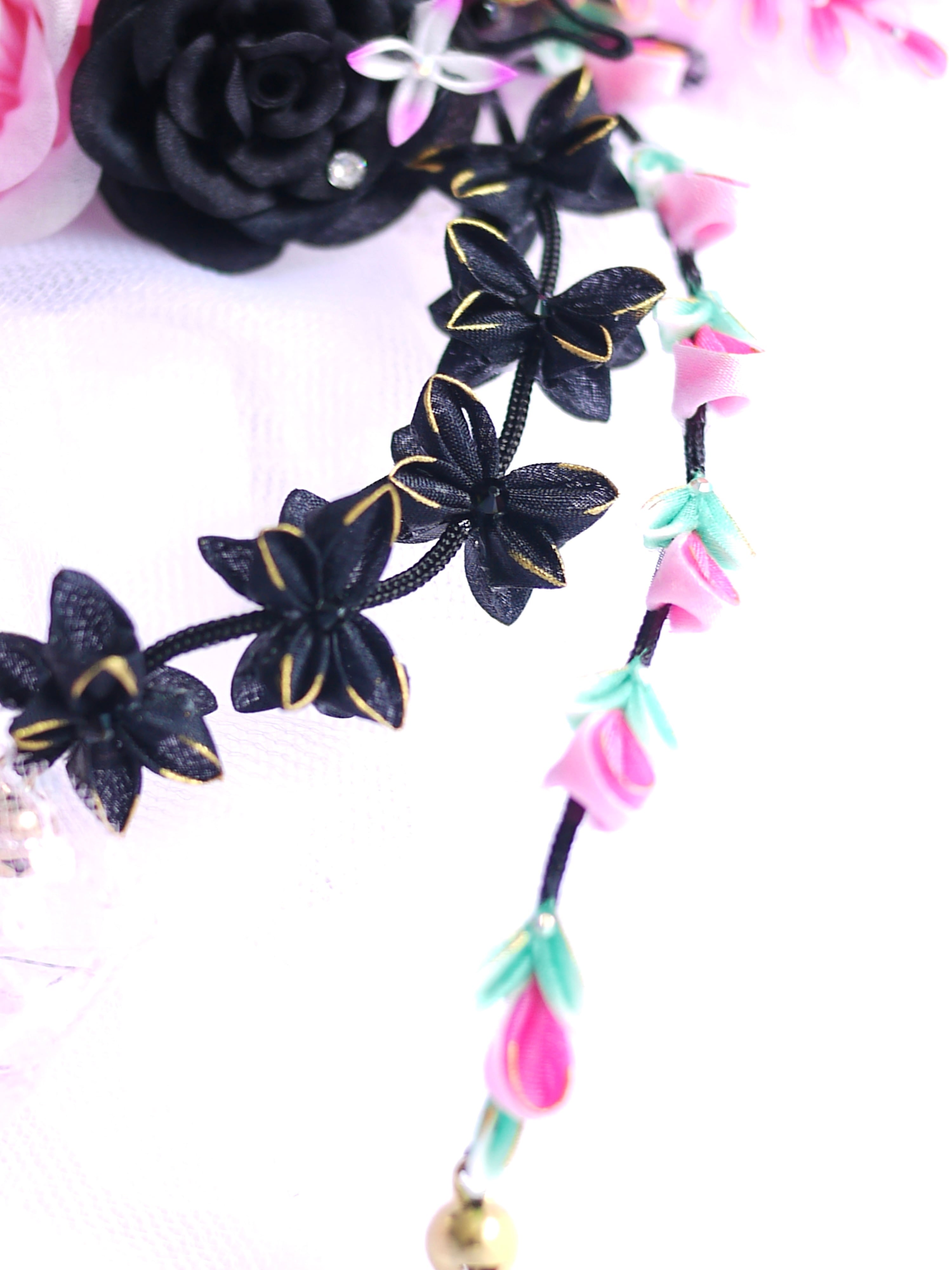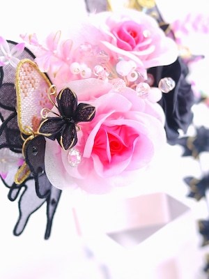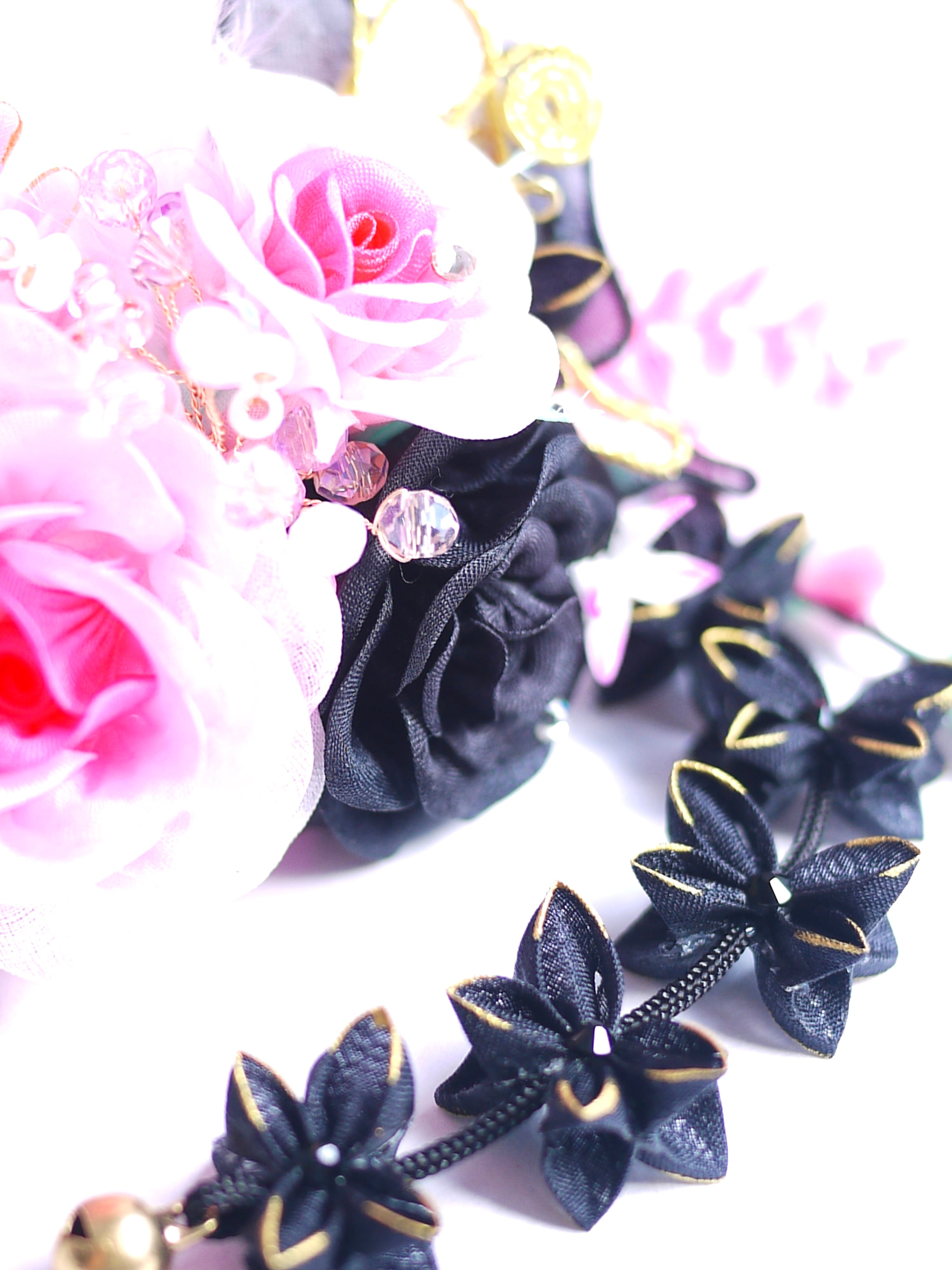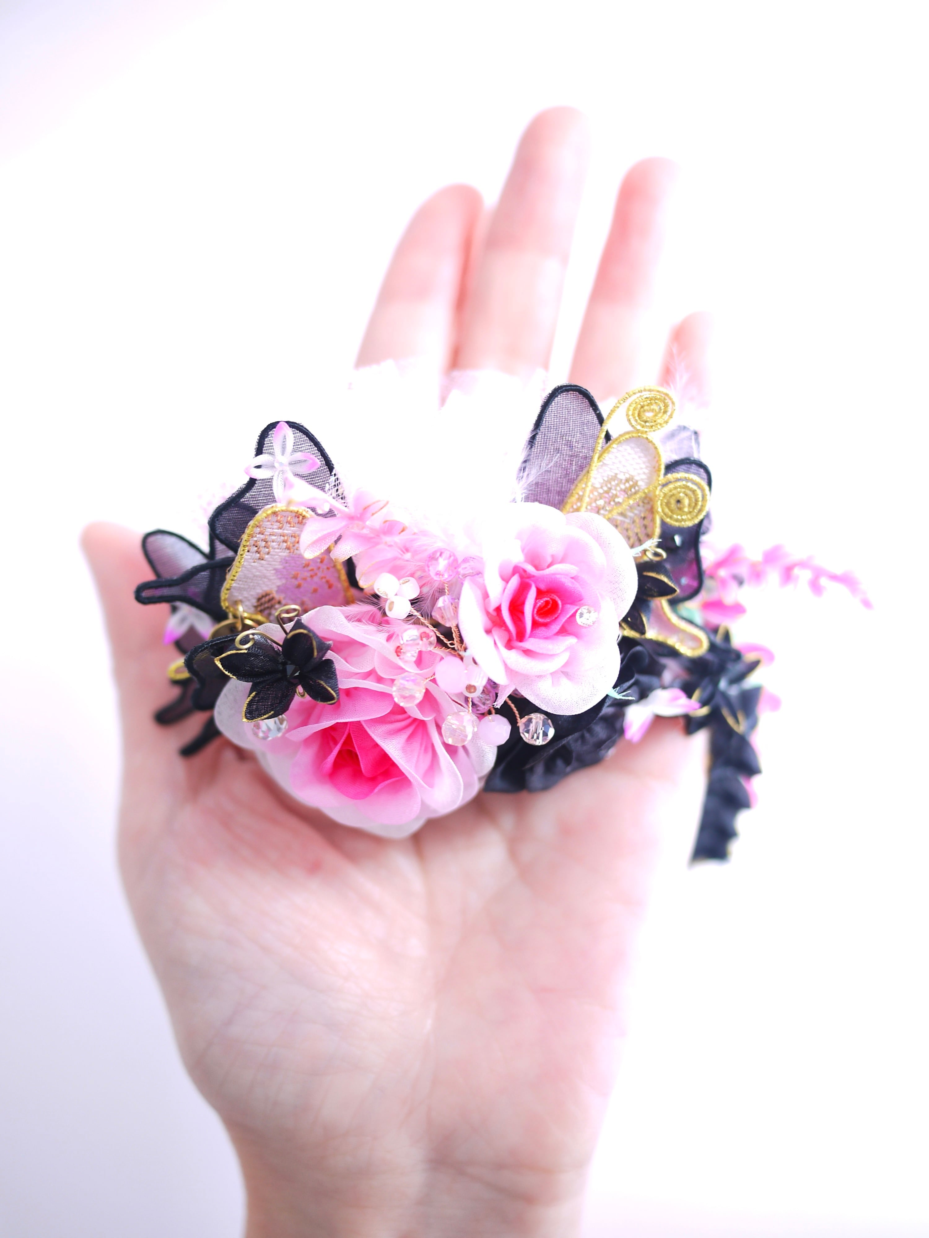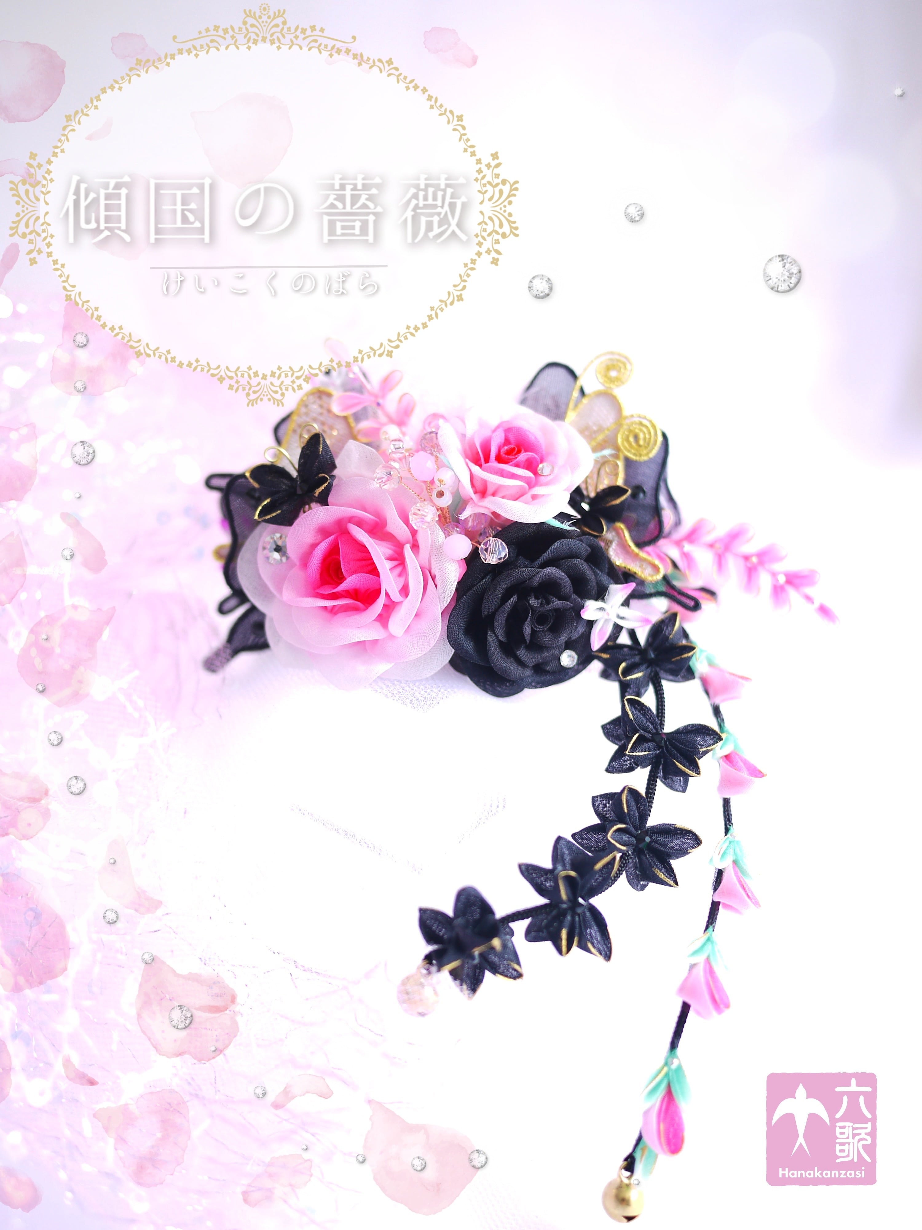 しなやかで透明感のある花びらと空気をはらんでふっくら咲く薔薇に極薄シルクで作った黒アゲハ蝶が舞い群れる小悪魔花かんざしです