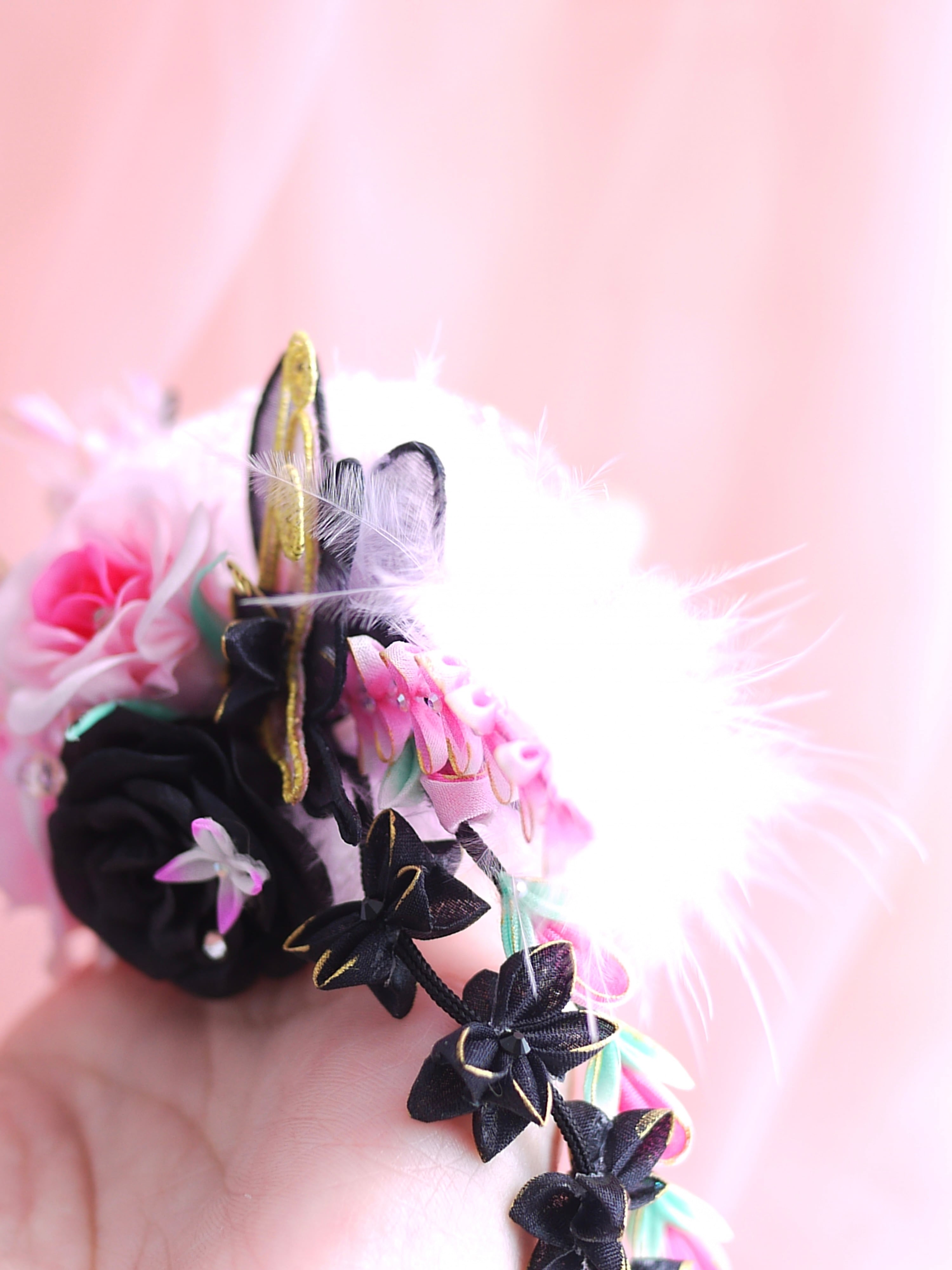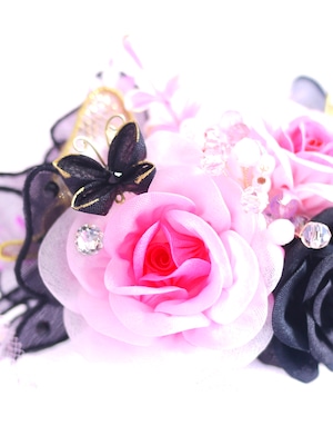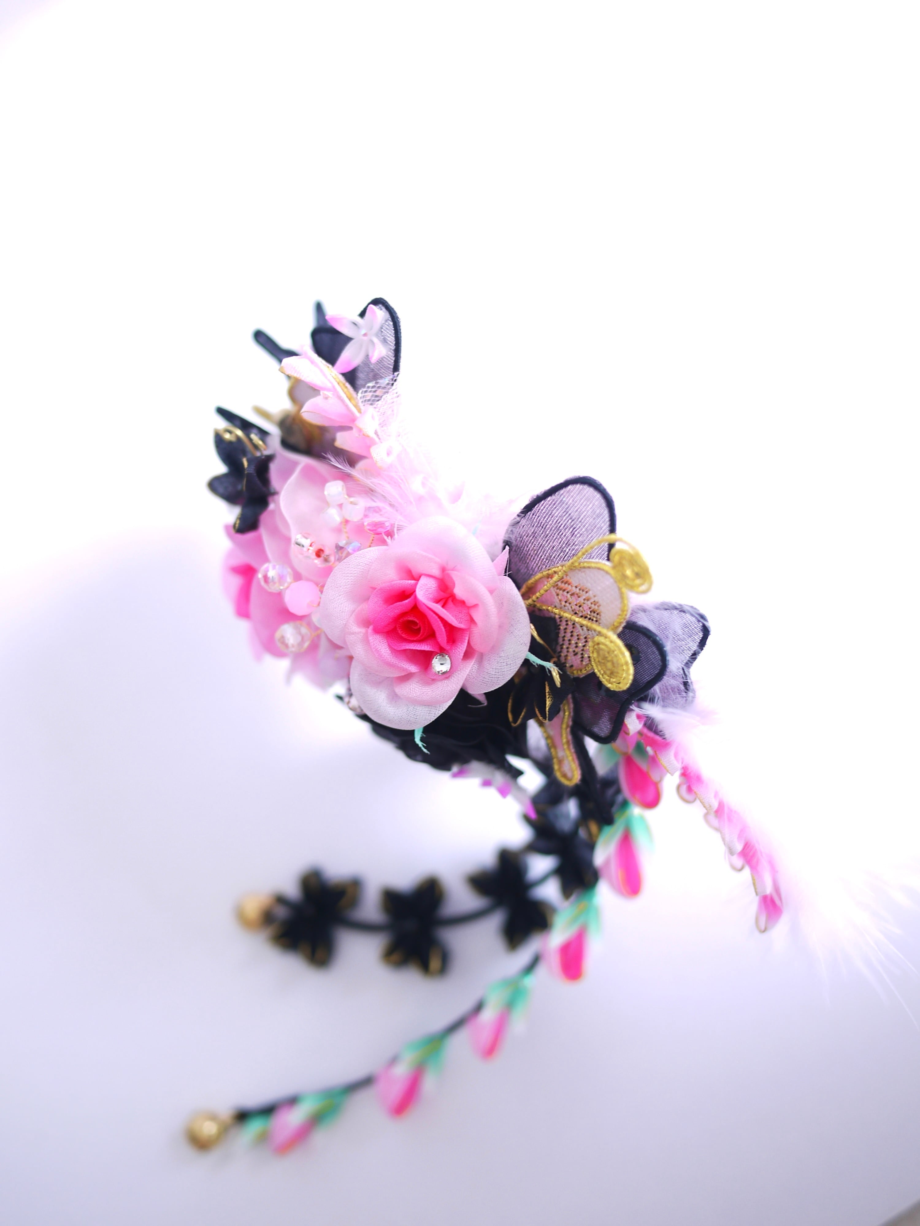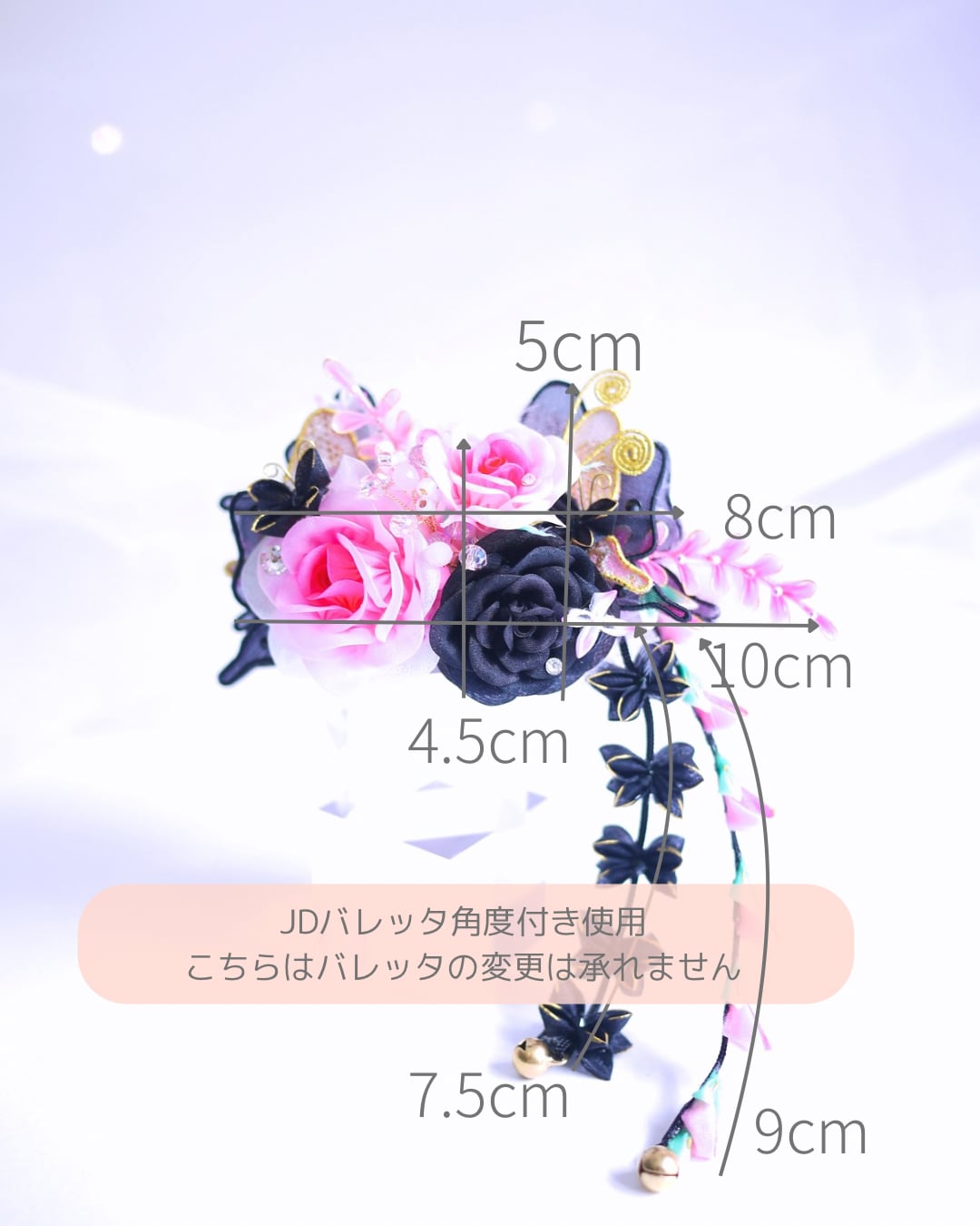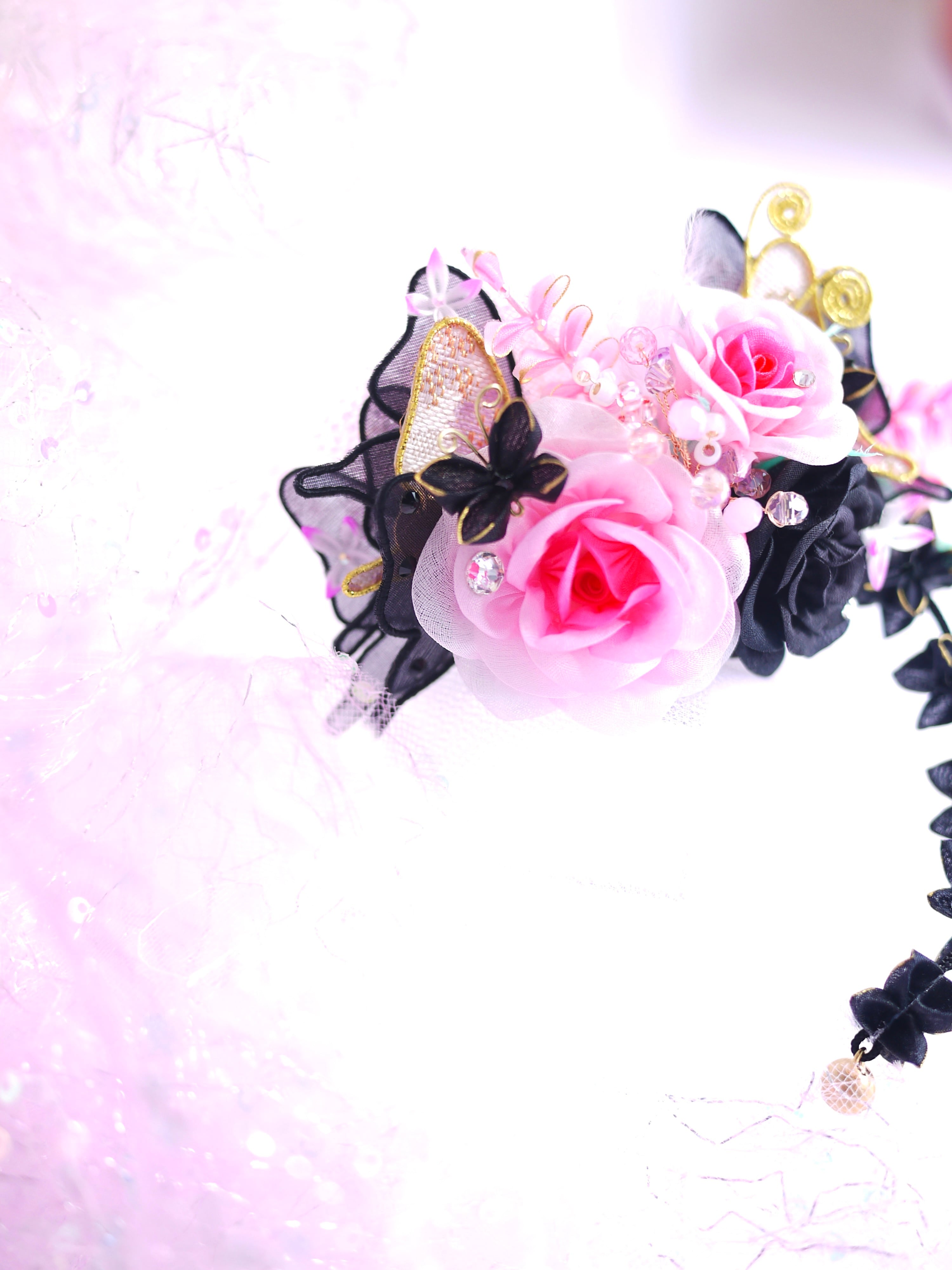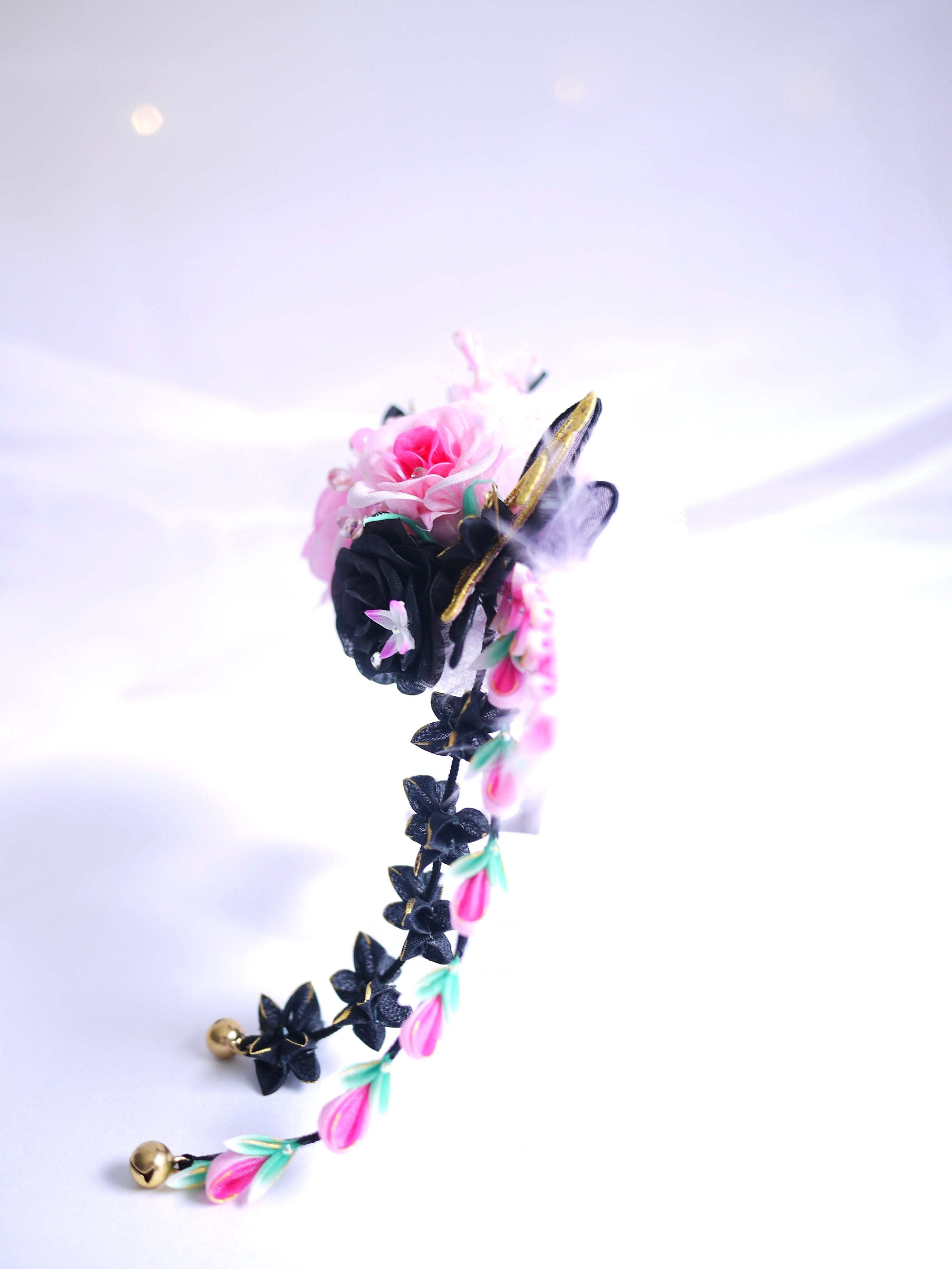 しなやかで透明感のある花びらと空気をはらんでふっくら咲く薔薇に極薄シルクで作った黒アゲハ蝶が舞い群れる小悪魔花かんざしです